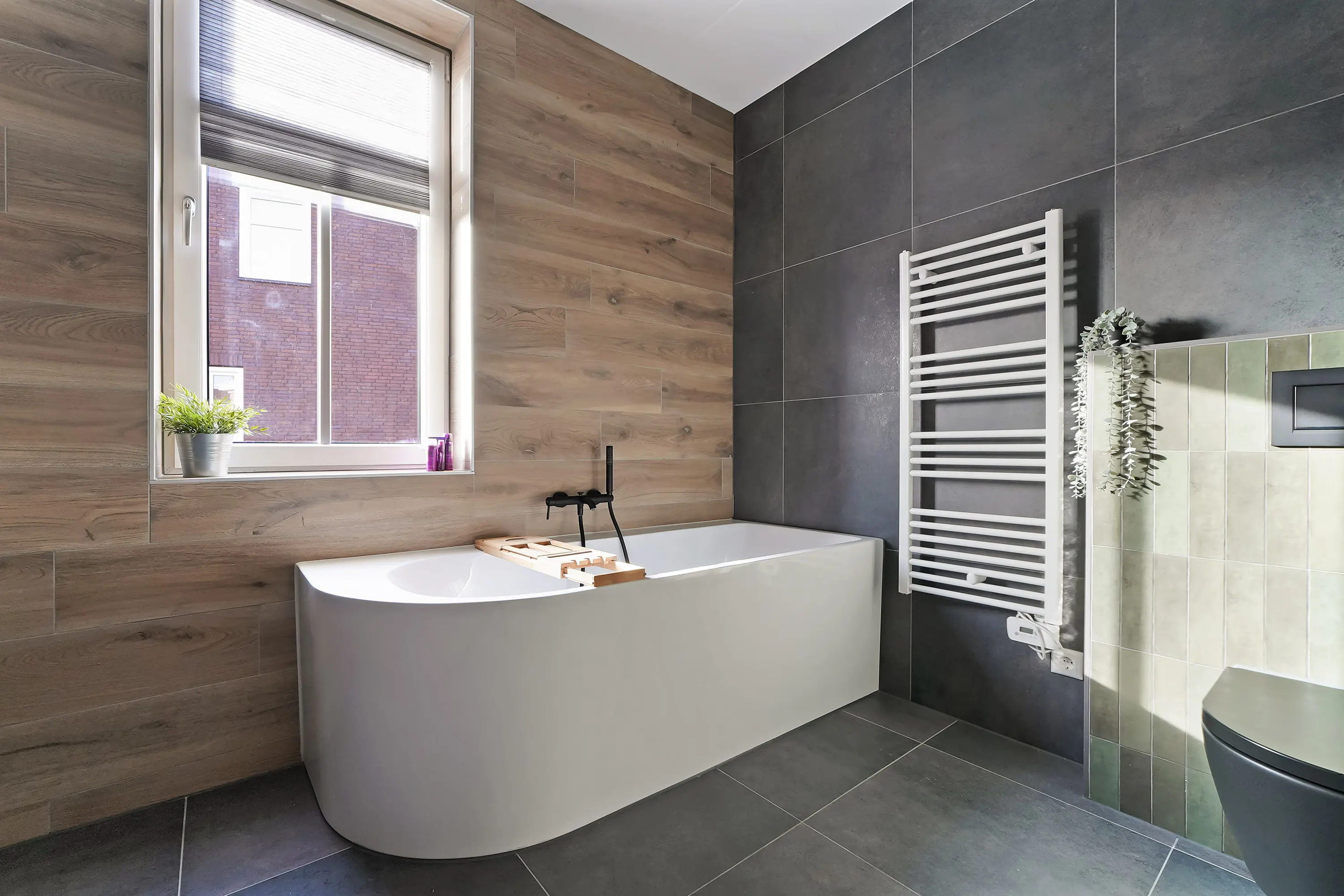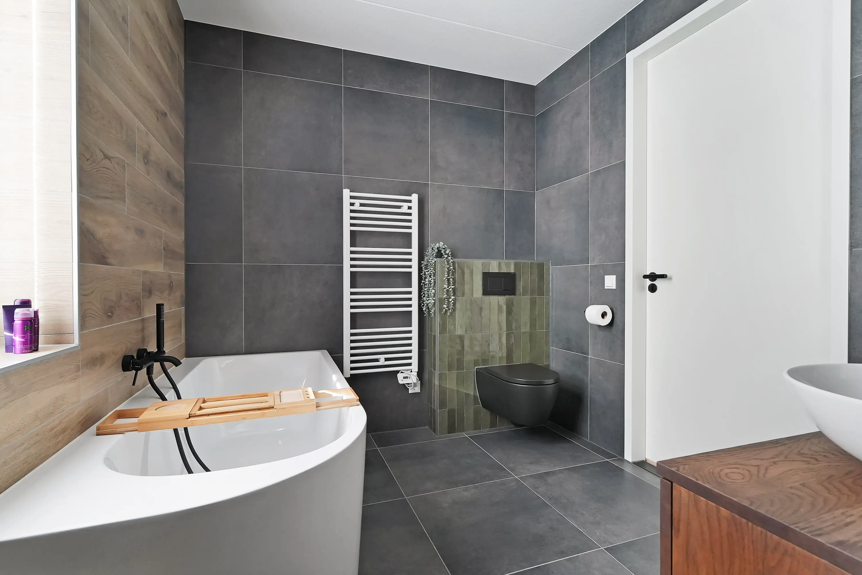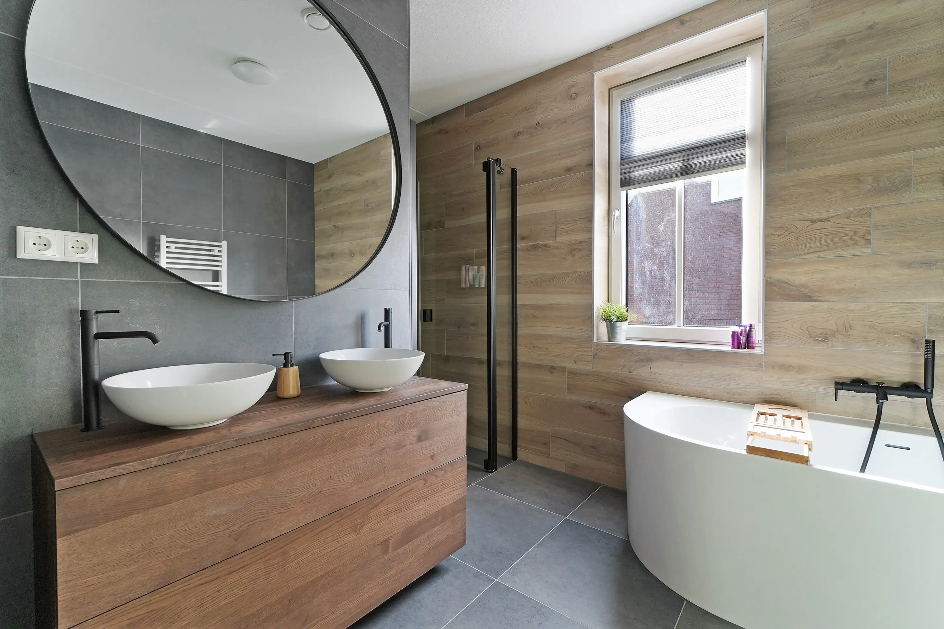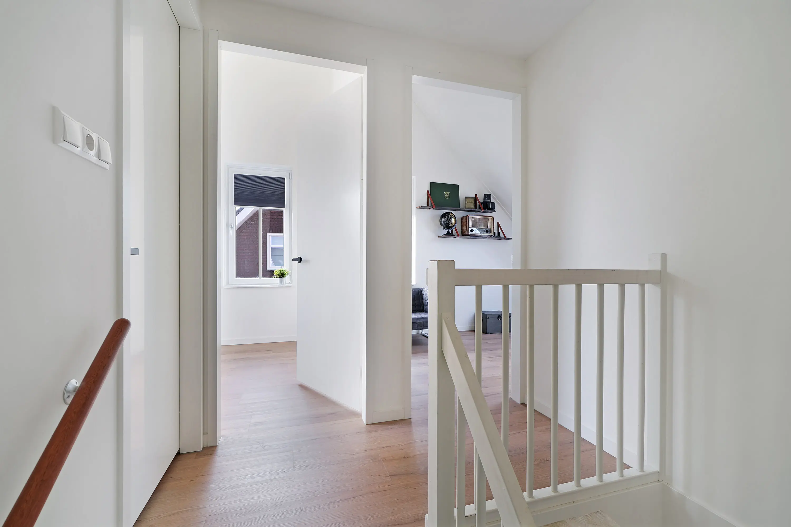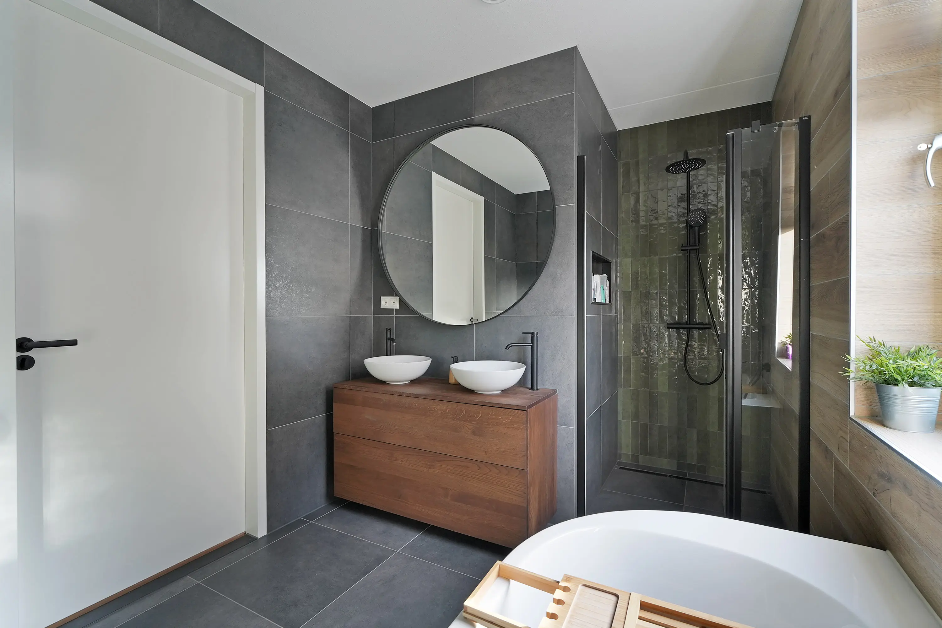 De overloop biedt toegang tot drie volwaardige slaapkamers, waaronder de royale ouderslaapkamer die zich over de volledige breedte van de woning strekt. Alle kamers zijn voorzien van grote raampartijen en strak afgewerkte wanden. De badkamer laat ook deze verdieping shinen! Smaakvol ingericht in een combinatie van beton- en houtlook vloer- en wandtegels, licht door het raam en ruimtelijk door de uitgebouwde inloopdouche. Zo ook een mooi ligbad met ingebouwde kraan, tweede toilet en een fraai badmeubel met bijpassende waskommen Alles is tot in de puntjes afgewerkt – klaar voor jarenlang comfort.