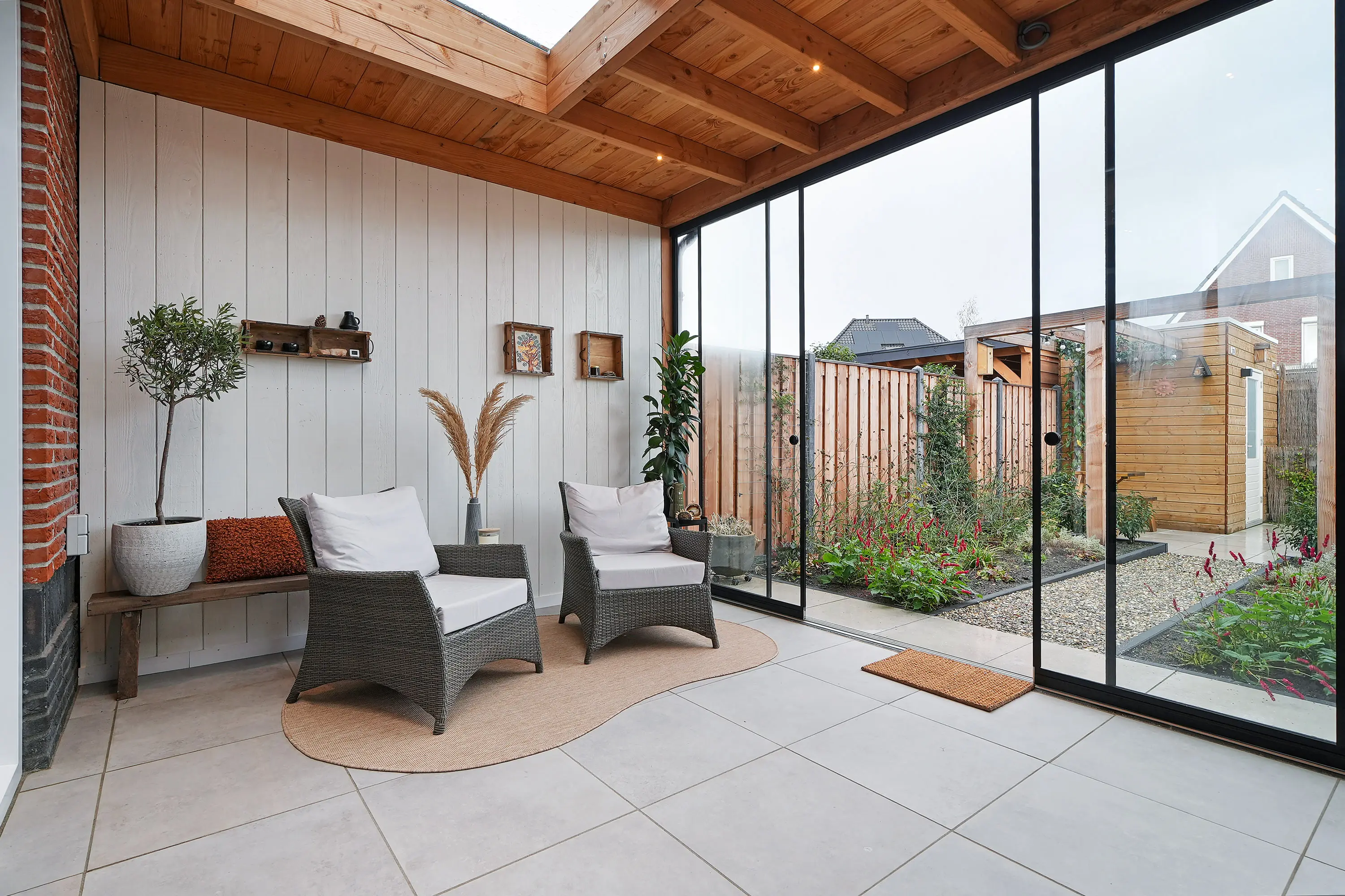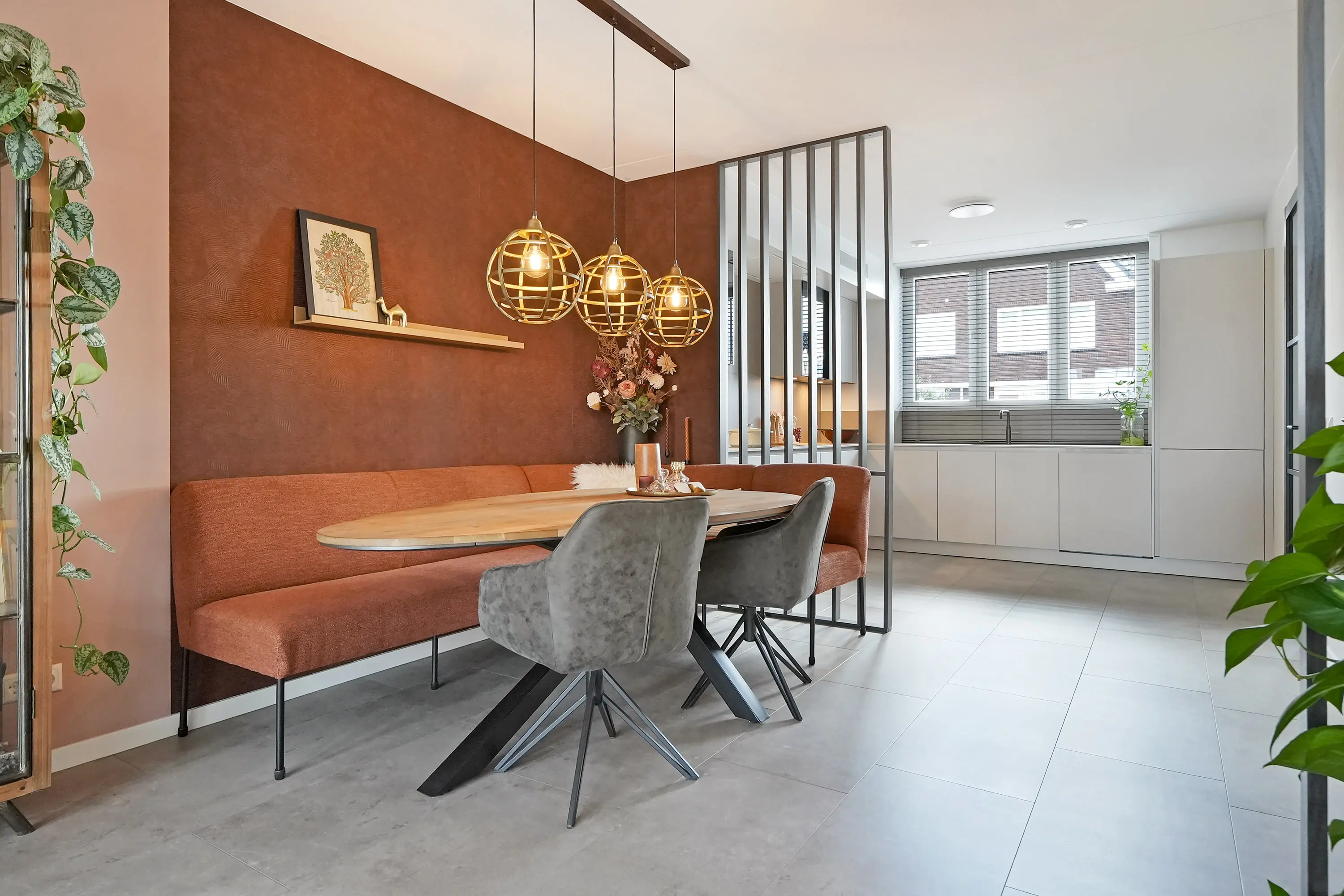 De twee roomdividers geven de begane grond een speelse en ruimtelijke indeling. De eetkamer en woonkamer liggen in het verlengde van de keuken. Via openslaande tuindeuren bereikt u de serre, een prachtig afgewerkte ruimte met spotjes, heater, vaste beglazing en een lichtstraat.