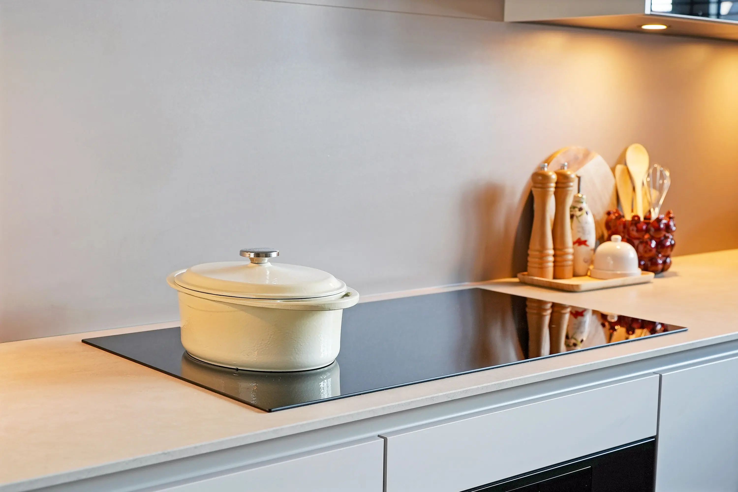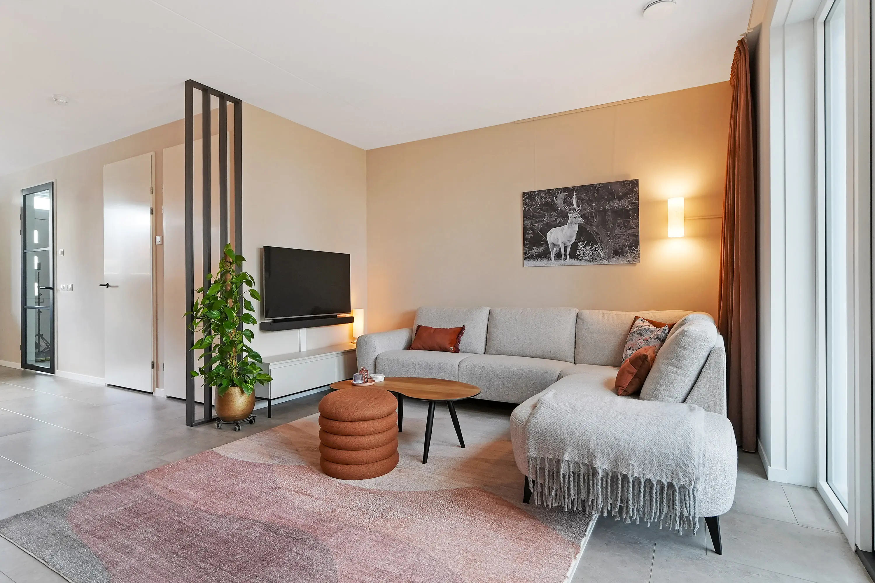 U betreedt de woning via de hal waar de meterkast en het toilet met fontein zijn gesitueerd. Vanuit hier loopt u door naar de keuken, een echte blikvanger. De ruim opgezette L-vormige keuken beschikt over een 5-pits inductiekookplaat, afzuigkap, combi-oven, vaatwasser, Quooker, koelkast en vriezer. Fraai detail: het extra diepe keukenblad bij de ramen, dat volledig is doorgetrokken tot aan de raampartij.