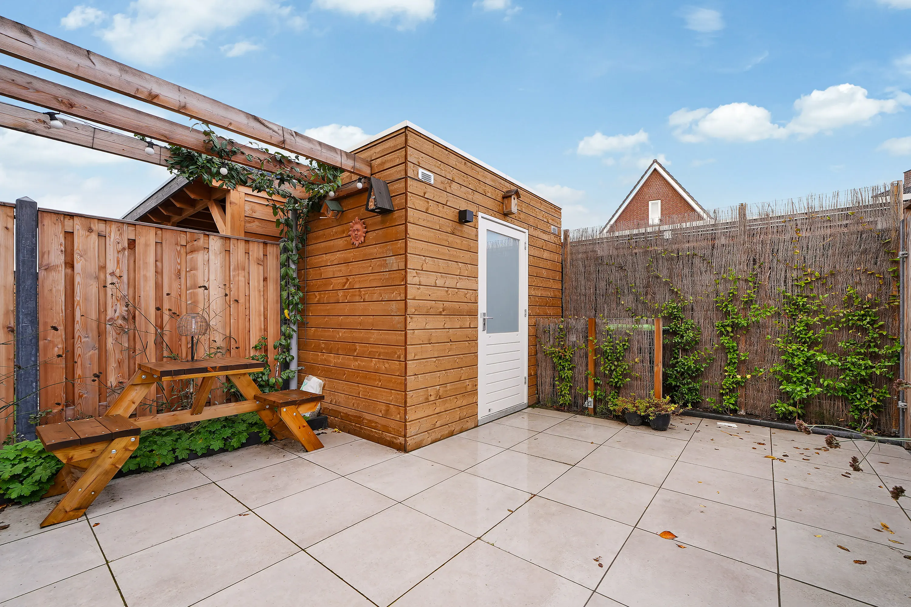 De verzorgd aangelegde tuin is ingericht met diverse planten, bloemen, borders en een extra terras achterin. De ligging op het noordwesten zorgt voor heerlijke middag- en avondzon. De tuin beschikt over een houten berging voor fietsen en tuingereedschap en heeft een vrije achterom.