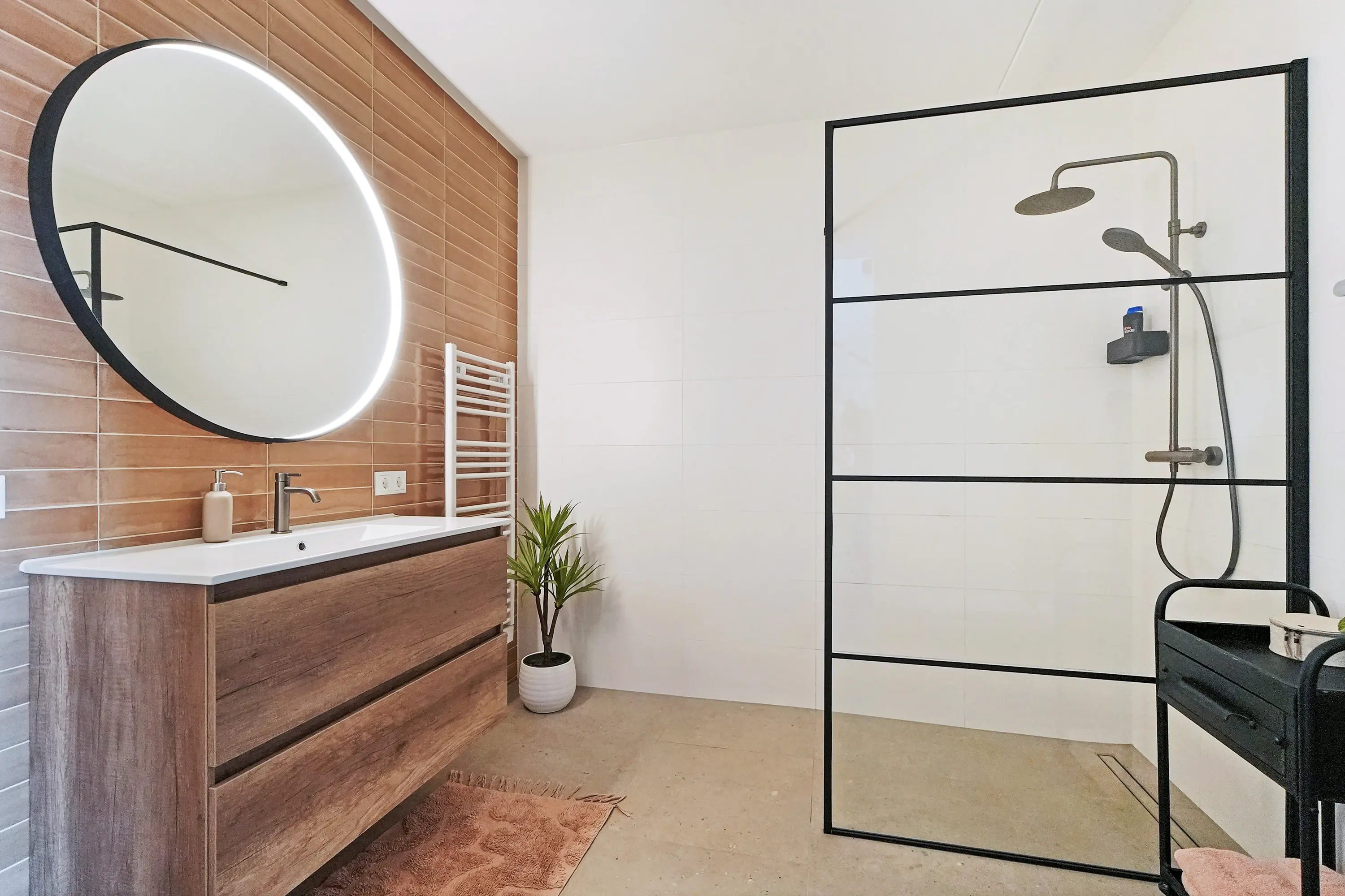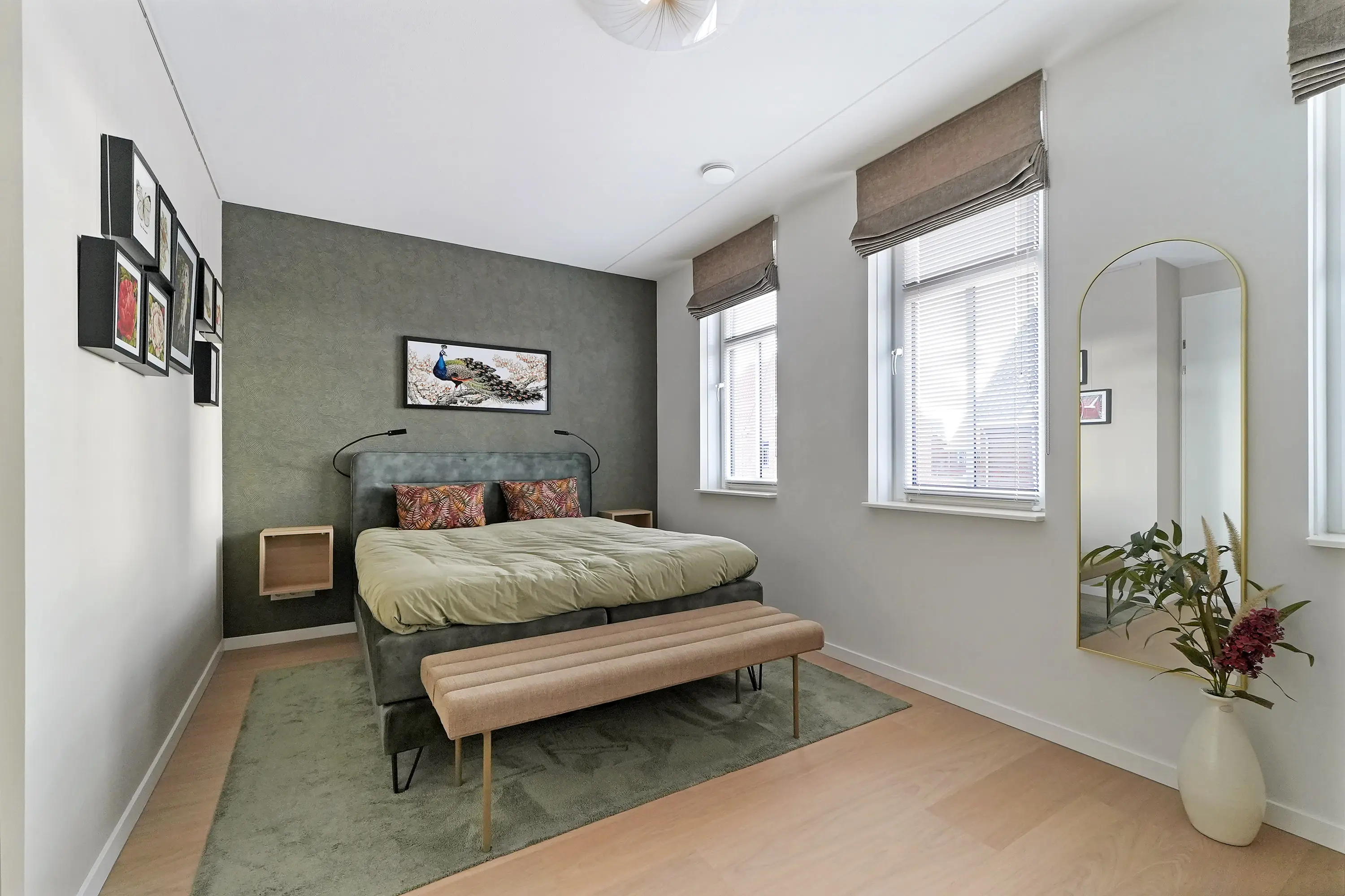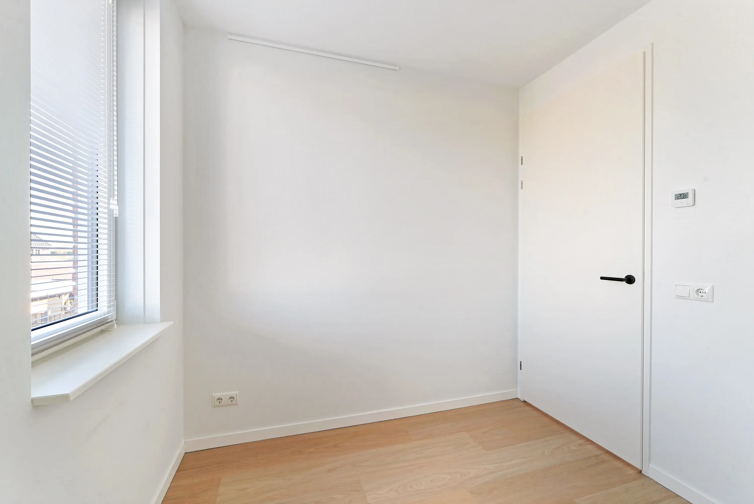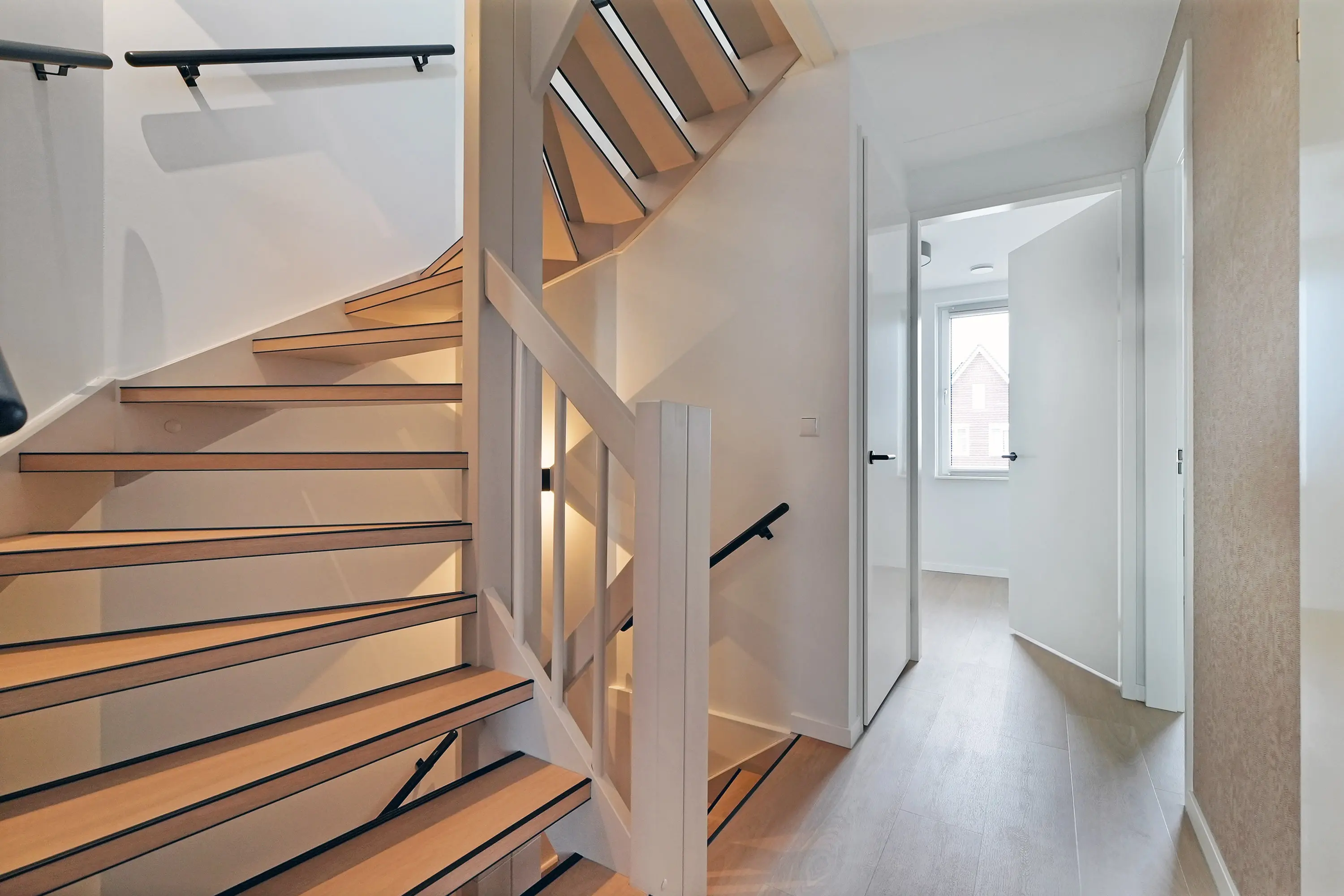 De eerste verdieping is royaal ingedeeld en omvat vier ruime kamers: drie slaapkamers en centraal de badkamer. De luxe badkamer beschikt over een inloopdouche, grote wastafel met meubel, vloerverwarming, elektrische radiator en een verwarmde spiegel. De master bedroom aan de voorzijde is bijzonder ruim. Alle ruimtes profiteren van veel natuurlijk licht dankzij de grote draai-kiepraampartijen.