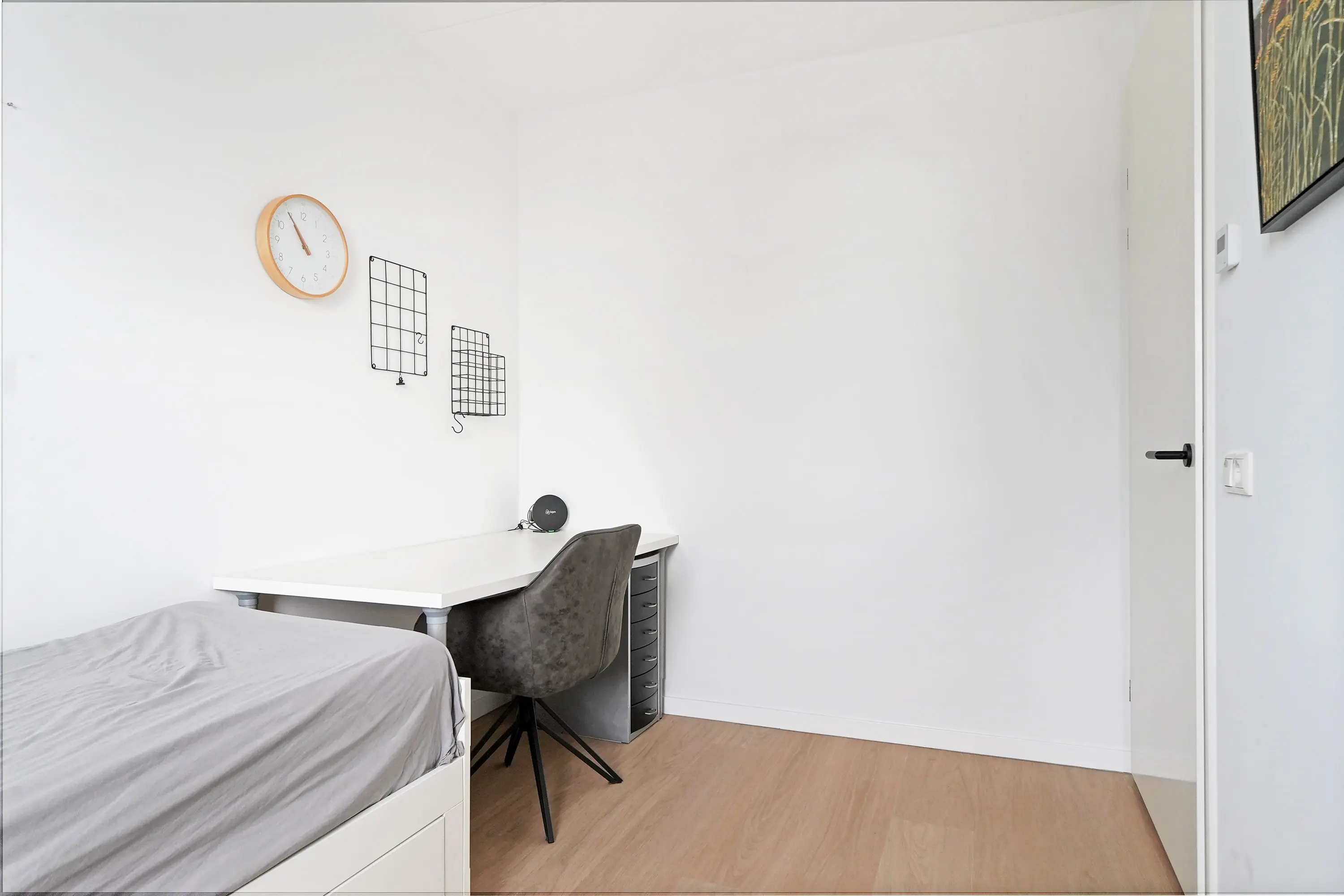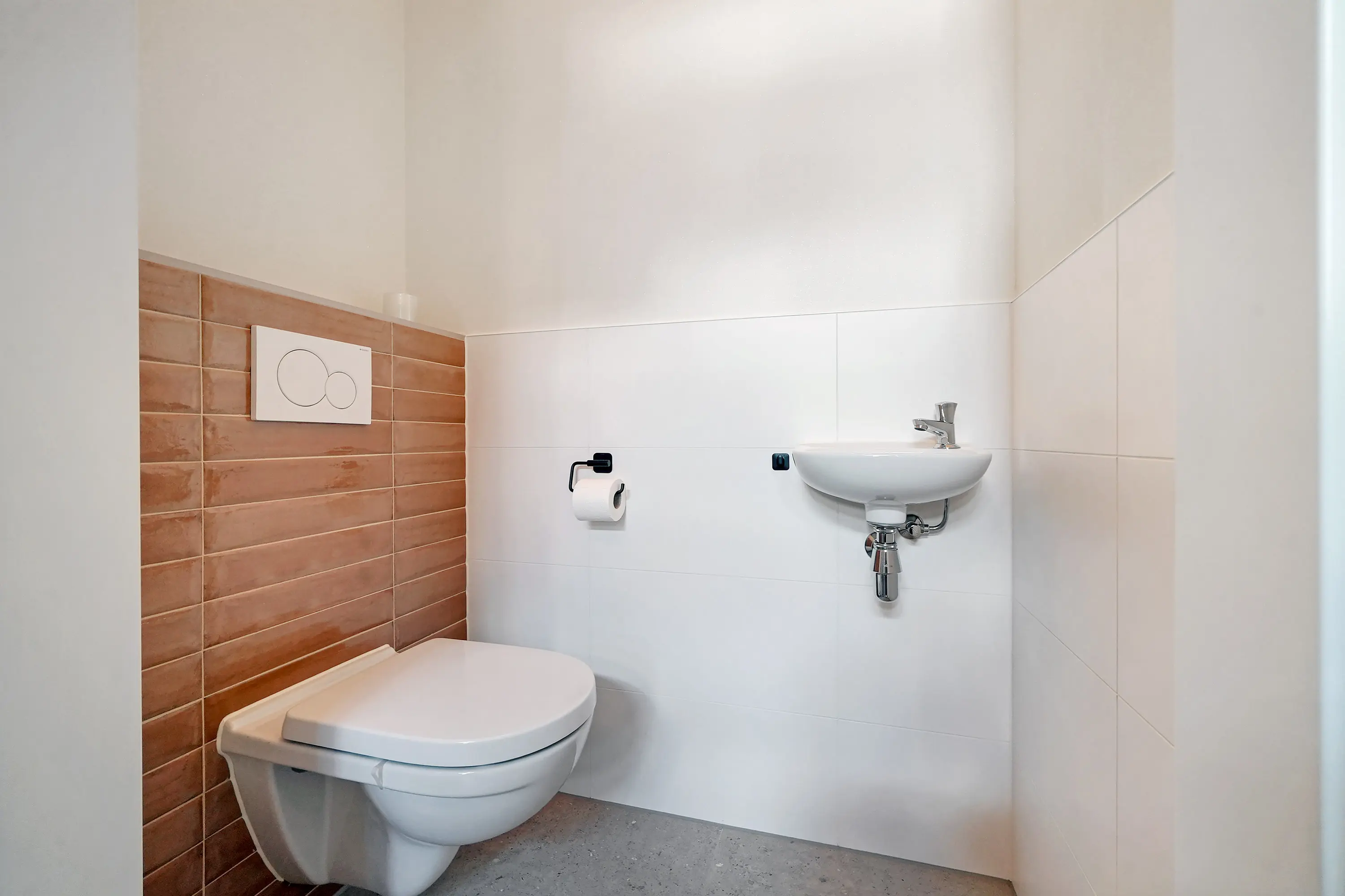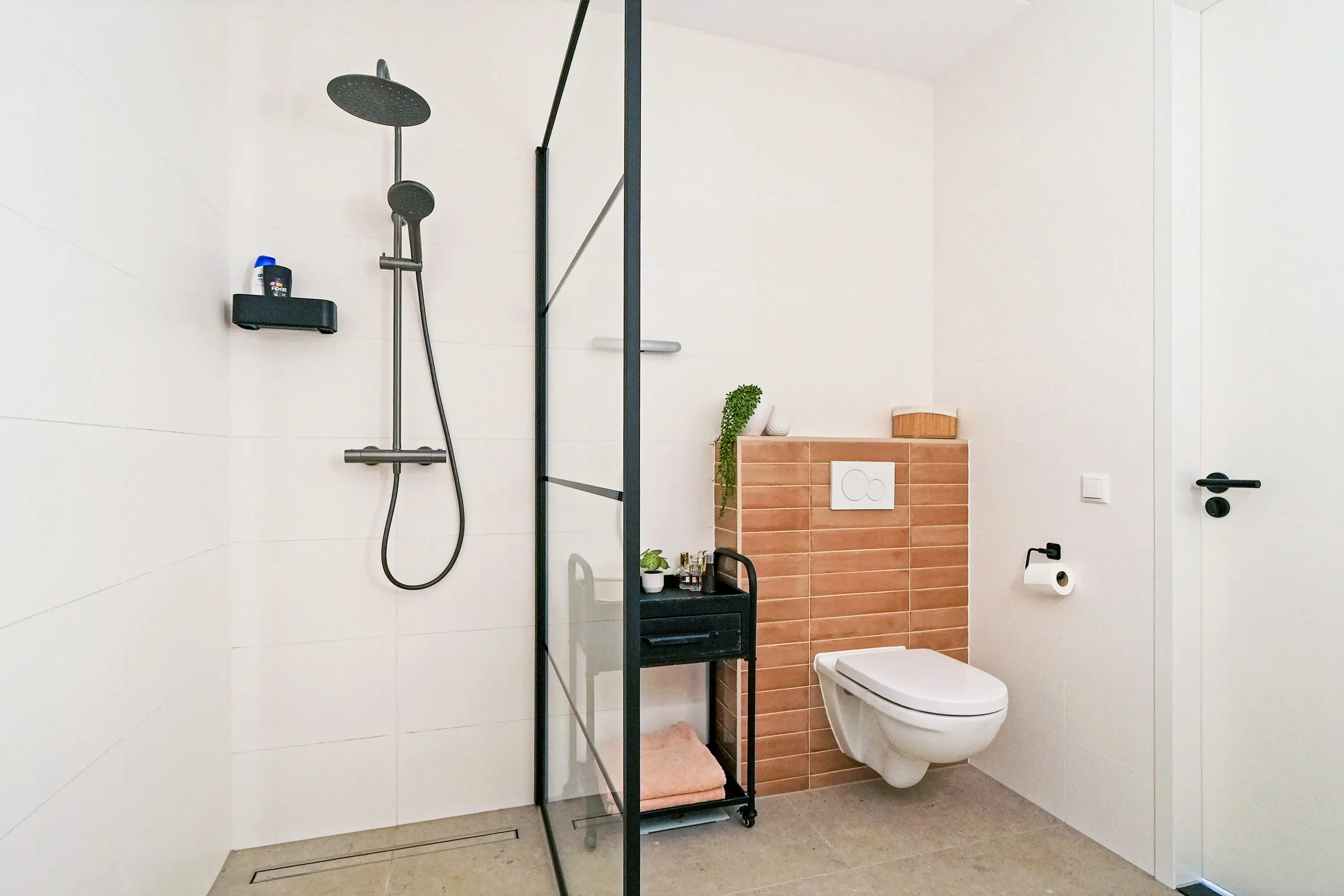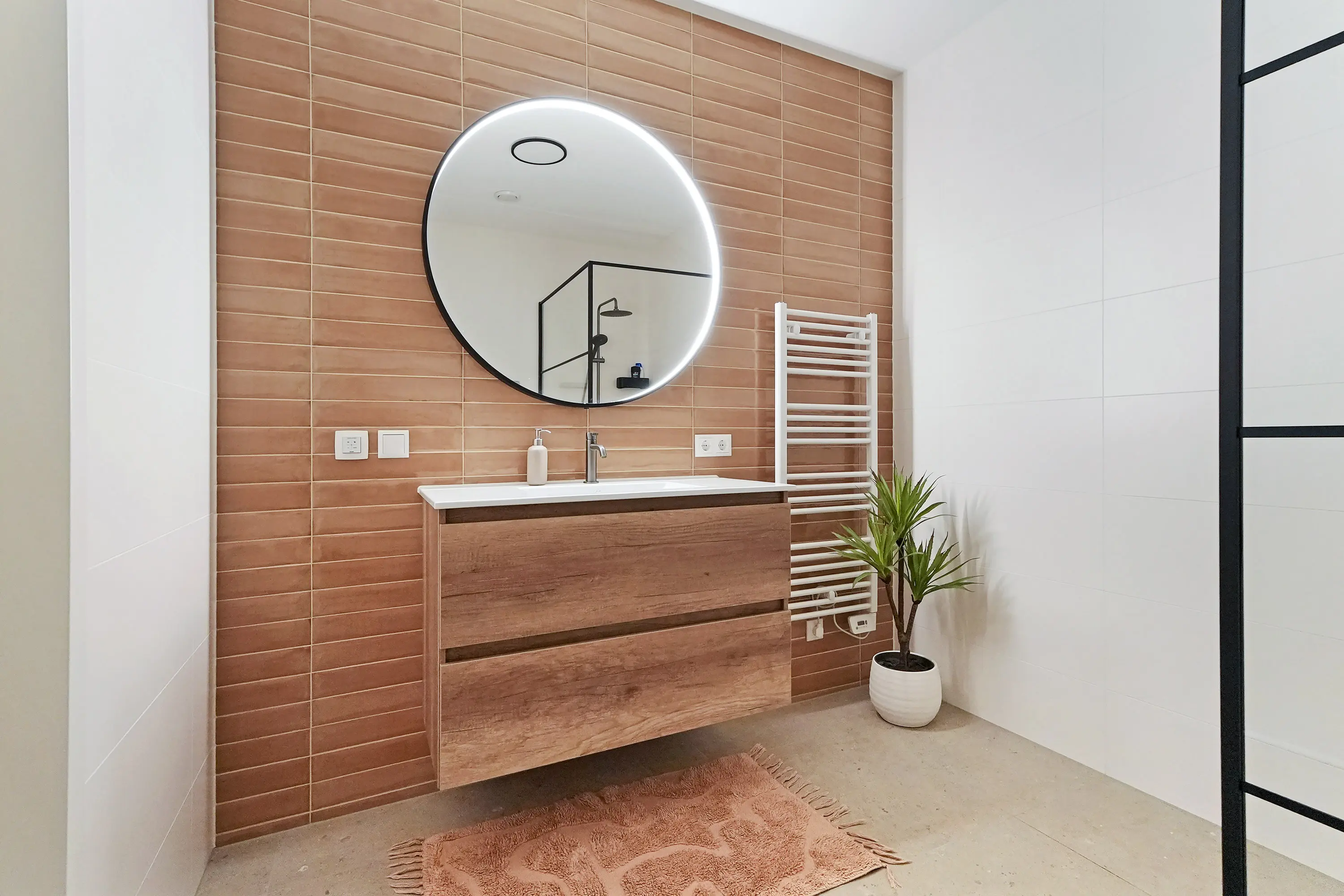 De eerste verdieping is royaal ingedeeld en omvat vier ruime kamers: drie slaapkamers en centraal de badkamer. De luxe badkamer beschikt over een inloopdouche, grote wastafel met meubel, vloerverwarming, elektrische radiator en een verwarmde spiegel. De master bedroom aan de voorzijde is bijzonder ruim. Alle ruimtes profiteren van veel natuurlijk licht dankzij de grote draai-kiepraampartijen.