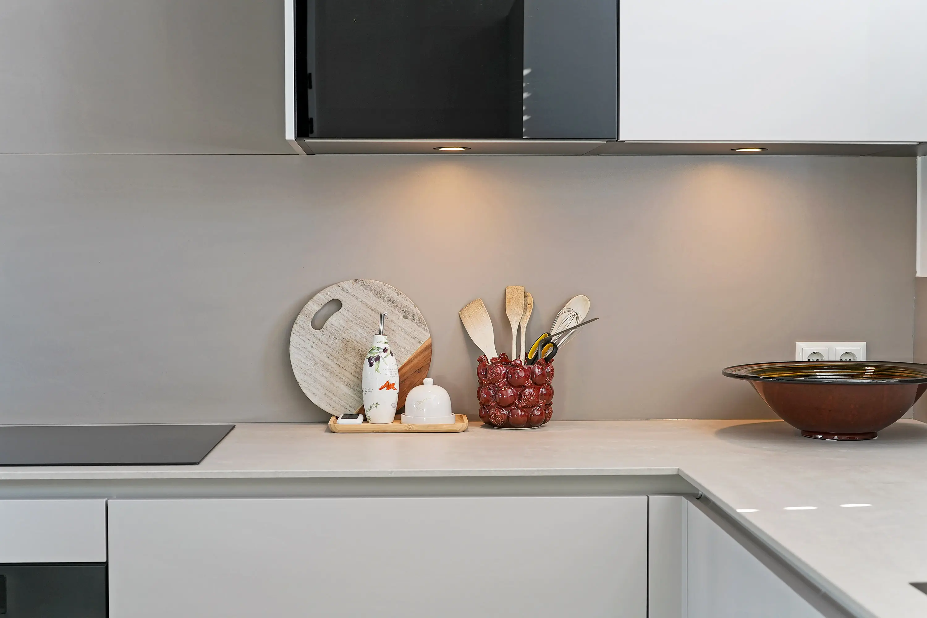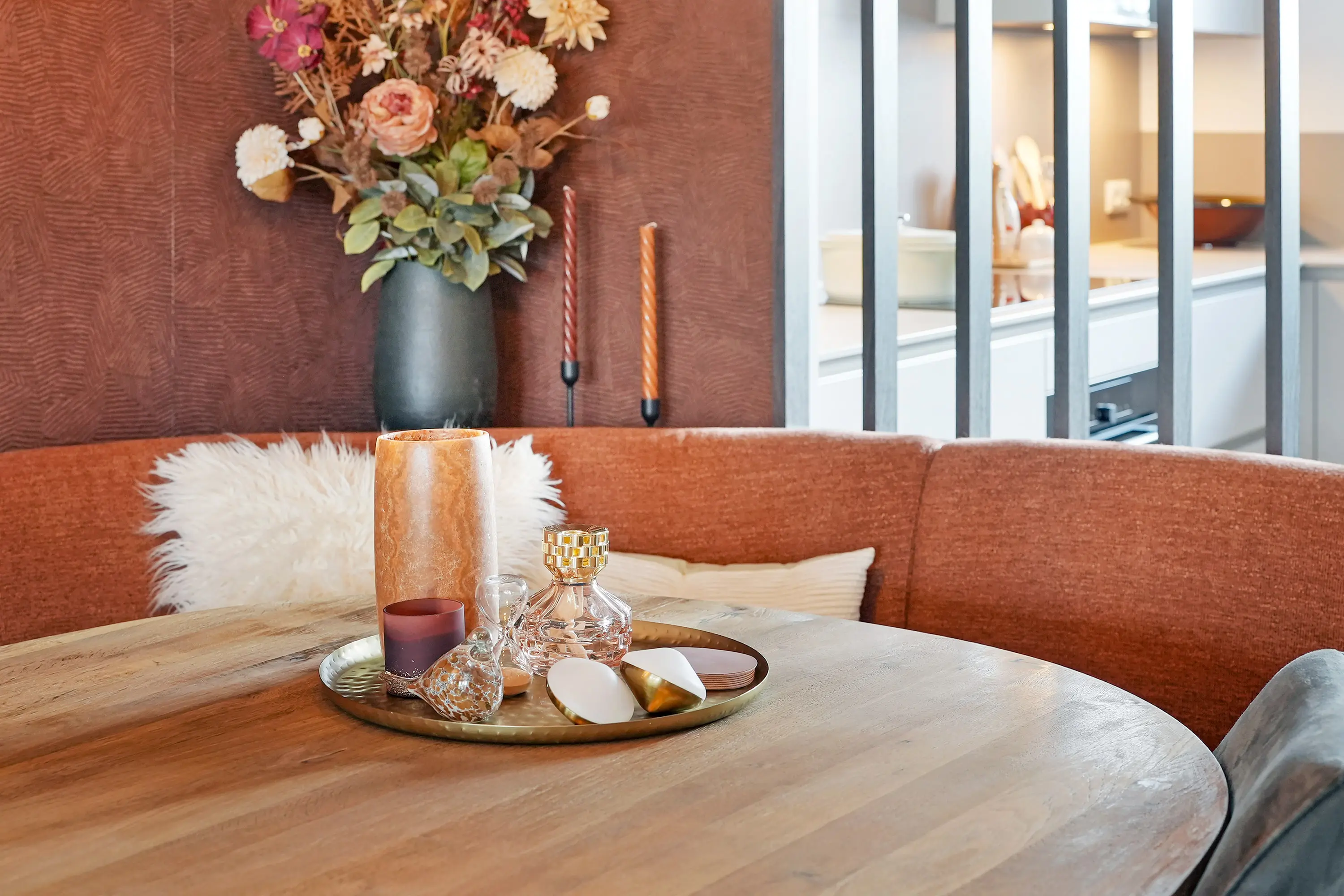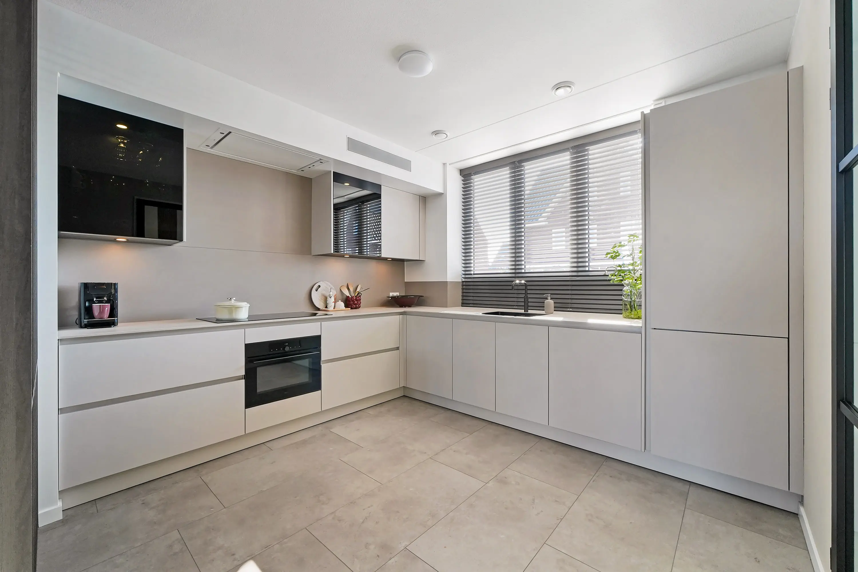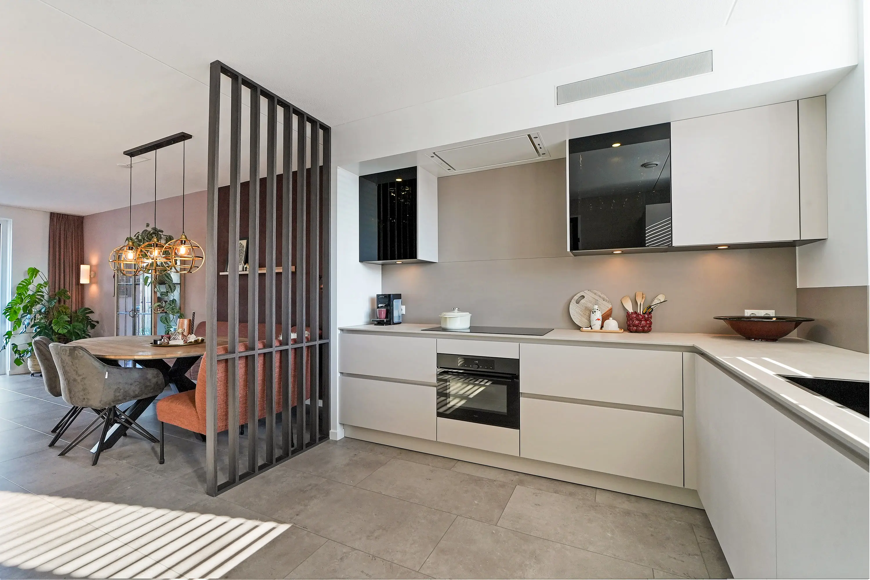 U betreedt de woning via de hal waar de meterkast en het toilet met fontein zijn gesitueerd. Vanuit hier loopt u door naar de keuken, een echte blikvanger. De ruim opgezette L-vormige keuken beschikt over een 5-pits inductiekookplaat, afzuigkap, combi-oven, vaatwasser, Quooker, koelkast en vriezer. Fraai detail: het extra diepe keukenblad bij de ramen, dat volledig is doorgetrokken tot aan de raampartij.