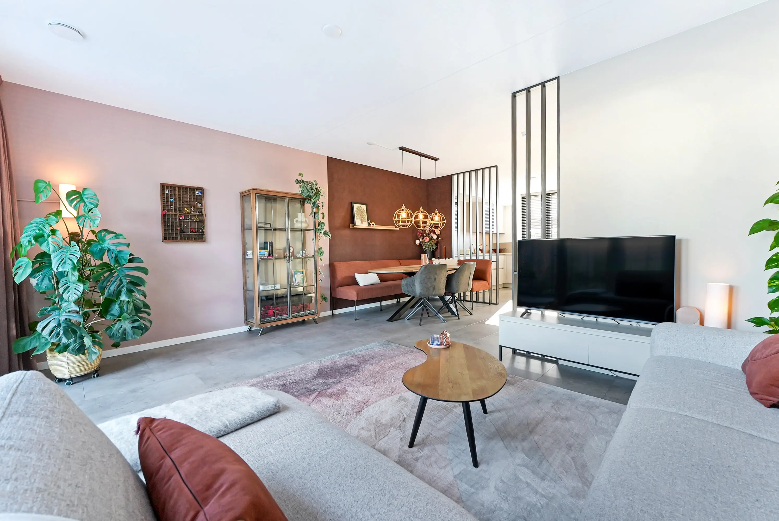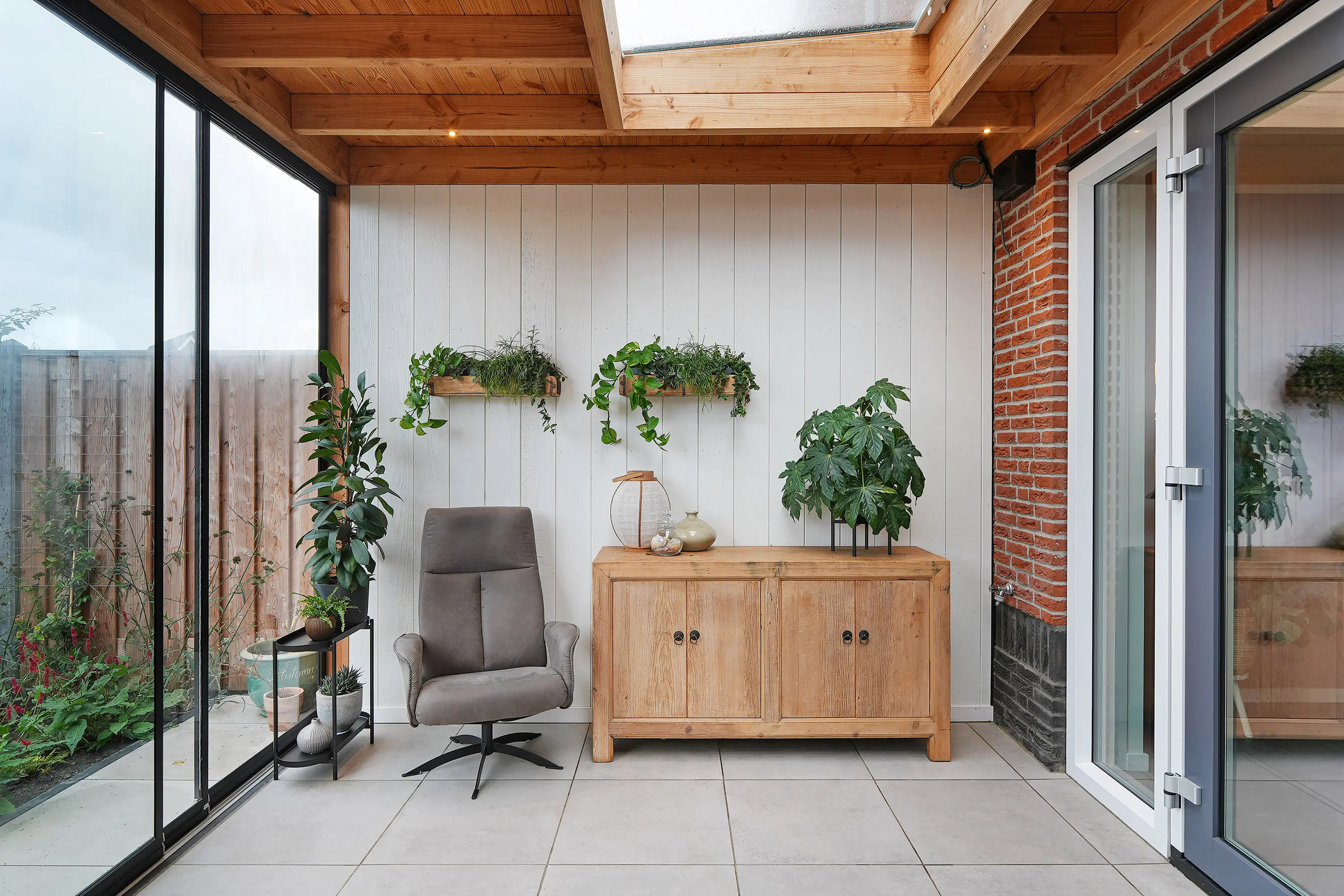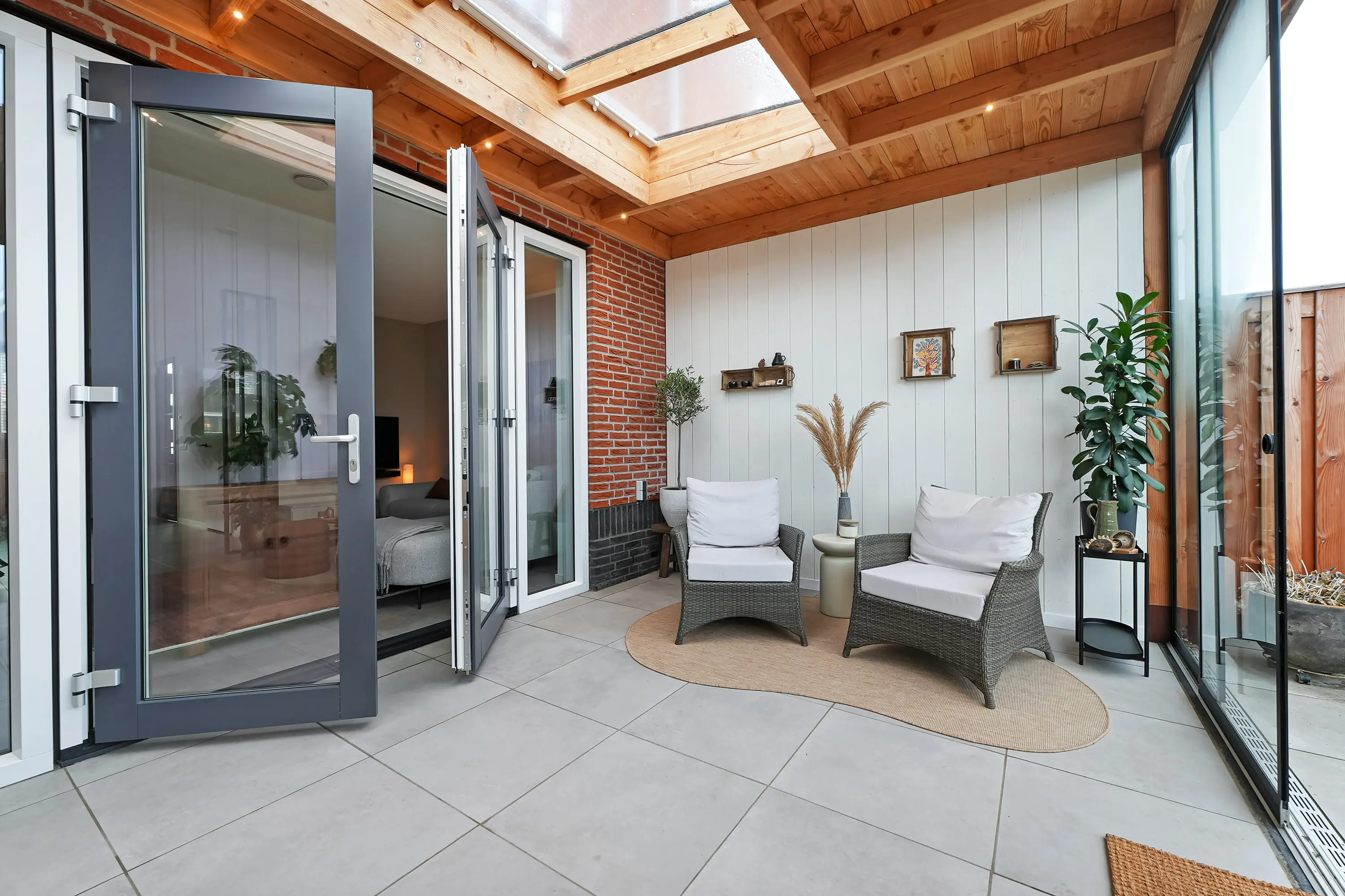 De twee roomdividers geven de begane grond een speelse en ruimtelijke indeling. De eetkamer en woonkamer liggen in het verlengde van de keuken. Via openslaande tuindeuren bereikt u de serre, een prachtig afgewerkte ruimte met spotjes, heater, vaste beglazing en een lichtstraat.
