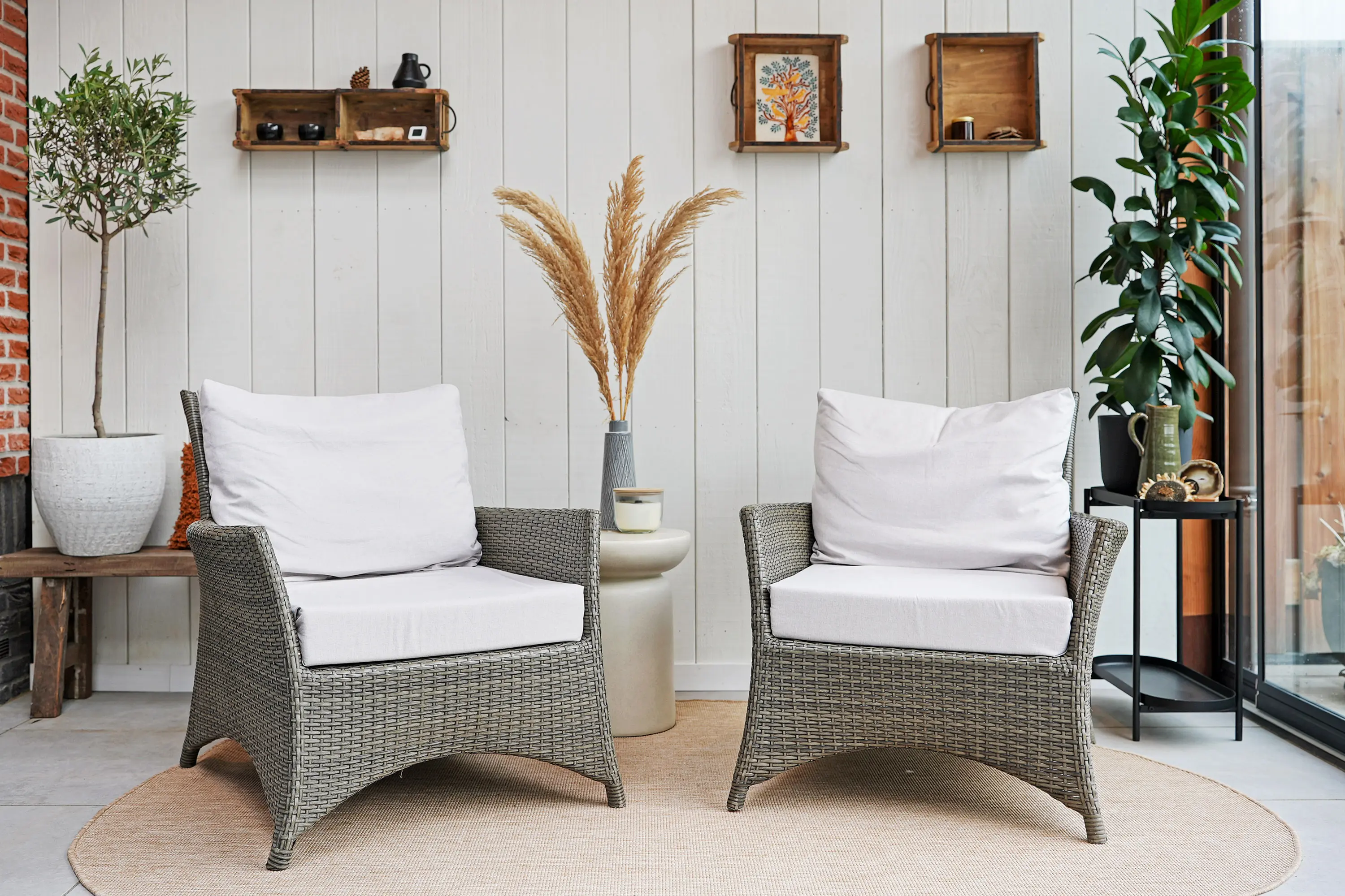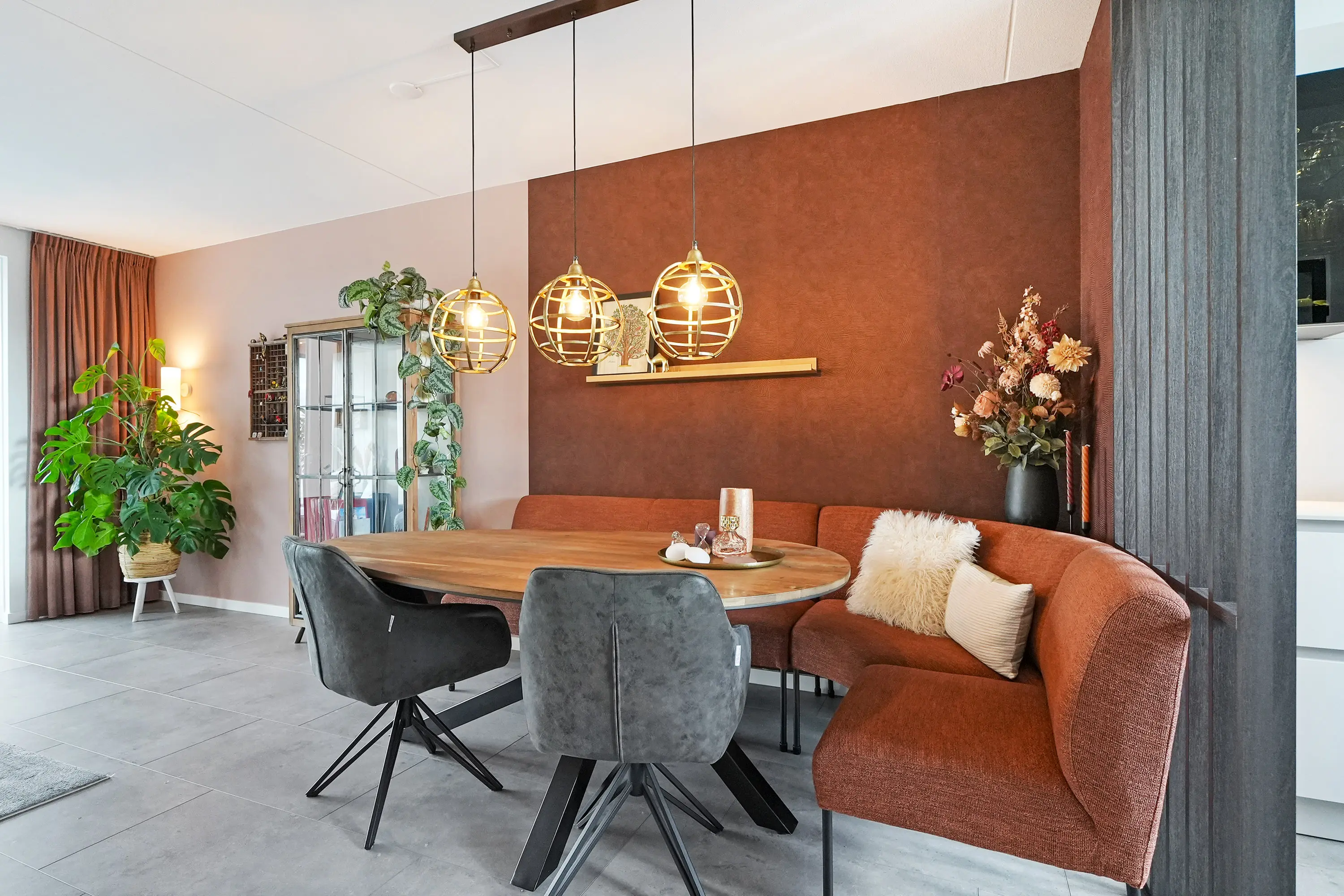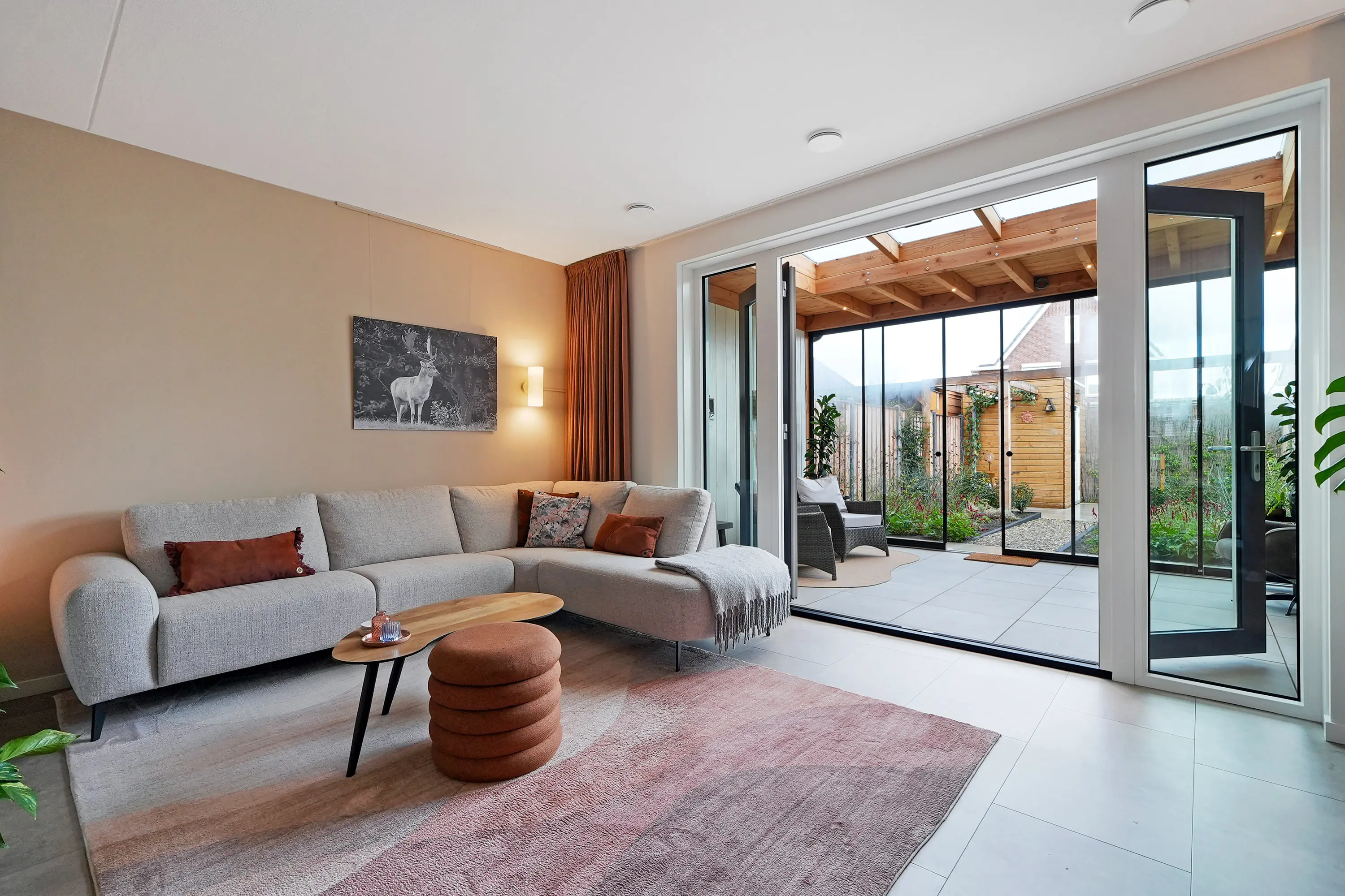 De twee roomdividers geven de begane grond een speelse en ruimtelijke indeling. De eetkamer en woonkamer liggen in het verlengde van de keuken. Via openslaande tuindeuren bereikt u de serre, een prachtig afgewerkte ruimte met spotjes, heater, vaste beglazing en een lichtstraat.