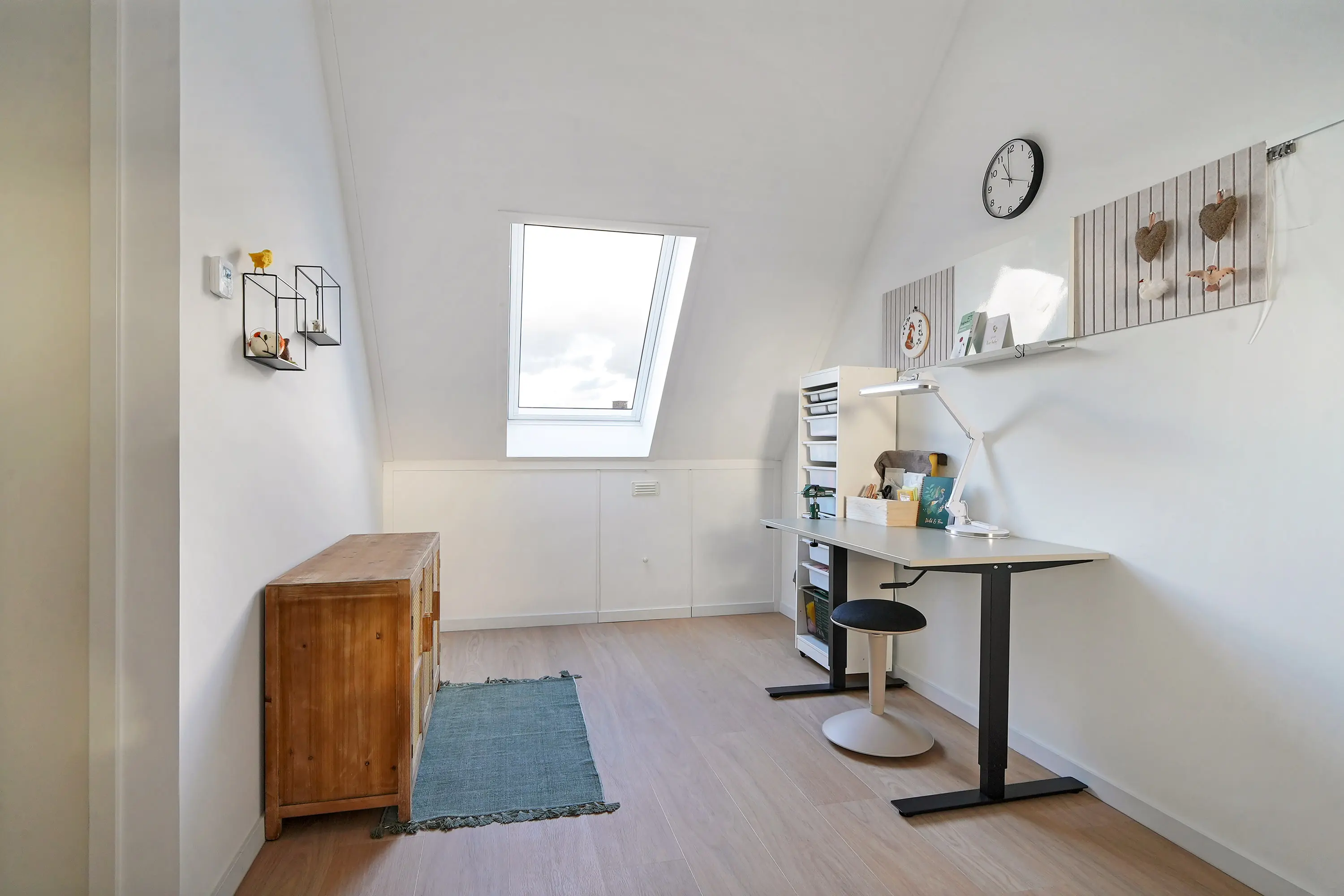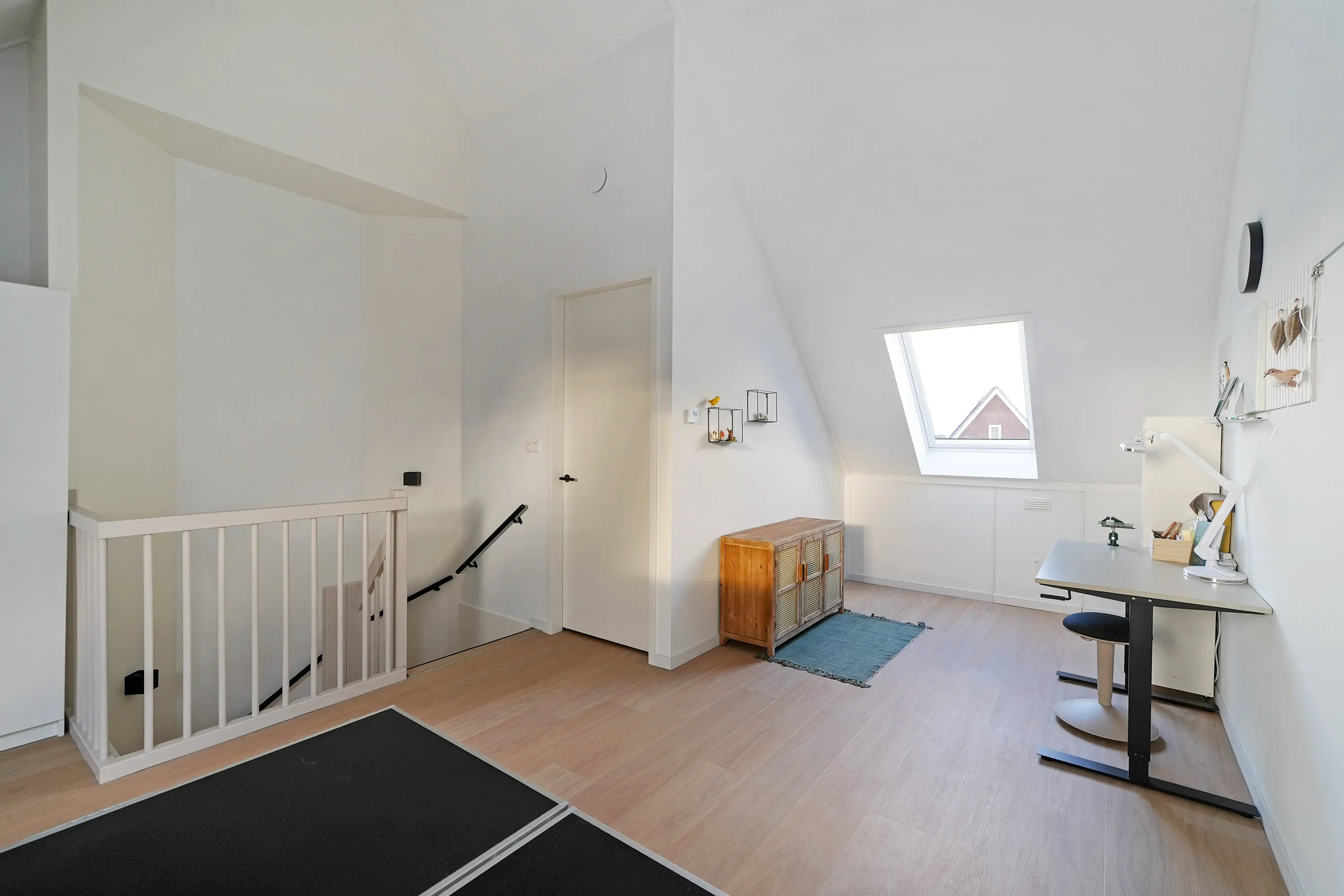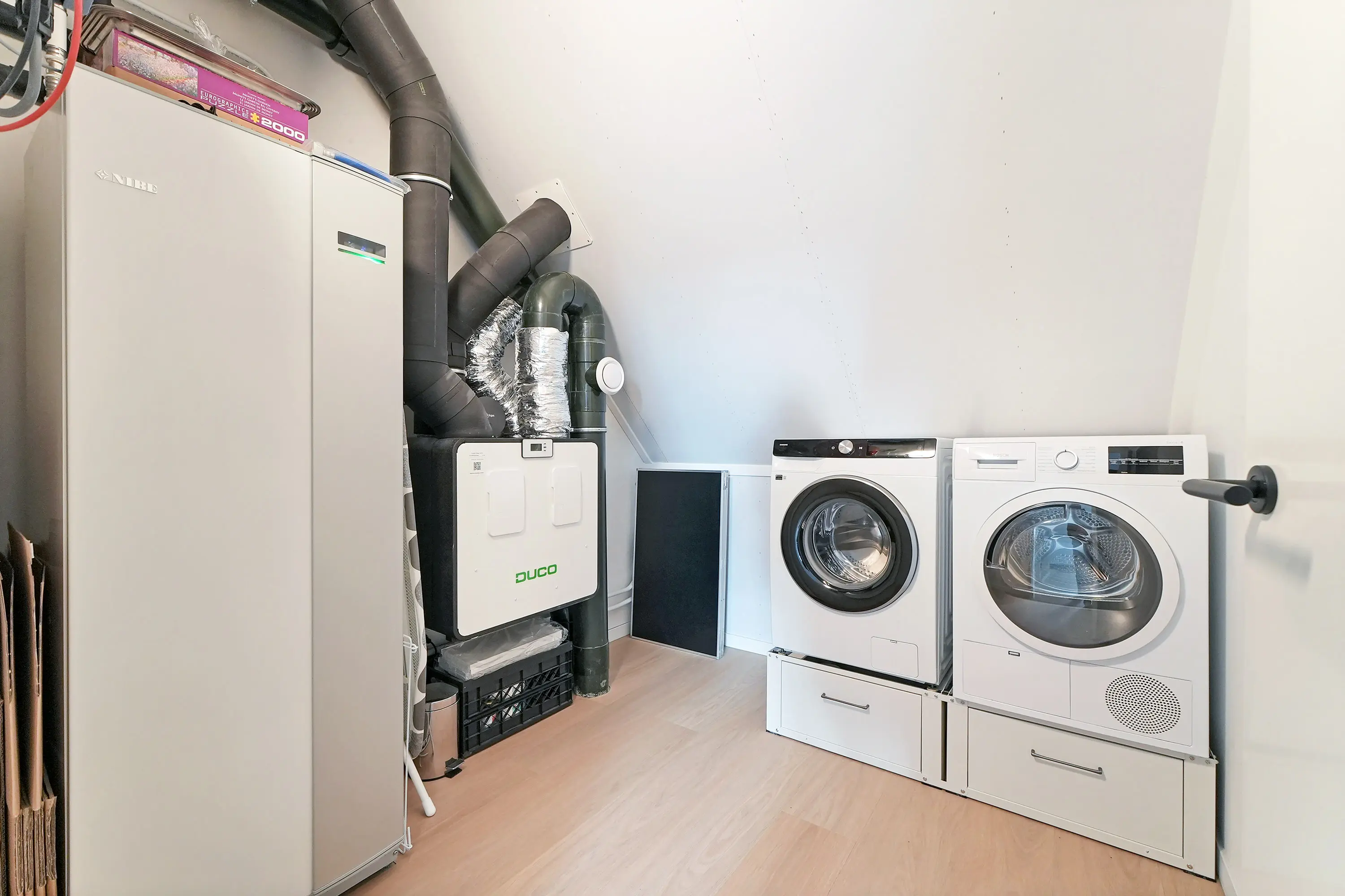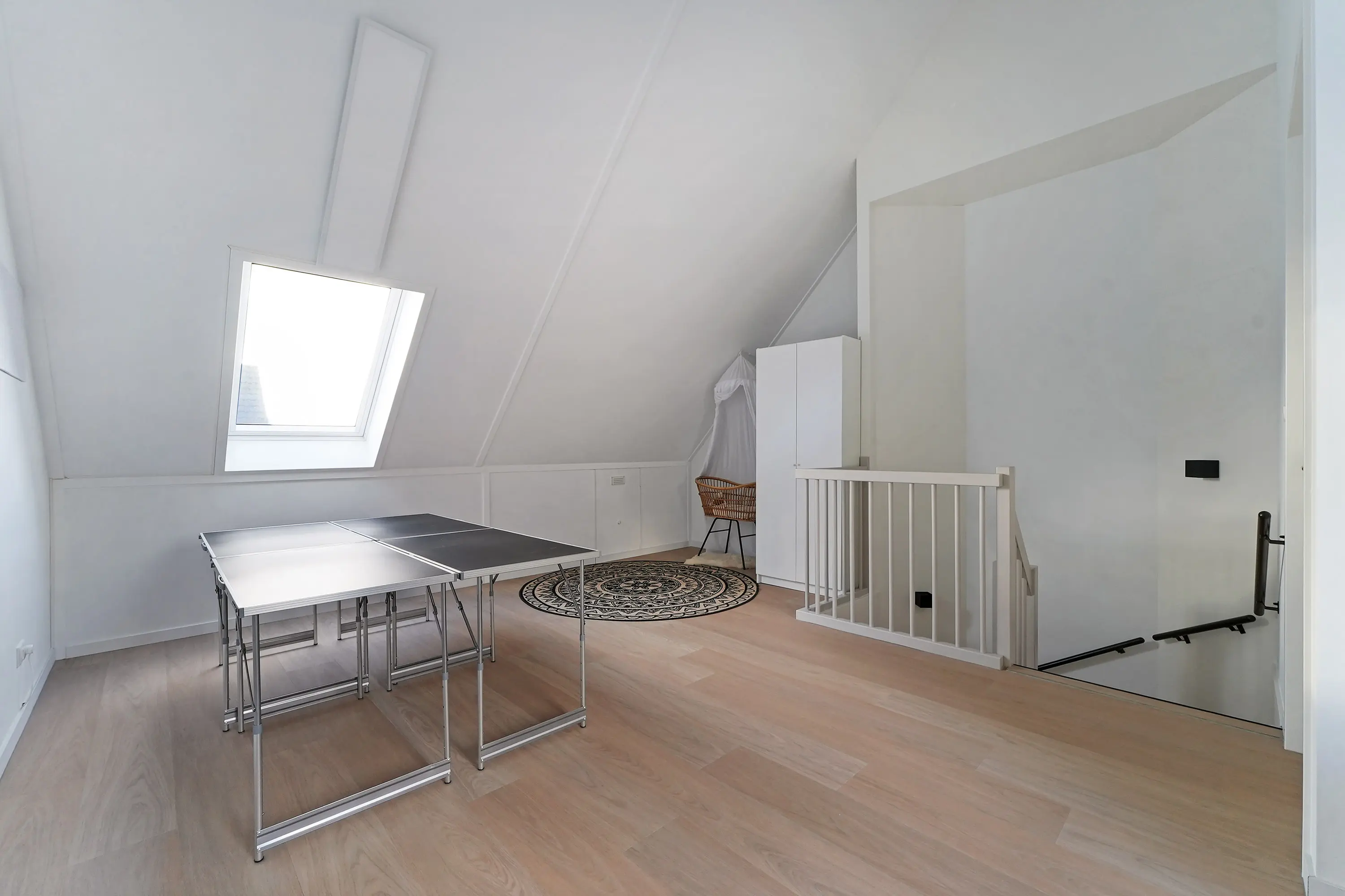 De tweede verdieping vormt een extra aantrekkelijke leefruimte. Ook hier is alles netjes en hoogwaardig afgewerkt. Er is gekozen voor een extra dakraam, wat zorgt voor meer licht en ventilatie. Momenteel wordt deze verdieping gebruikt als hobbyruimte, maar deze kan perfect dienen als extra slaapkamer(s). De technische ruimte bevindt zich hier eveneens, met de witgoedaansluitingen, warmtepomp met boiler, WTW-installatie en omvormer voor de zonnepanelen.