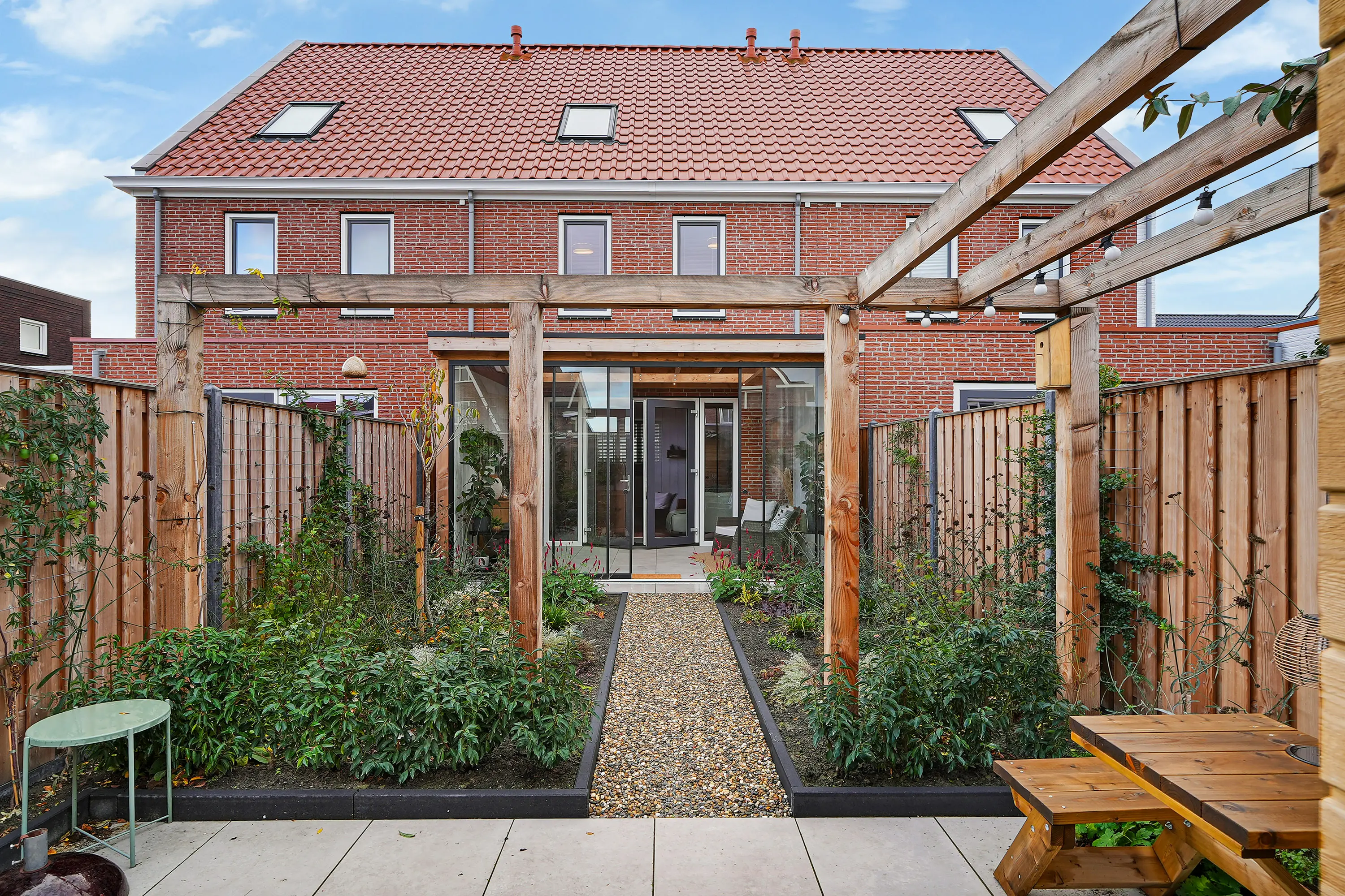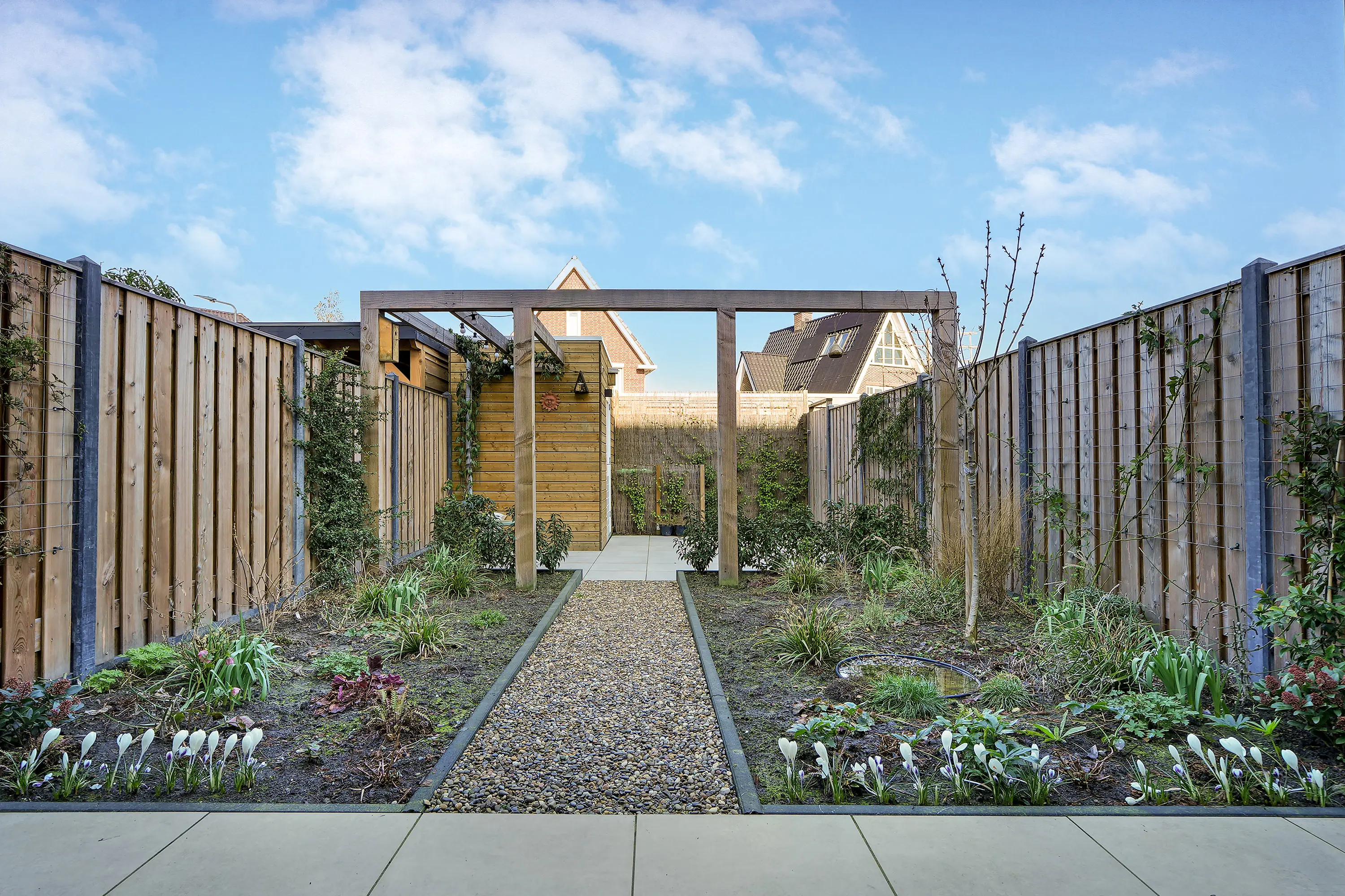 De verzorgd aangelegde tuin is ingericht met diverse planten, bloemen, borders en een extra terras achterin. De ligging op het noordwesten zorgt voor heerlijke middag- en avondzon. De tuin beschikt over een houten berging voor fietsen en tuingereedschap en heeft een vrije achterom.