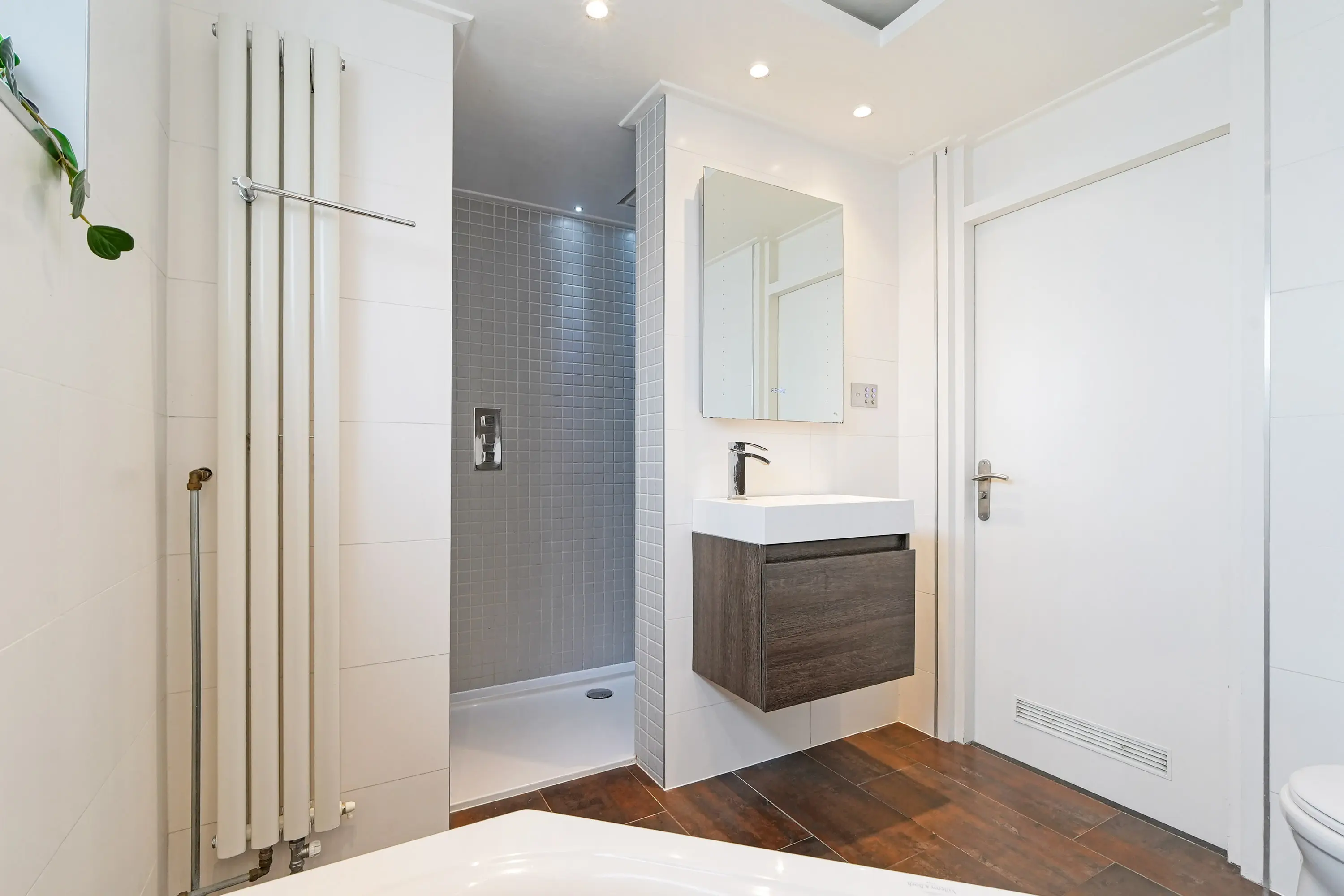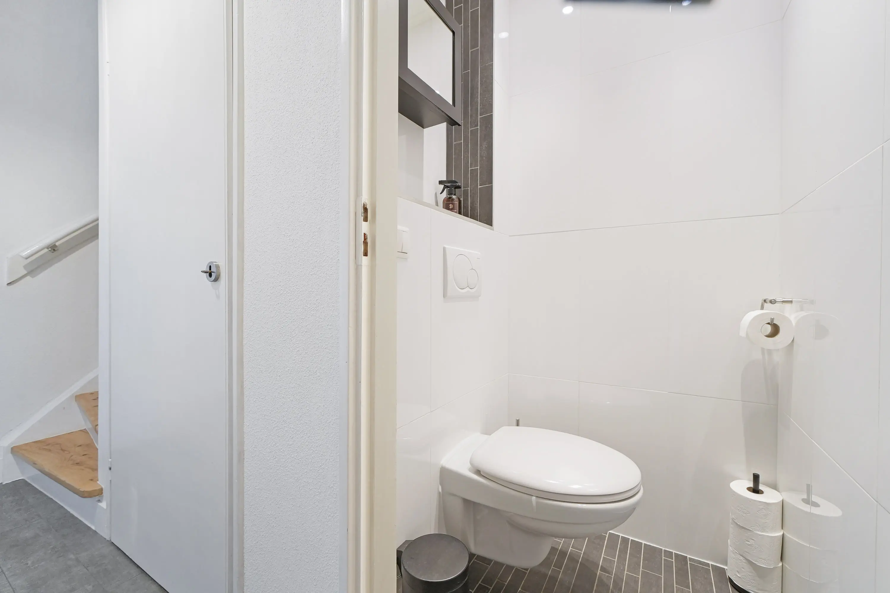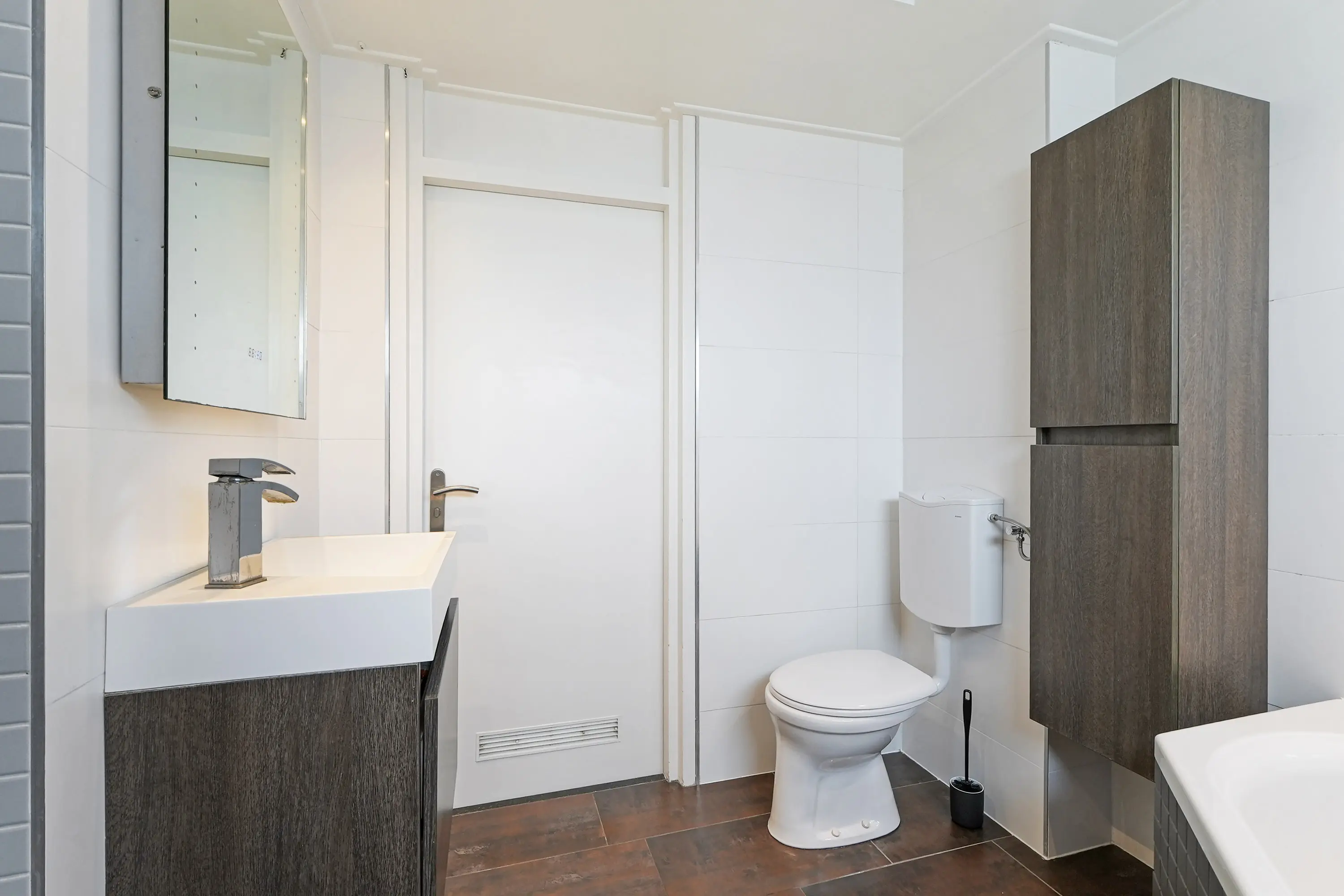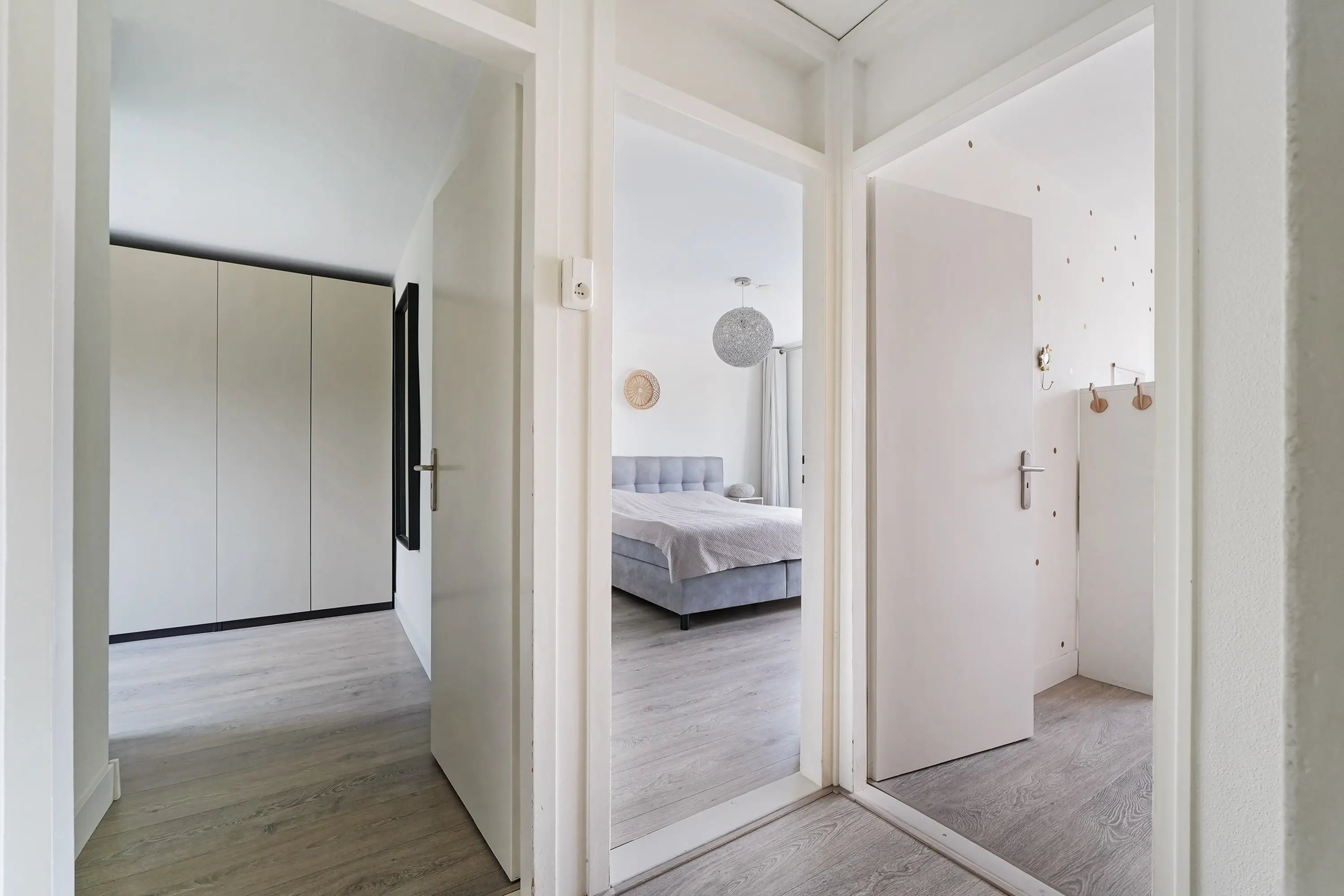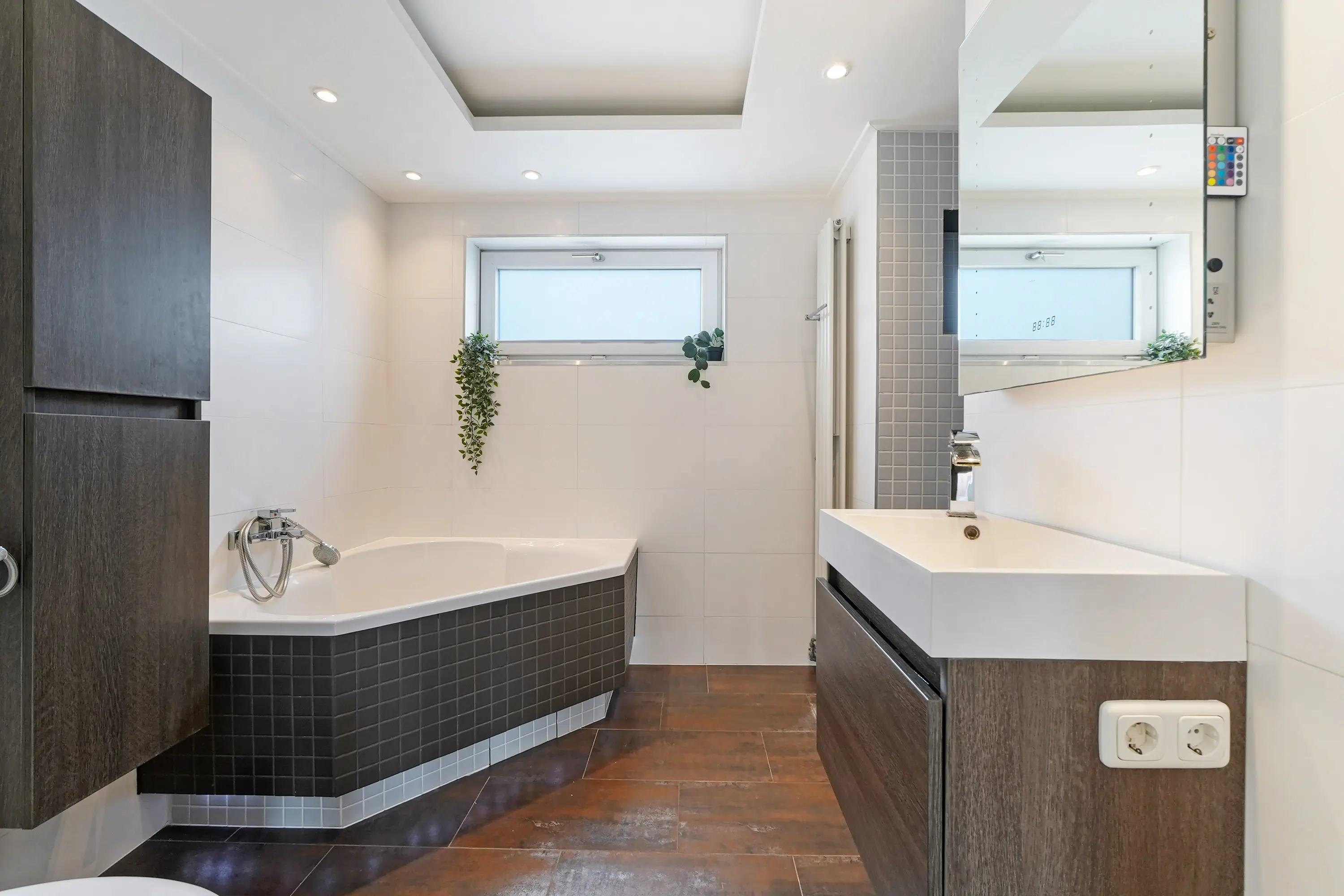 Overloop met vaste trap naar de 2e verdieping, drie ruime slaapkamers waarvan twee met elektrisch bedienbaar rolluik en vervolgens een moderne, complete badkamer met inloopdouche, wastafelmeubel, toilet en hoekbad.