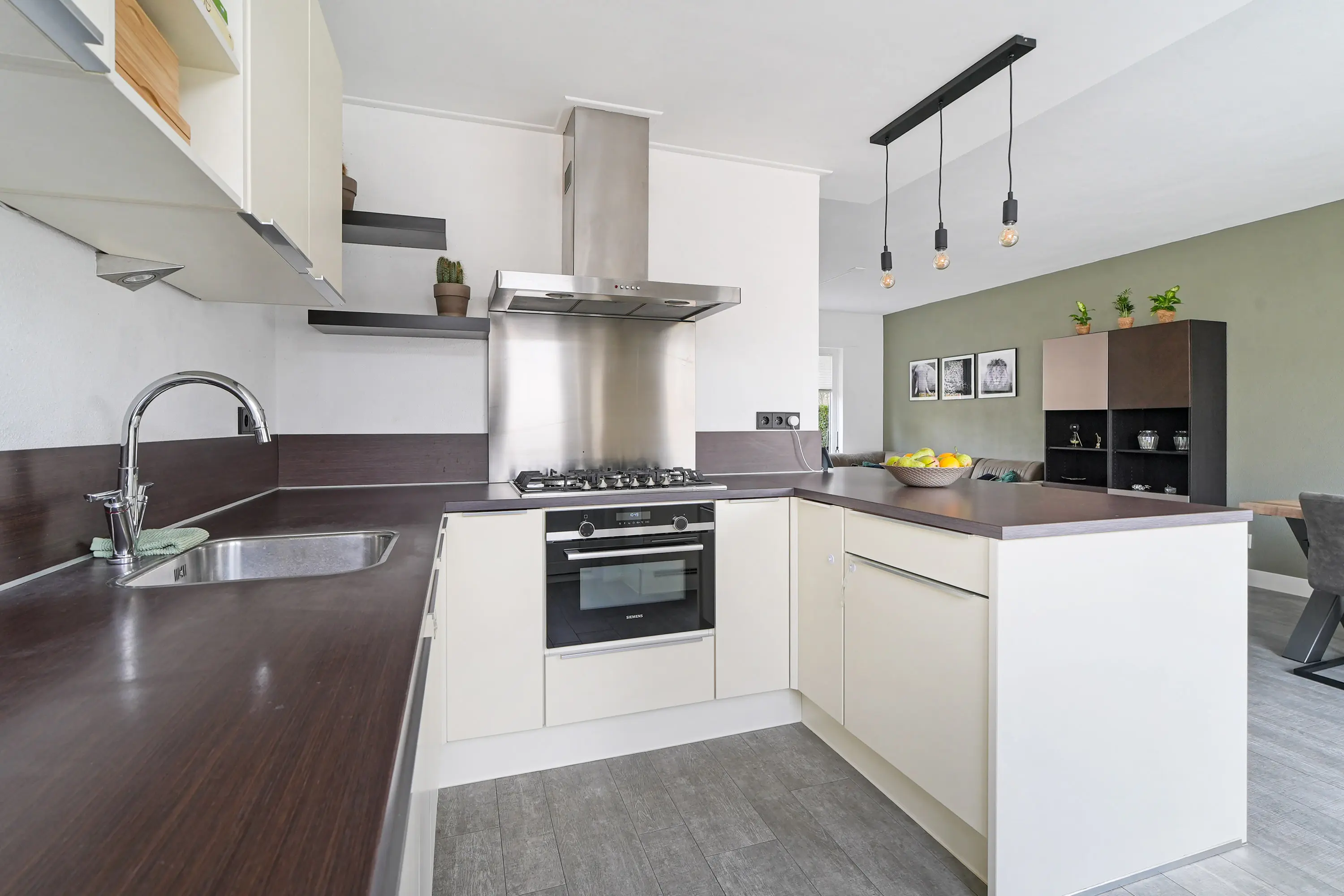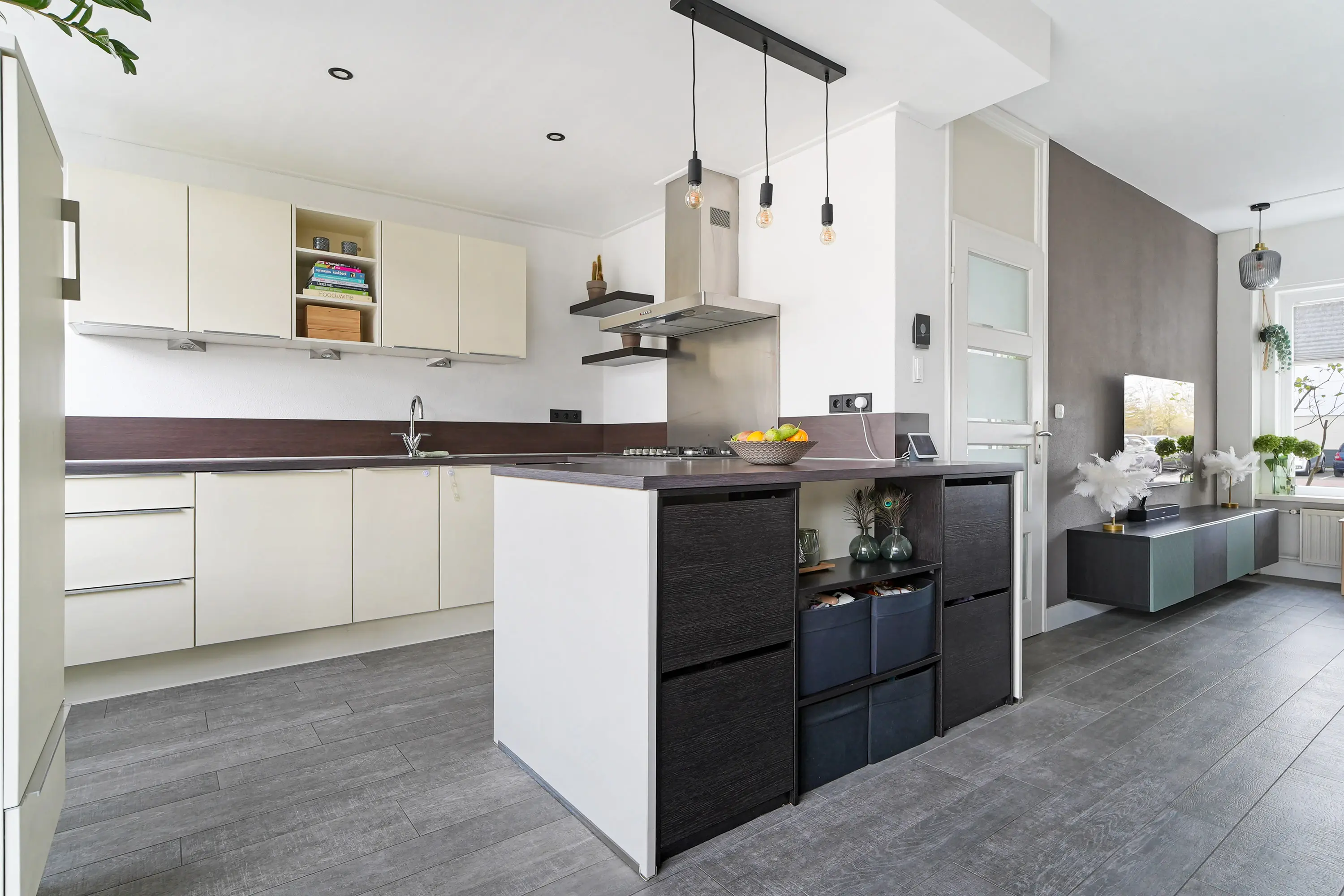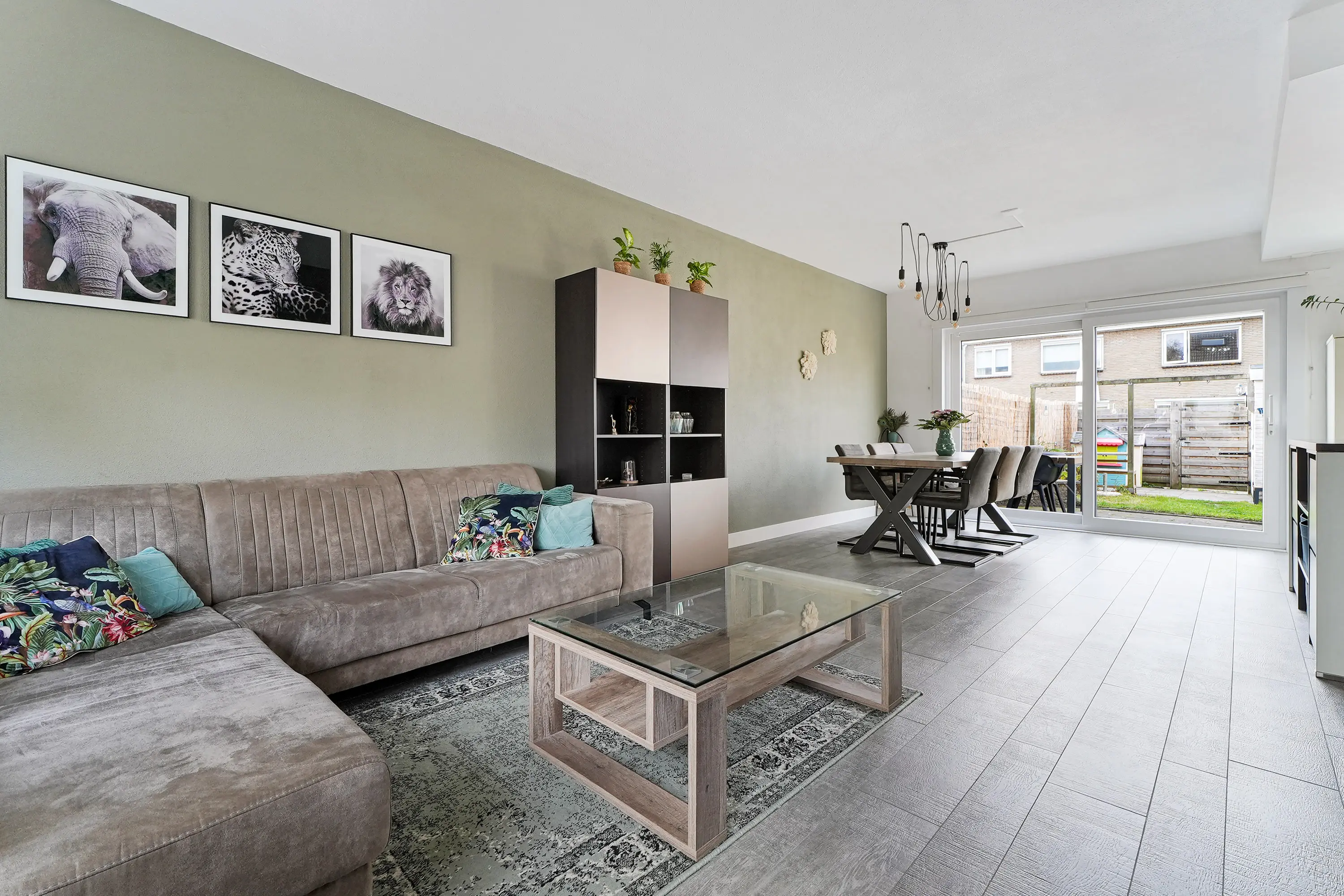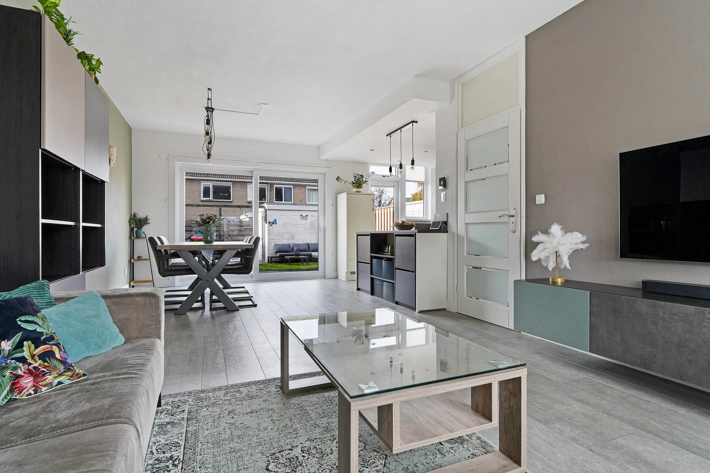 Portaal, hal met modern, volledig betegeld toilet, trapkast, trap naar de 1e verdieping, lichte doorzon woonkamer met elektrisch bedienbaar zonnescherm, schuifpui naar de tuin en open moderne keuken met de inrichting in een hoekopstelling, boven- en onderkasten, tuindeur en inbouwapparatuur: koelkast / oven / 5-pits gaskookplaat / vaatwasser / wasemkap.