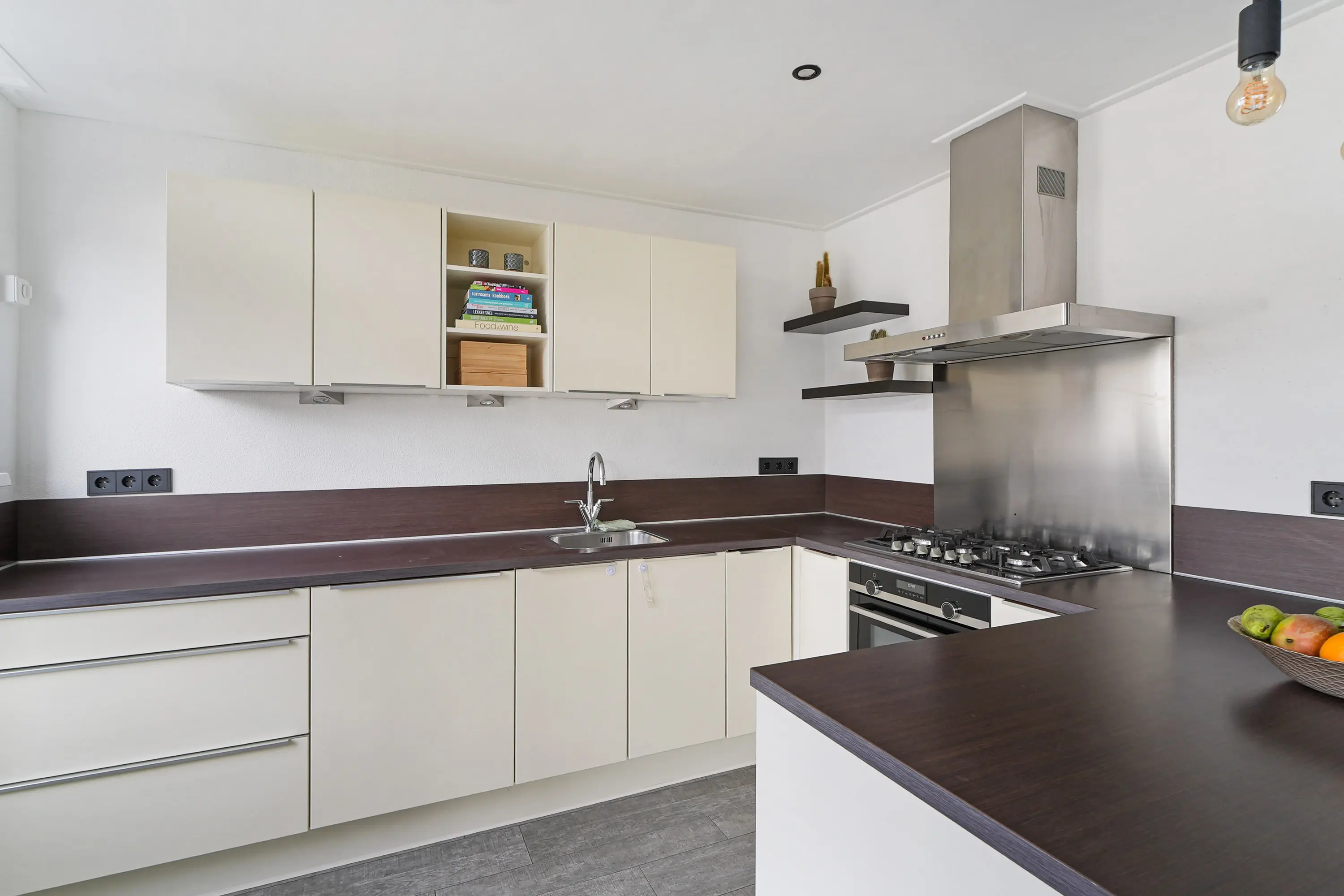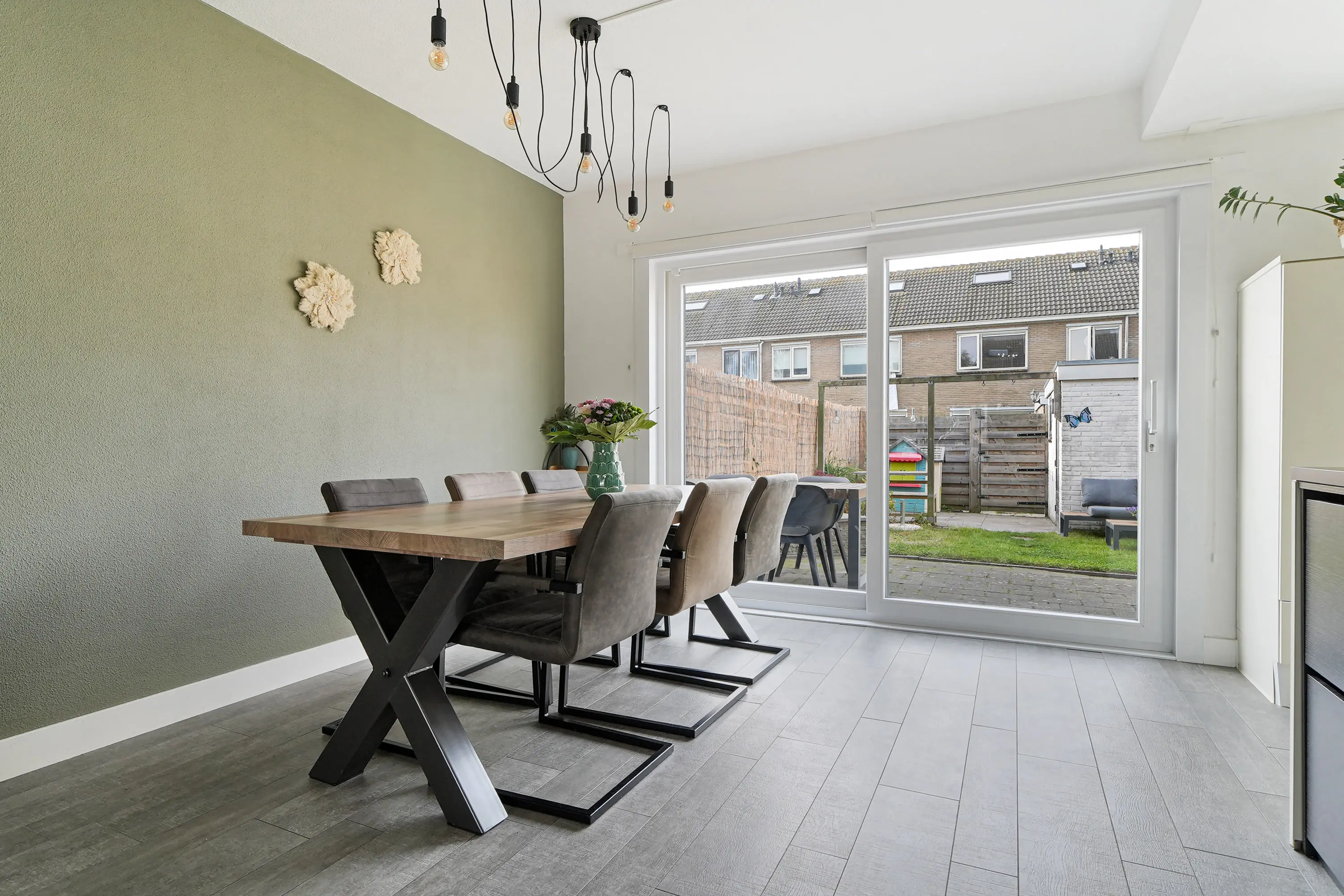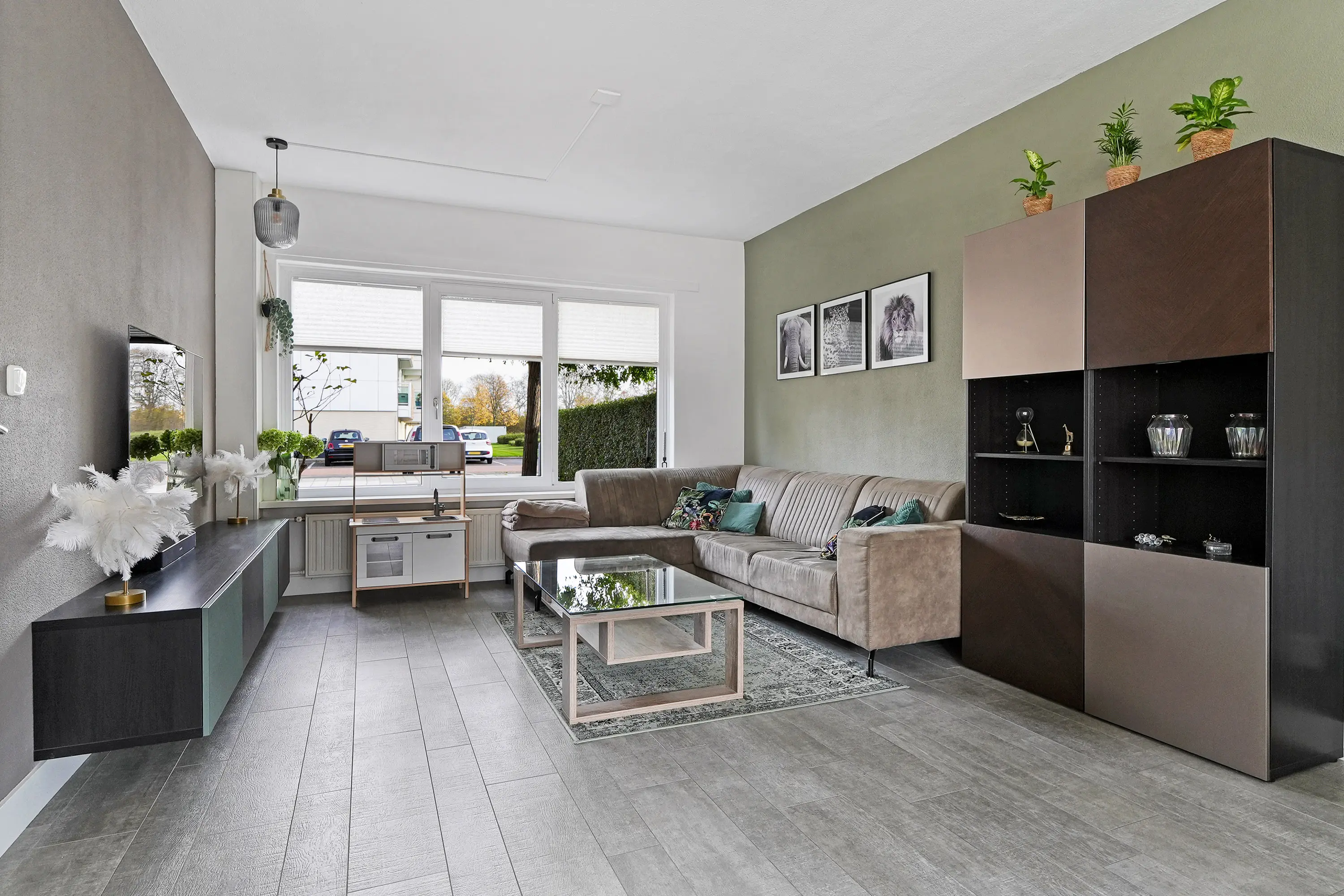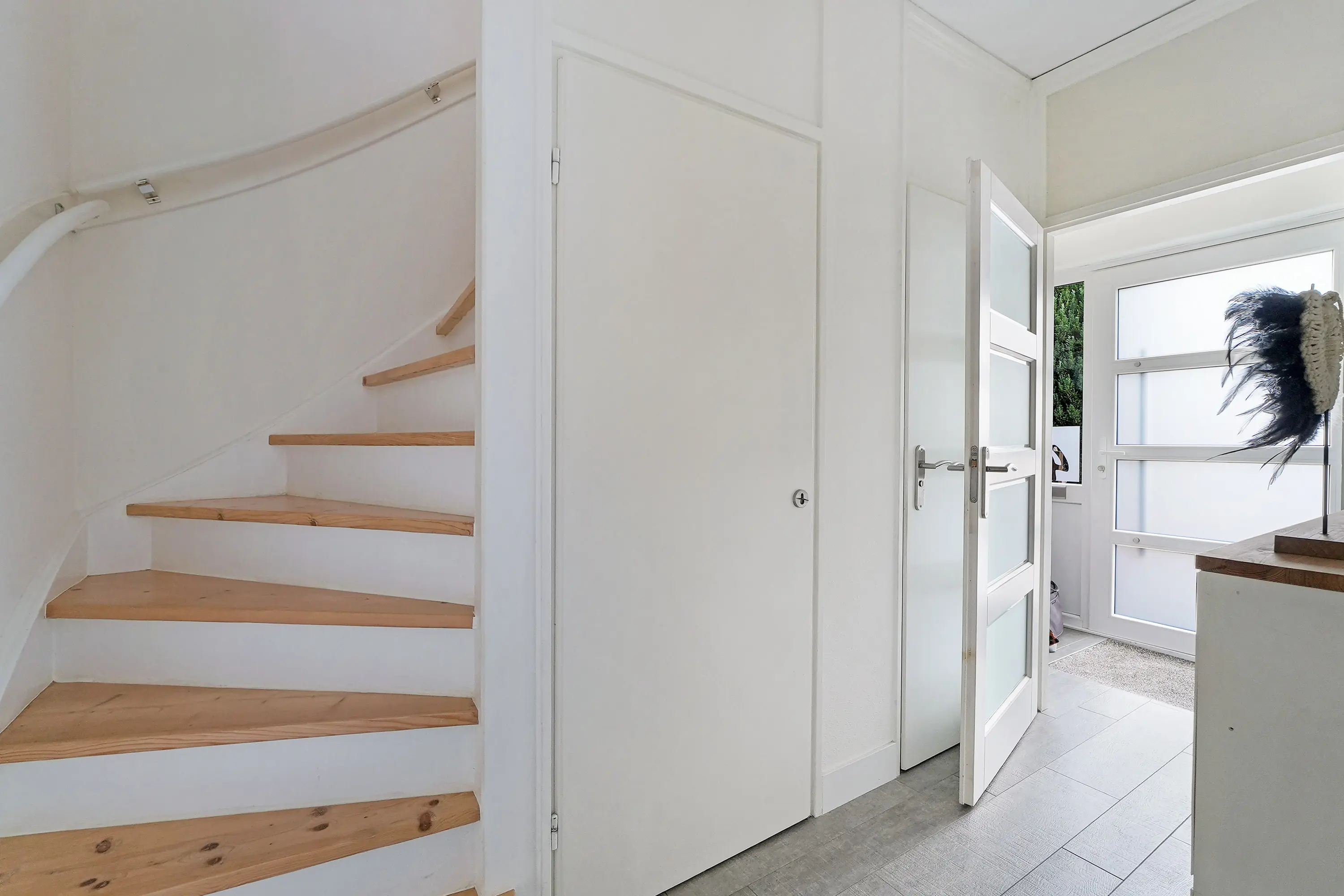 Portaal, hal met modern, volledig betegeld toilet, trapkast, trap naar de 1e verdieping, lichte doorzon woonkamer met elektrisch bedienbaar zonnescherm, schuifpui naar de tuin en open moderne keuken met de inrichting in een hoekopstelling, boven- en onderkasten, tuindeur en inbouwapparatuur: koelkast / oven / 5-pits gaskookplaat / vaatwasser / wasemkap.