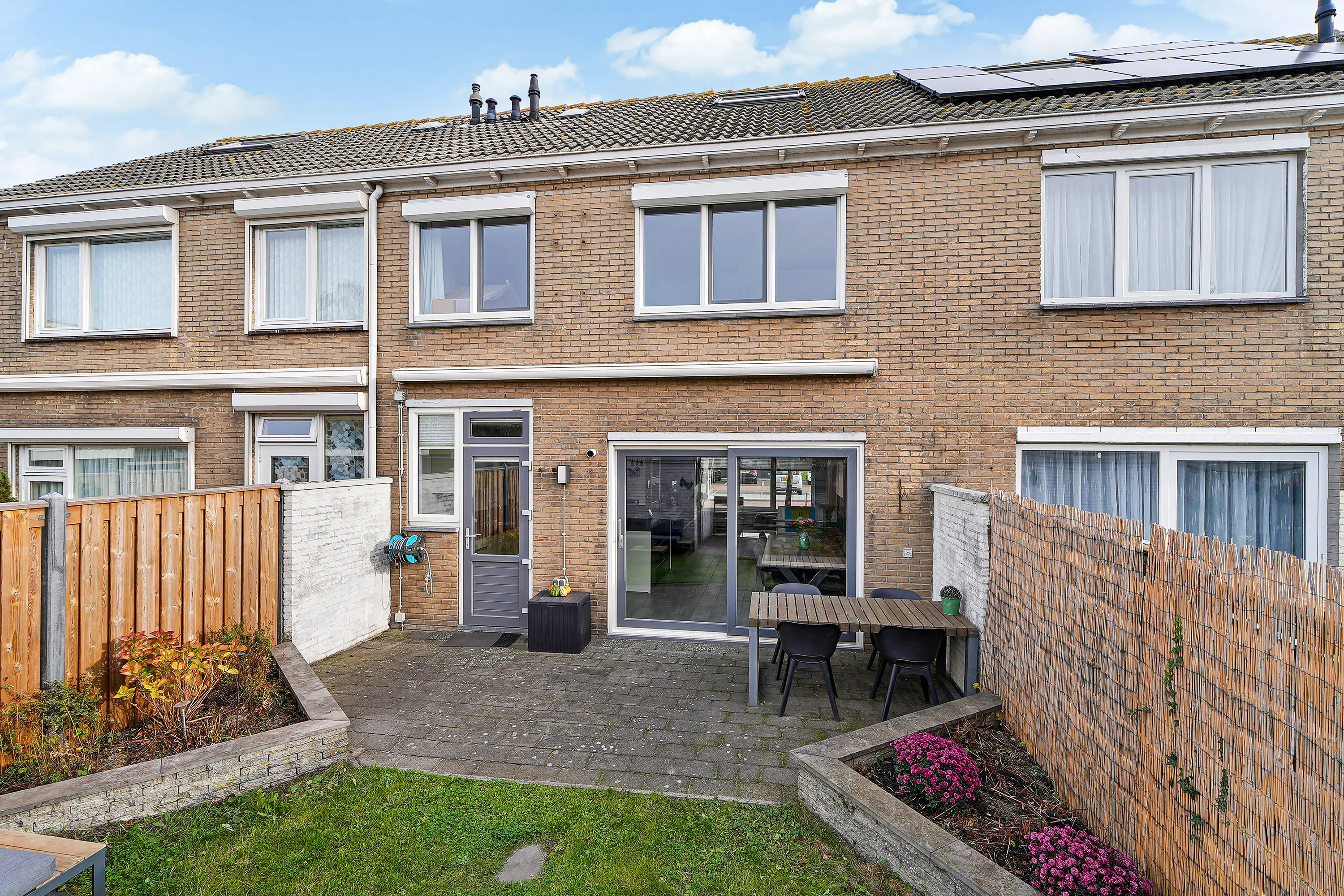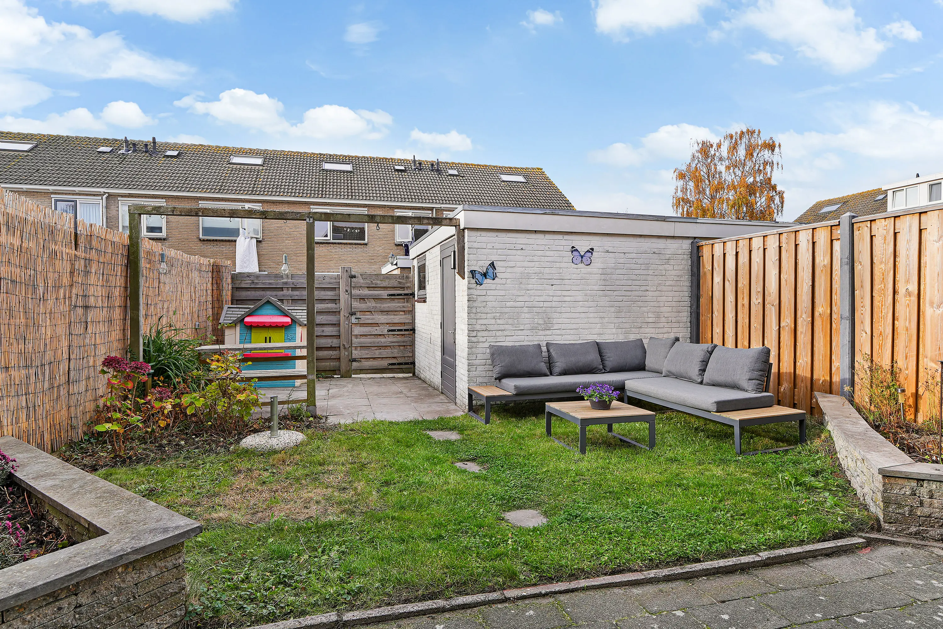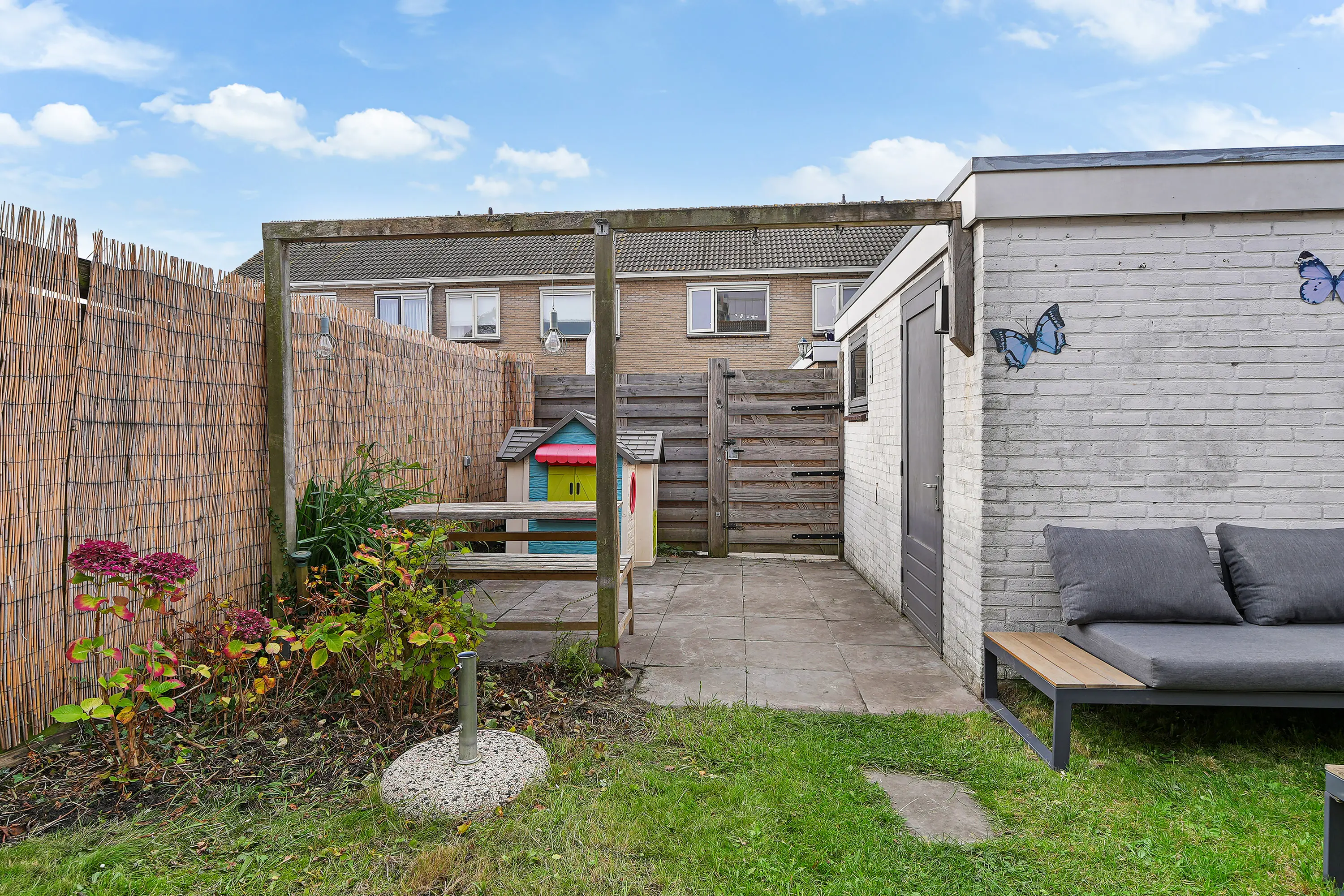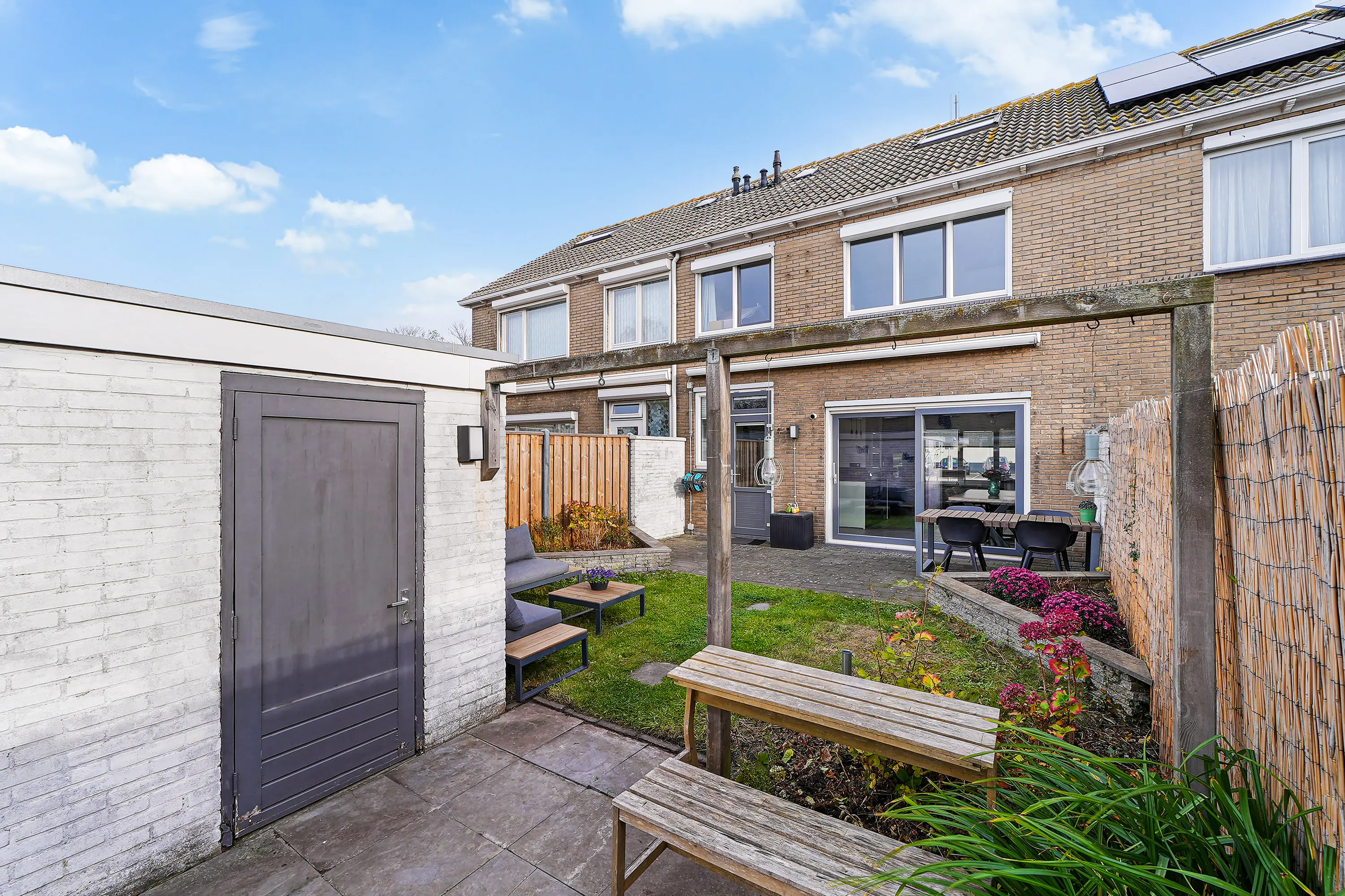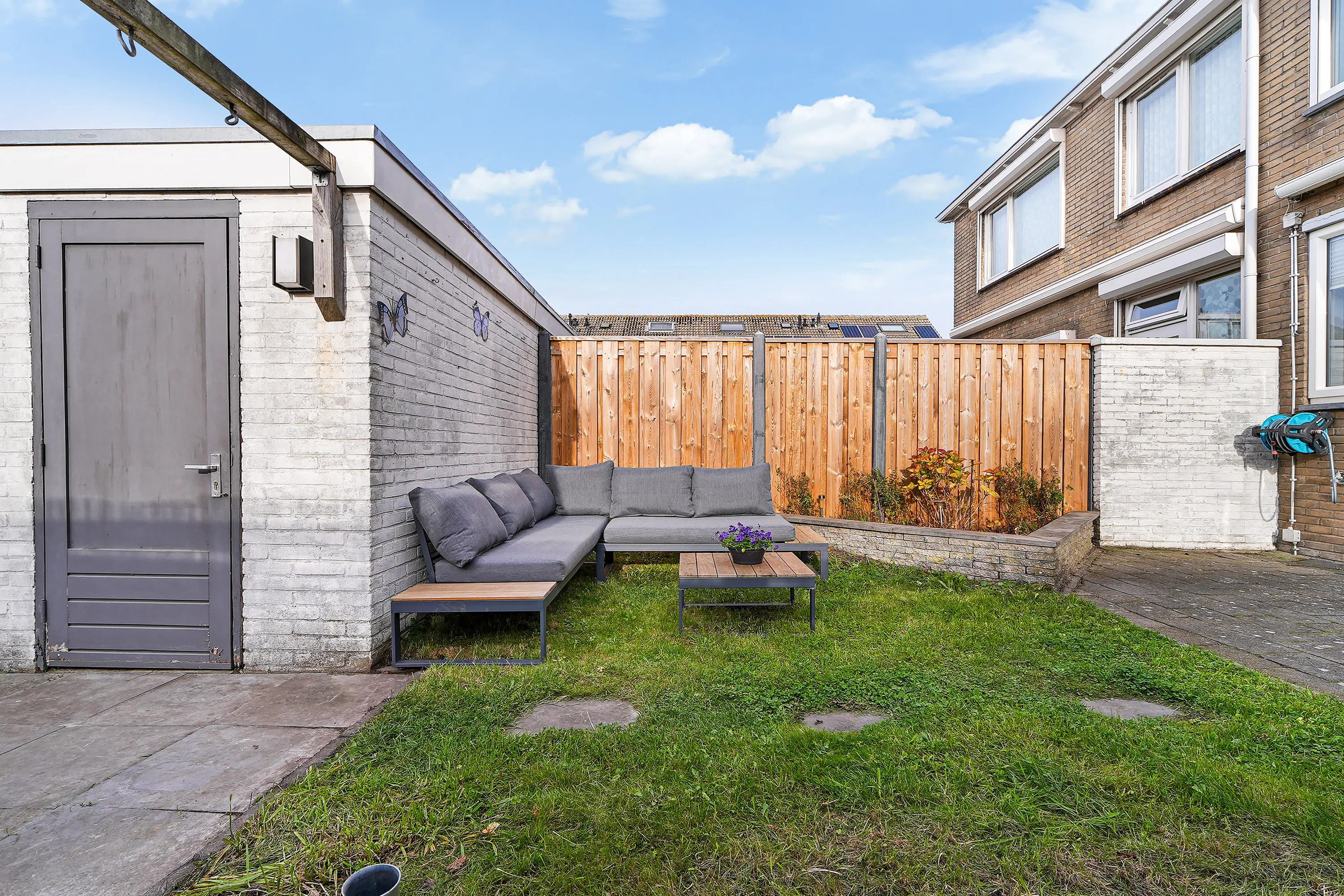 De zonnige achtertuin op het zuidwesten is voorzien van achterom, diverse terrassen, buitenkraan en halfvrijstaande stenen berging met elektra en verlichting. Er is tevens een verzorgde voortuin.