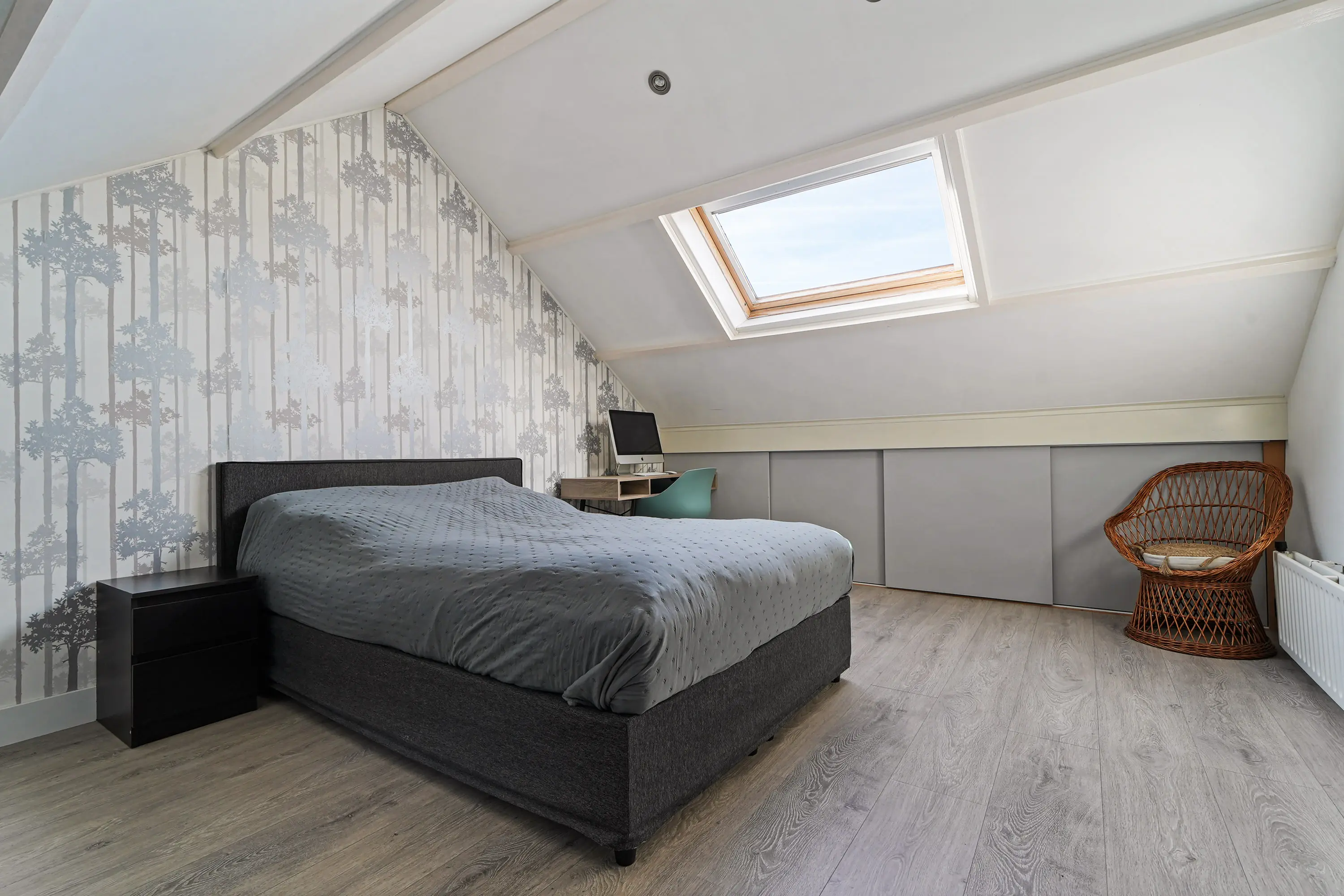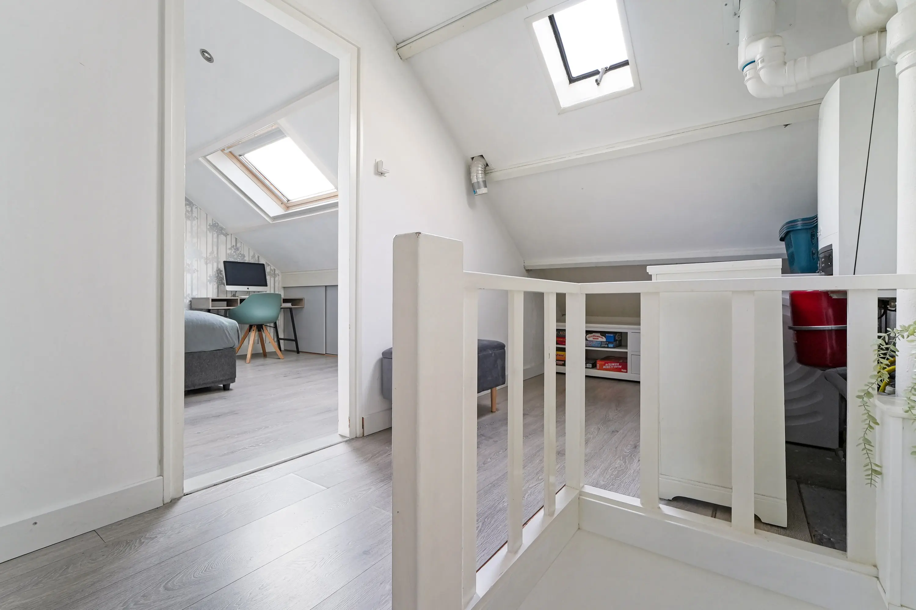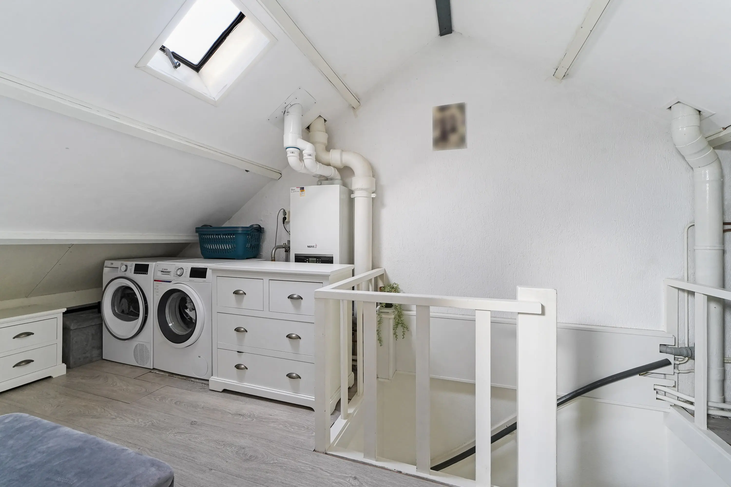 Overloop met wasmachineaansluiting en opstelling c.v.-ketel en tenslotte een ruime vierde slaapkamer met dakraam voorzien van screen en bergruimte.