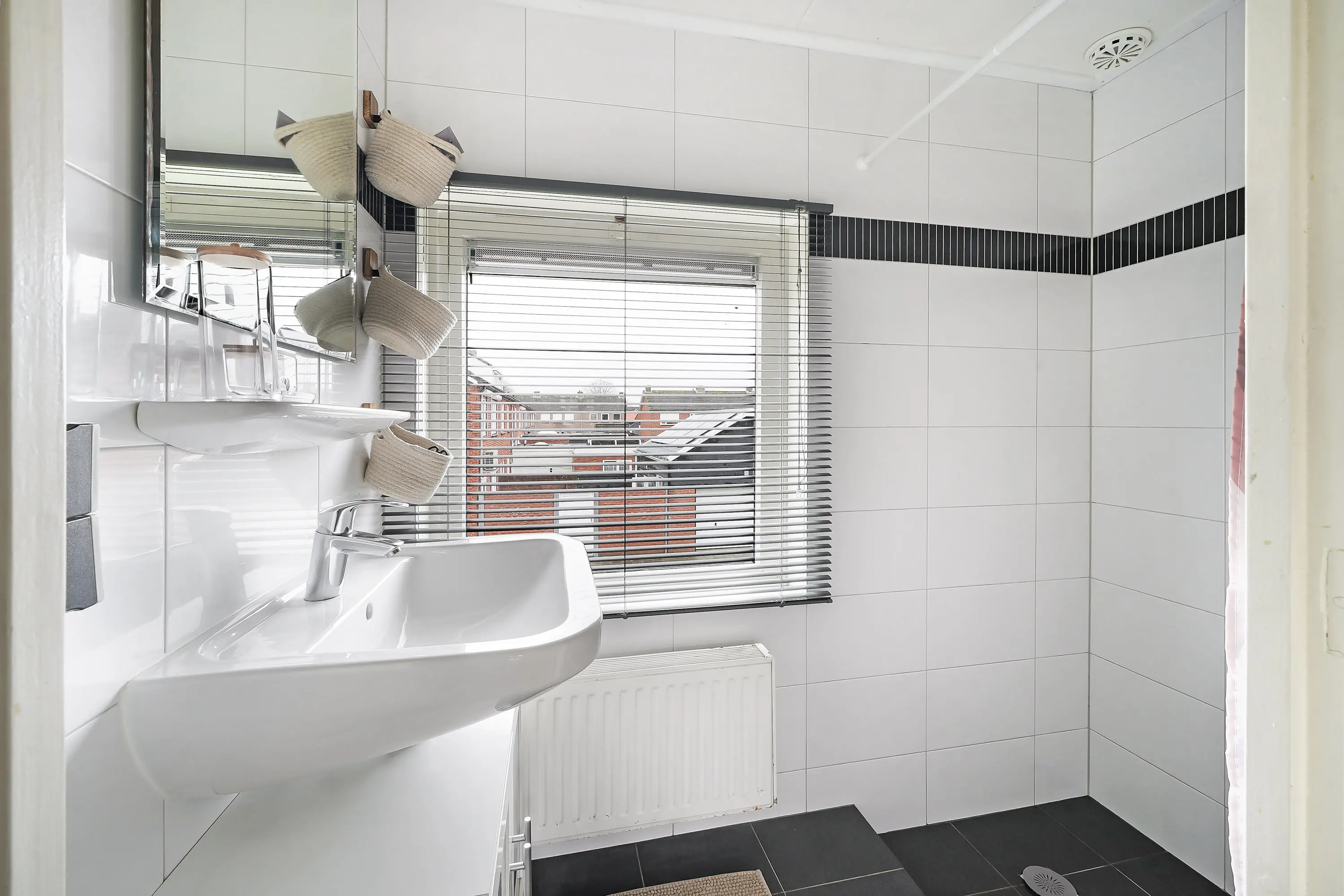 De overloop geeft toegang tot 3 slaapkamers, waarvan twee ruim van formaat zijn. De badkamer, die u ook via de overloop bereikt, is voorzien van een inloopdouche en wastafel. Ook hier een fijne lichtinval door de grote raampartijen op alle slaapkamers.