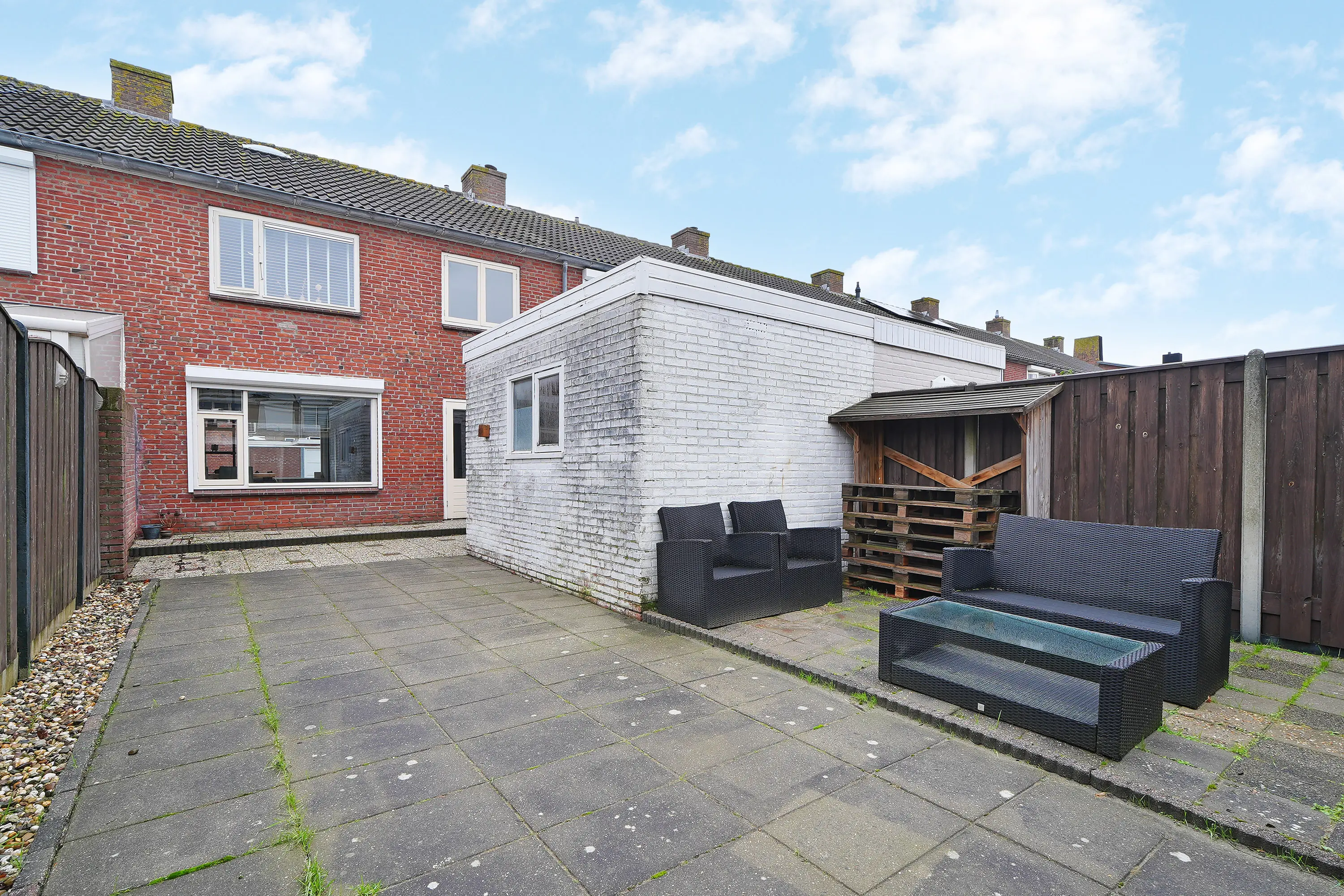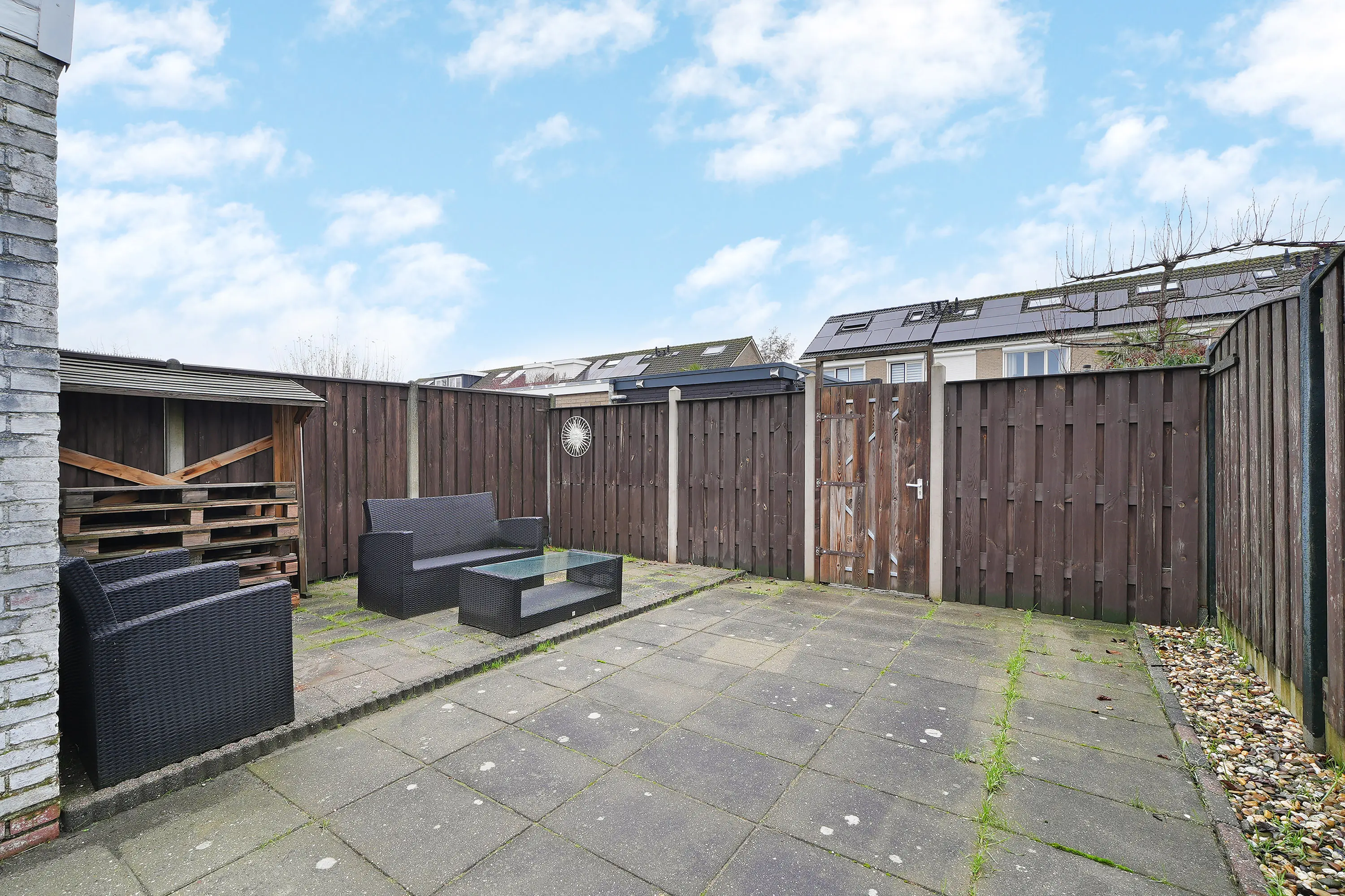 De tuin is ruim van opzet, gelegen op het noordoosten met vrije achterom. Gezien de vrije ligging en de diepte van de tuin zijn er diverse zitplekken met zon of schaduw. Een stenen berging maakt het geheel compleet.