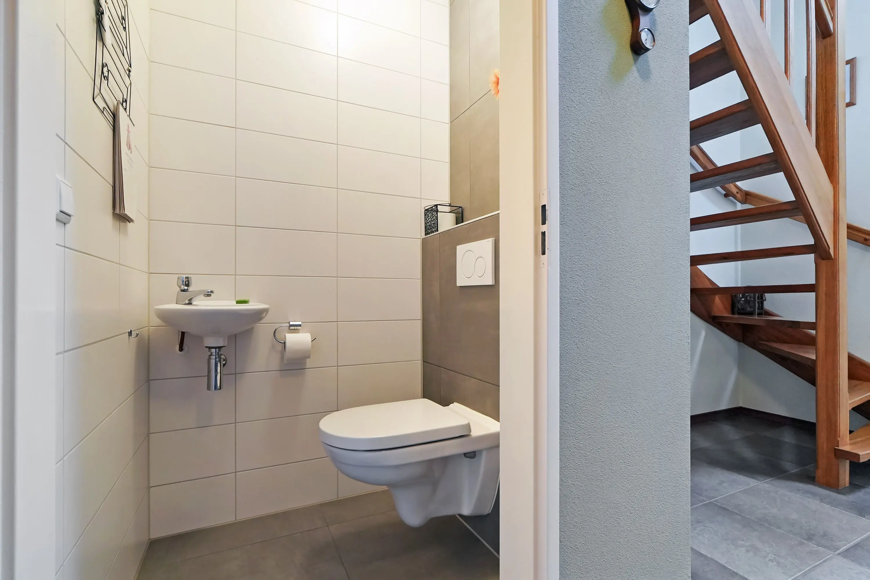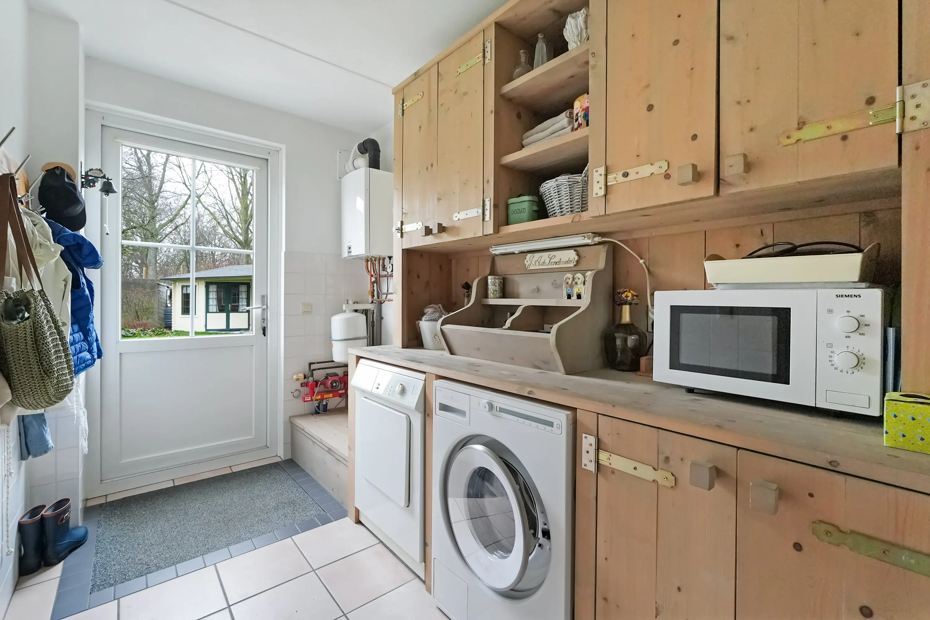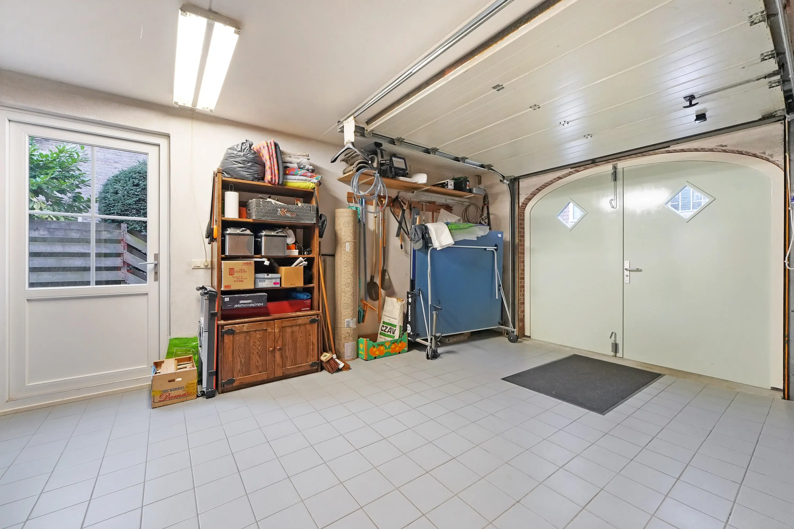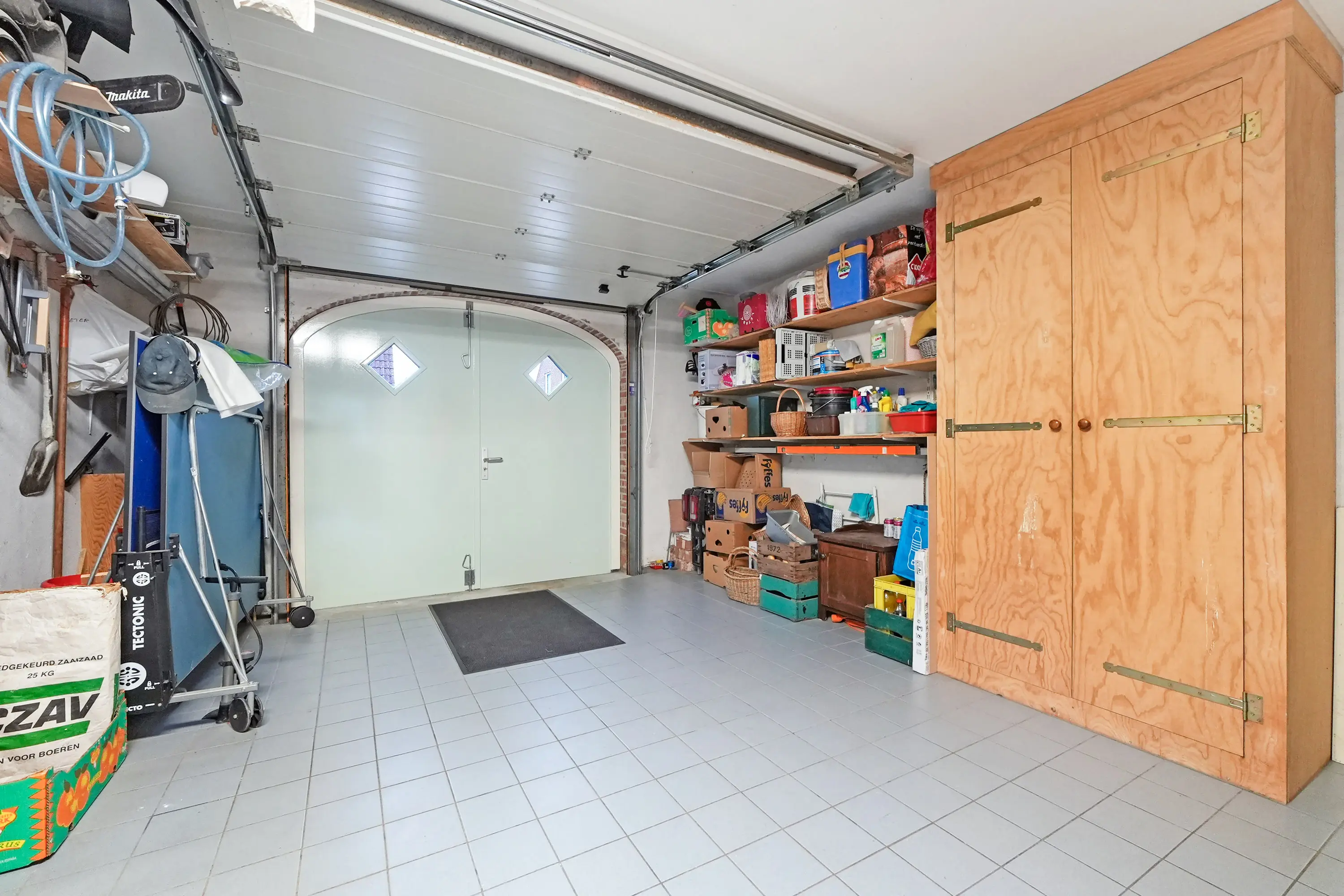 Aangrenzend bevindt zich de praktische bijkeuken met opstelplaats voor de cv-ketel (bouwjaar 2023) en aansluitingen voor wasmachine en droger, met daarnaast extra bergruimte, vanuit hier heeft u toegang tot de tuin. Daarnaast loopt u vanuit hier richting de ruim bemeten garage ideaal voor het parkeren van de auto, fietsen en het opbergen van gereedschap en tuinspullen. De prachtig openslaande garagedeuren zijn hier echt een eyecatcher!