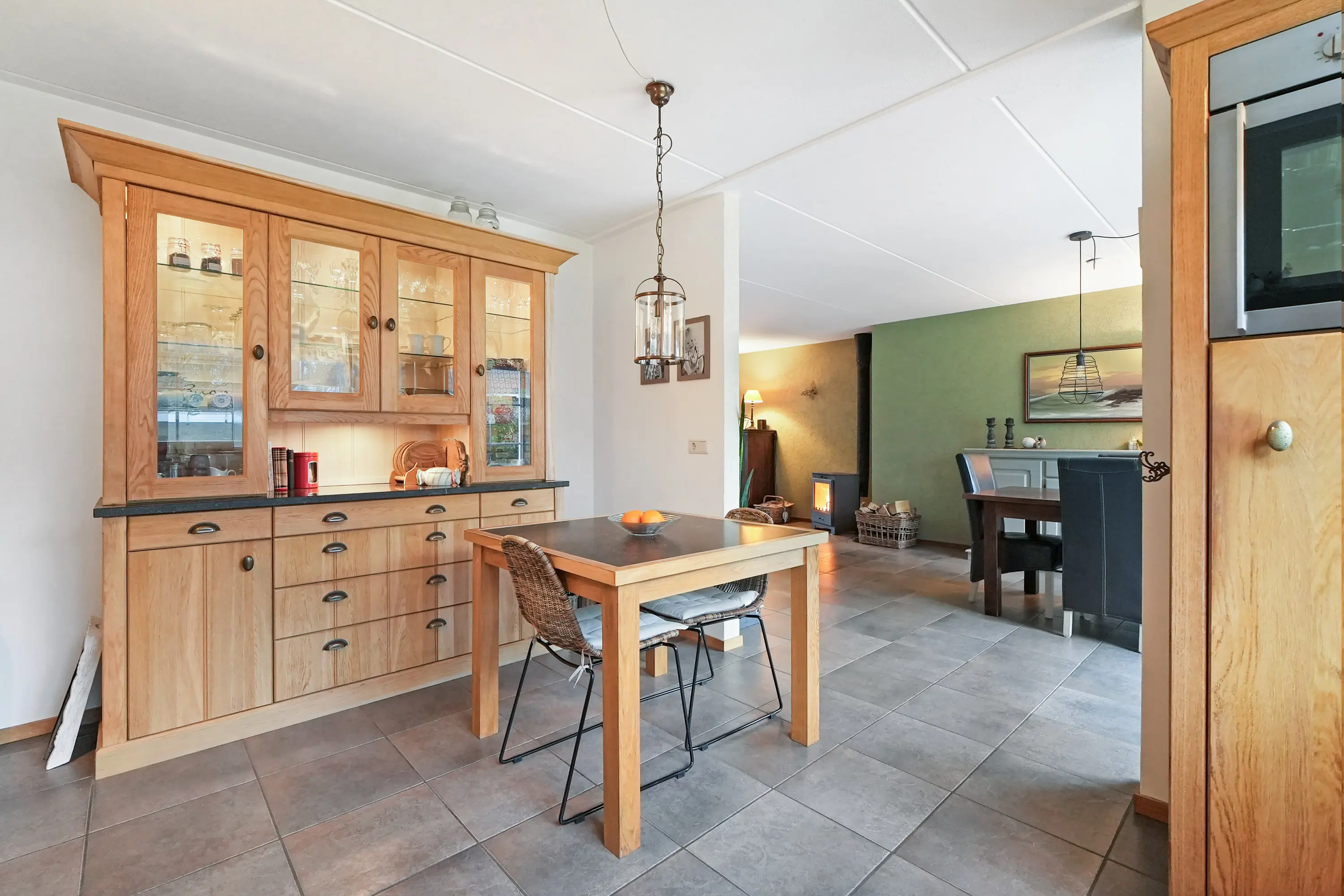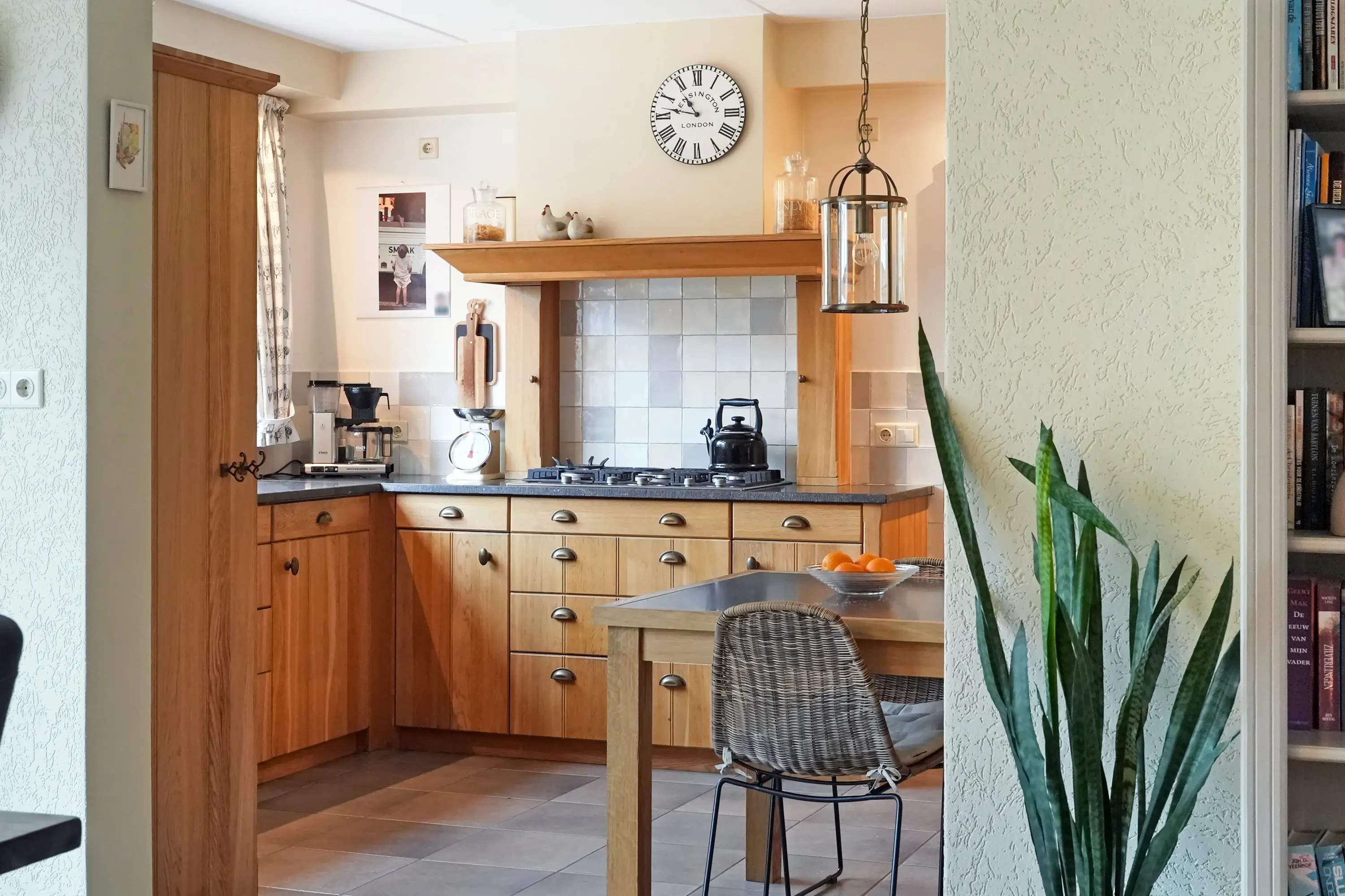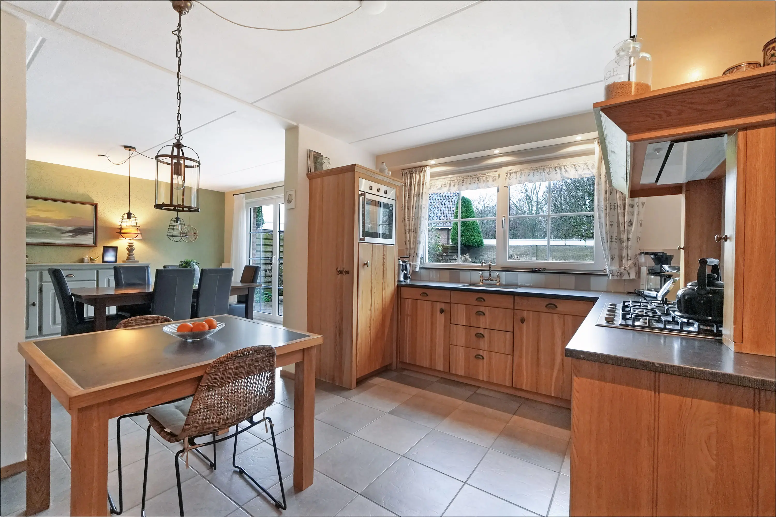 Naast de eetkamer komt u in de halfopen keuken, welke naadloos aansluit op de eetkamer en is uitgevoerd in een prachtige houtsoort, wat zorgt voor een warme en stijlvolle uitstraling. De keuken is voorzien van diverse inbouwapparatuur en biedt volop werk- en bergruimte. De ruimte in de keuken biedt ook de mogelijkheid om hier rond tafel te kunnen zitten.