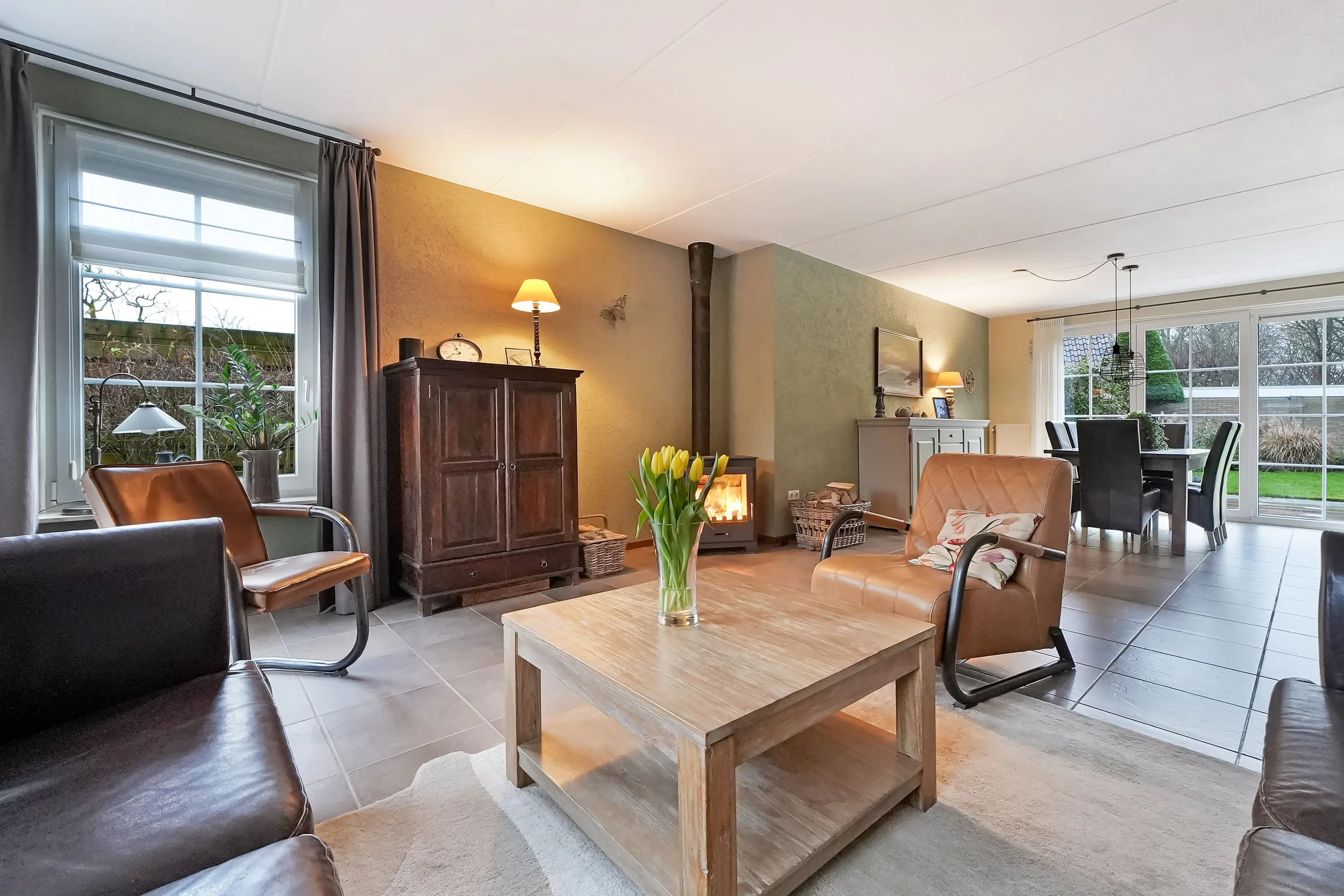 Via de entree met meterkast en modern afgewerkt toilet komt u in de hal, waar de indrukwekkende vide direct in het oog springt en een ruimtelijk gevoel geeft. Vanuit de hal heeft u toegang tot de lichte en royale woon- en eetkamer. De houtkachel geeft hier een gezellige en huiselijke sfeer maar ook veel warmte! De grote raampartijen zorgen voor veel natuurlijk lichtinval en een prettige verbinding met de tuin. De woonkamer bevindt zich aan de voorzijde en de eetkamer aan de achterzijde, vanuit hier heeft u toegang tot de tuin middels openslaande tuindeuren. De gehele begane grondvloer in het woongedeelte is voorzien van een prachtige tegel.