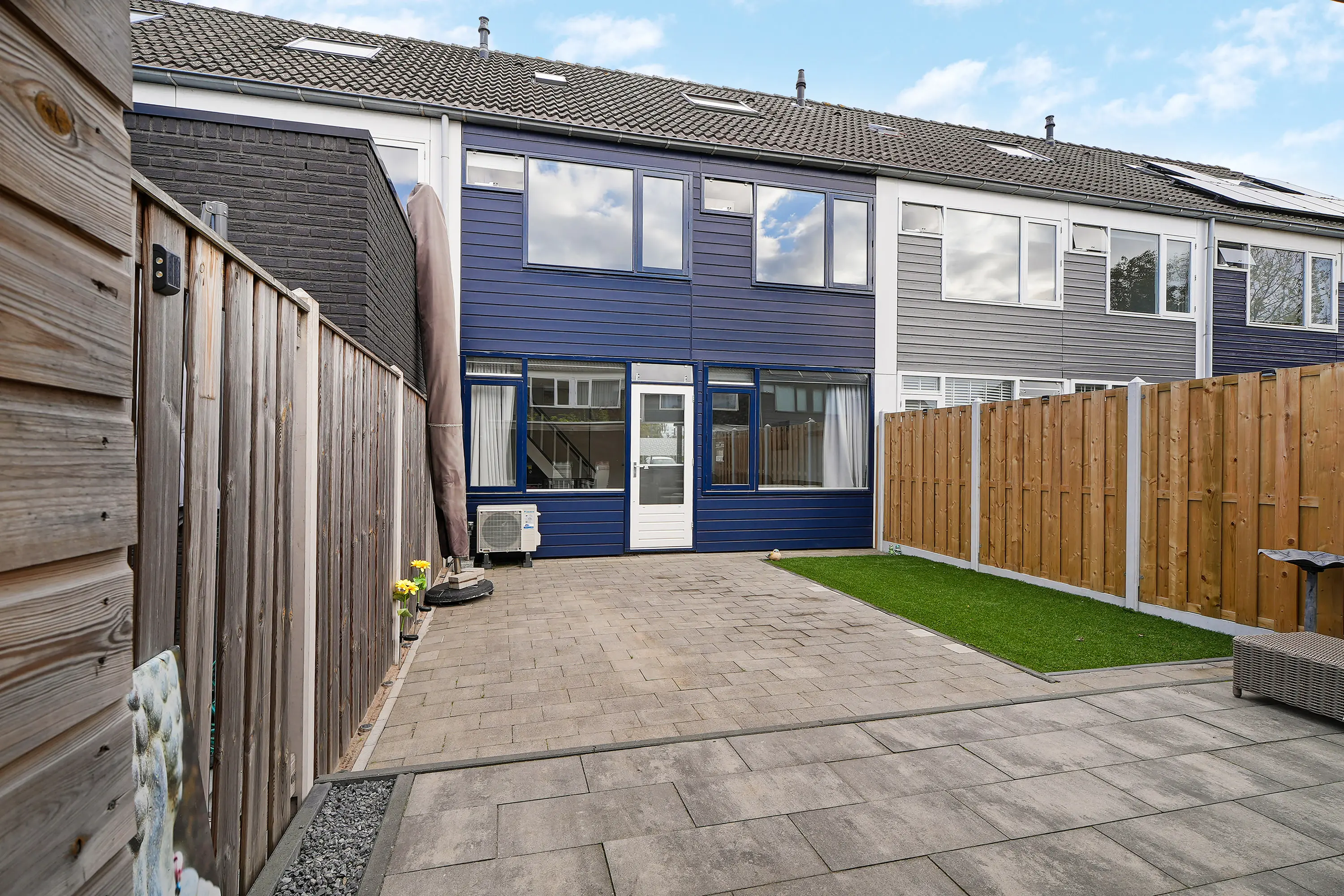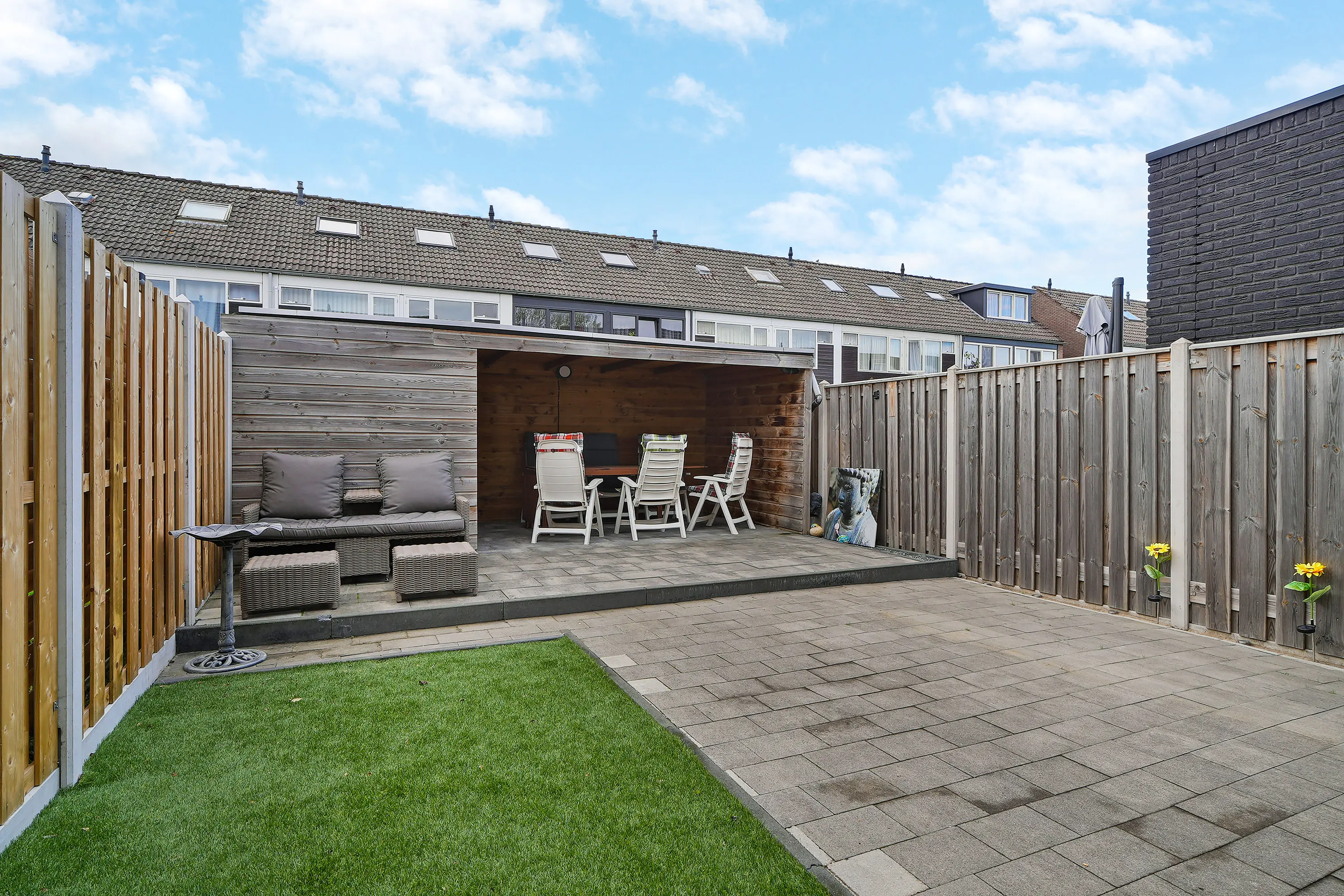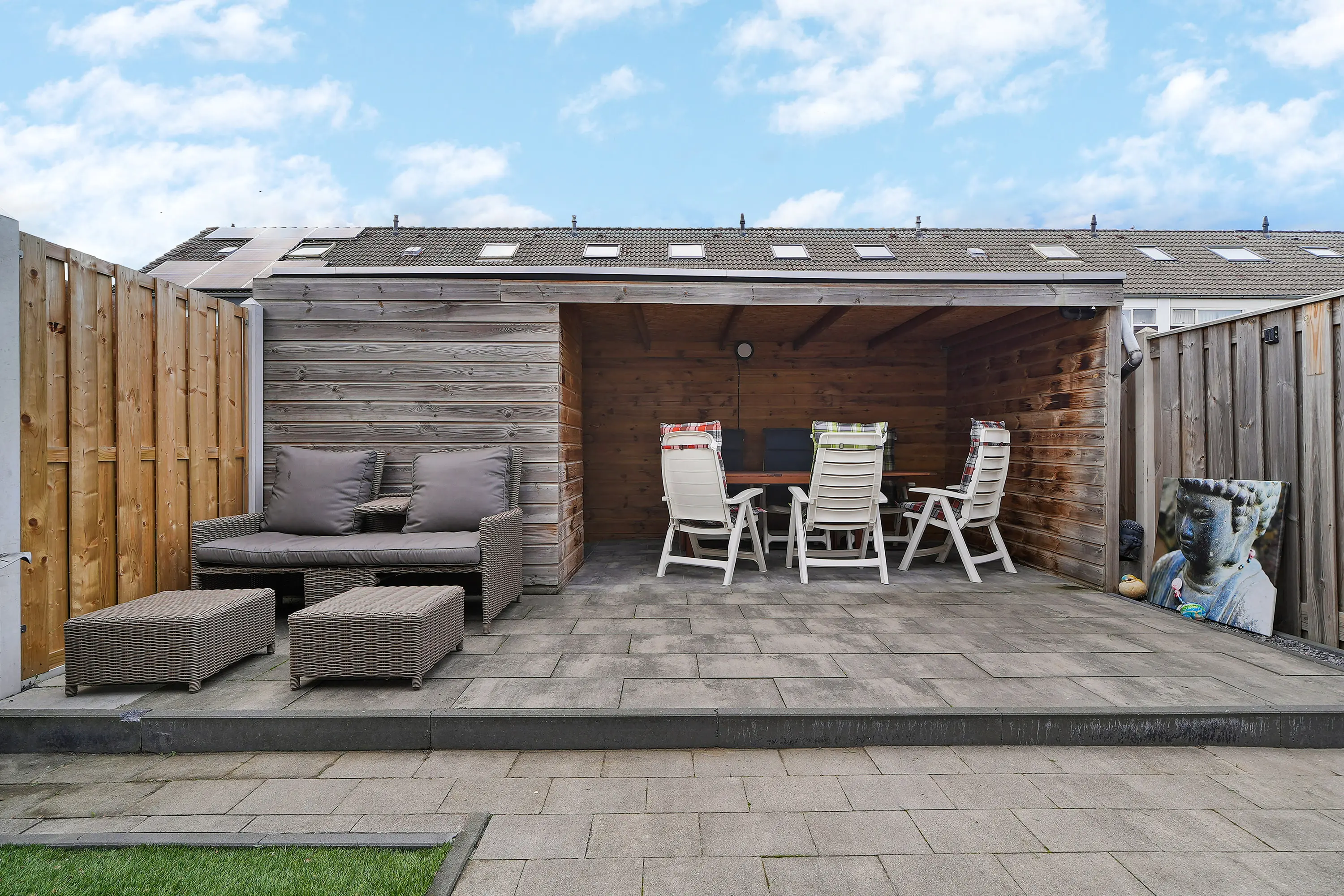 De achtertuin is in 2022 vernieuwd met nieuwe bestrating, schuttingen en een fraaie overkapping. De schutting aan de linkerzijde (vanuit de woning gezien) is recent nog vervangen. De tuin ligt op het westen en heeft geen vrije achterom. Aan de voorzijde is ruimte voor twee auto’s en kunnen fietsen worden gestald in de berging.