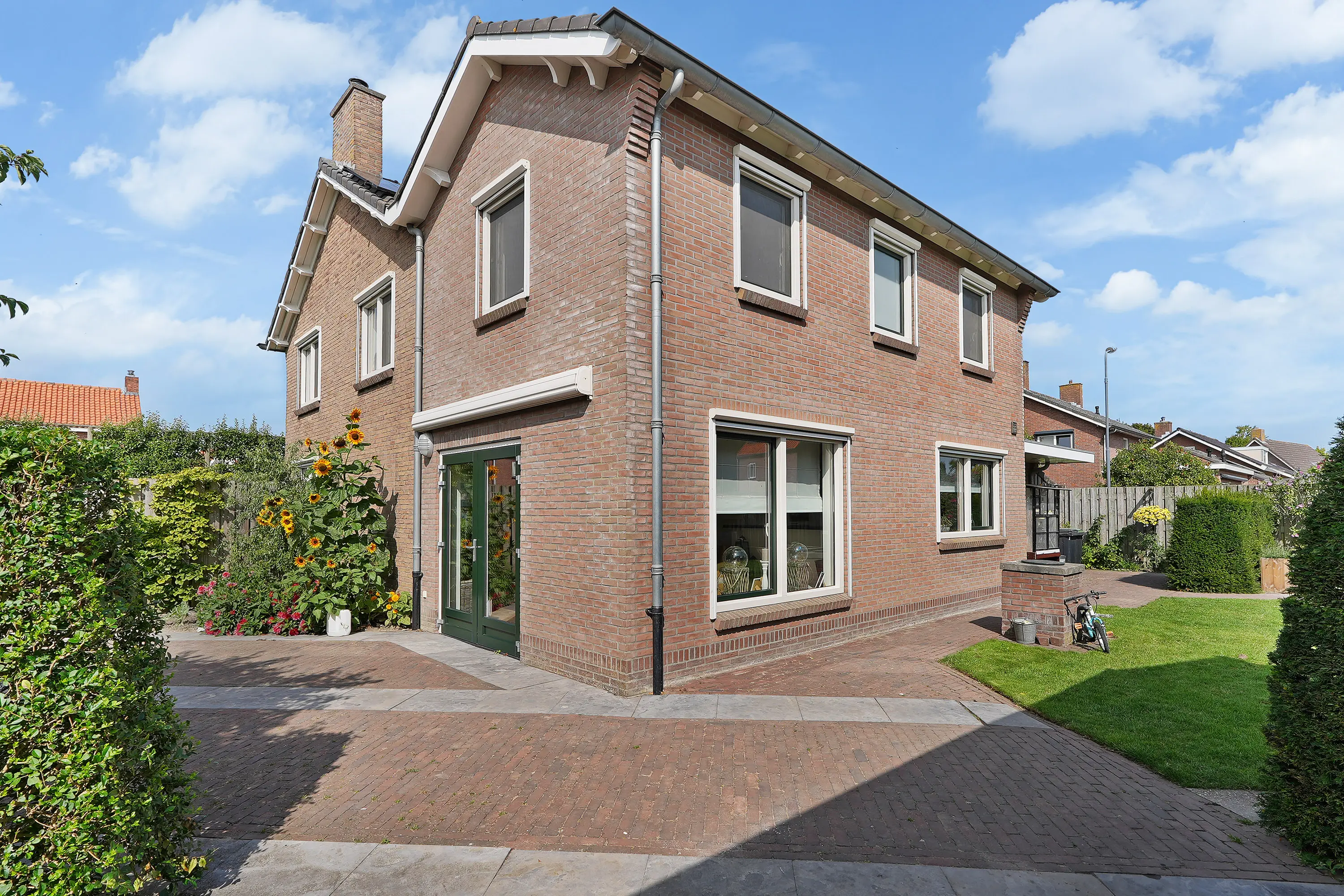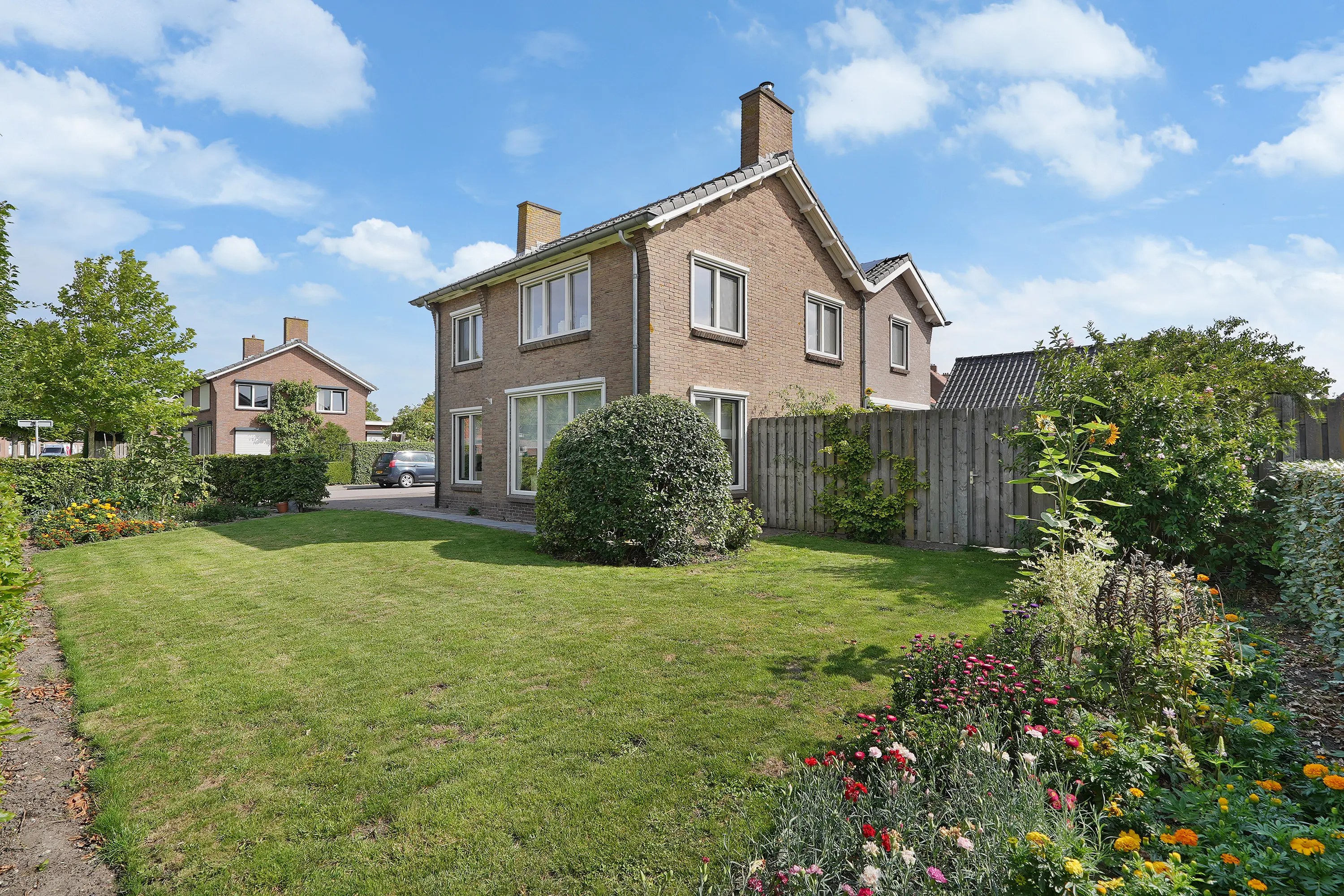 De tuin rondom de woning is royaal en groen aangelegd, o.a. voorzien van 2 terrassen, hagen, bomen en diverse beplanting. Achterin de tuin staat een grote, traditioneel gemetselde schuur met isolatie, elektra en een praktische vliering. Een fijne plek voor hobby’s, opslag of werkruimte.