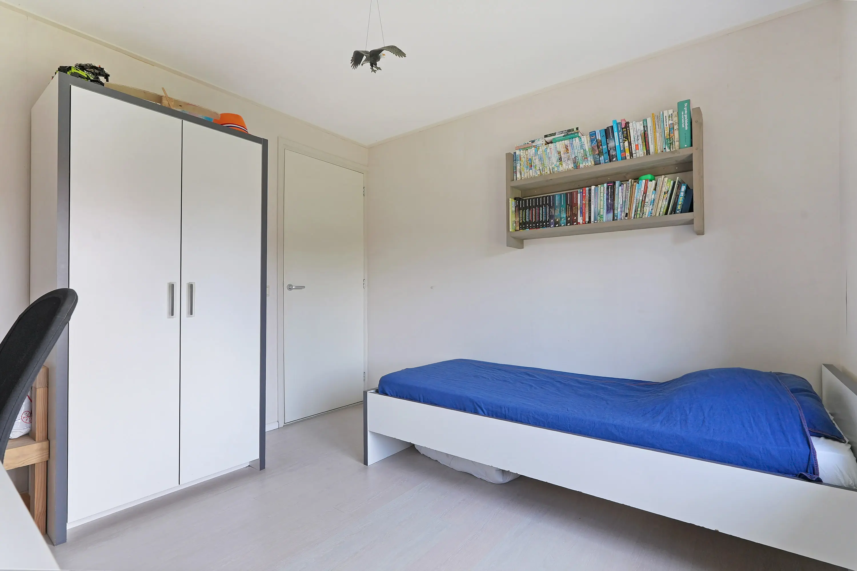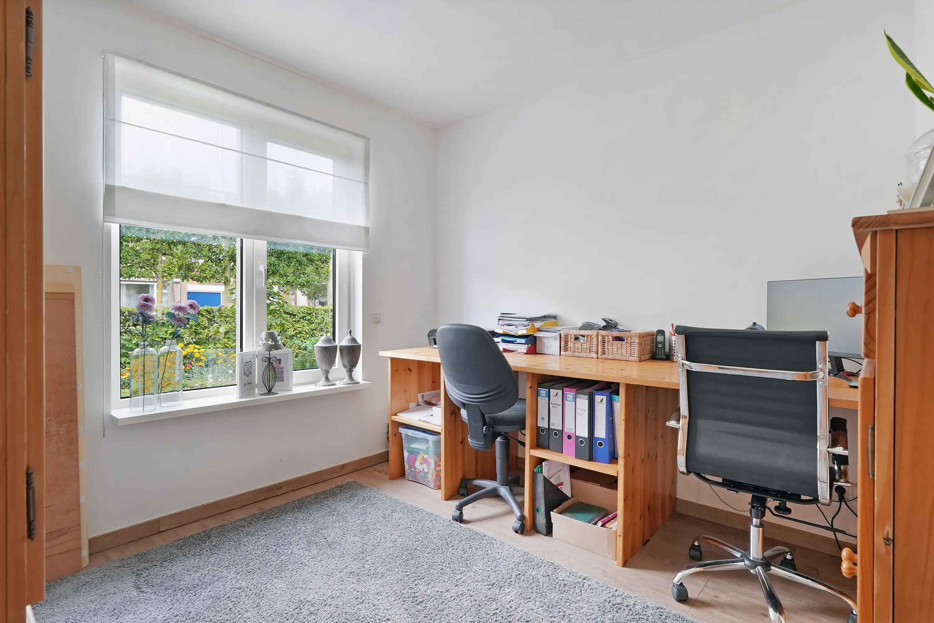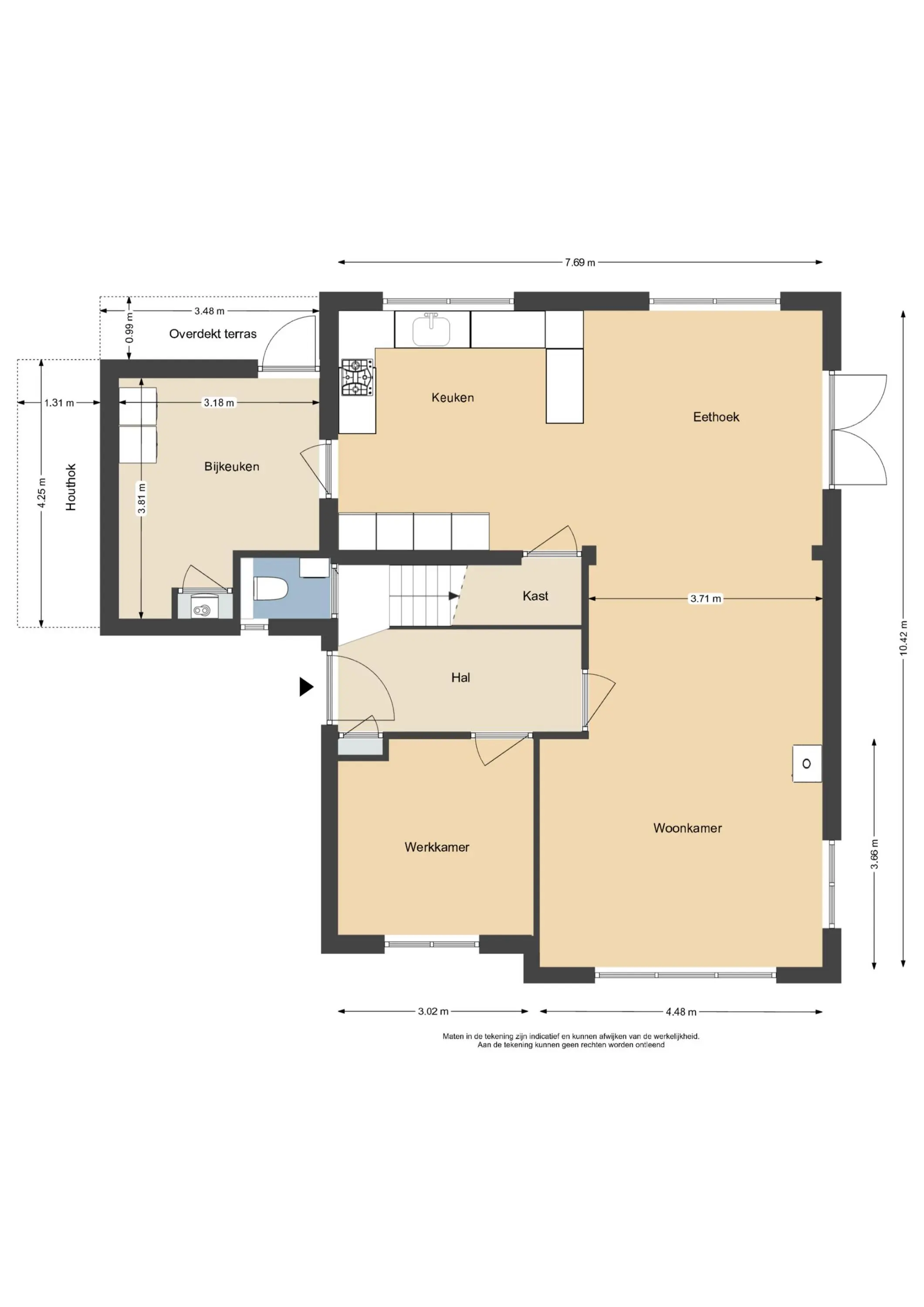 Aan de voorkant beschikt de woning over een dubbele oprit, waar met gemak twee auto’s kunnen staan. Via de entree komt u binnen in de hal, waar zich de meterkast (volledig vernieuwd en uitgebreid met 14 groepen), het toilet en een kamer bevinden. Deze ruimte is nu in gebruik als kantoor, maar kan ook prima als slaapkamer op de begane grond dienen.