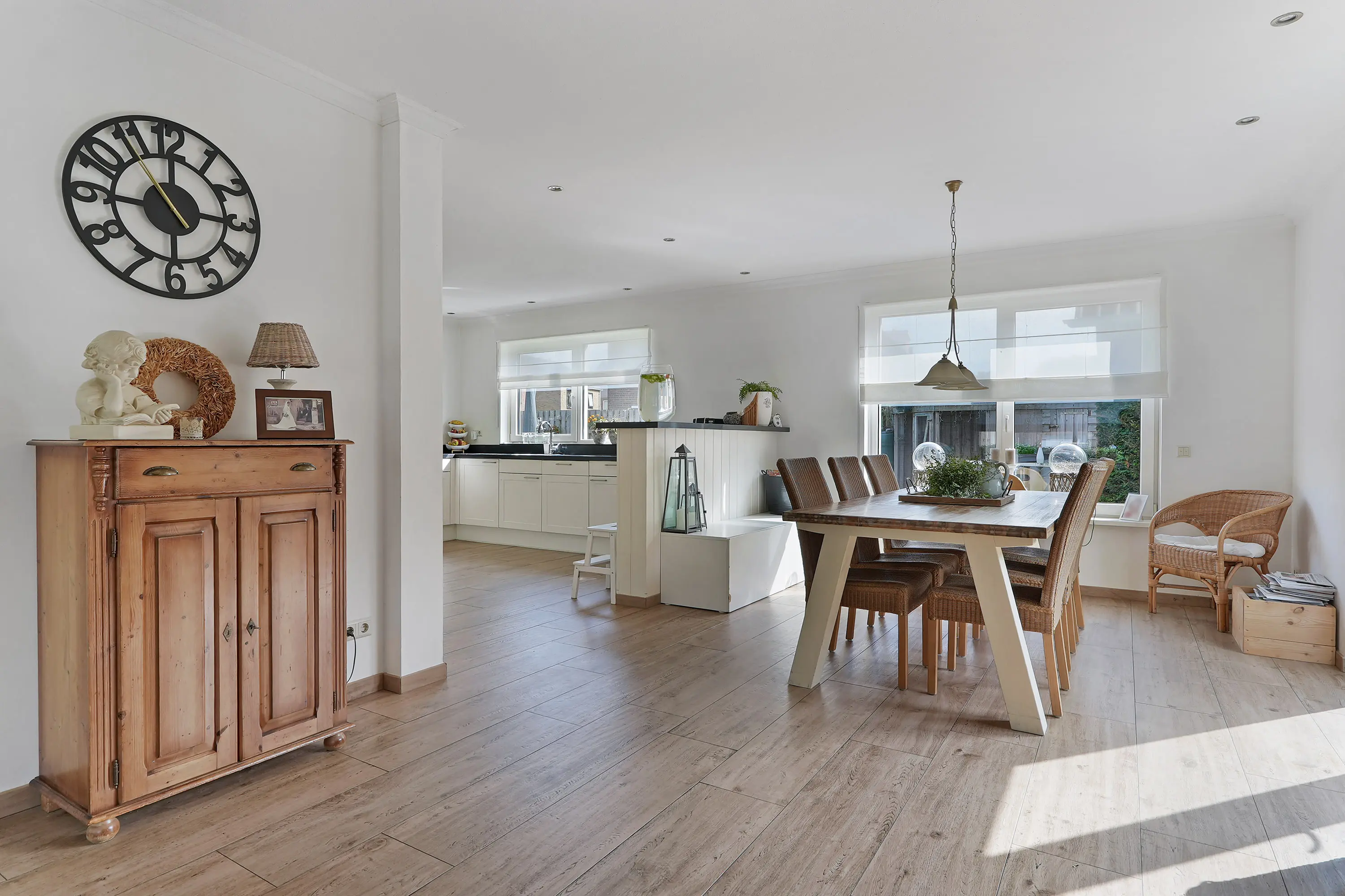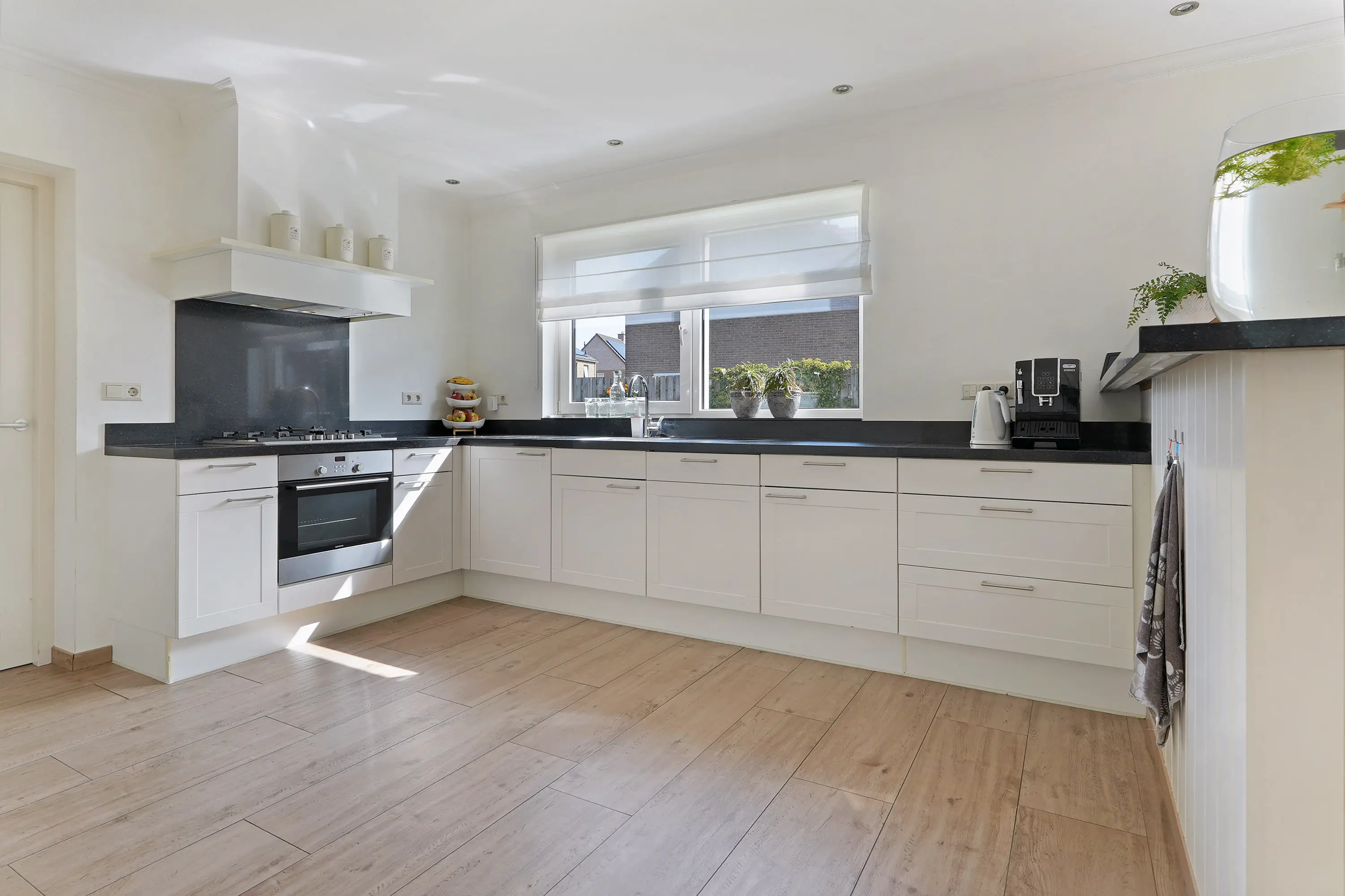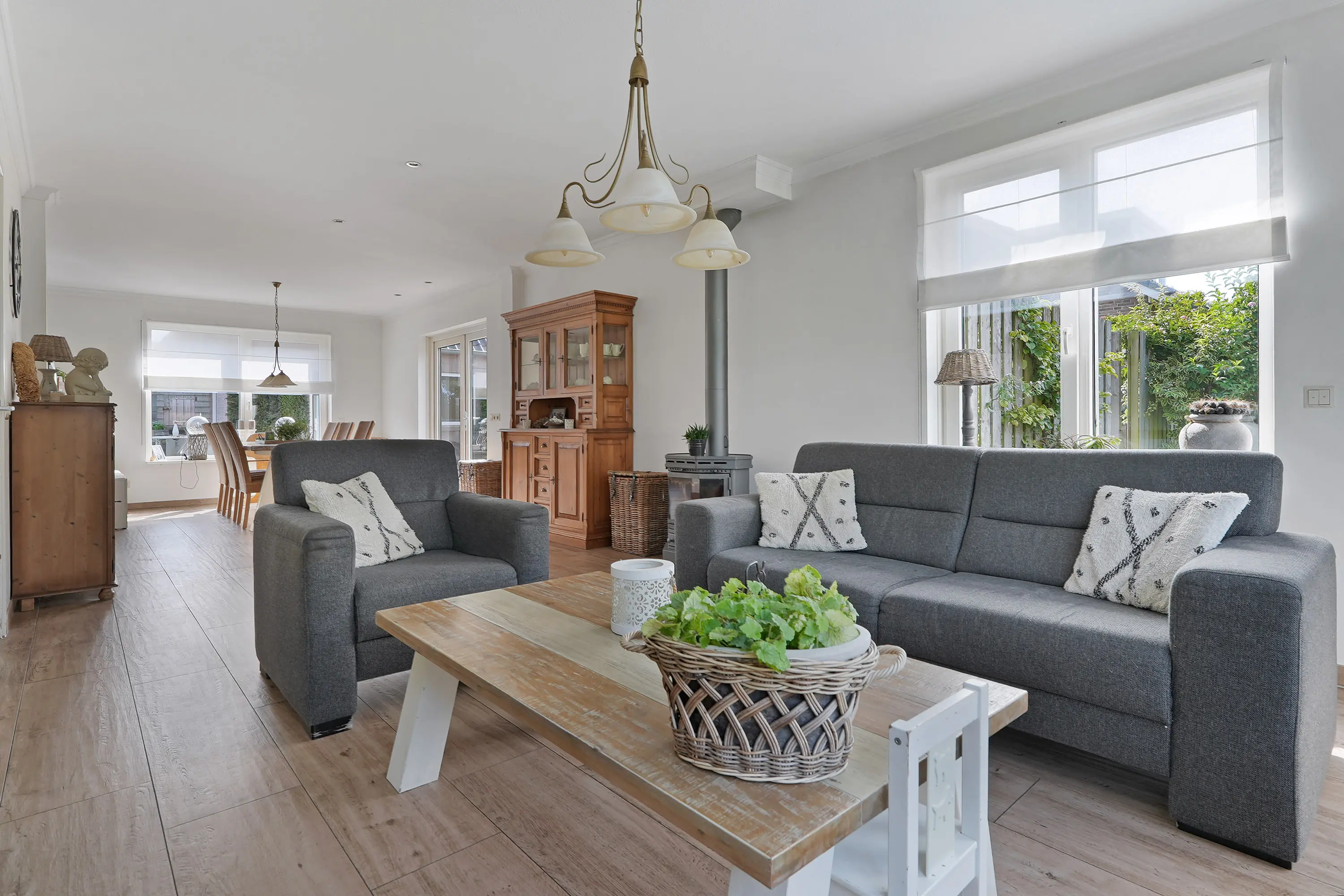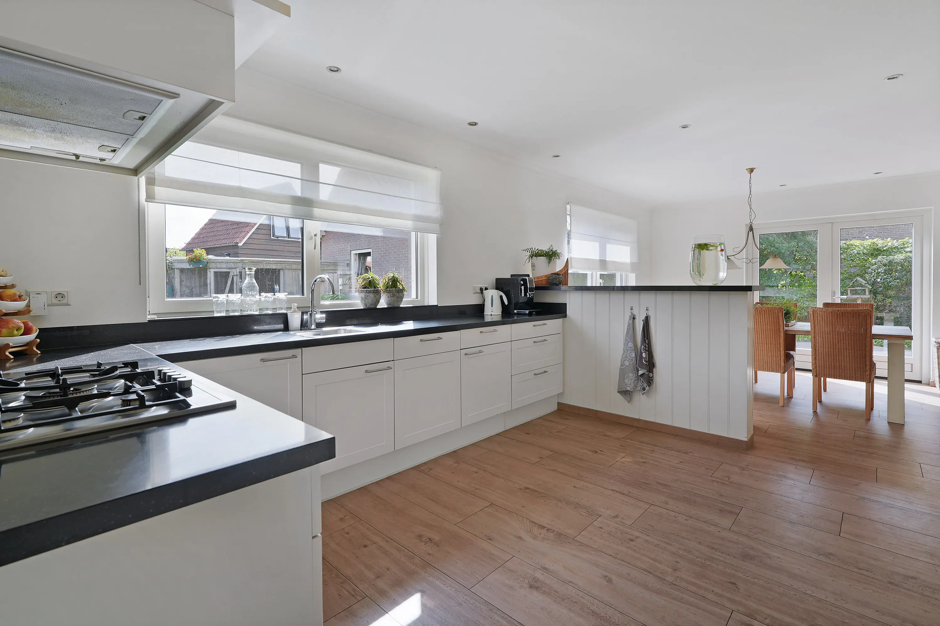 Vanuit de hal loopt u door naar de woonkamer. Hier ervaart u direct een prettige sfeer: aan de voorzijde bevindt zich de zithoek met een gezellige houtkachel, aan de achterzijde de eetkamer met openslaande tuindeuren naar de tuin. De keuken is royaal opgezet in L-vorm en voorzien van een composiet aanrechtblad, diverse inbouwapparatuur en een grote kastenwand met extra apparatuur. Vanuit de keuken heeft u toegang tot een handige provisieruimte én de bijkeuken.