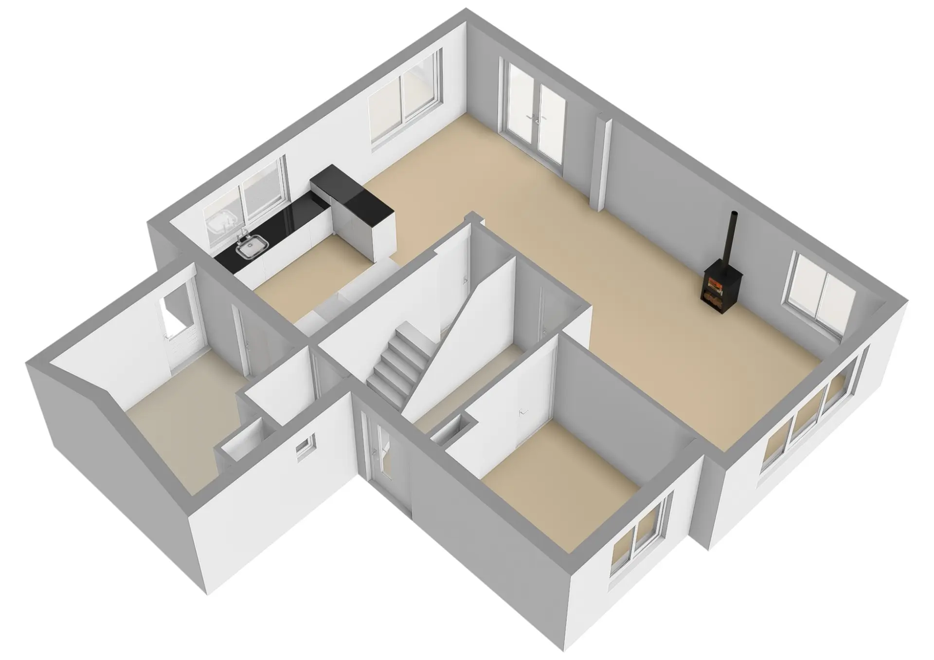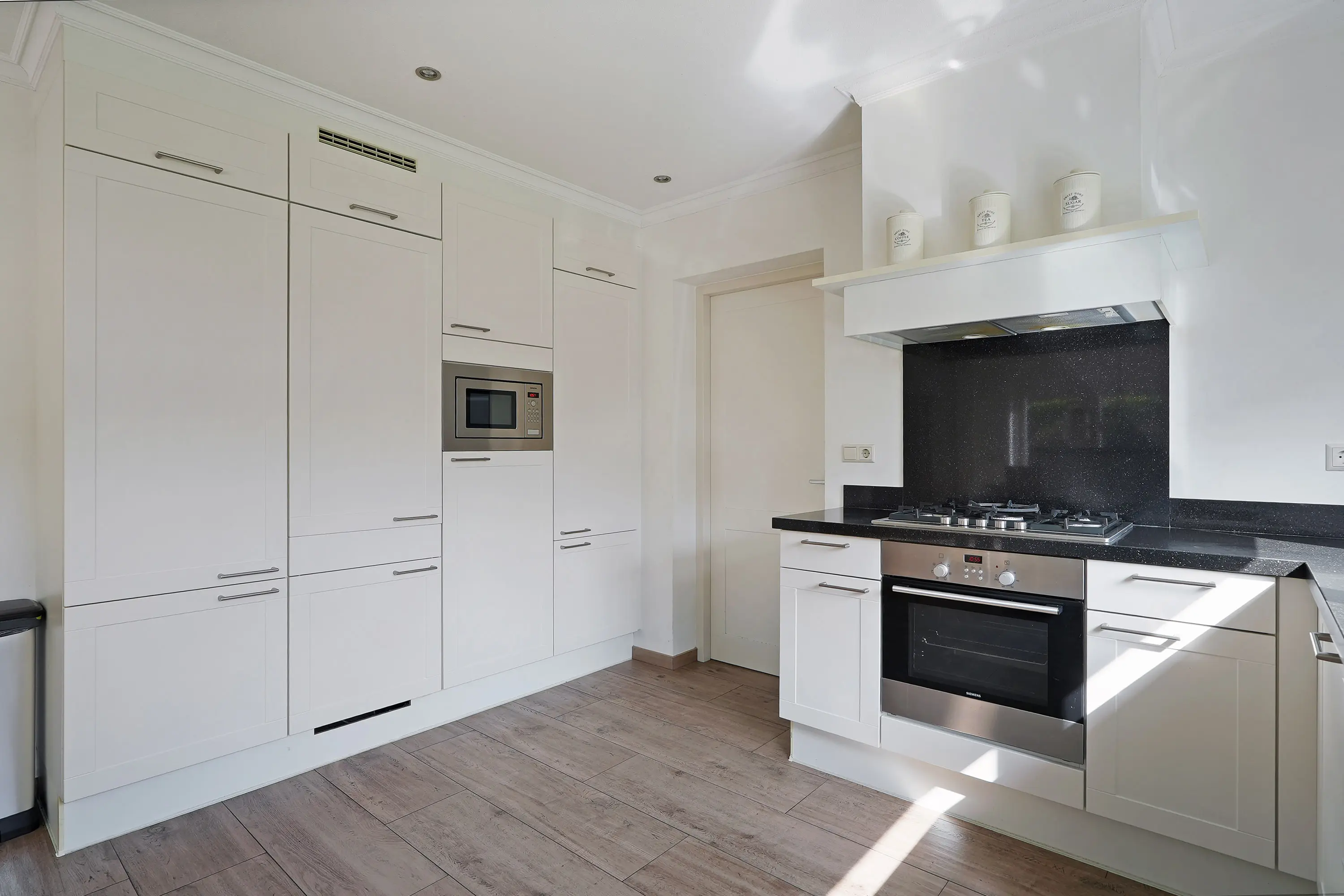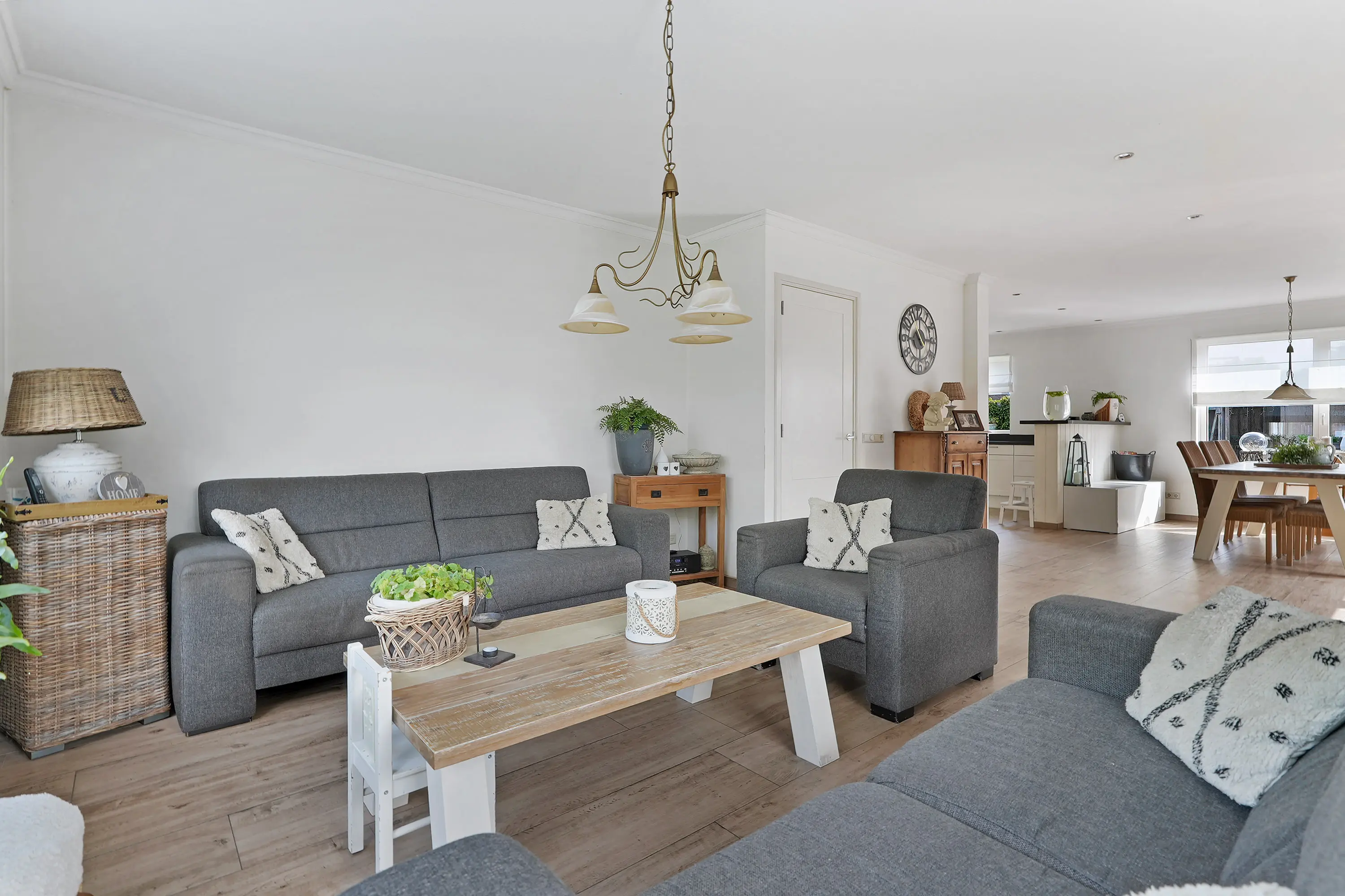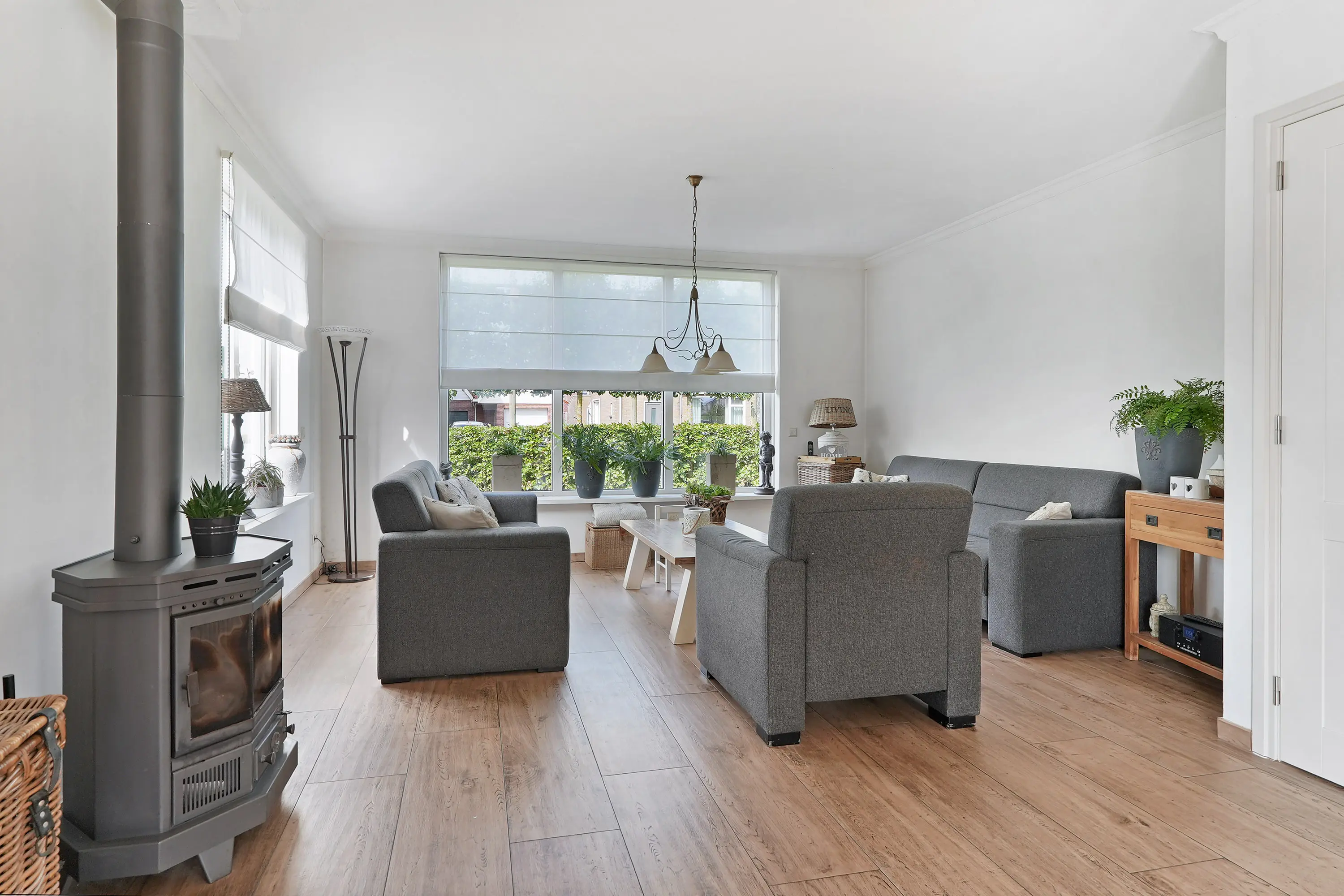Vanuit de hal loopt u door naar de woonkamer. Hier ervaart u direct een prettige sfeer: aan de voorzijde bevindt zich de zithoek met een gezellige houtkachel, aan de achterzijde de eetkamer met openslaande tuindeuren naar de tuin. De keuken is royaal opgezet in L-vorm en voorzien van een composiet aanrechtblad, diverse inbouwapparatuur en een grote kastenwand met extra apparatuur. Vanuit de keuken heeft u toegang tot een handige provisieruimte én de bijkeuken.