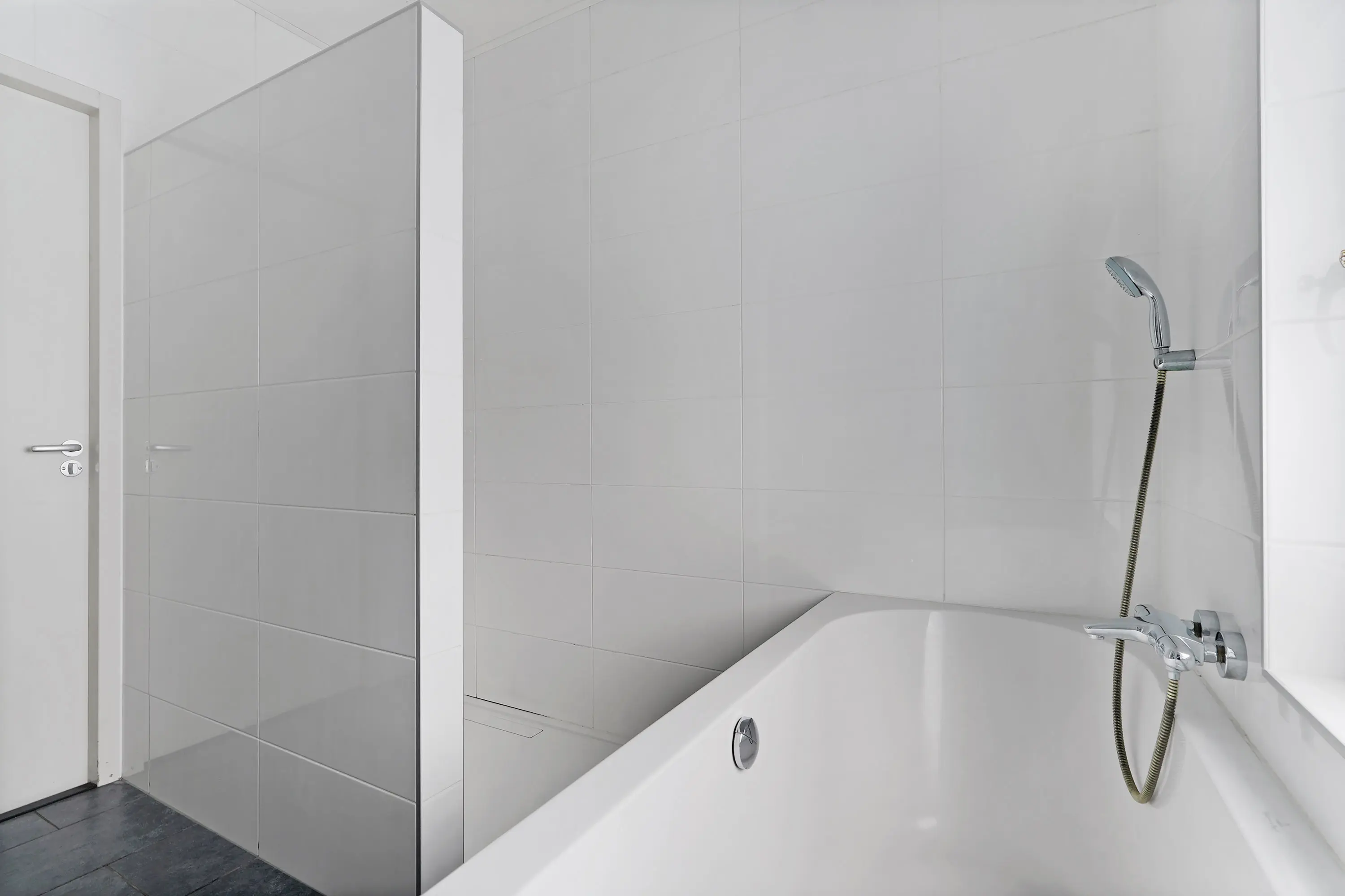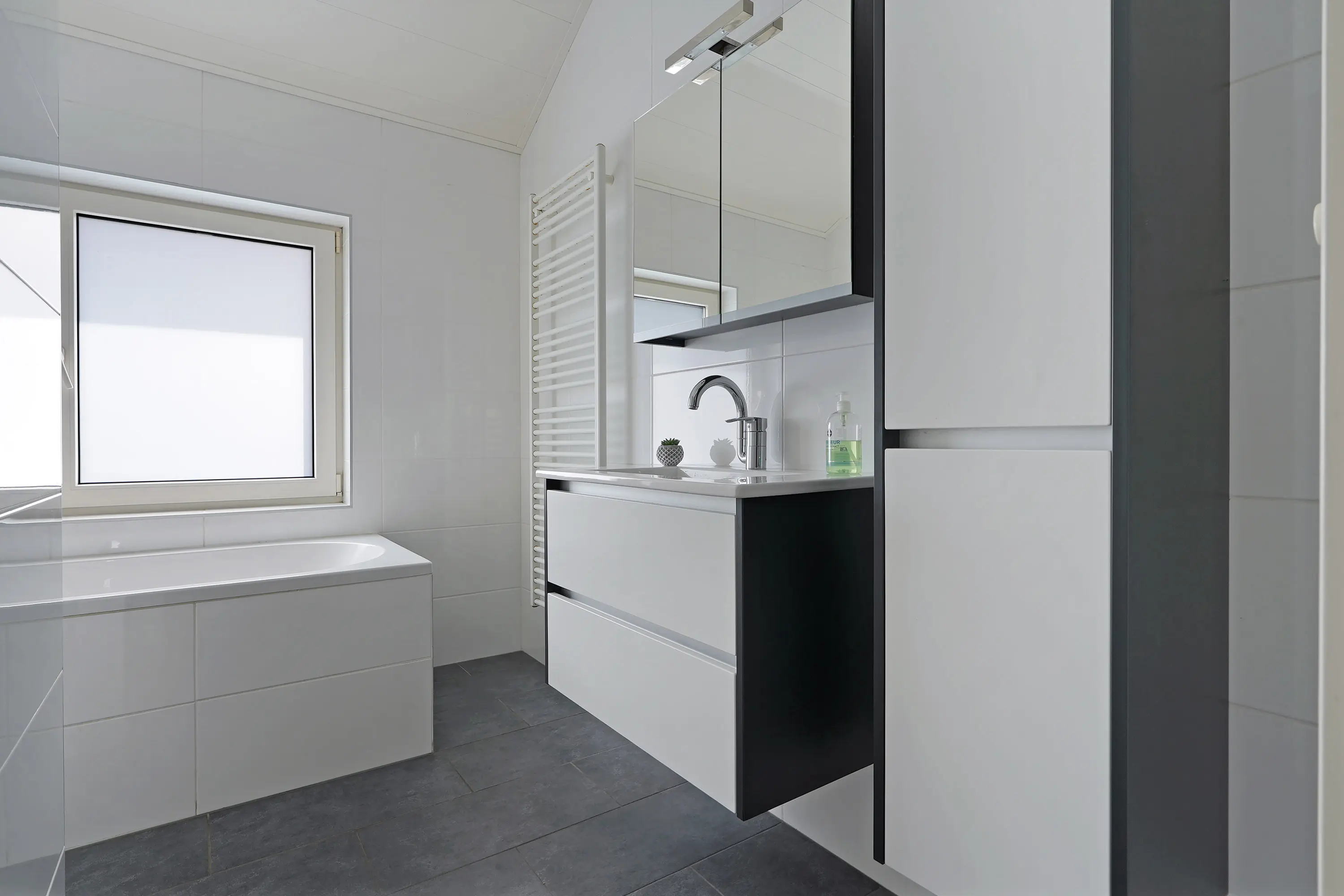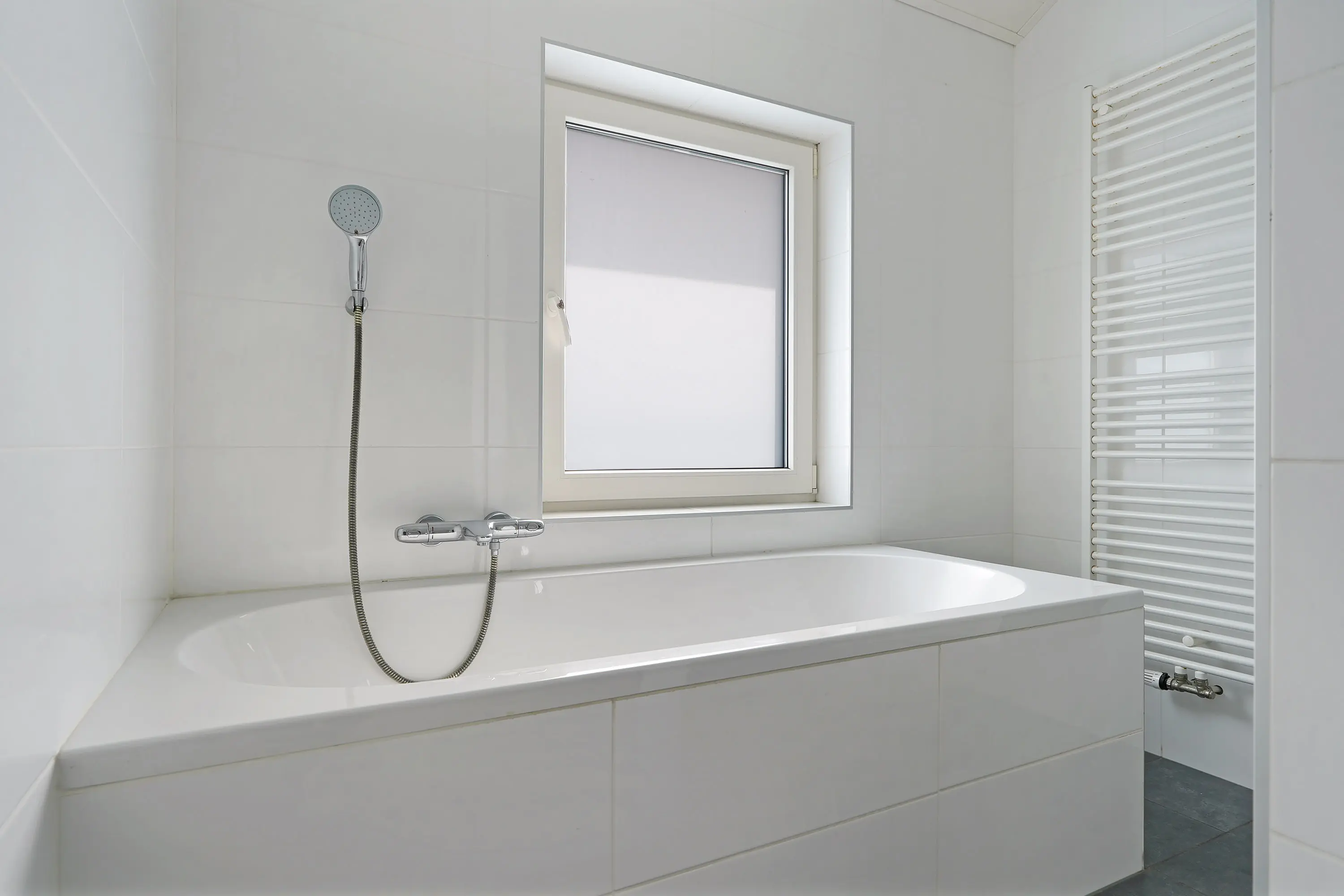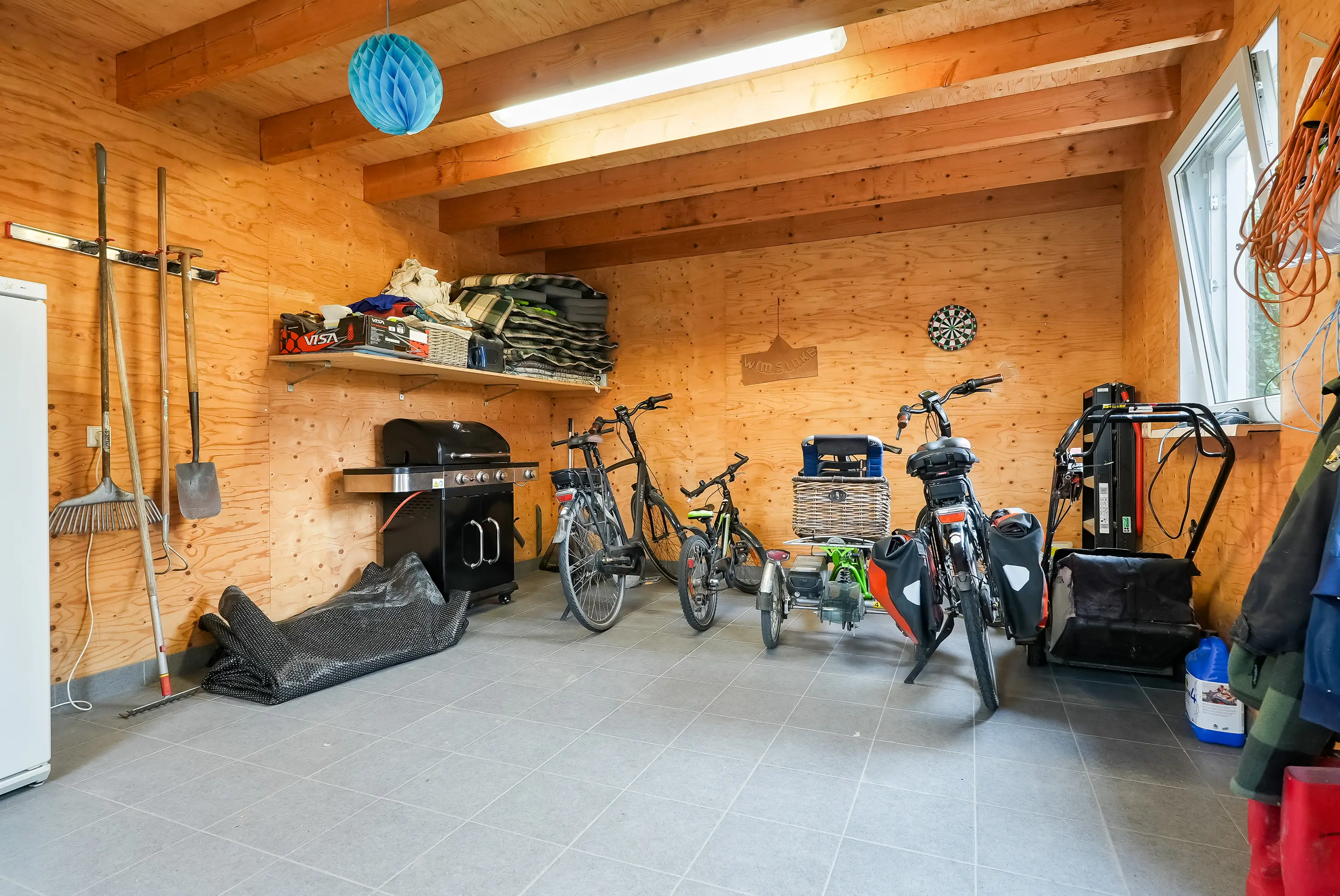 De bijkeuken is volledig betegeld, voorzien van witgoedaansluitingen en biedt ruimte voor de cv-opstelling (uit 2003) en de vloerverwarmingsunit. Vanuit hier bereikt u de achtertuin.