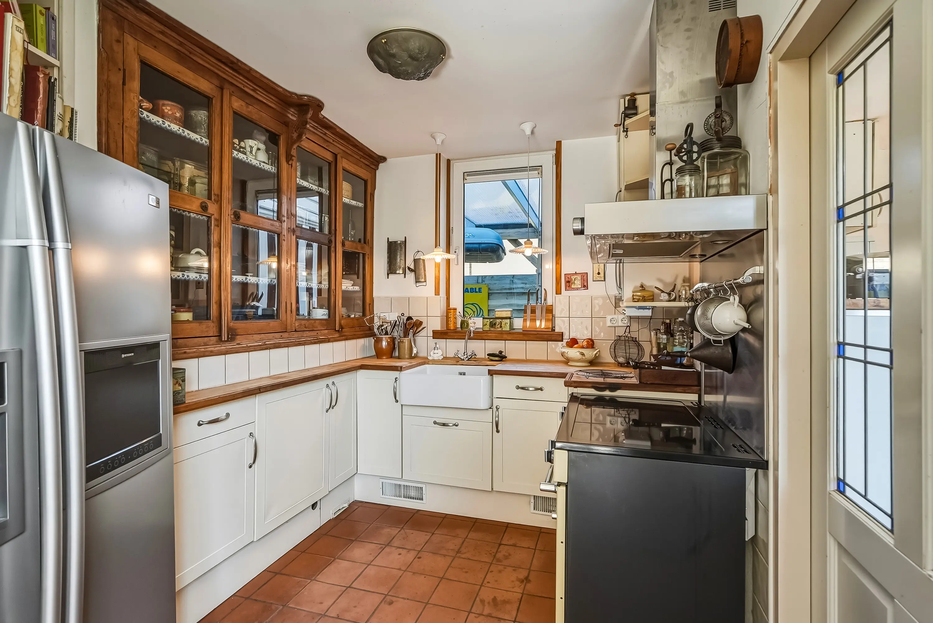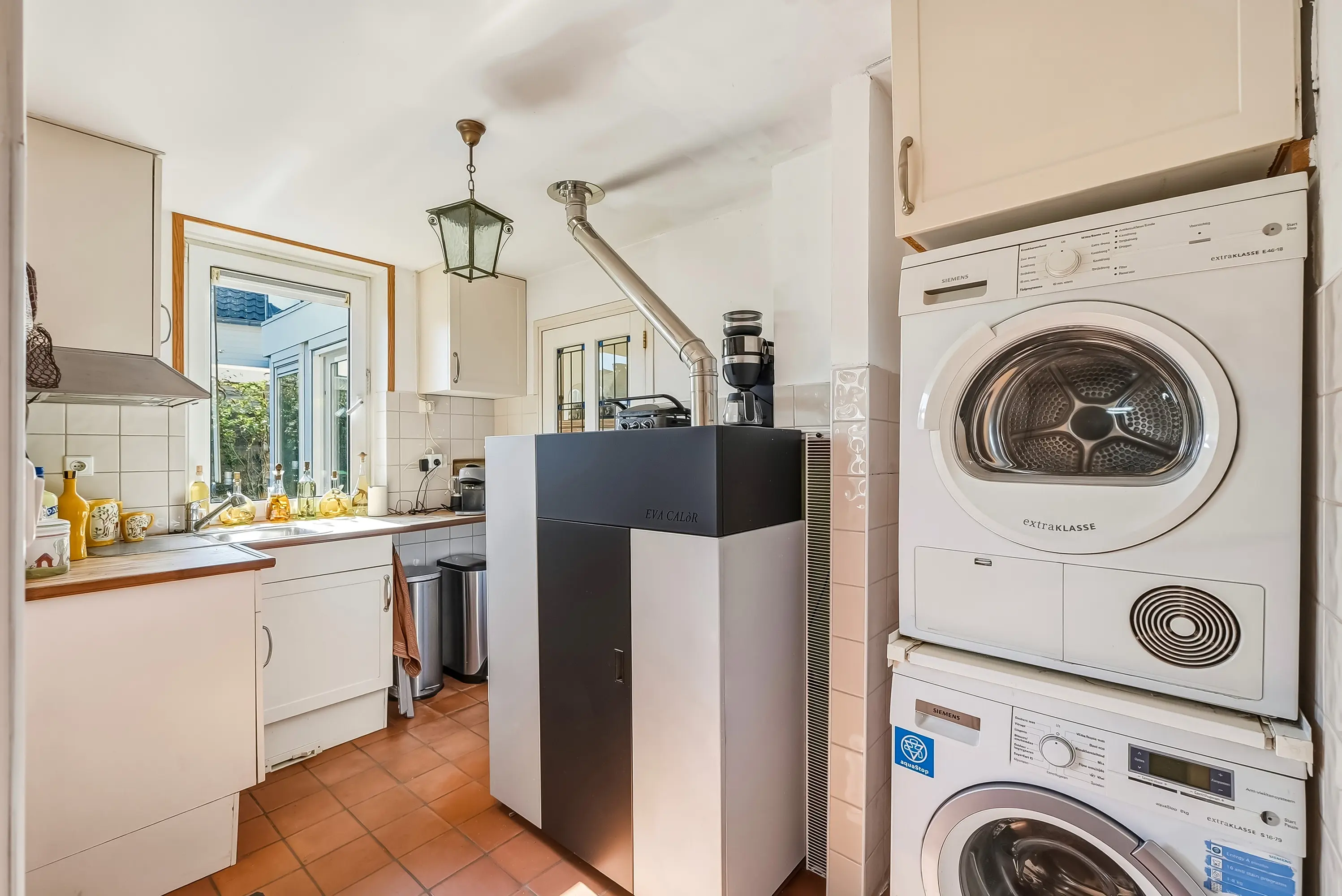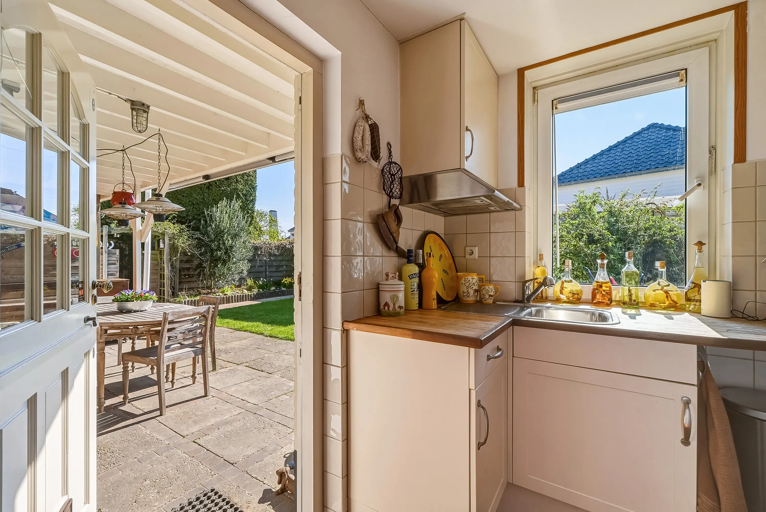 Vanuit de woonkamer bereikt u de keuken met uitzicht op de tuin. De lichte keuken met houten werkblad is uitgevoerd in een sfeervolle hoekopstelling. Aansluitend aan de keuken treft u de bijkeuken met daar de wasmachine- en drogeropstelling, de Pelletkachel en een extra keukenuitrusting. Vanuit hier heeft u directe toegang tot de terrasoverkapping in de tuin én inpandig toegang tot de garage/schuur.