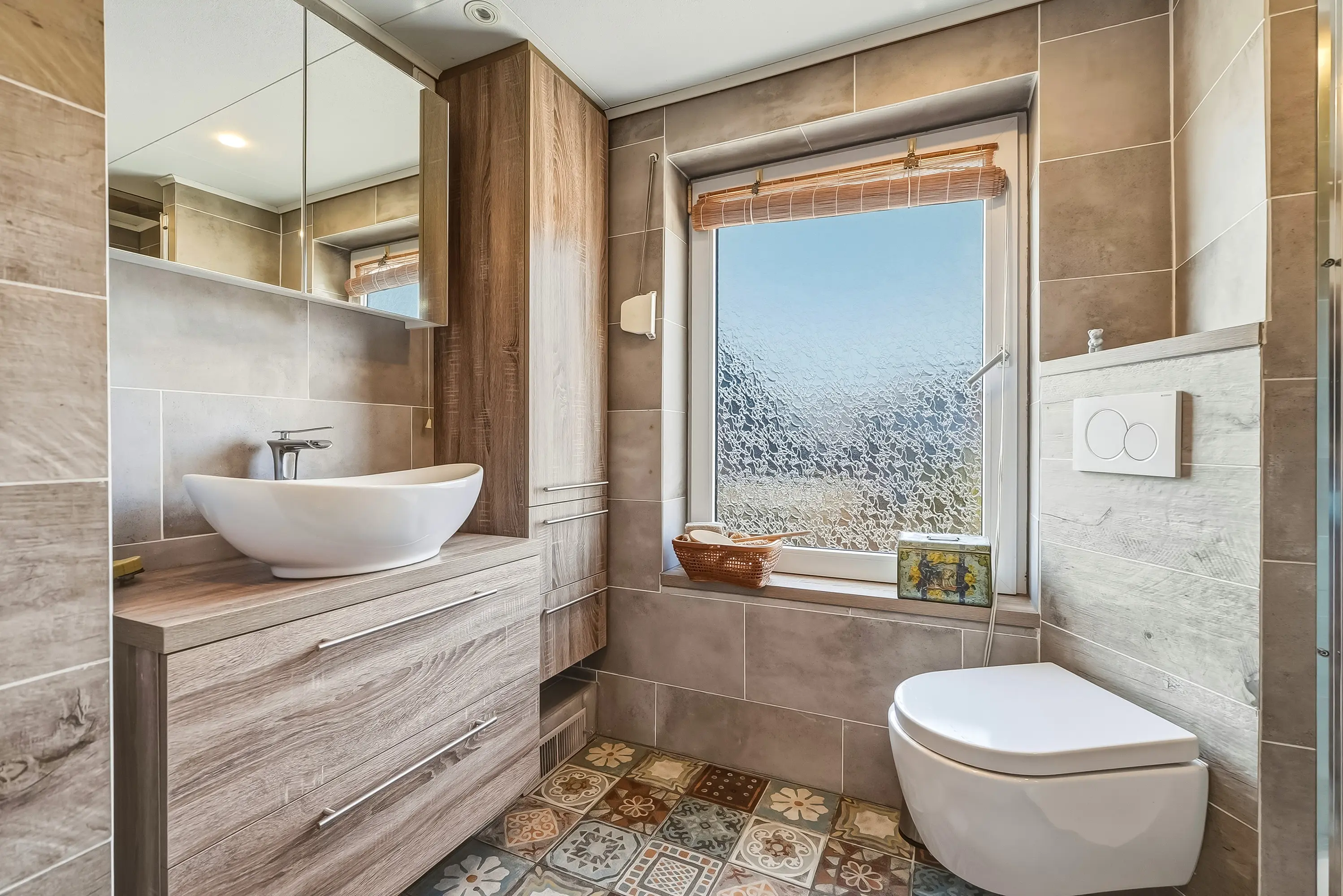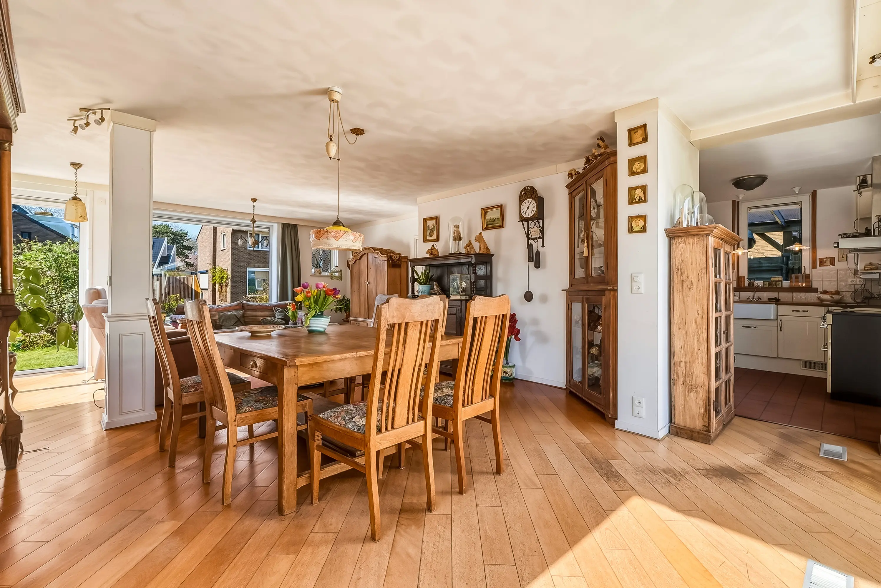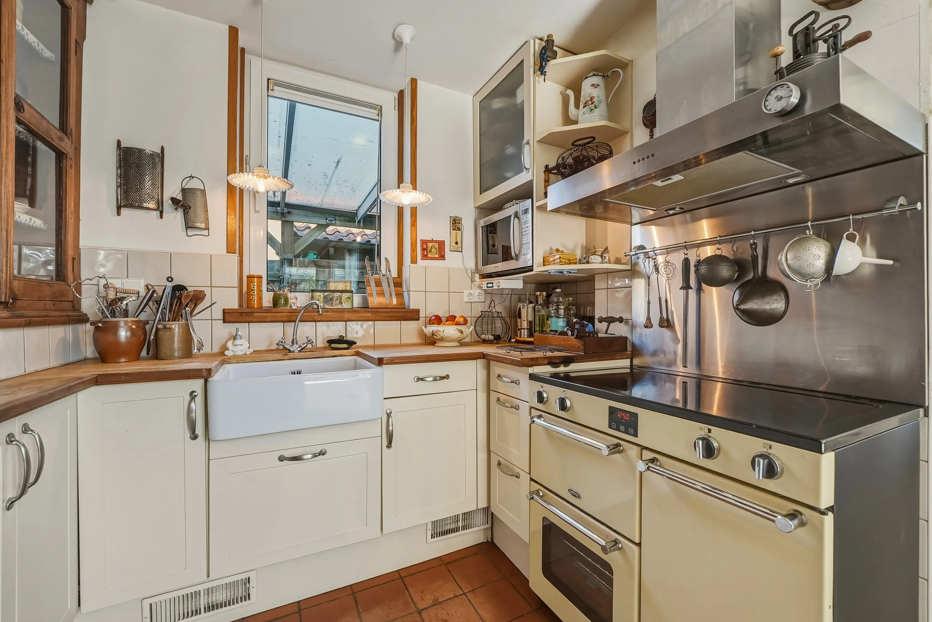Vanuit de woonkamer bereikt u de keuken met uitzicht op de tuin. De lichte keuken met houten werkblad is uitgevoerd in een sfeervolle hoekopstelling. Aansluitend aan de keuken treft u de bijkeuken met daar de wasmachine- en drogeropstelling, de Pelletkachel en een extra keukenuitrusting. Vanuit hier heeft u directe toegang tot de terrasoverkapping in de tuin én inpandig toegang tot de garage/schuur.