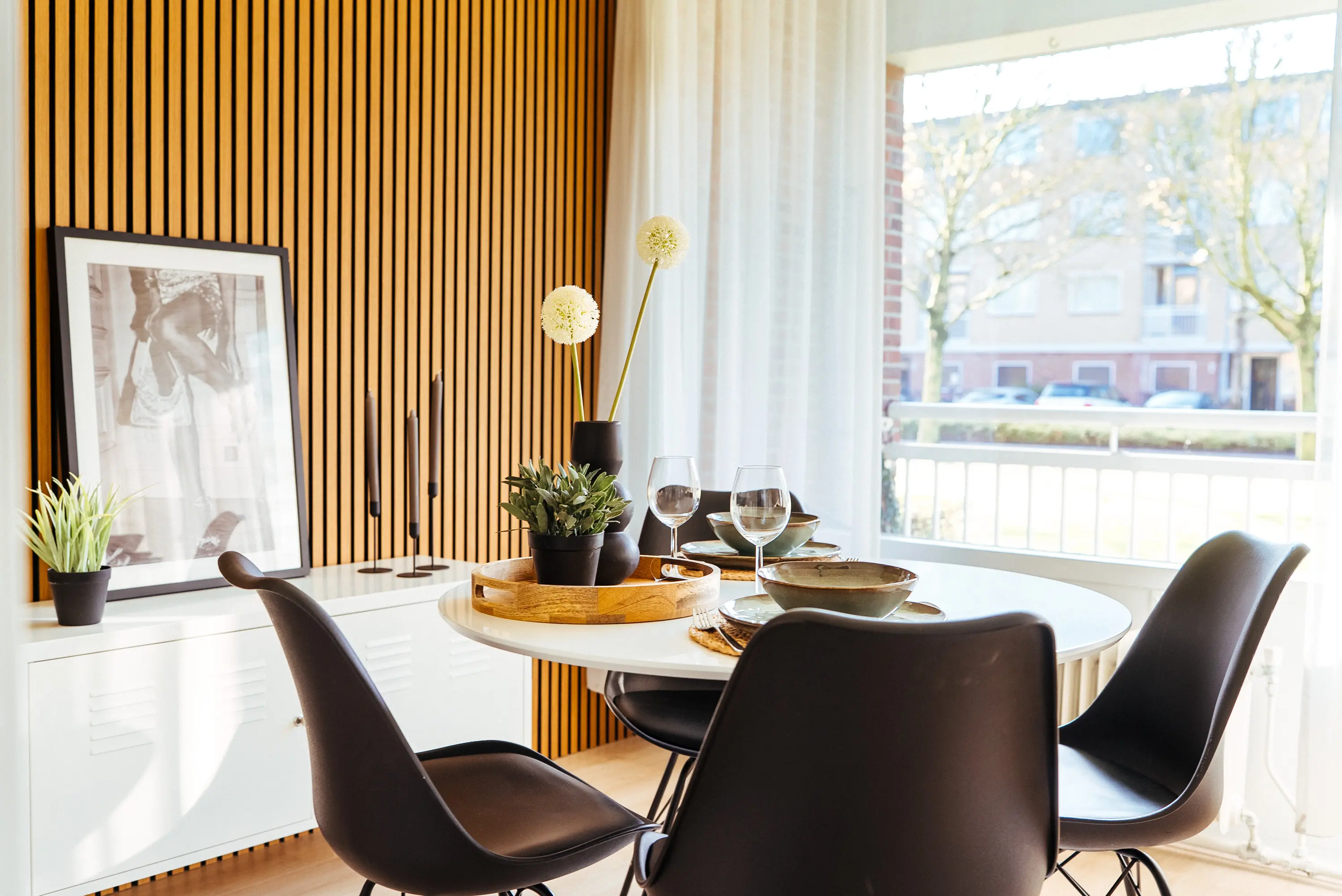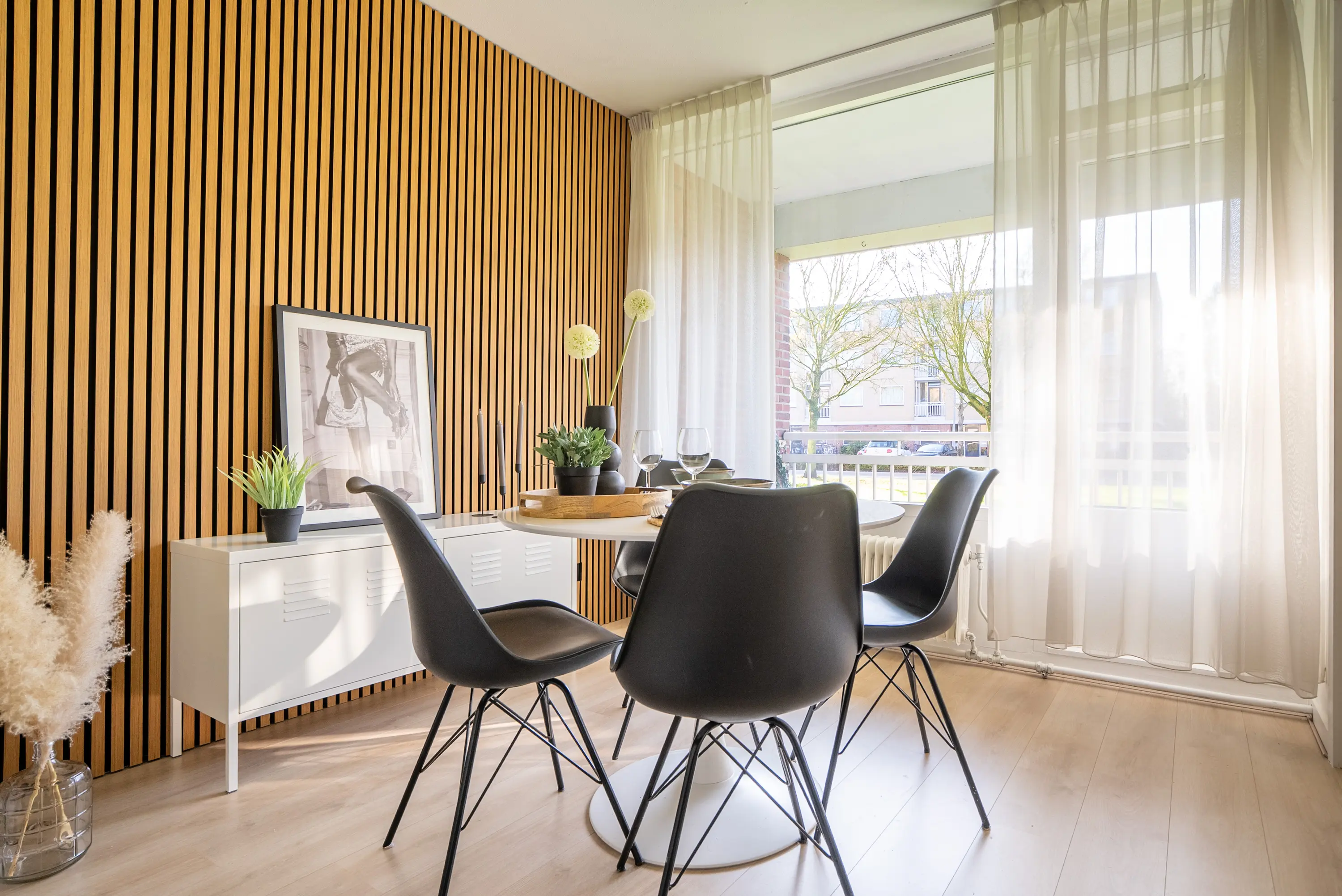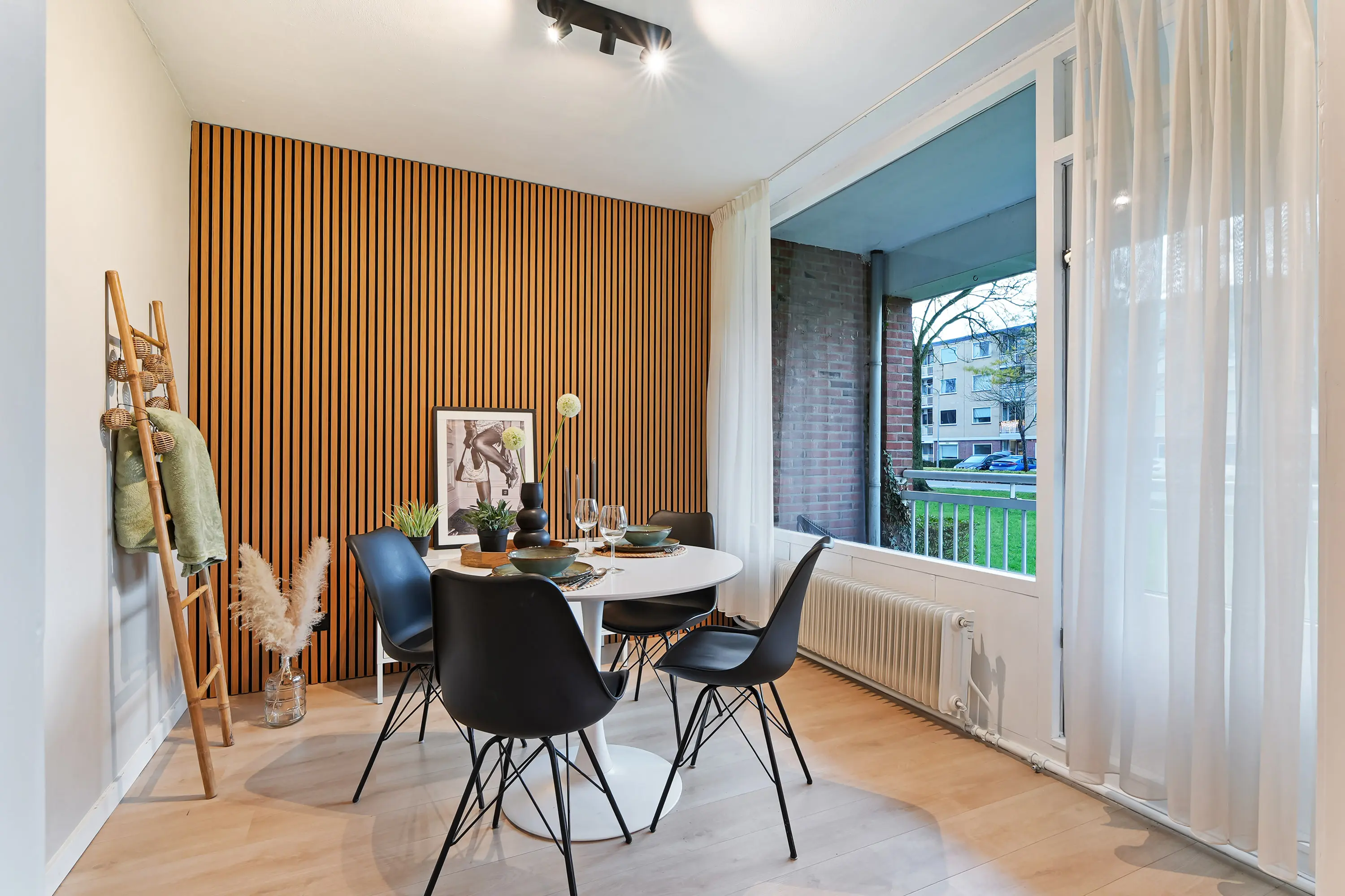 Je komt binnen in de hal met vernieuwde meterkast en doorgang naar de woonkamer. Zodra je de woonkamer binnenstapt, ervaar je direct de ruimtelijke en lichte uitstraling, met een prettig uitzicht op groen. Aan de voorzijde van het appartement bevindt zich de zithoek met aansluitend de eethoek. Vanuit hier heb je toegang tot het balkon, ofwel de loggia. Dankzij de ligging op het zuidwesten kun je hier tot in de late uurtjes heerlijk zitten.