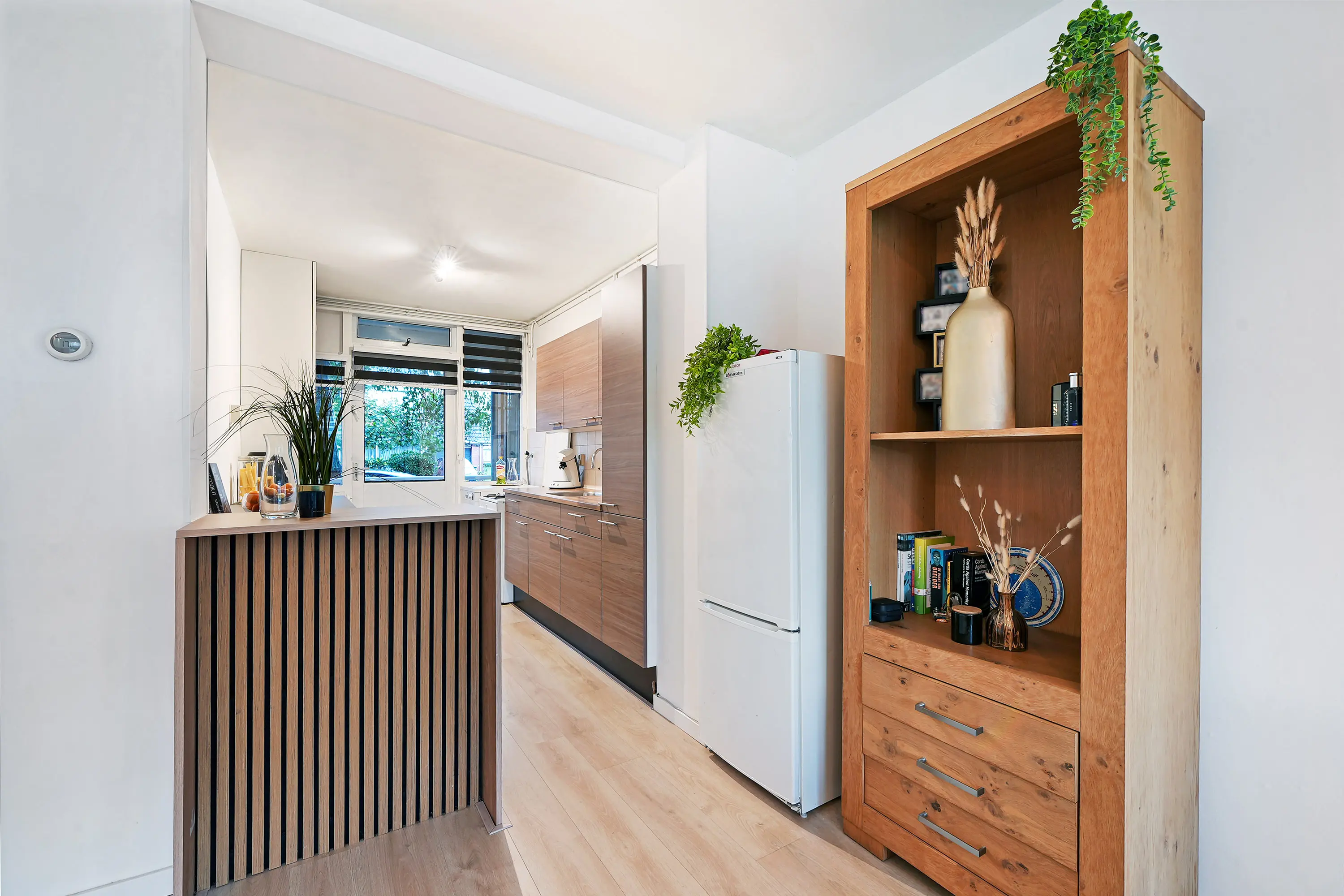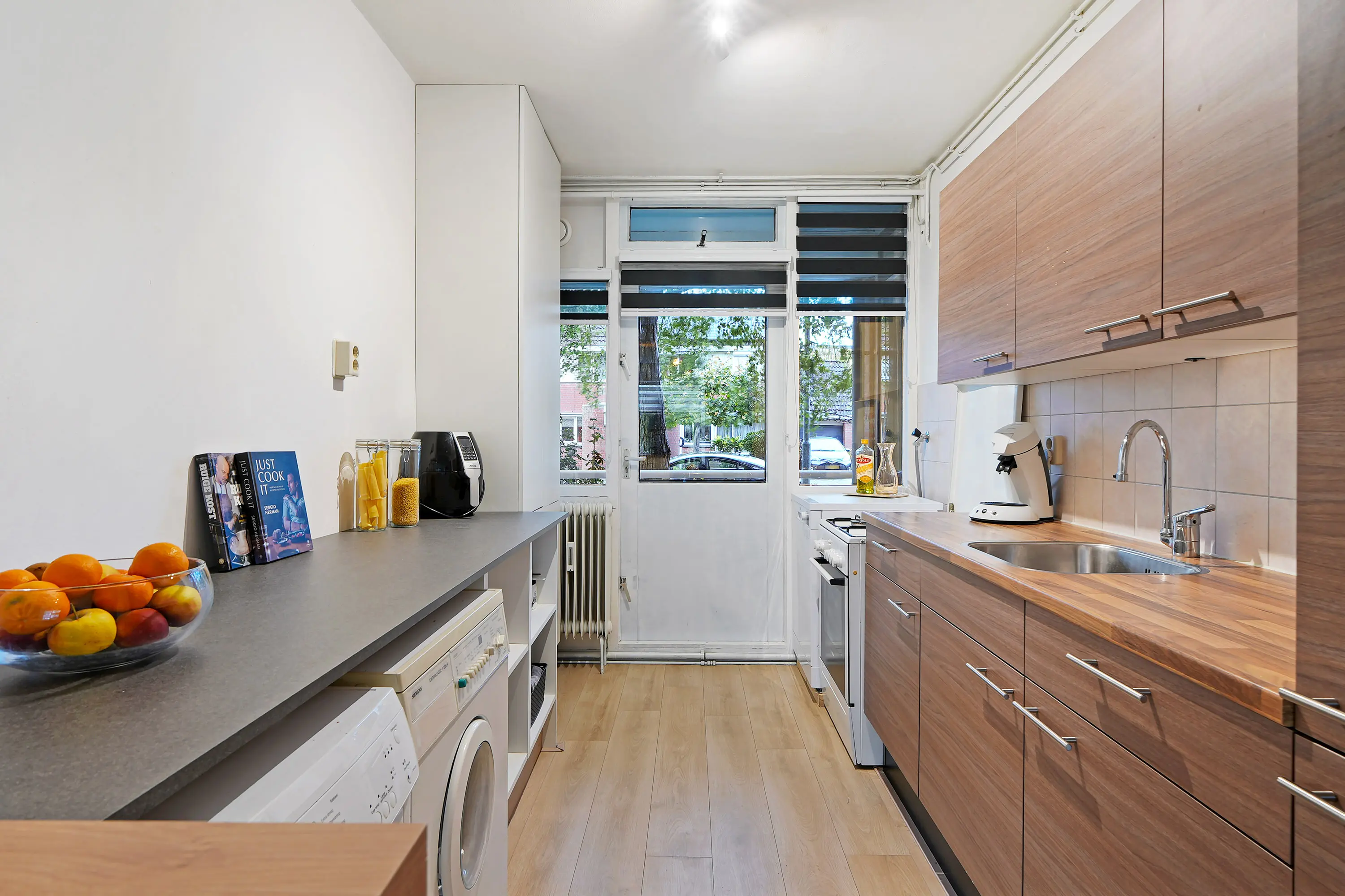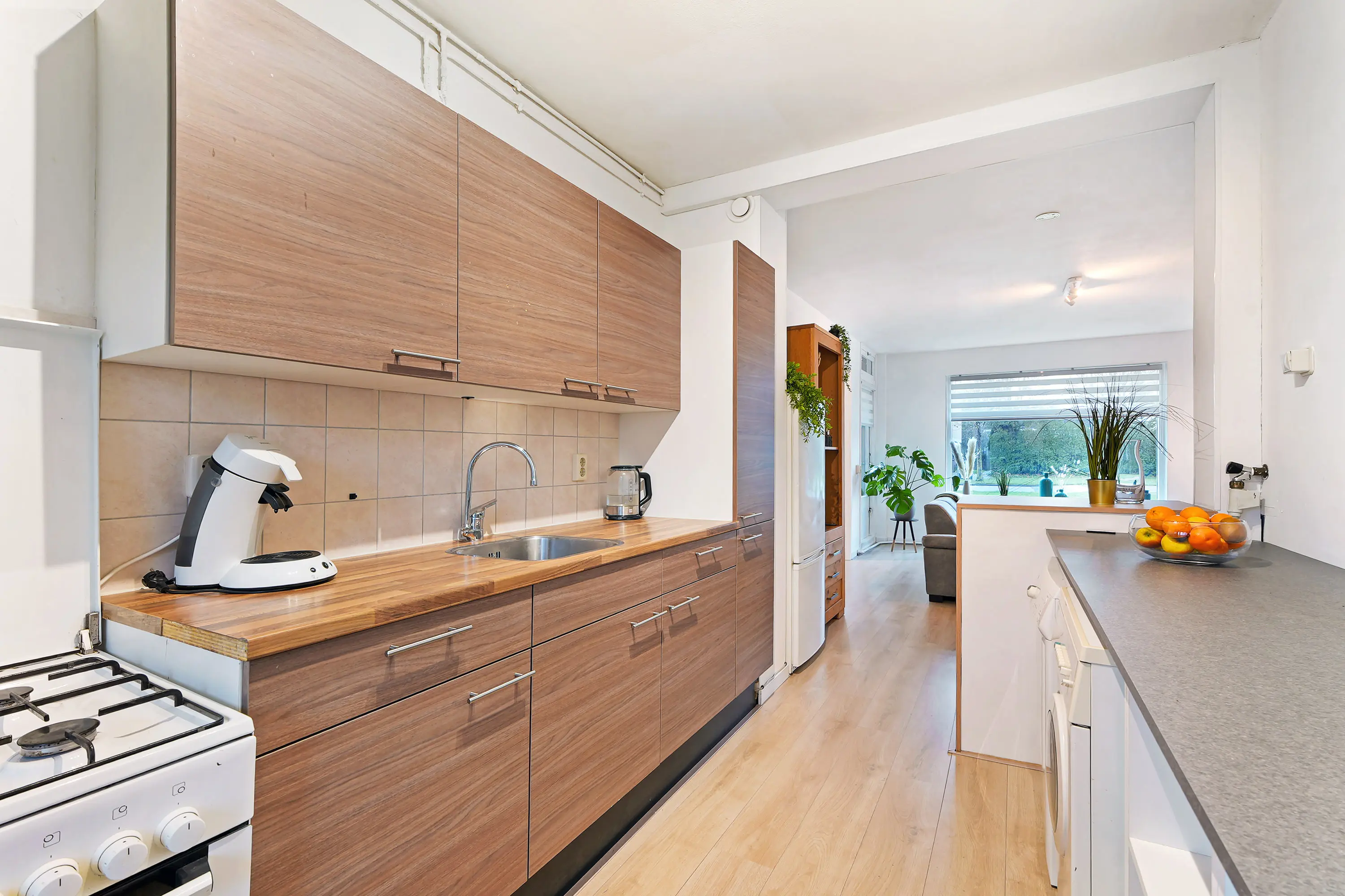 De keuken is uitgevoerd in een parallelopstelling, daardoor veel werkruimte. Tegenover de keuken vind je een praktische kast en een extra werkblad, waaronder de opstelling voor je wasmachine en droger is geplaatst. Aan de keukenzijde bevindt zich bovendien een tweede balkon.