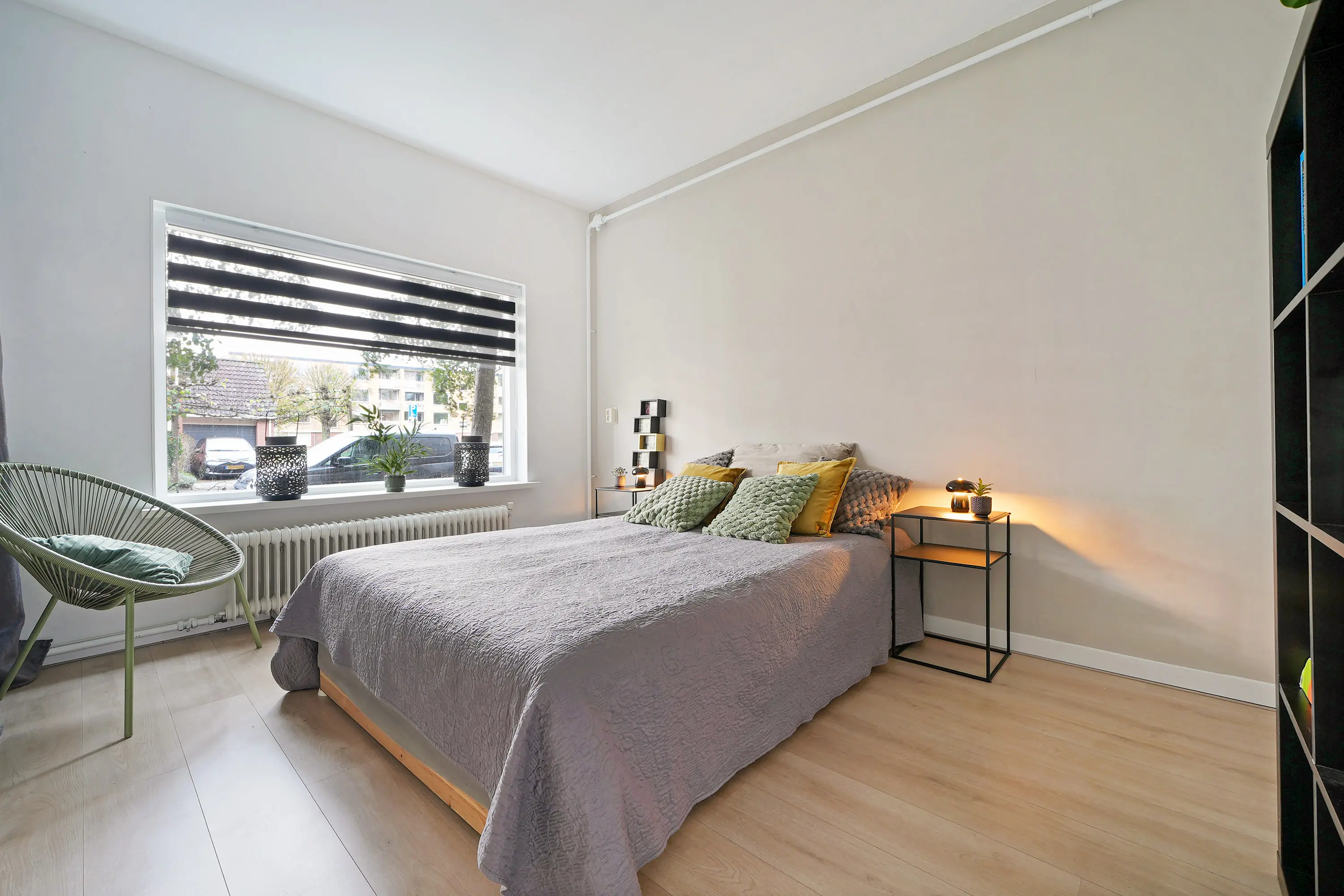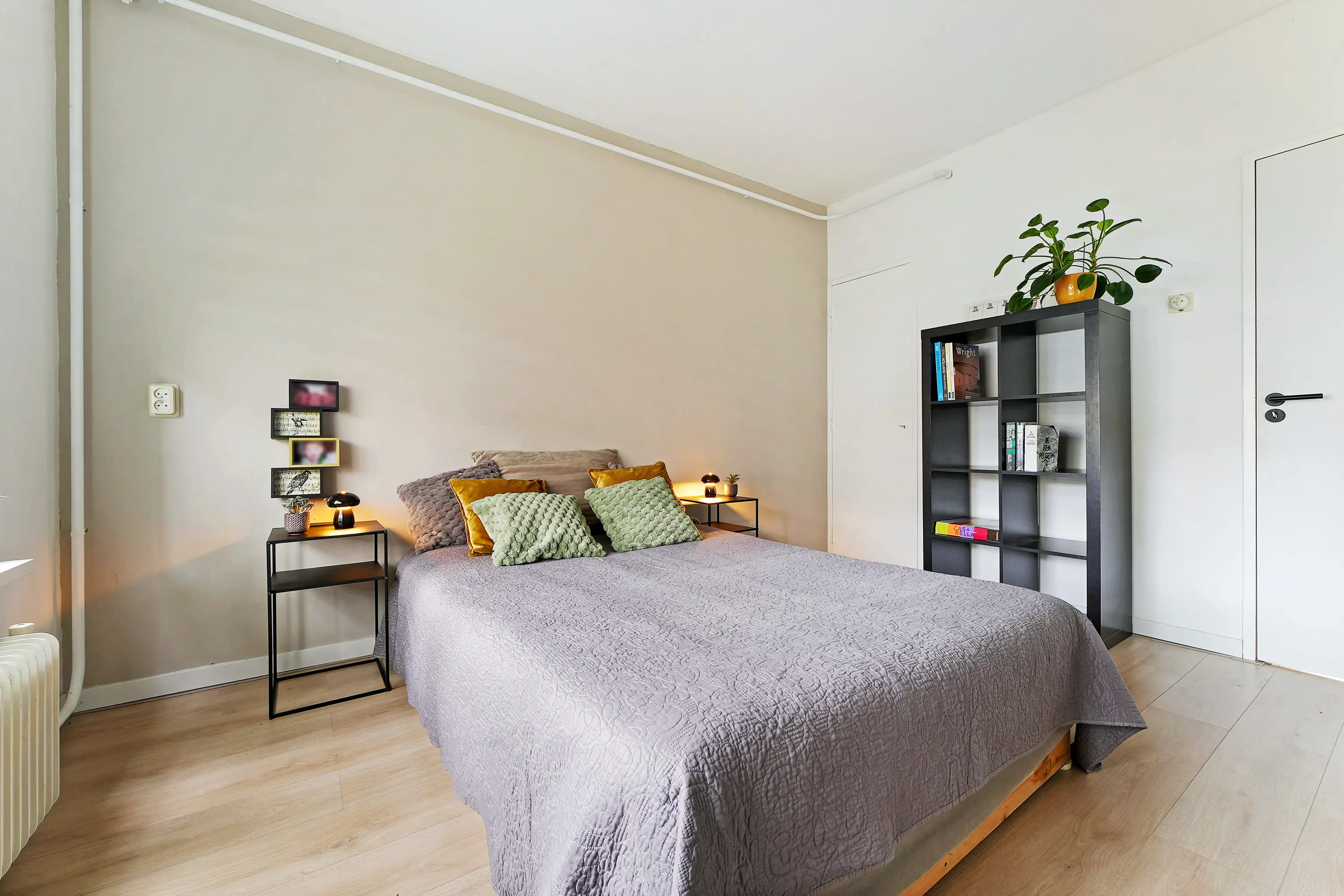 Via de tussenhal bereik je de ruime slaapkamer. Deze riante ouderslaapkamer heeft een inbouwkast. Daarnaast vind je hier een modern uitgevoerd, separaat toilet en de badkamer. De badkamer is uitgerust met een inloopdouche en een wastafel. Vanuit de woonkamer is de ruime tweede slaapkamer bereikbaar. Ideaal als werkkamer of extra slaapkamer.