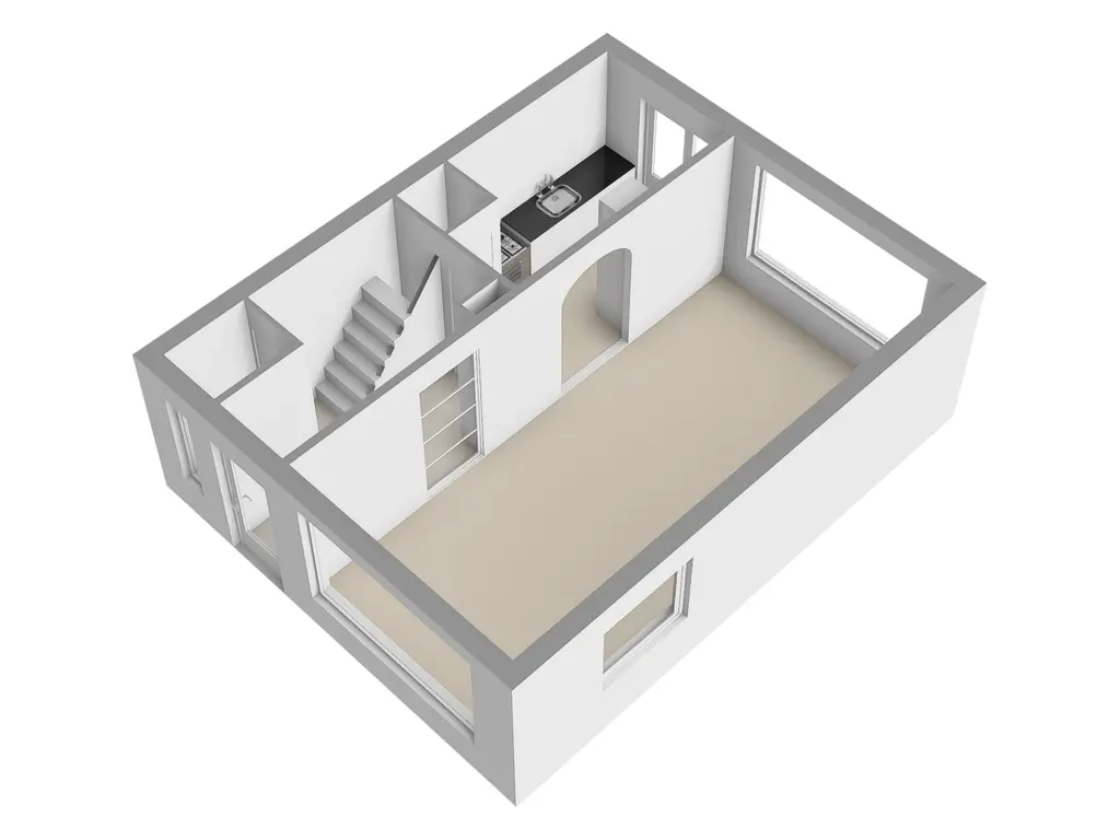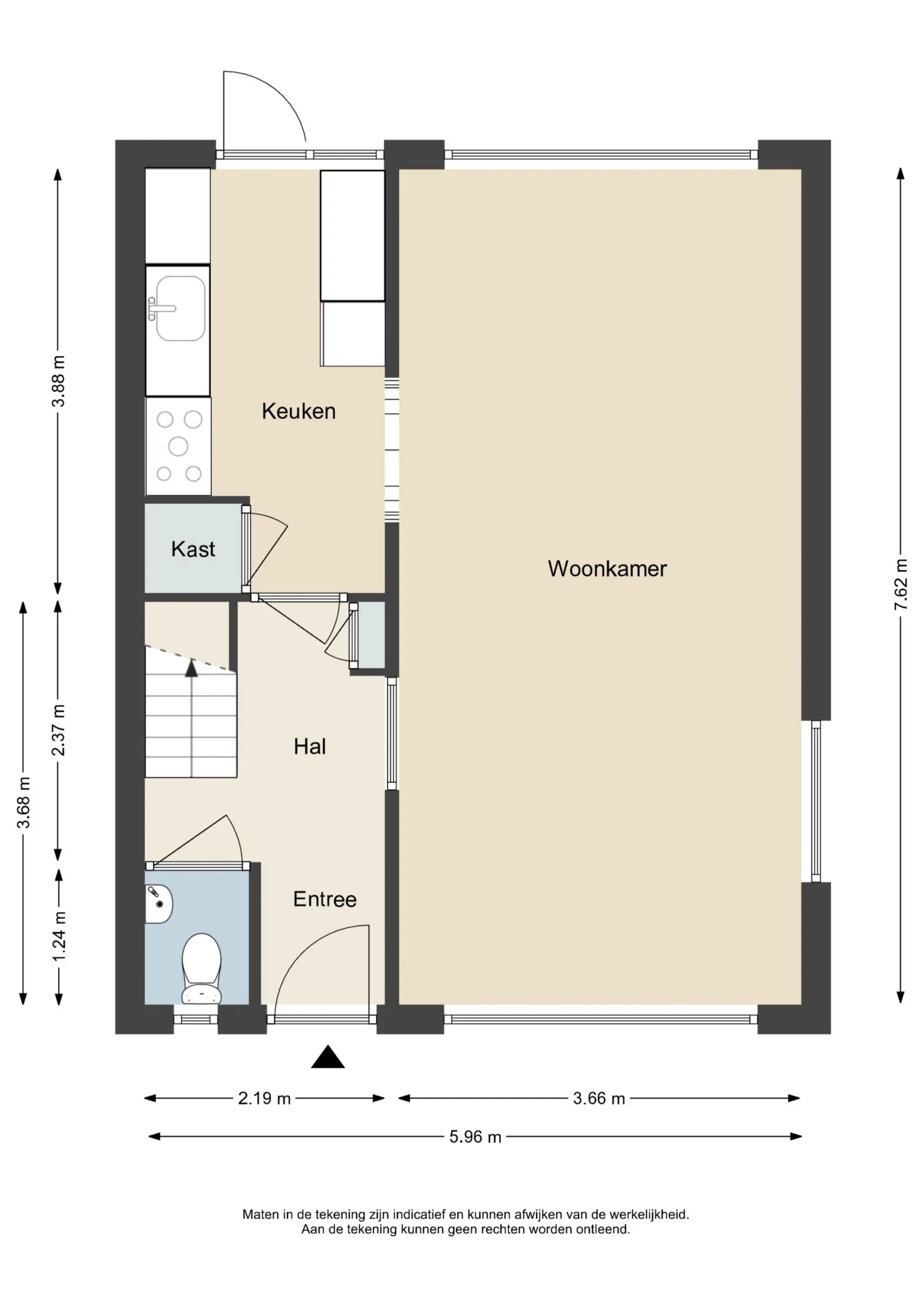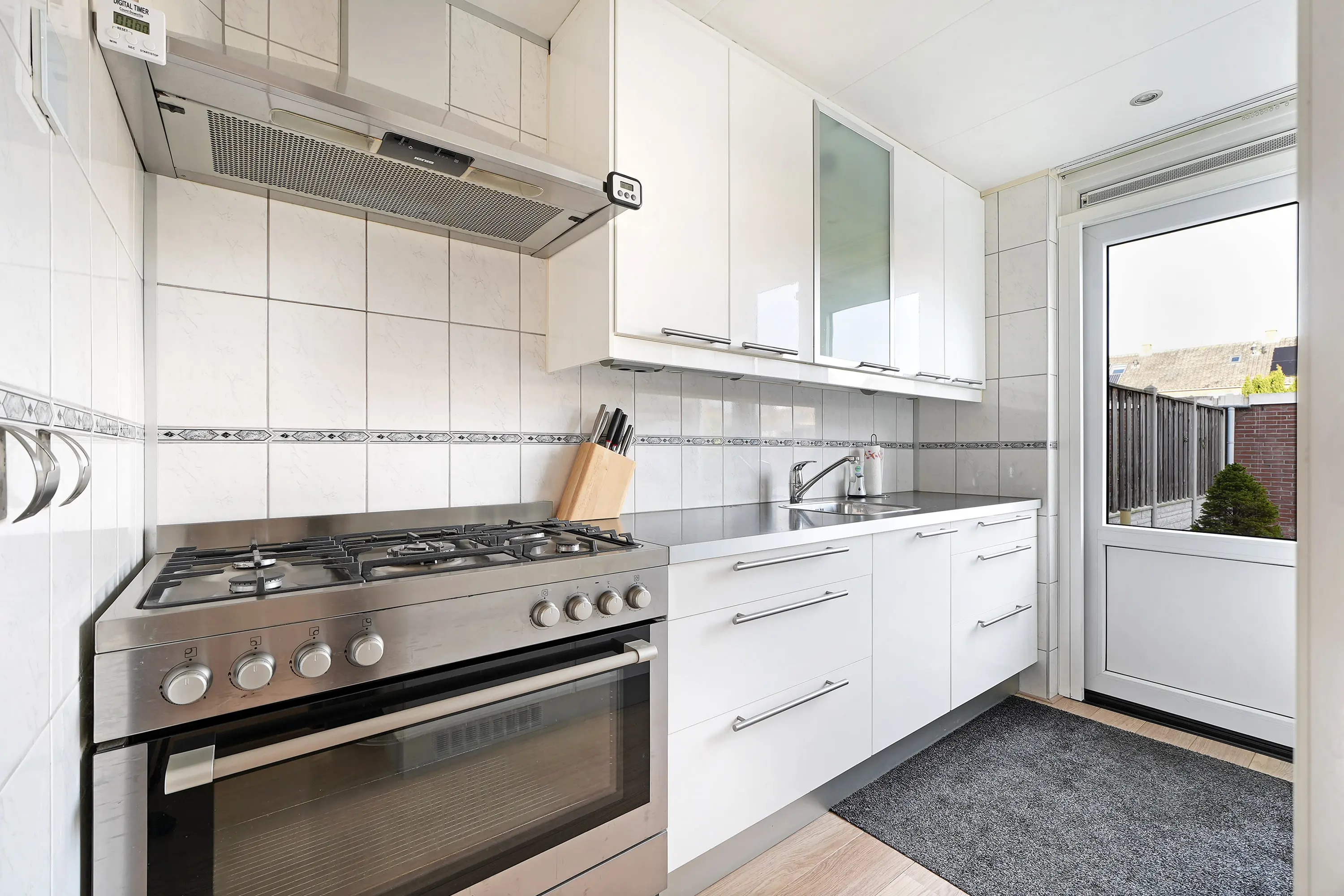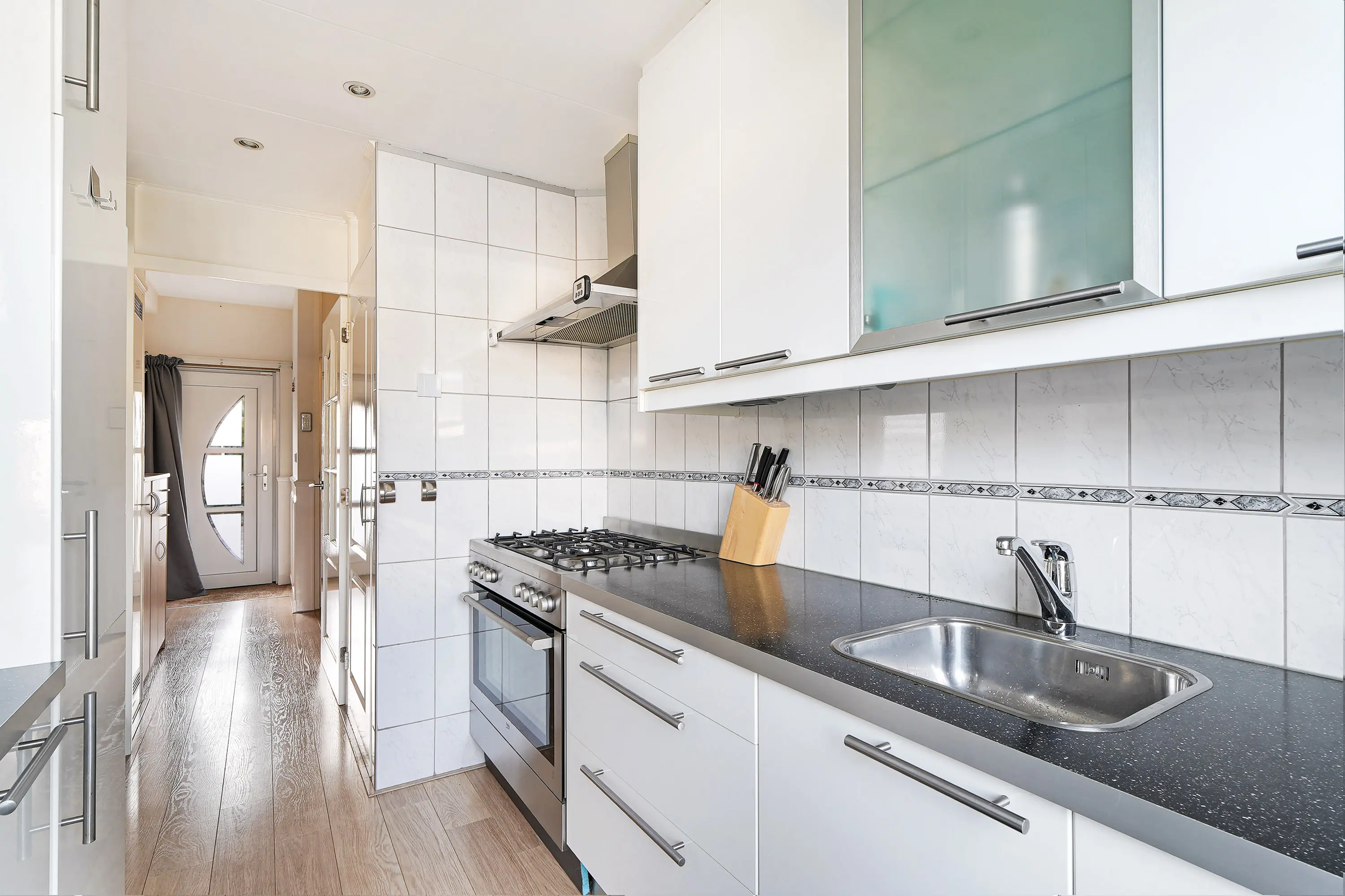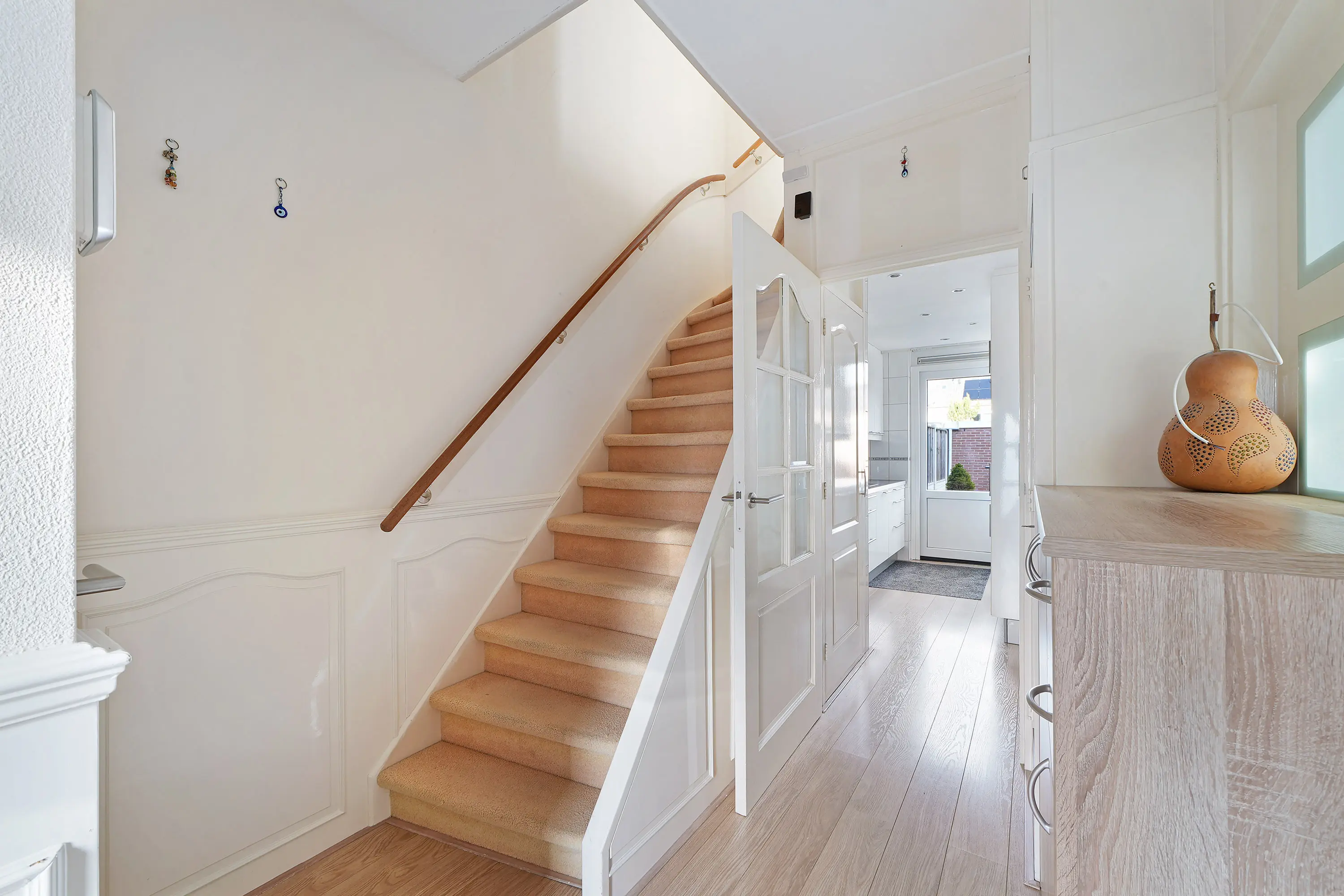 Hal, toilet, meterkast en de trapopgang naar de verdieping. Vervolgens stapt u binnen in de lichte en fijne woon- en eetkamer, waar sfeer en ruimte elkaar perfect aanvullen. De praktische keuken aan de achterzijde is modern en functioneel ingericht en beschikt over een handige opbergkast.