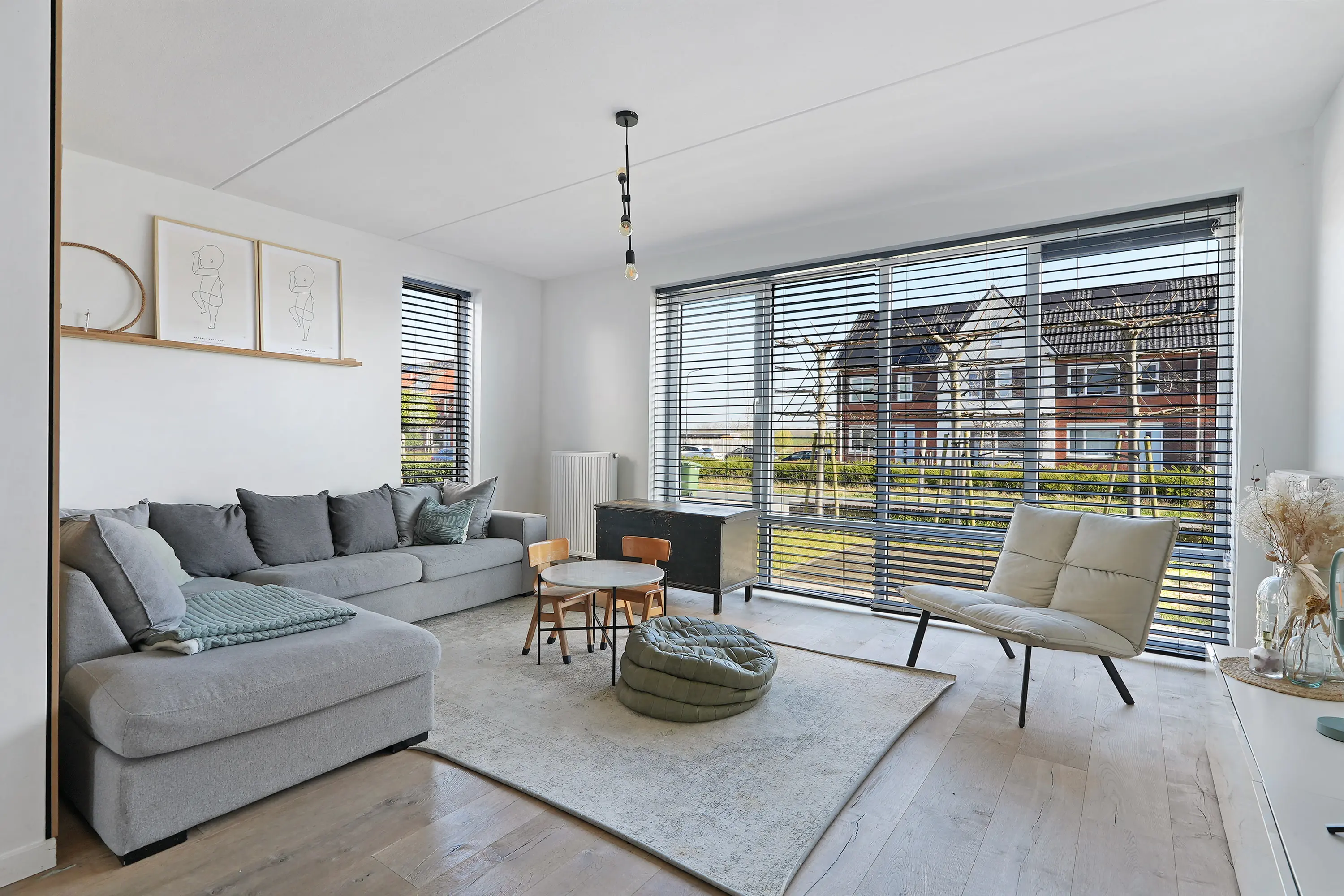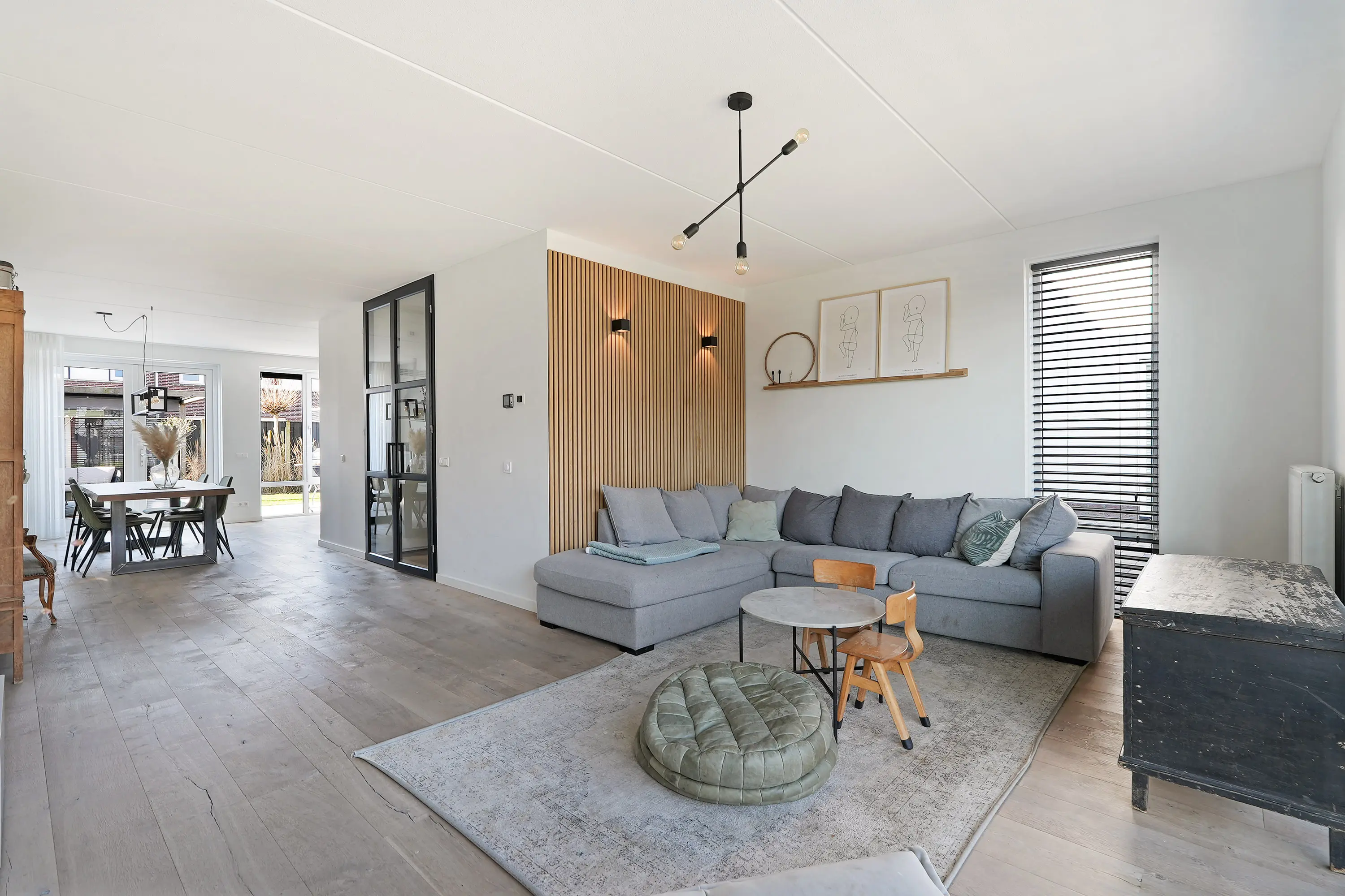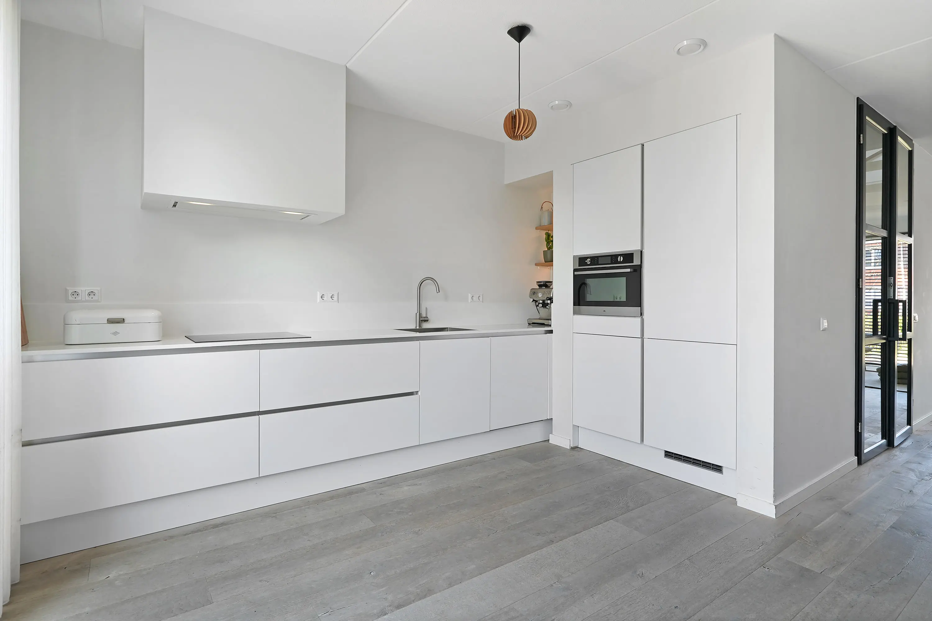 Begane grond: Een ruime hal met meterkast, toilet en trapopgang. Een royale woonkamer van met hoge raampartijen aan de voorzijde en openslaande tuindeuren achter. Aangrenzend de ruime open keuken, uitgevoerd in prachtig wit met hoogwaardige inbouwapparatuur. Tijdens de bouw is ervoor gekozen om de keuken te verlengen, dit maakt het geheel extra interessant.