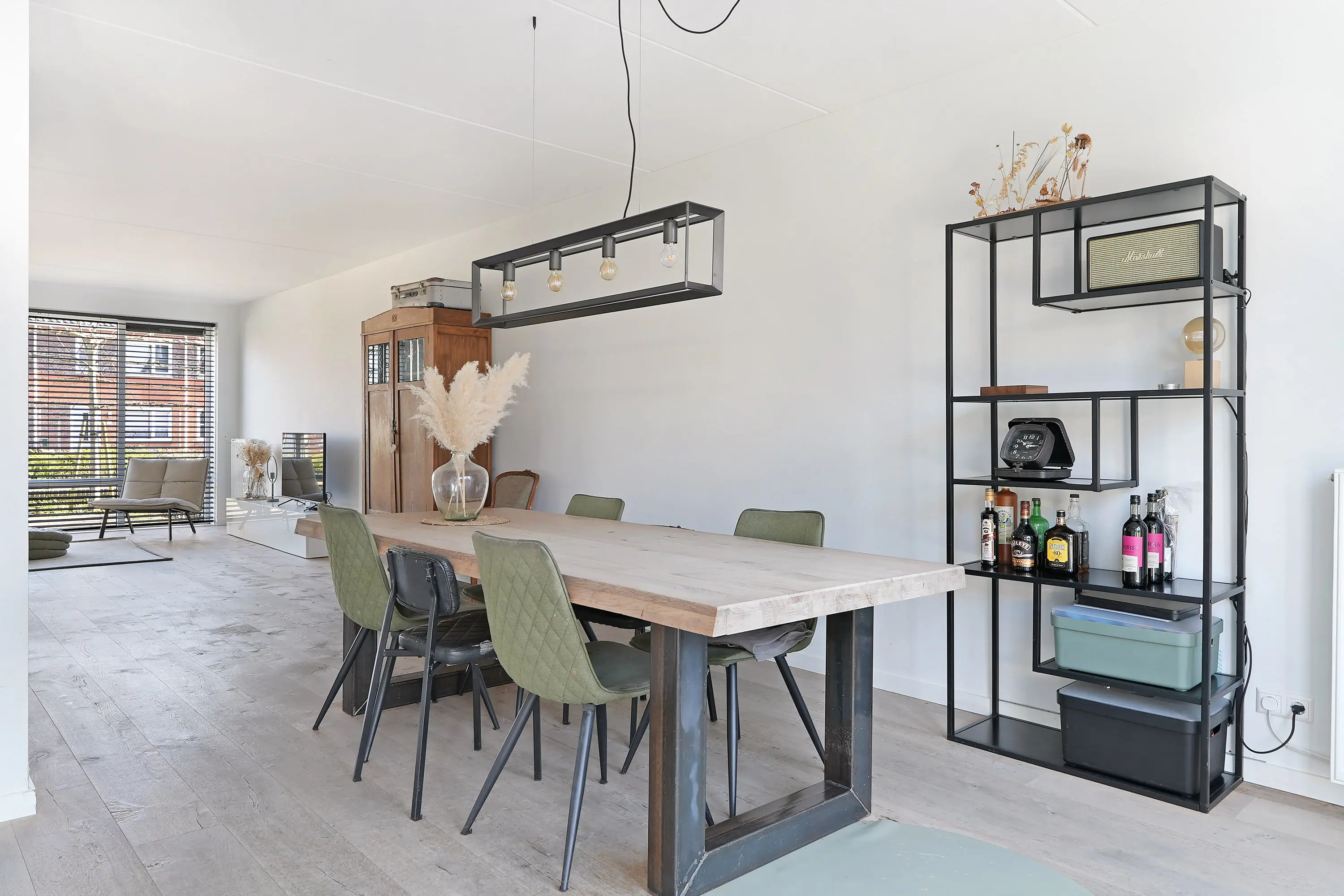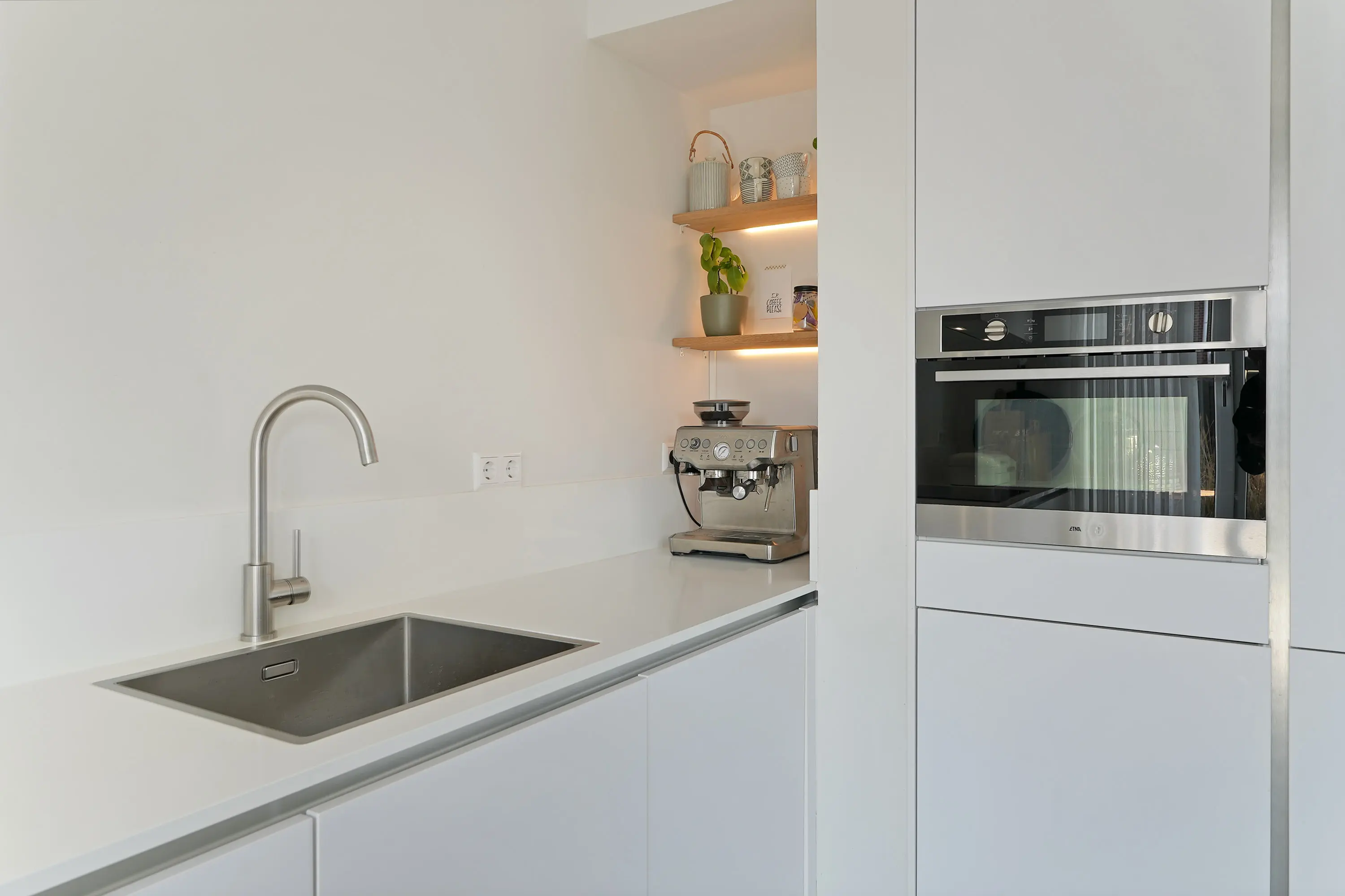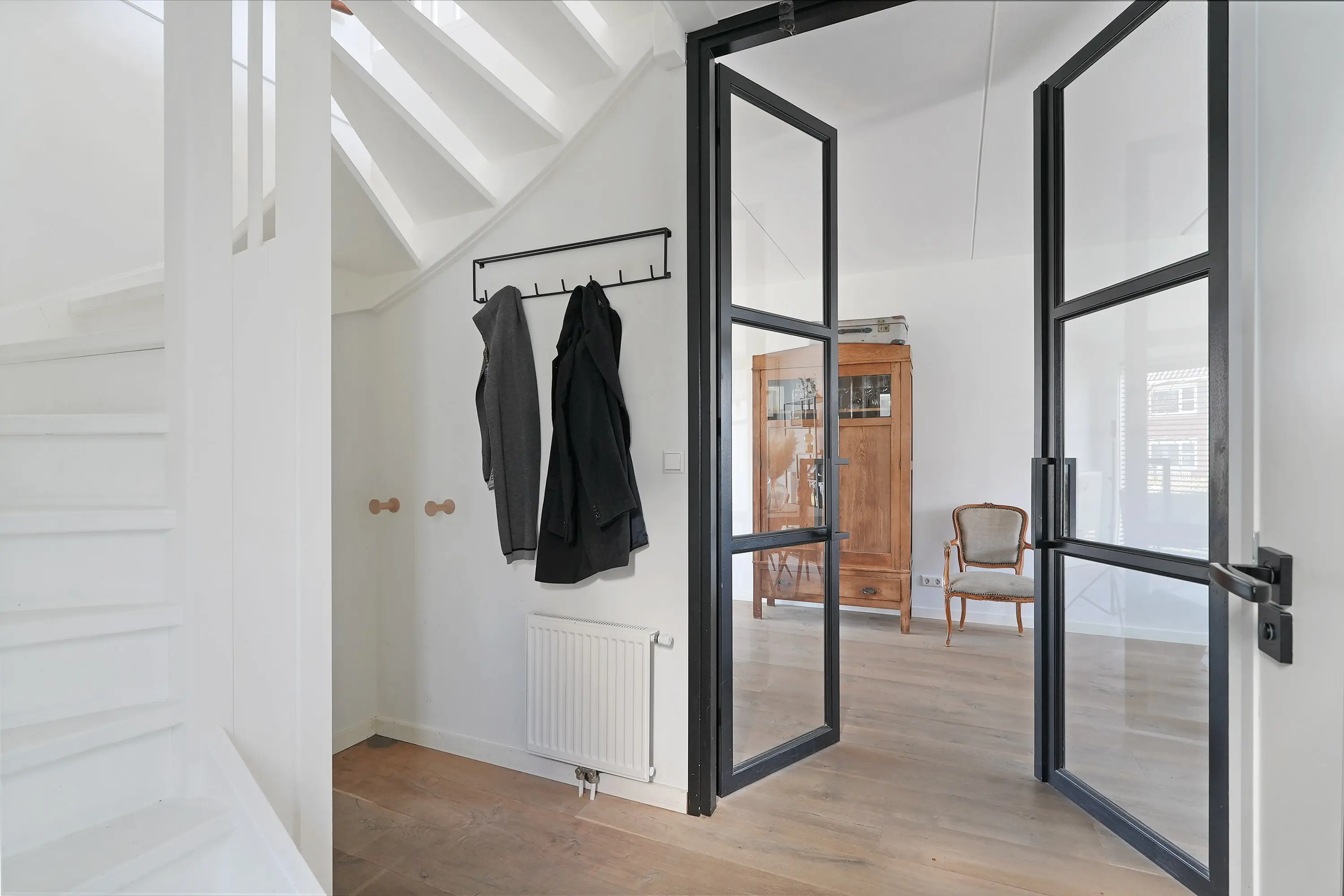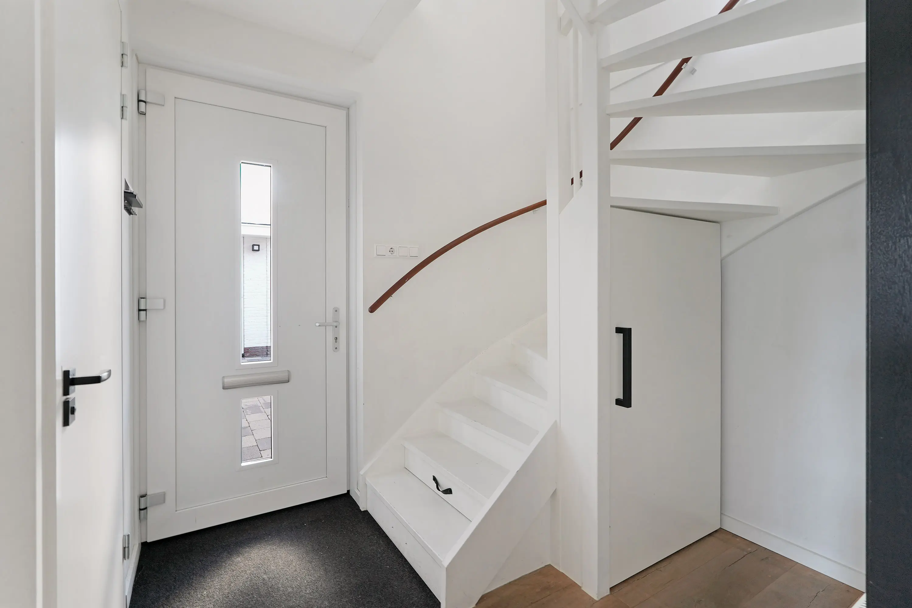 Begane grond: Een ruime hal met meterkast, toilet en trapopgang. Een royale woonkamer van met hoge raampartijen aan de voorzijde en openslaande tuindeuren achter. Aangrenzend de ruime open keuken, uitgevoerd in prachtig wit met hoogwaardige inbouwapparatuur. Tijdens de bouw is ervoor gekozen om de keuken te verlengen, dit maakt het geheel extra interessant.