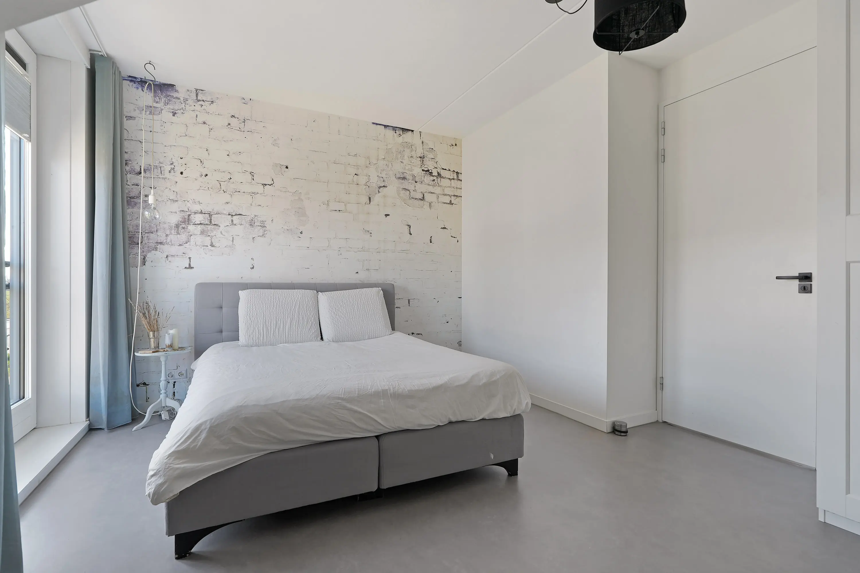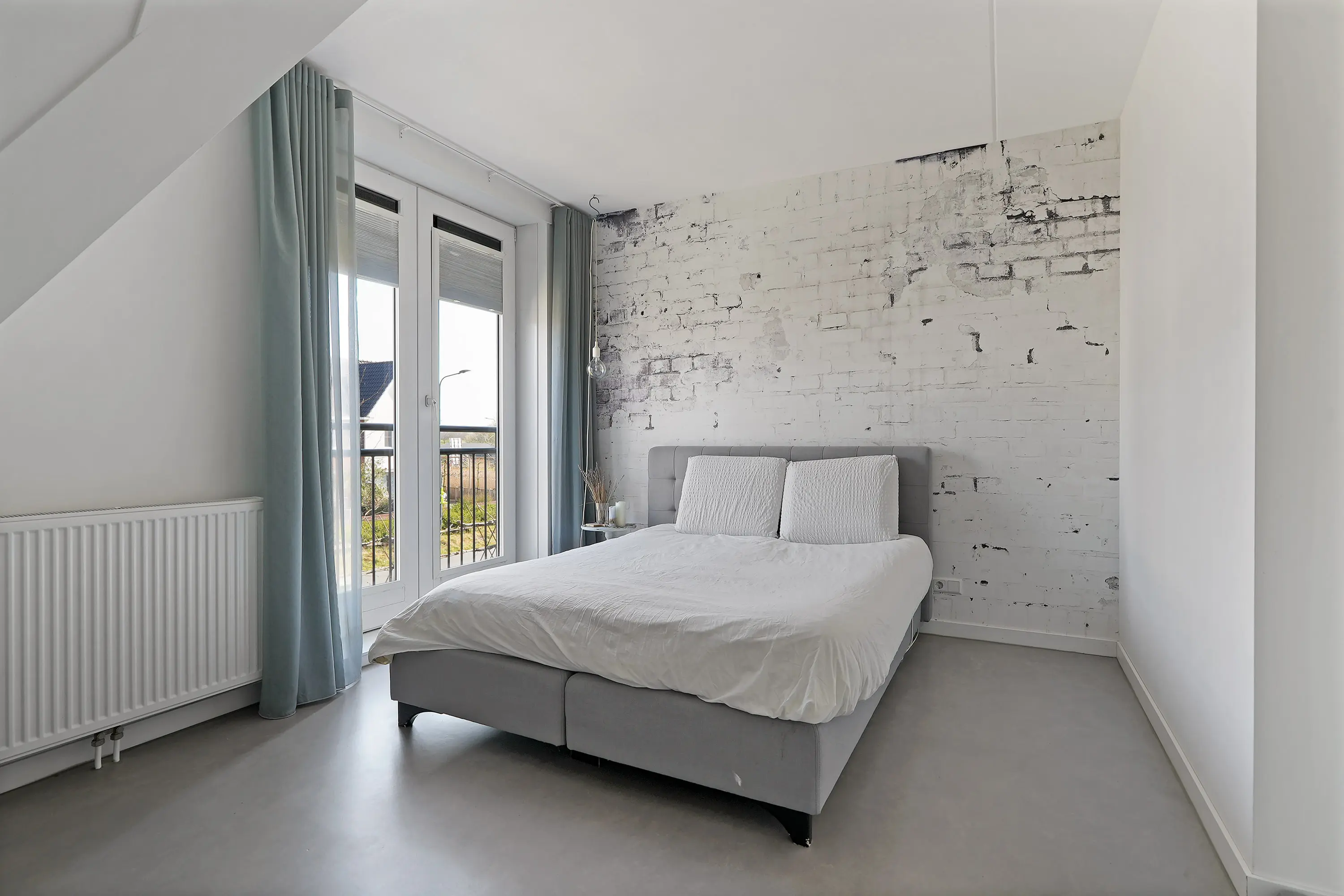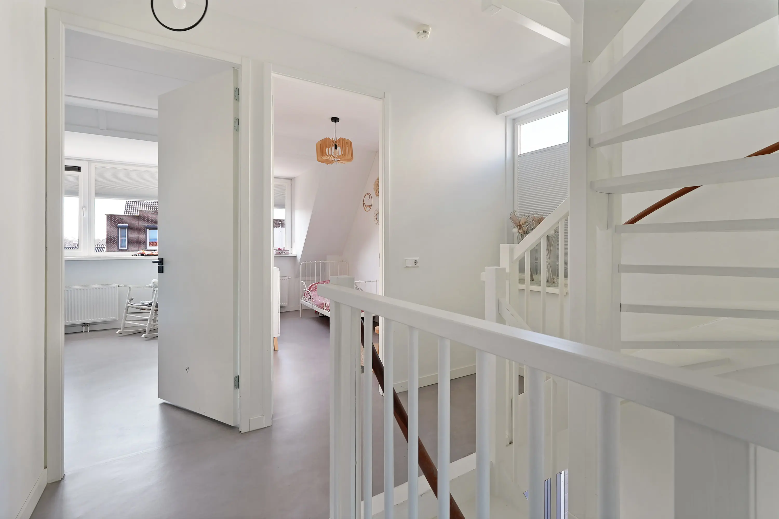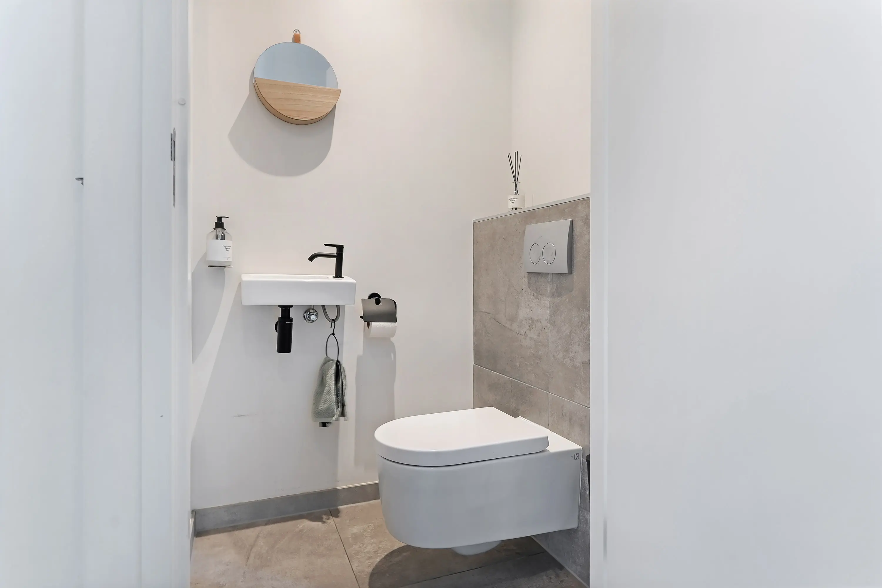 Eerste verdieping: Overloop met 3 ruime slaapkamers, de grootste slaapkamer bevindt zich aan de voorzijde, een prachtige ruimte met frans balkon. De luxe en moderne badkamer, gehuld in een neutrale kleurstelling, biedt een oase van rust met een inloopdouche, dubbele wastafel met meubel en een tweede toilet.