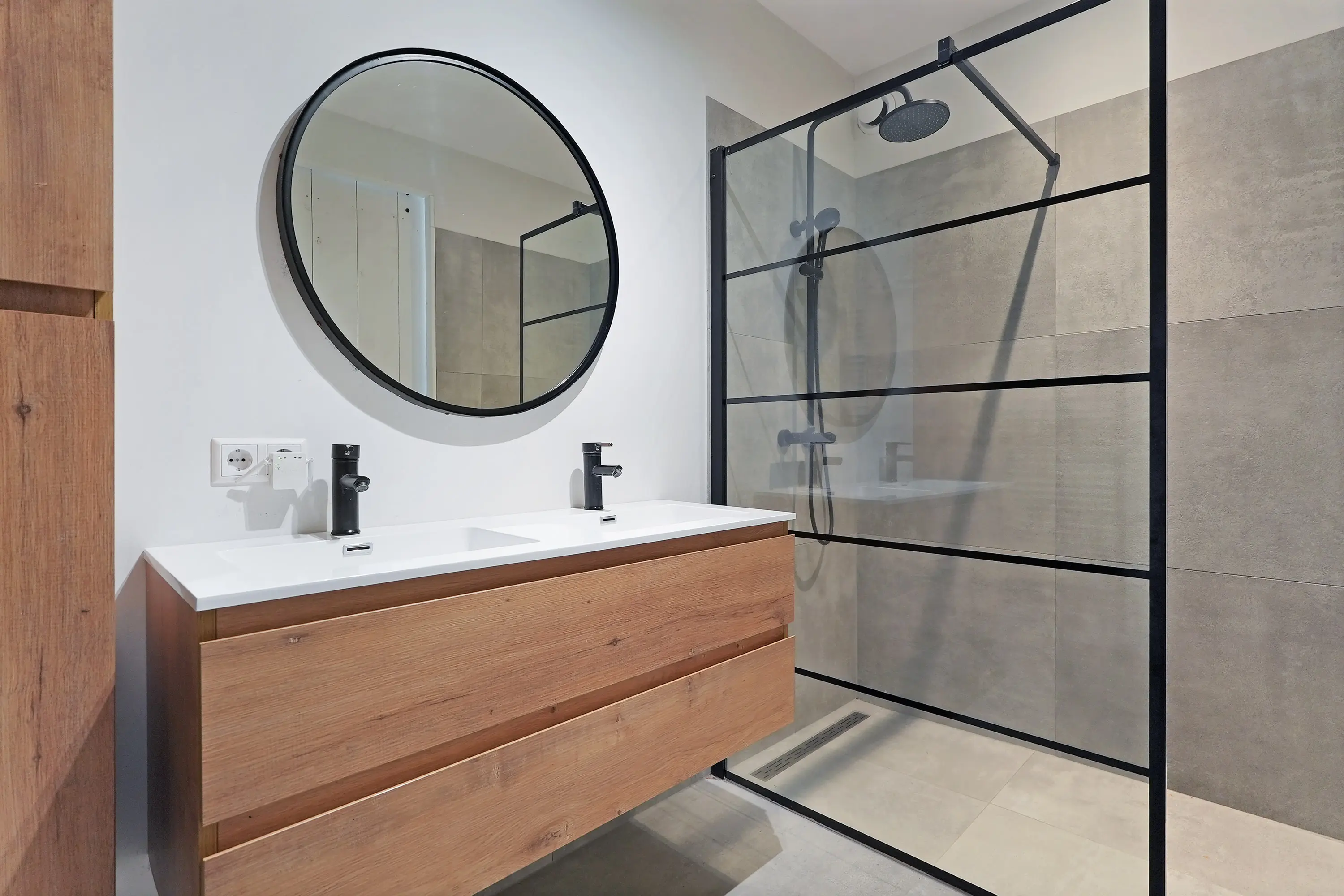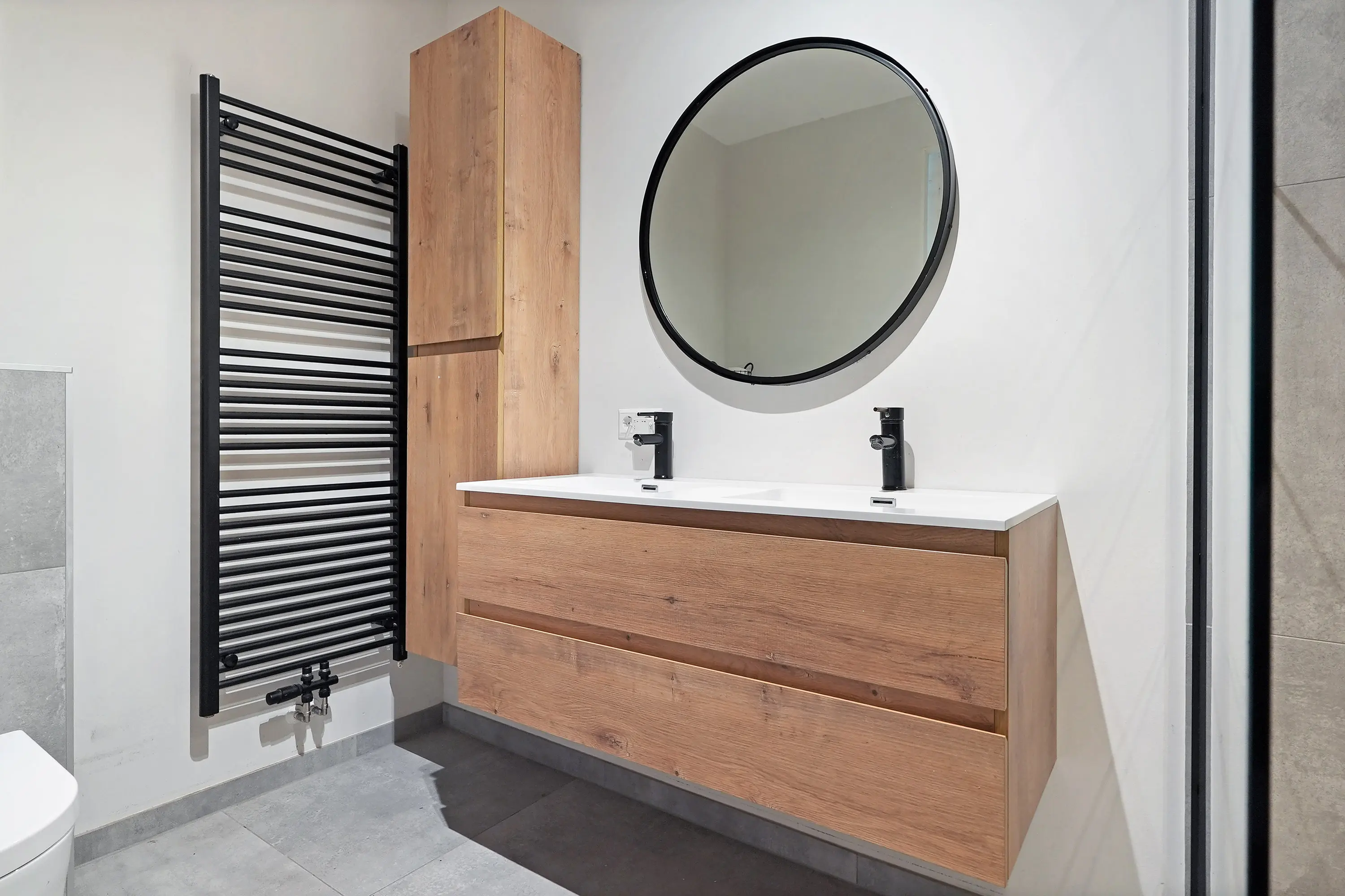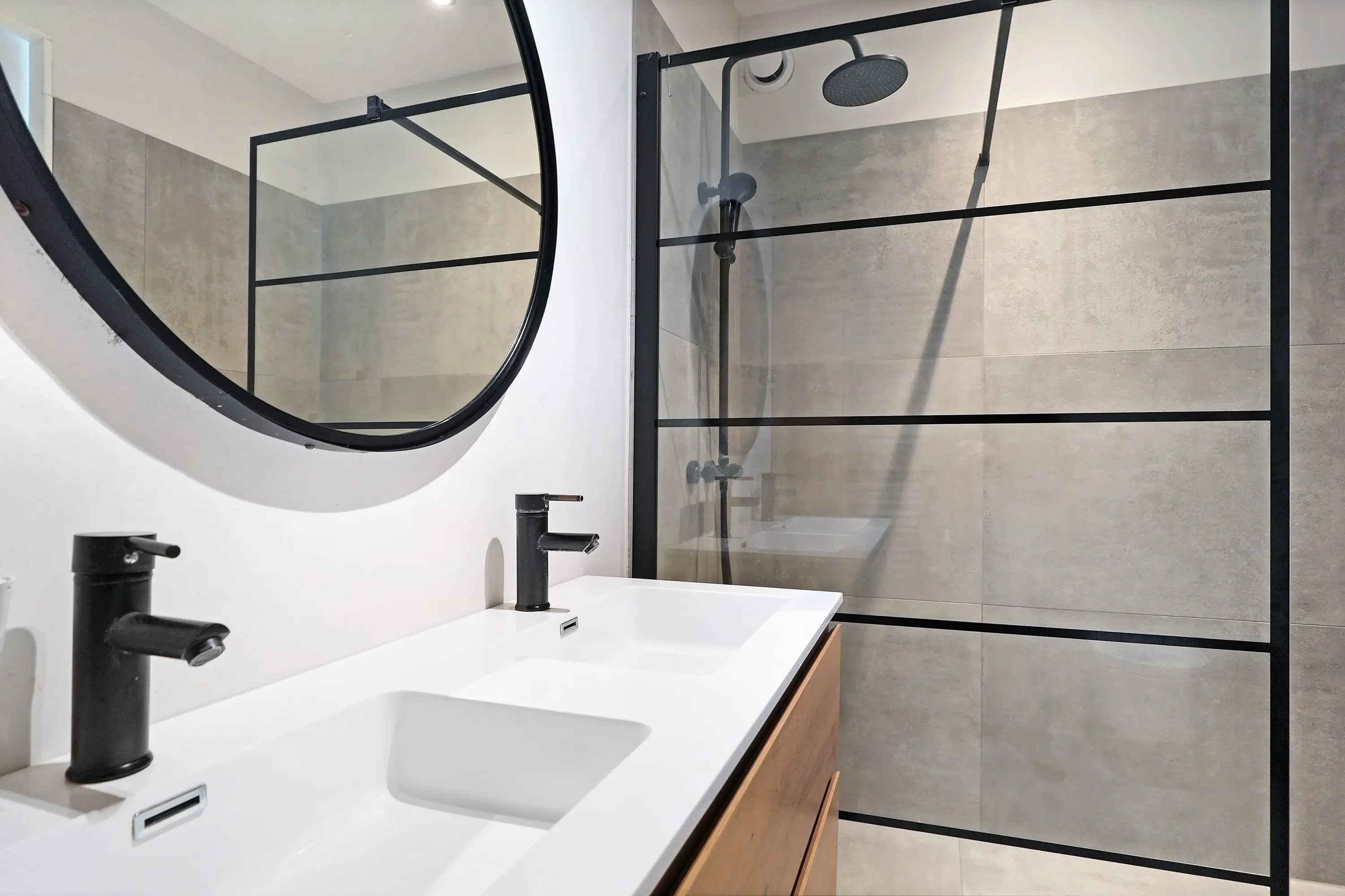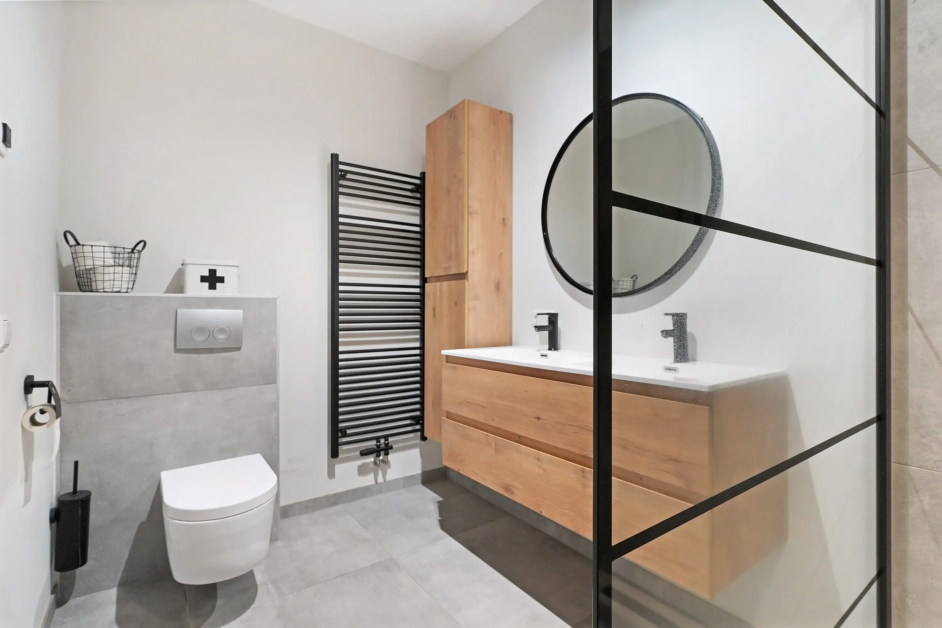 Eerste verdieping: Overloop met 3 ruime slaapkamers, de grootste slaapkamer bevindt zich aan de voorzijde, een prachtige ruimte met frans balkon. De luxe en moderne badkamer, gehuld in een neutrale kleurstelling, biedt een oase van rust met een inloopdouche, dubbele wastafel met meubel en een tweede toilet.