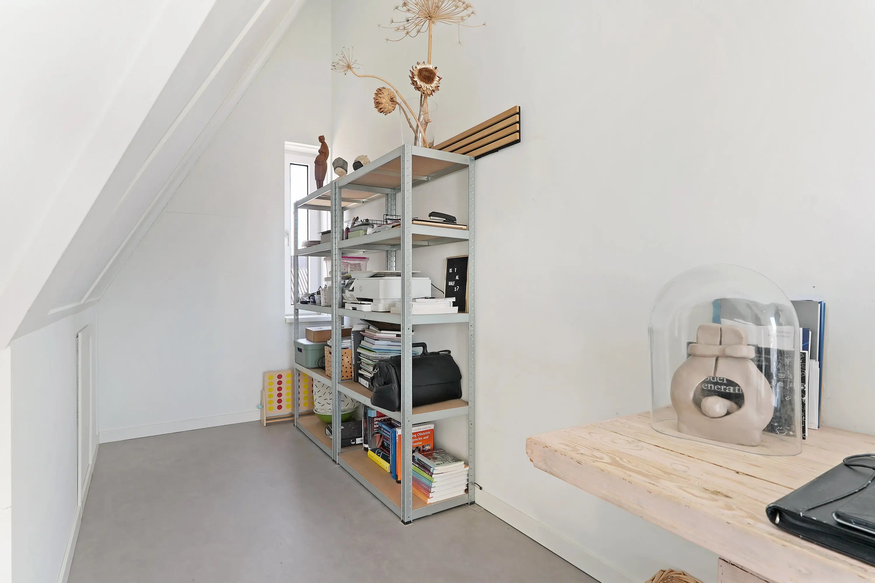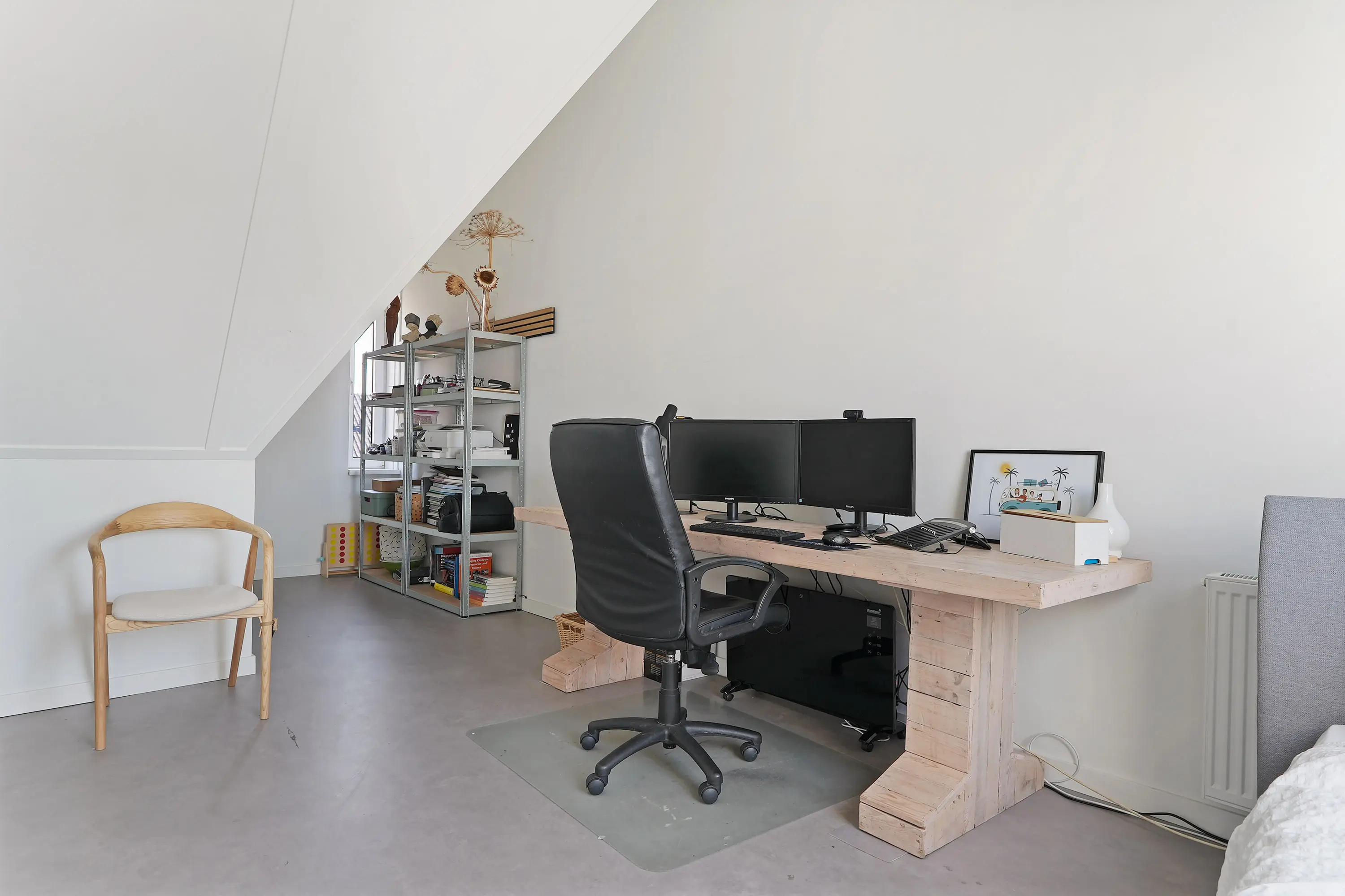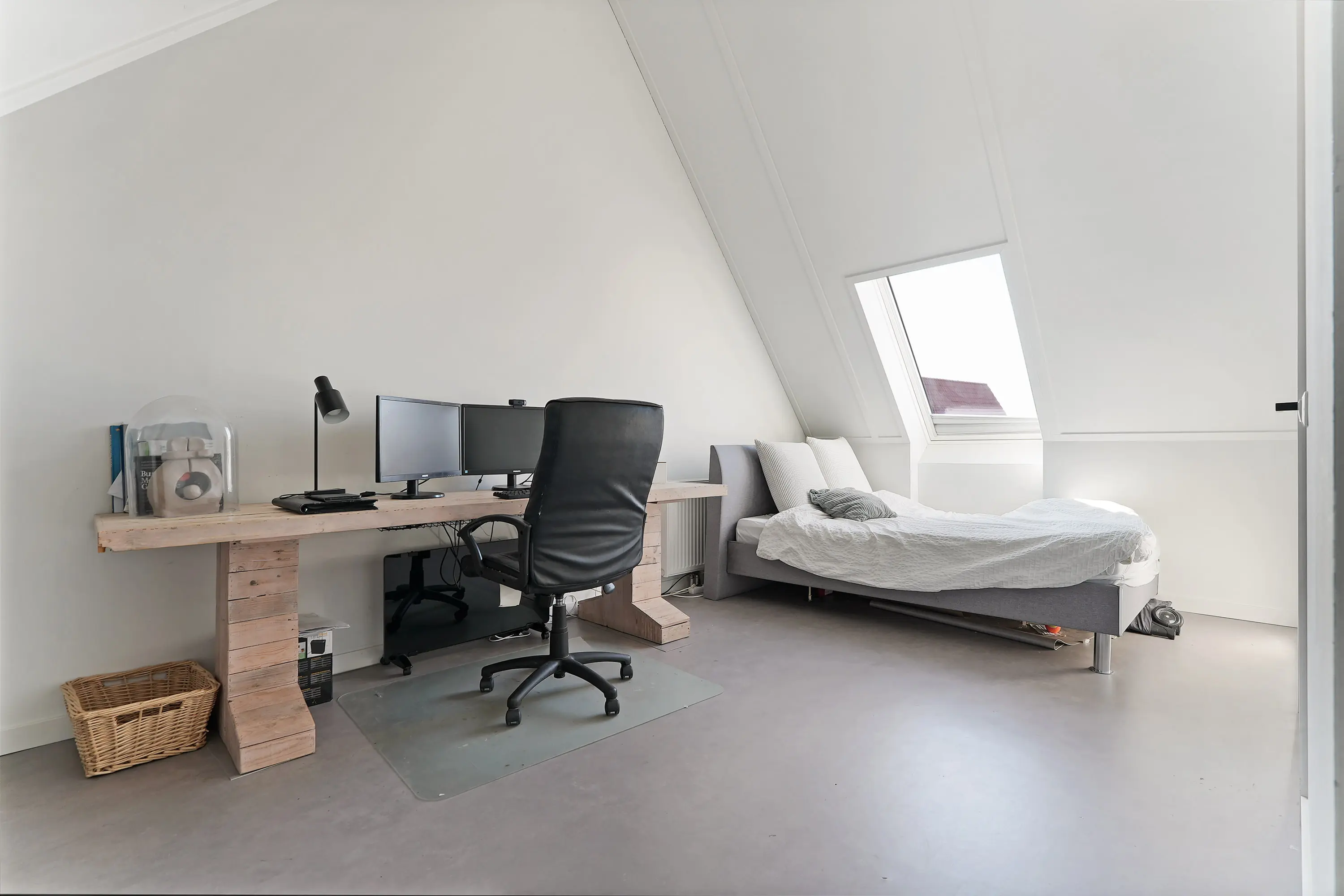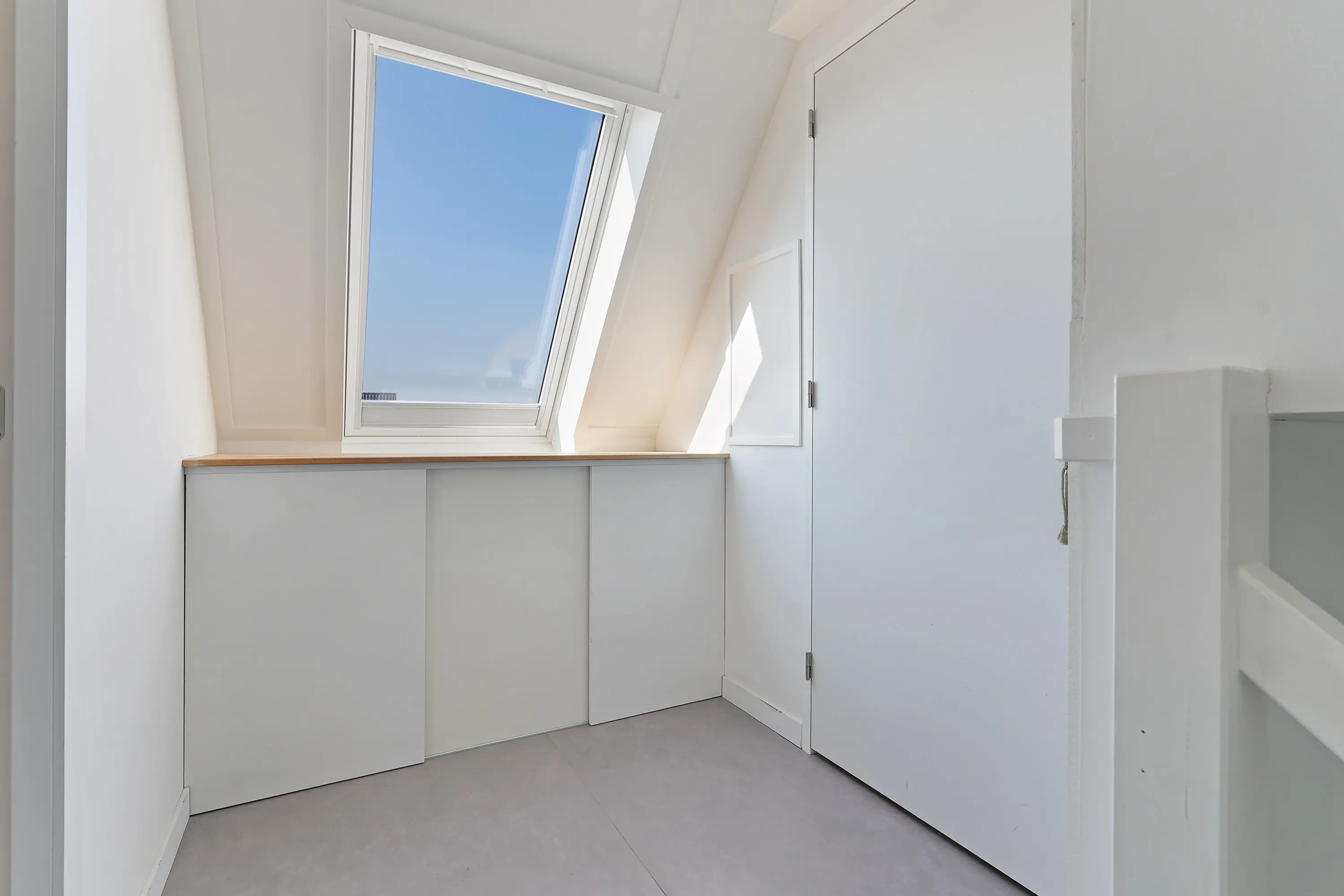 Tweede verdieping: Overloop met c.v.-opstelling en witgoedaansluitingen. En een flinke 4e slaapkamer, ook prima te gebruiken als werk- of speelruimte. Ook is hier nog voldoende bergruimte.