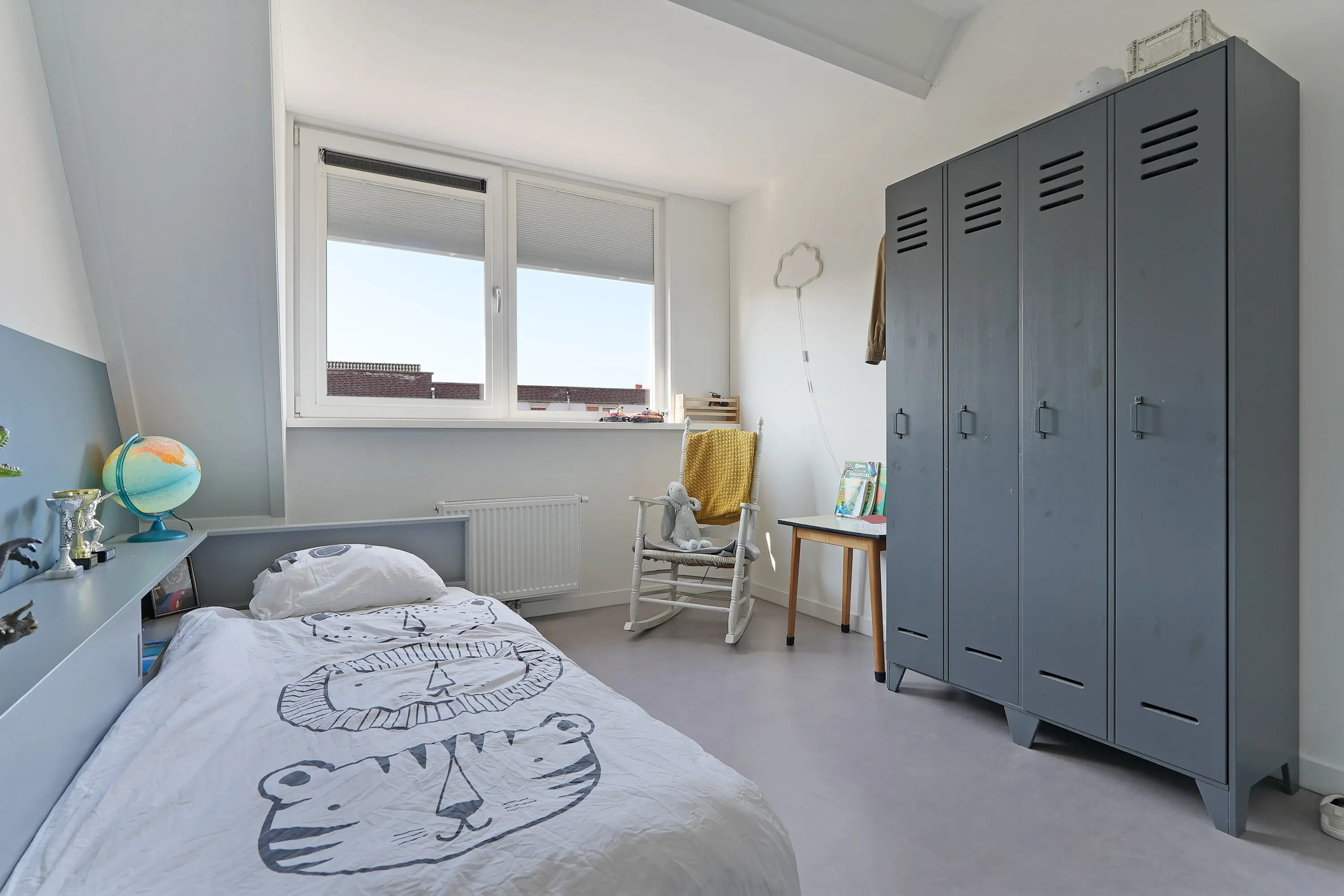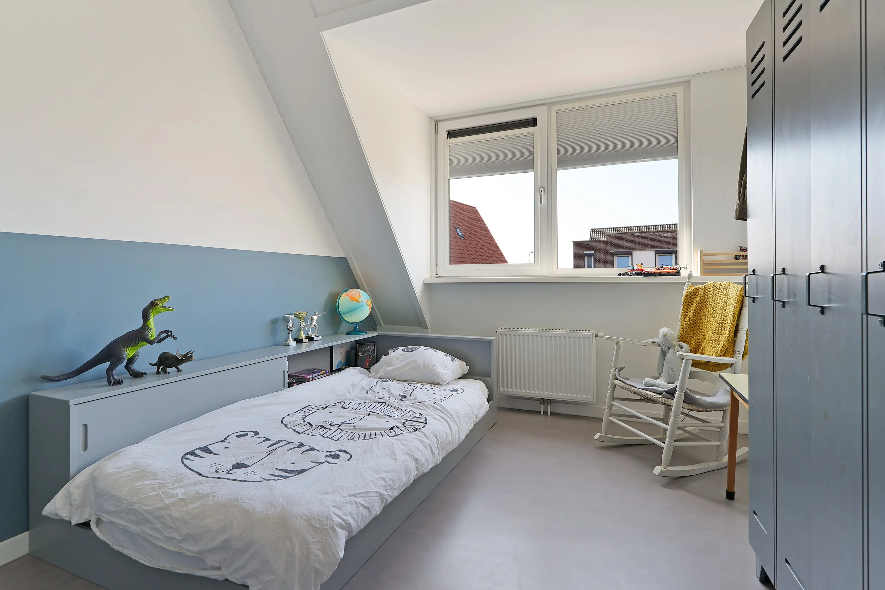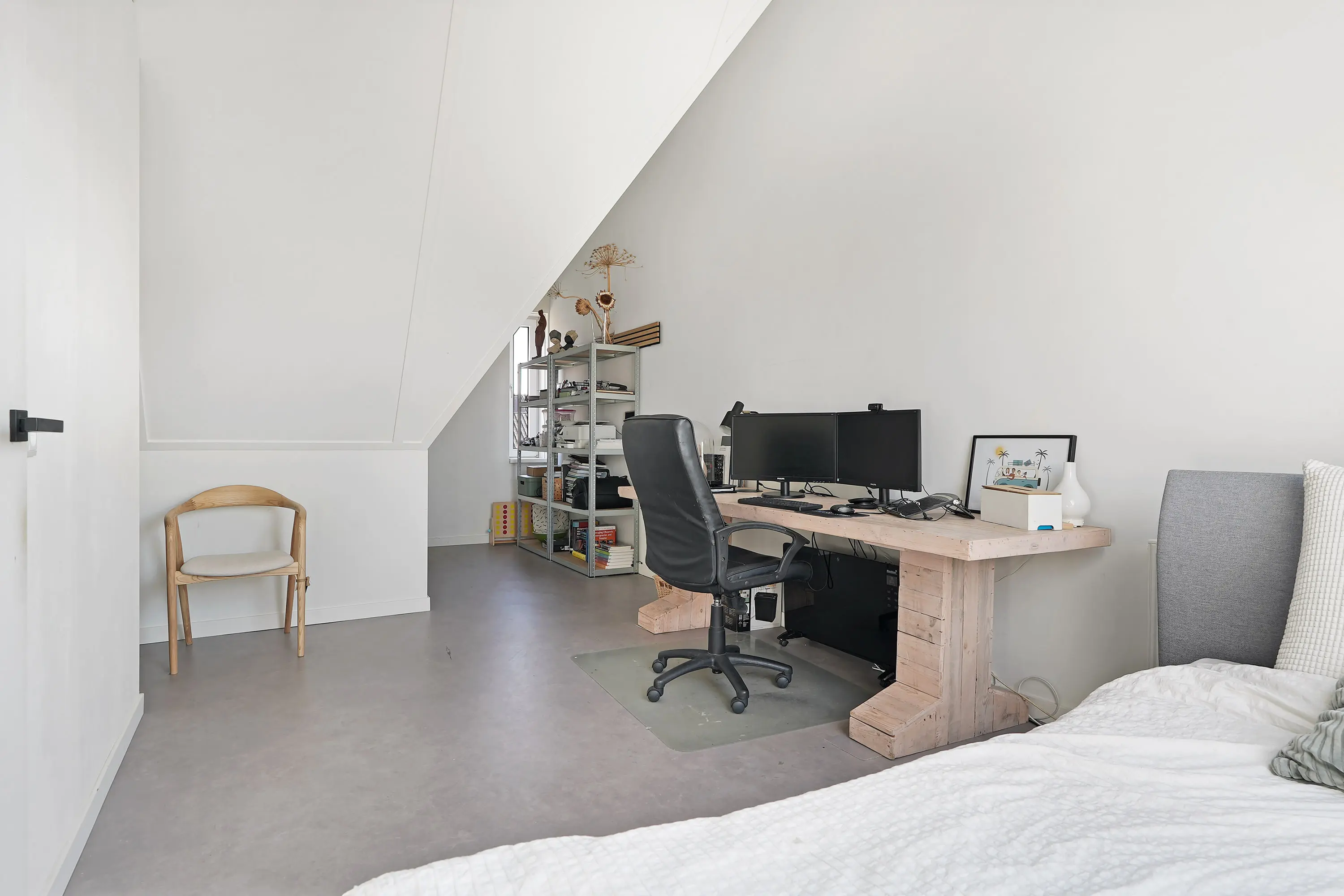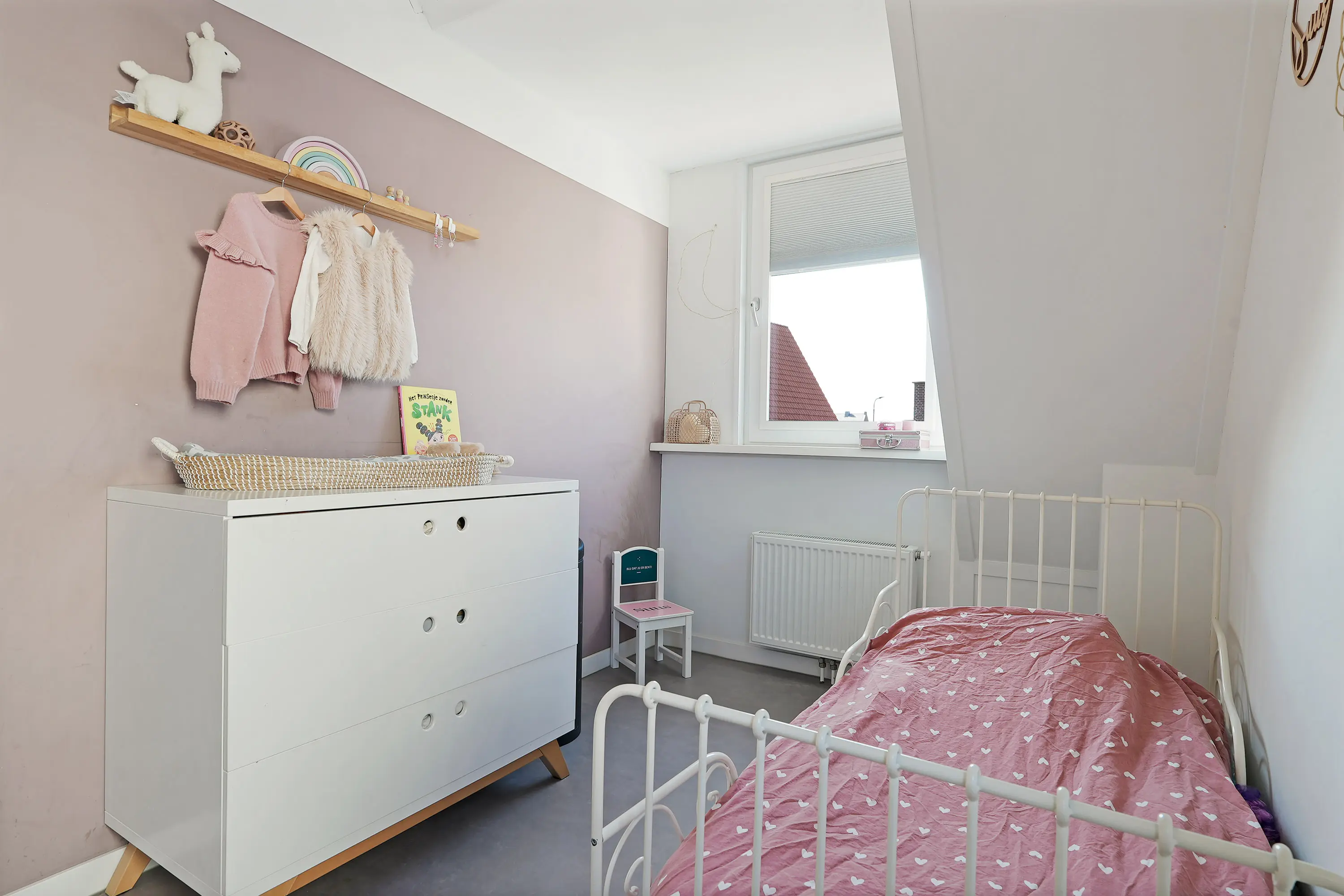 Tweede verdieping: Overloop met c.v.-opstelling en witgoedaansluitingen. En een flinke 4e slaapkamer, ook prima te gebruiken als werk- of speelruimte. Ook is hier nog voldoende bergruimte.