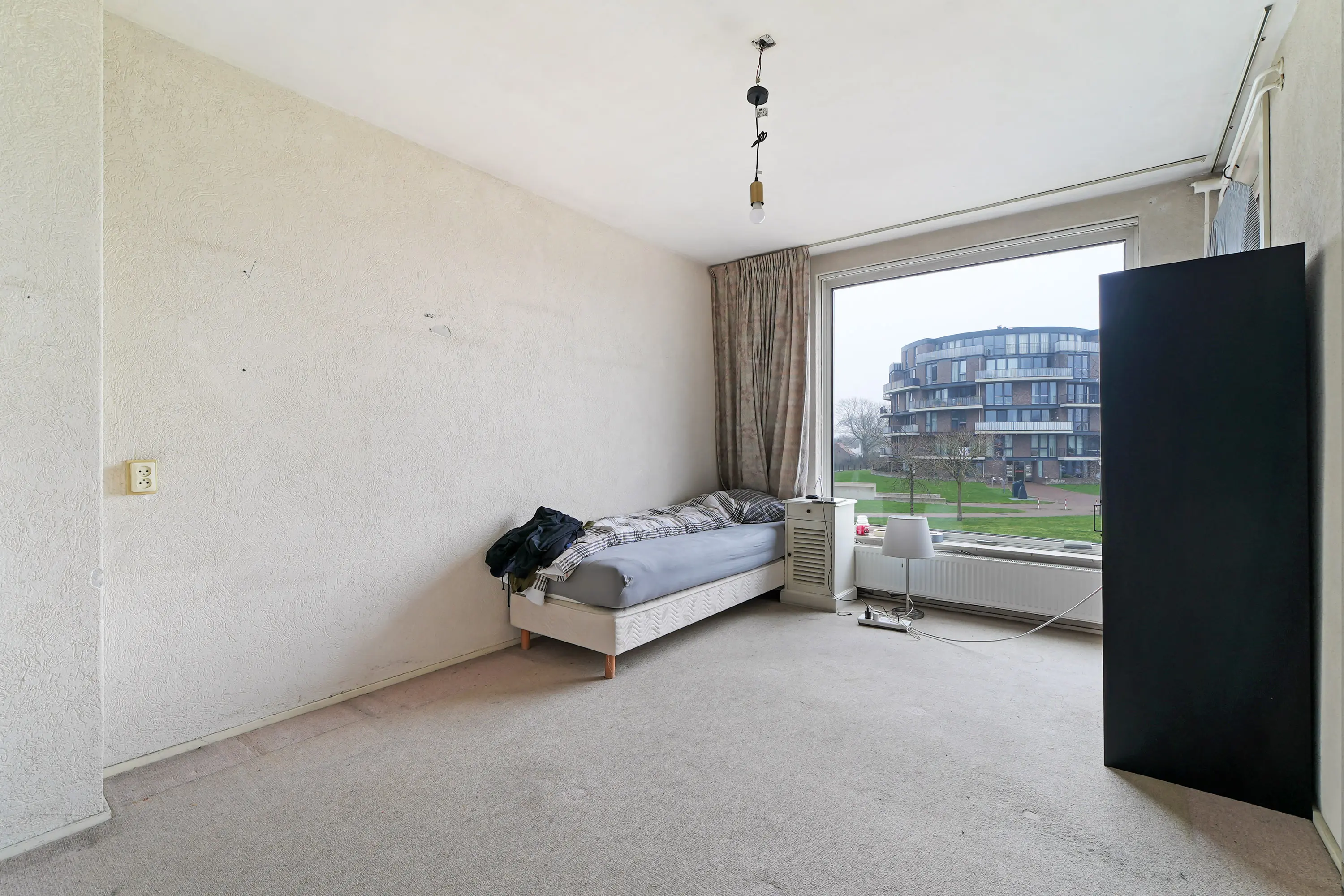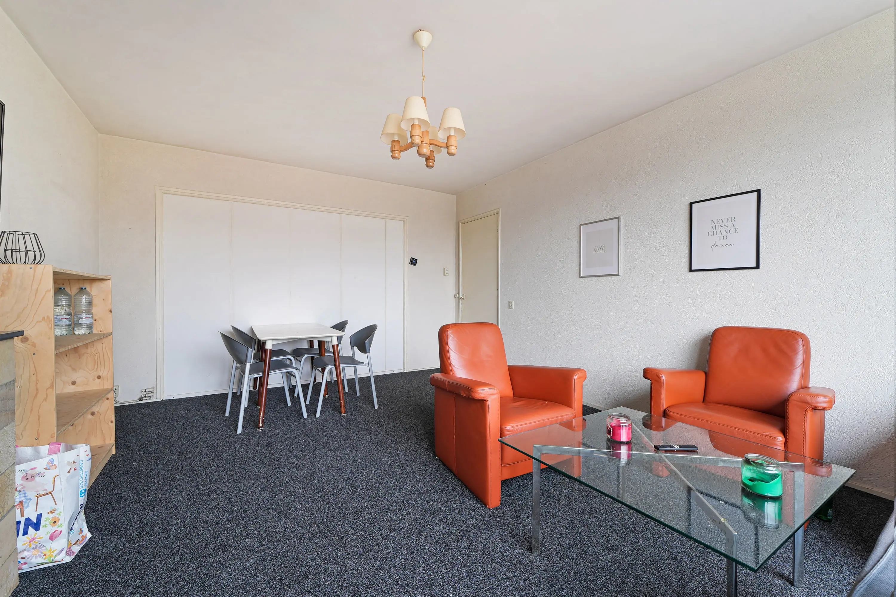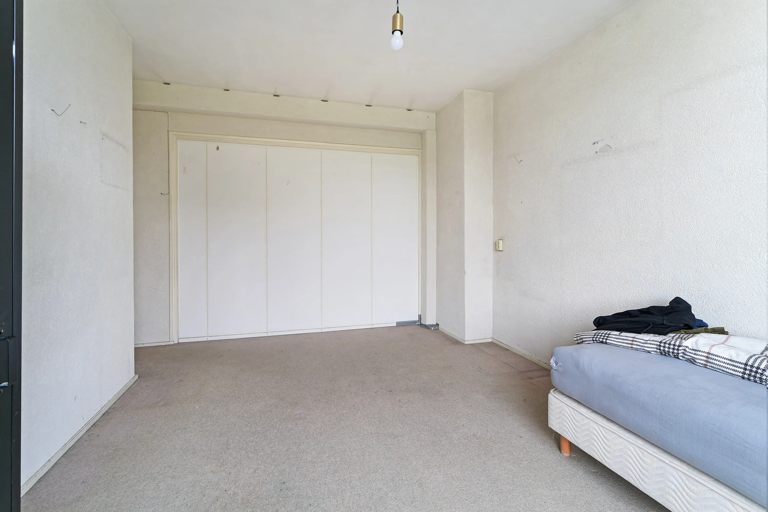 De woonkamer bevindt zich aan de voorzijde, de muur tussen woon- en slaapkamer zou weggehaald kunnen worden zodat u een mooie en lichte woonkamer kan creëren.