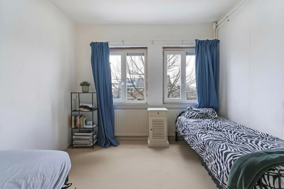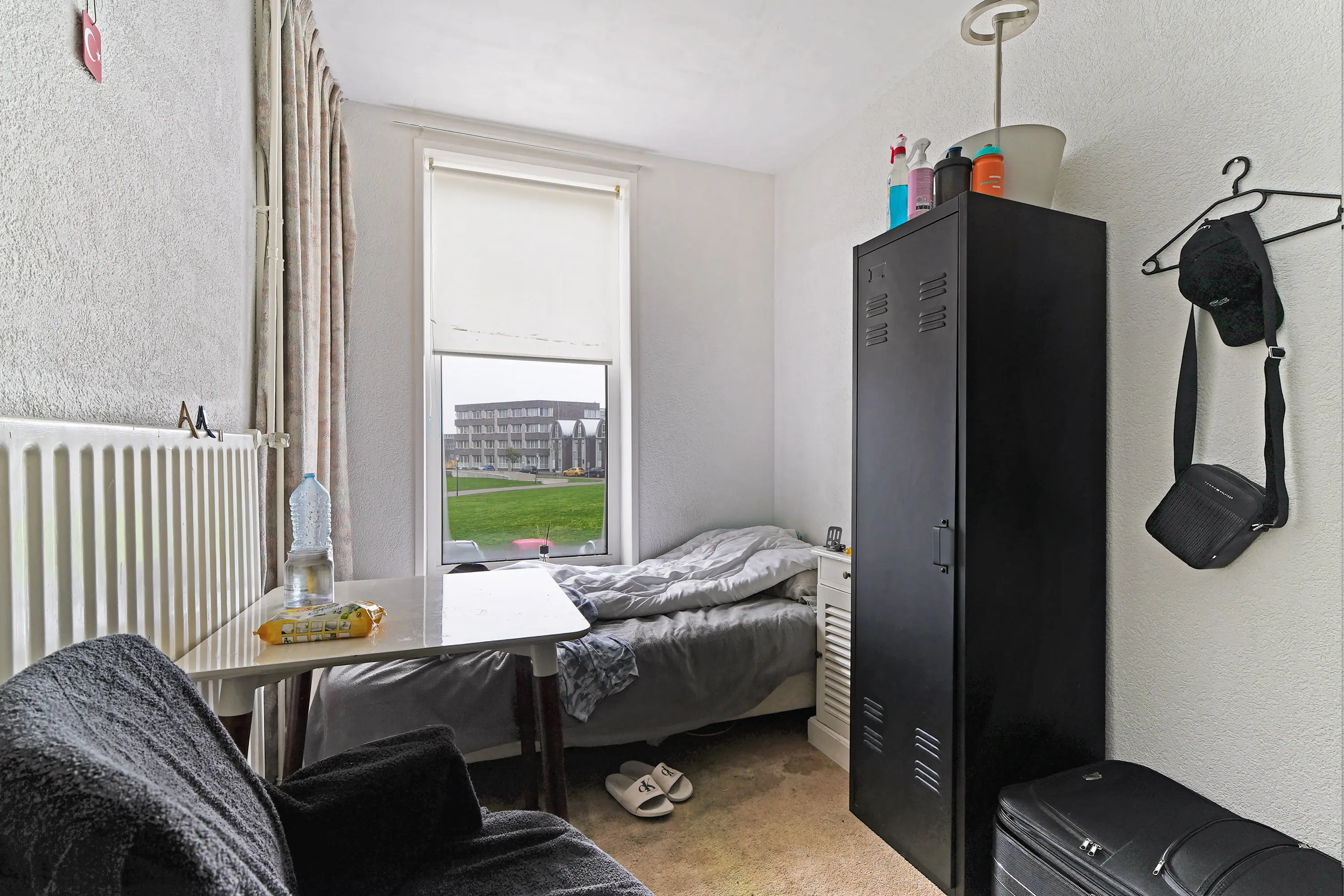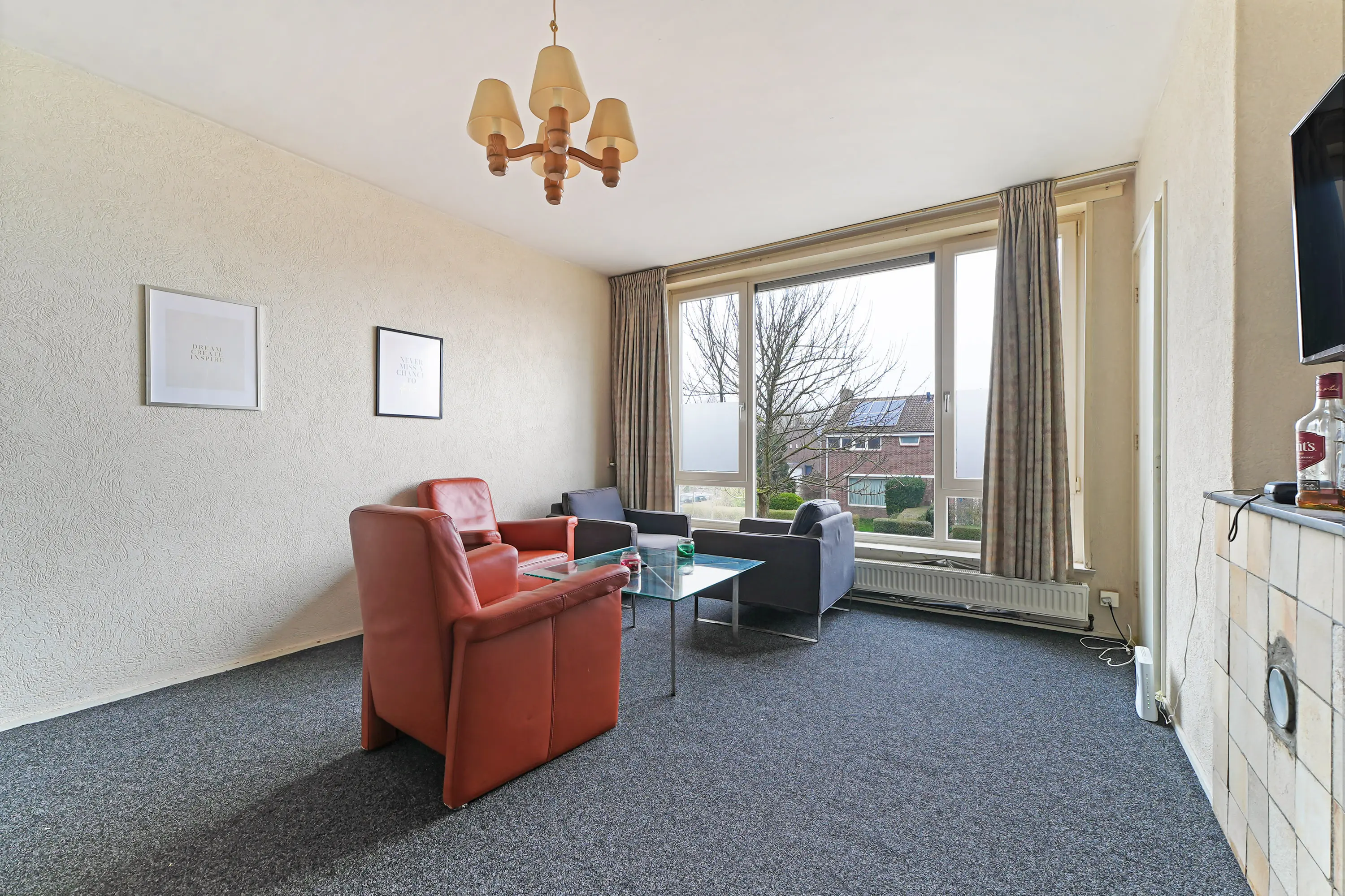 De woonkamer bevindt zich aan de voorzijde, de muur tussen woon- en slaapkamer zou weggehaald kunnen worden zodat u een mooie en lichte woonkamer kan creëren.