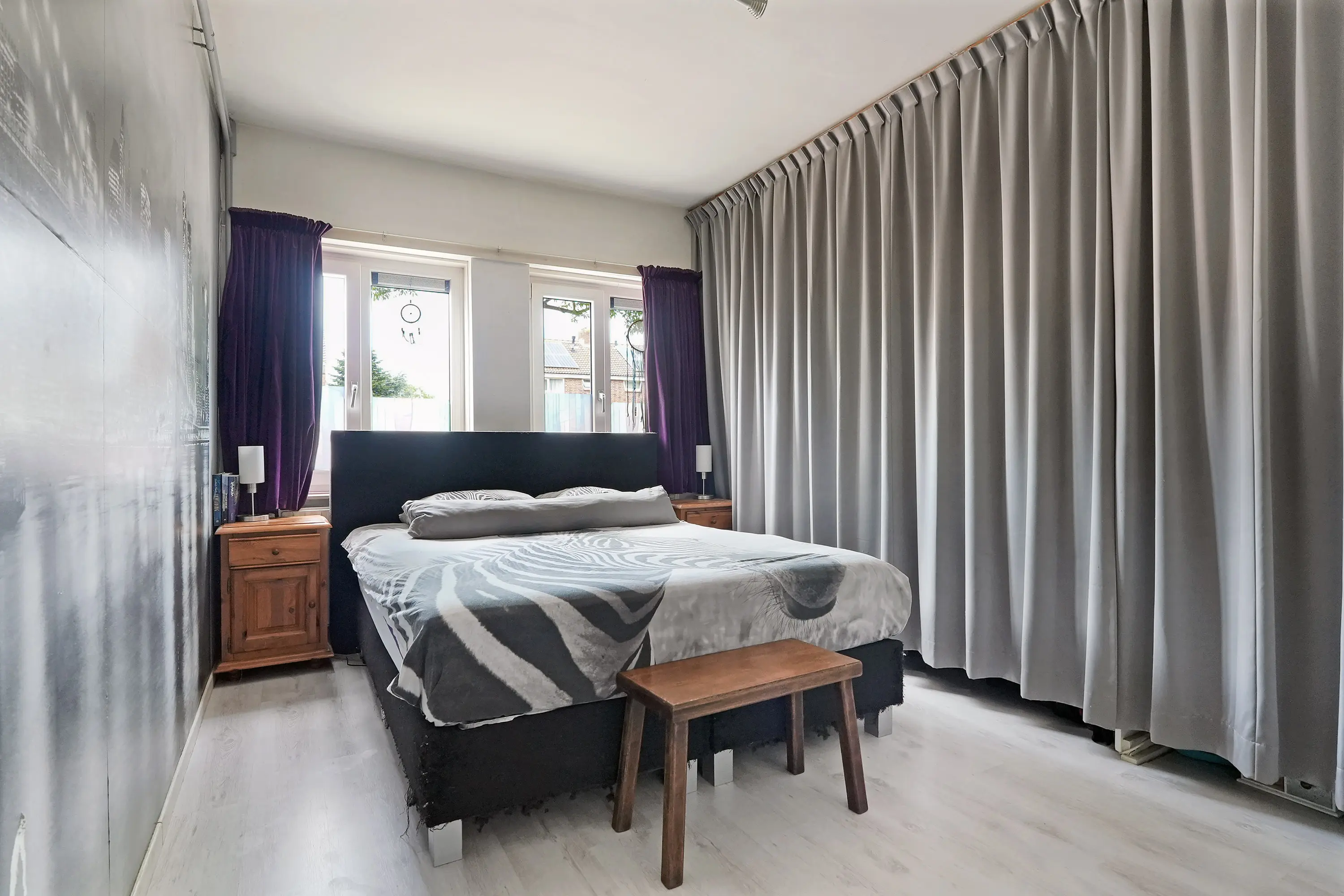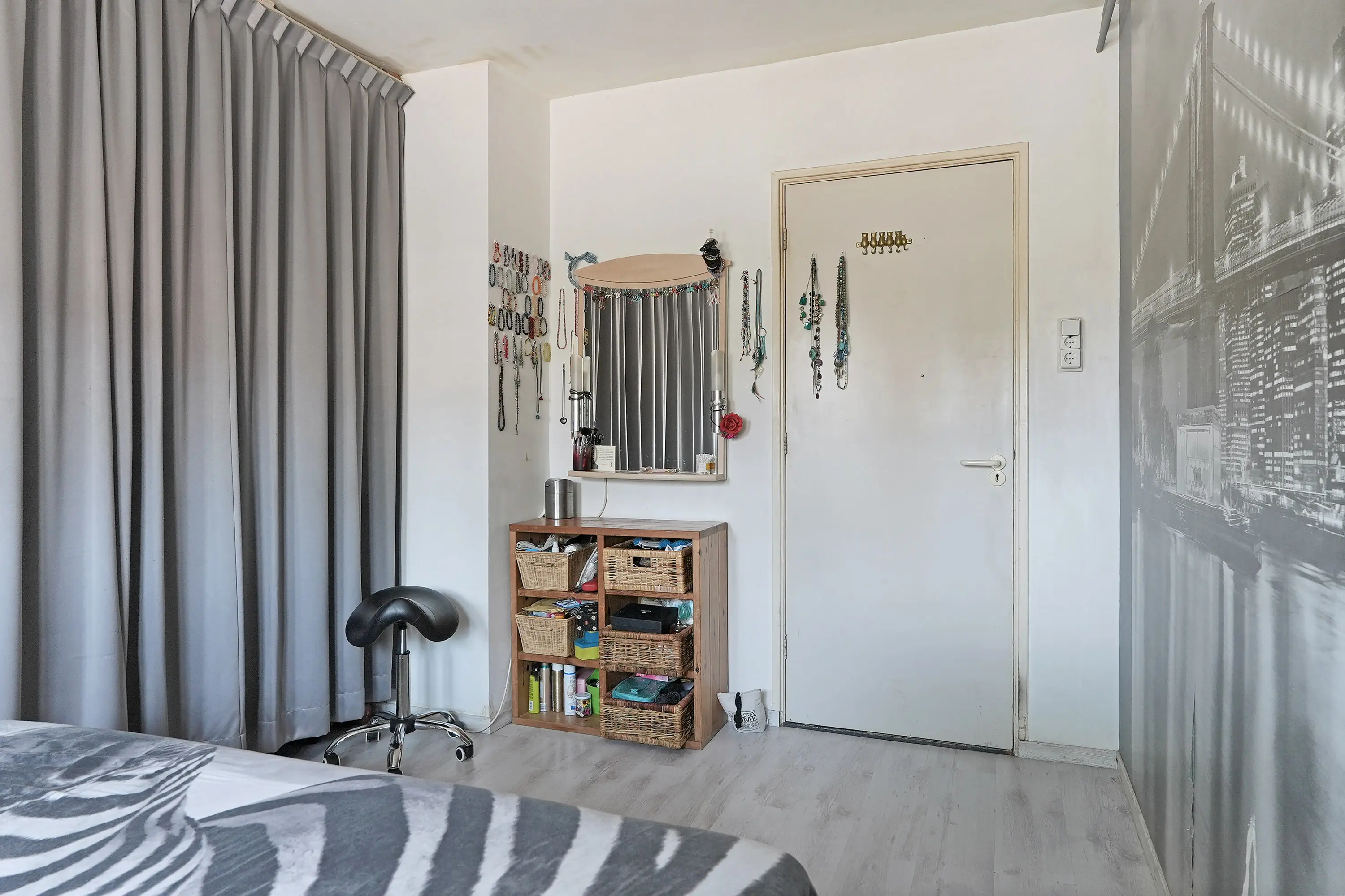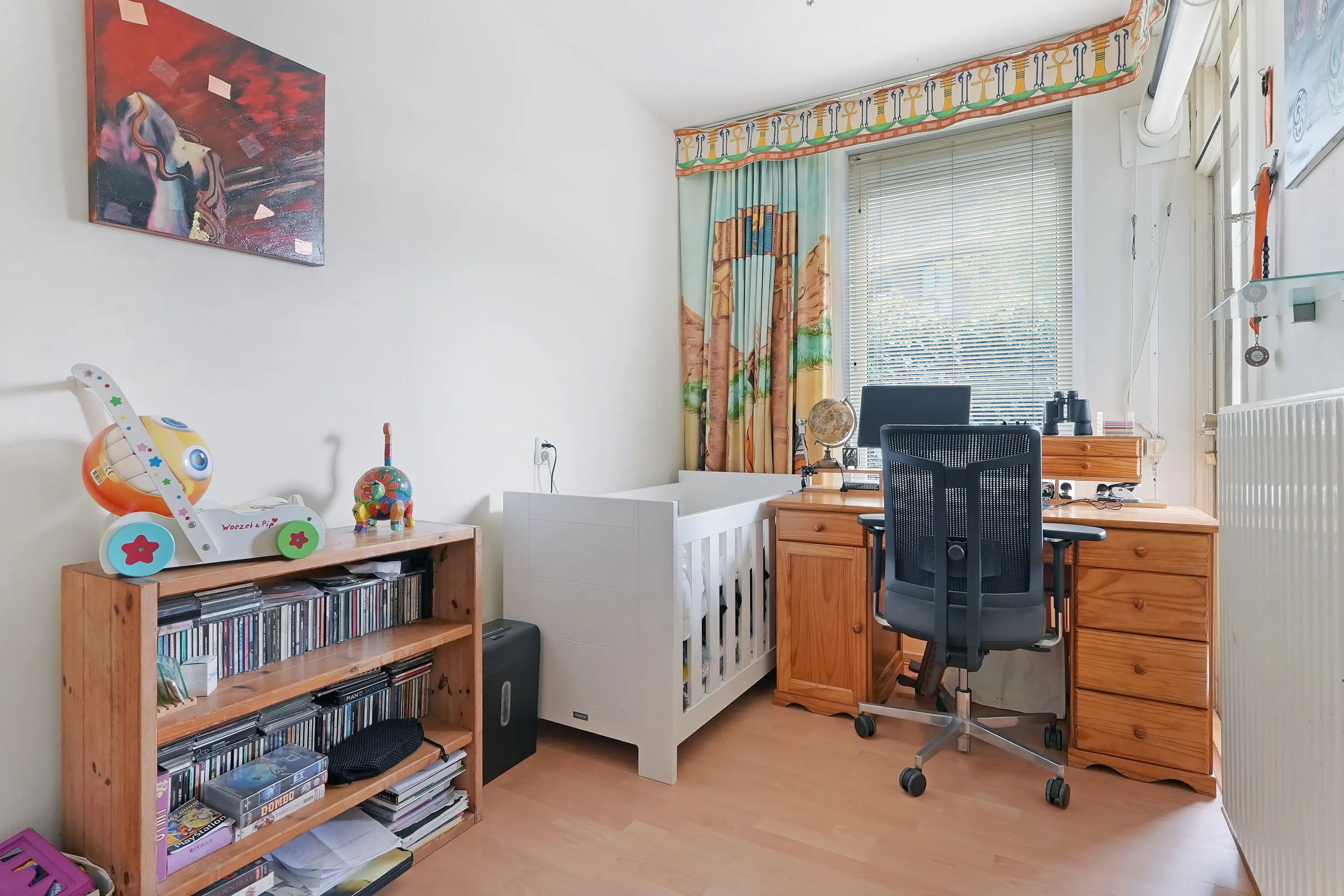 Verder beschikt het appartement over 2 slaapkamers, waaronder de royale slaapkamer aan de voorzijde. De eenvoudige badkamer is voorzien van een douche en wastafel. Vanuit zowel de woonkamer, keuken en de slaapkamer aan de is de zonnige tuin te bereiken.