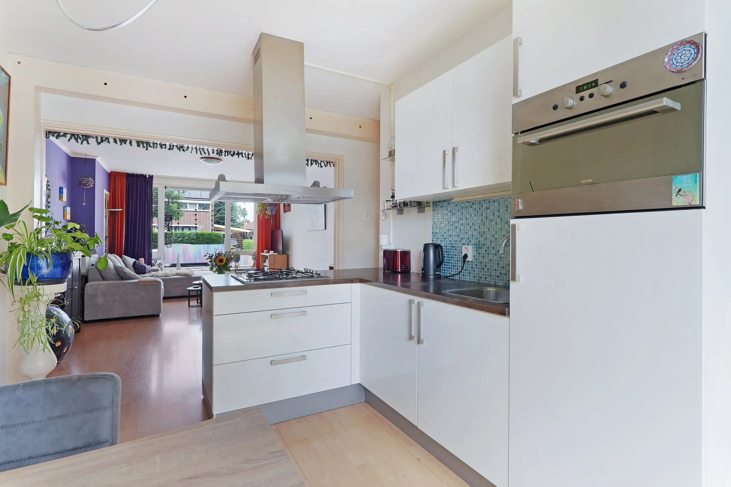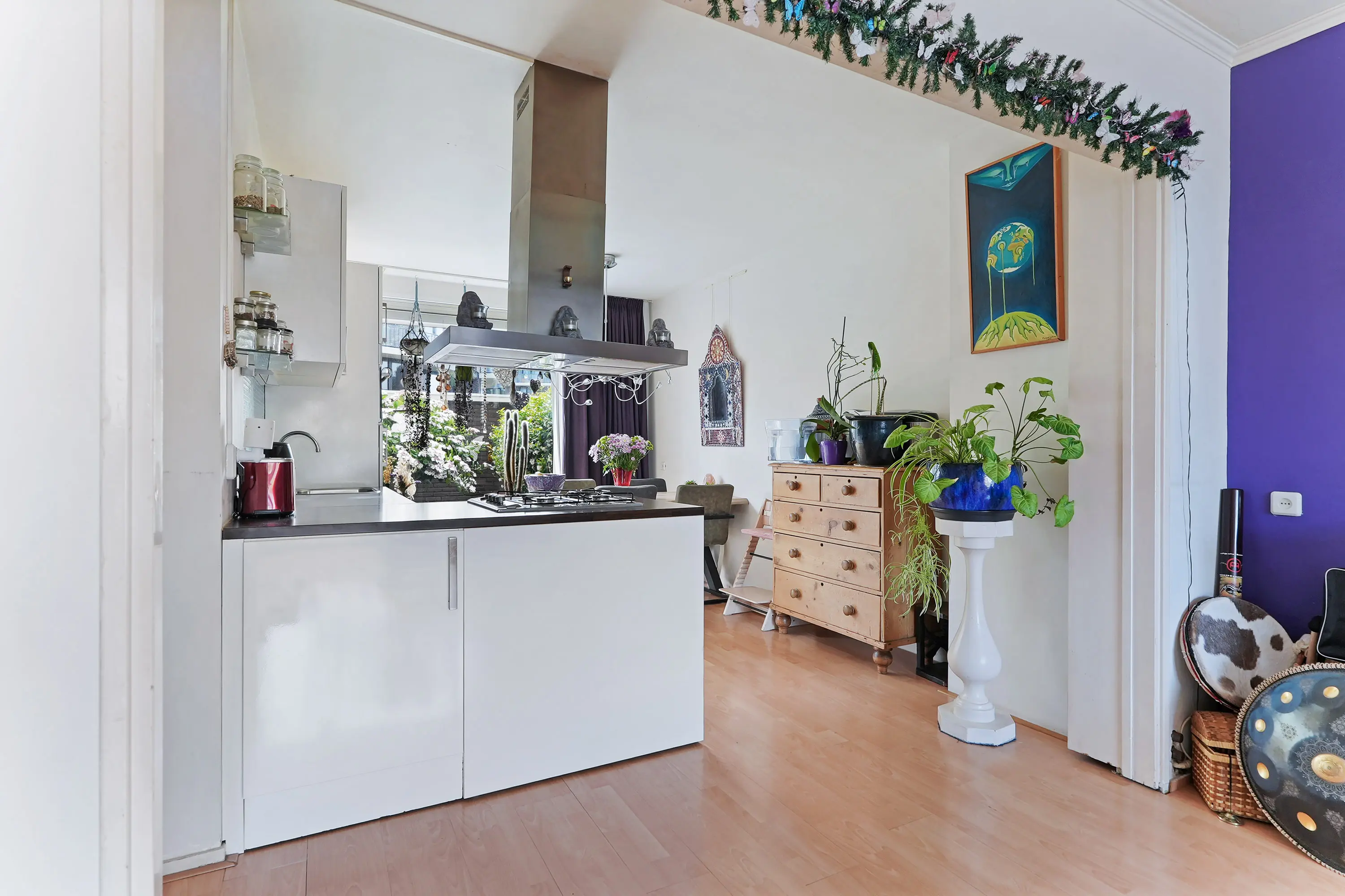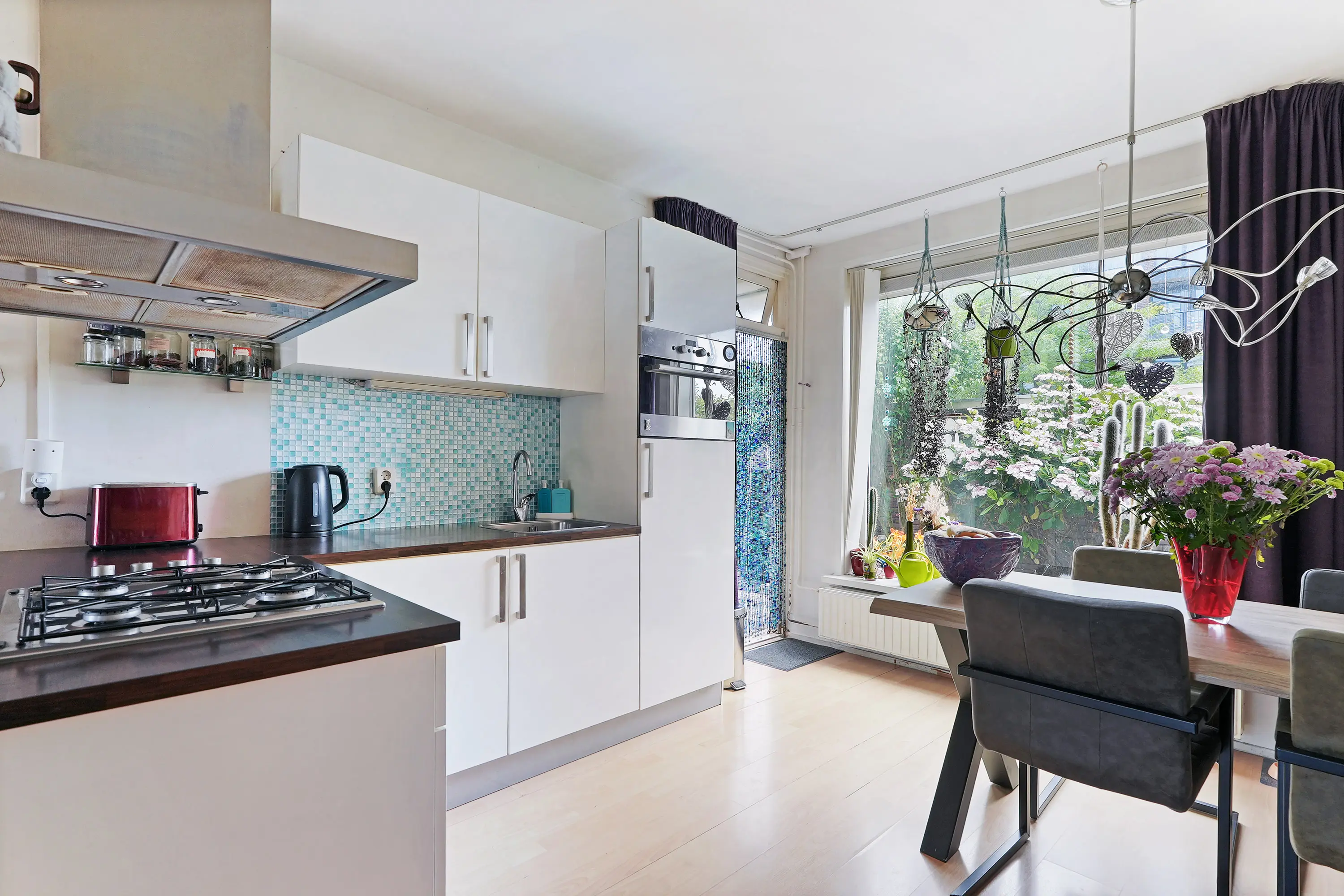 Ruime hal met intercom, toilet en vanuit hier toegang tot alle vertrekken in het appartement. Bij binnenkomst in de woonkamer treft u de zithoek aan de voorzijde en de eethoek met de open keuken aan de tuinzijde. Doordat de keuken verhuisd is naar de woonkamer ervaart u hier een fijne woonkeuken. De keuken is ruim van opzet in een uitvoering met een schiereiland waarop u kunt koken. De kastfronten zijn uitgevoerd in een lichte kleurstelling en een donker werkblad. Verder is de keuken uiteraard voorzien van de gewenste inbouwapparatuur. Naast de woonkamer bevindt zich de bijkeuken, waar zich in het verleden de keuken was gesitueerd. Hier treft u de aansluitingen van witgoed en meer dan voldoende ruimte om uw spullen op te bergen.