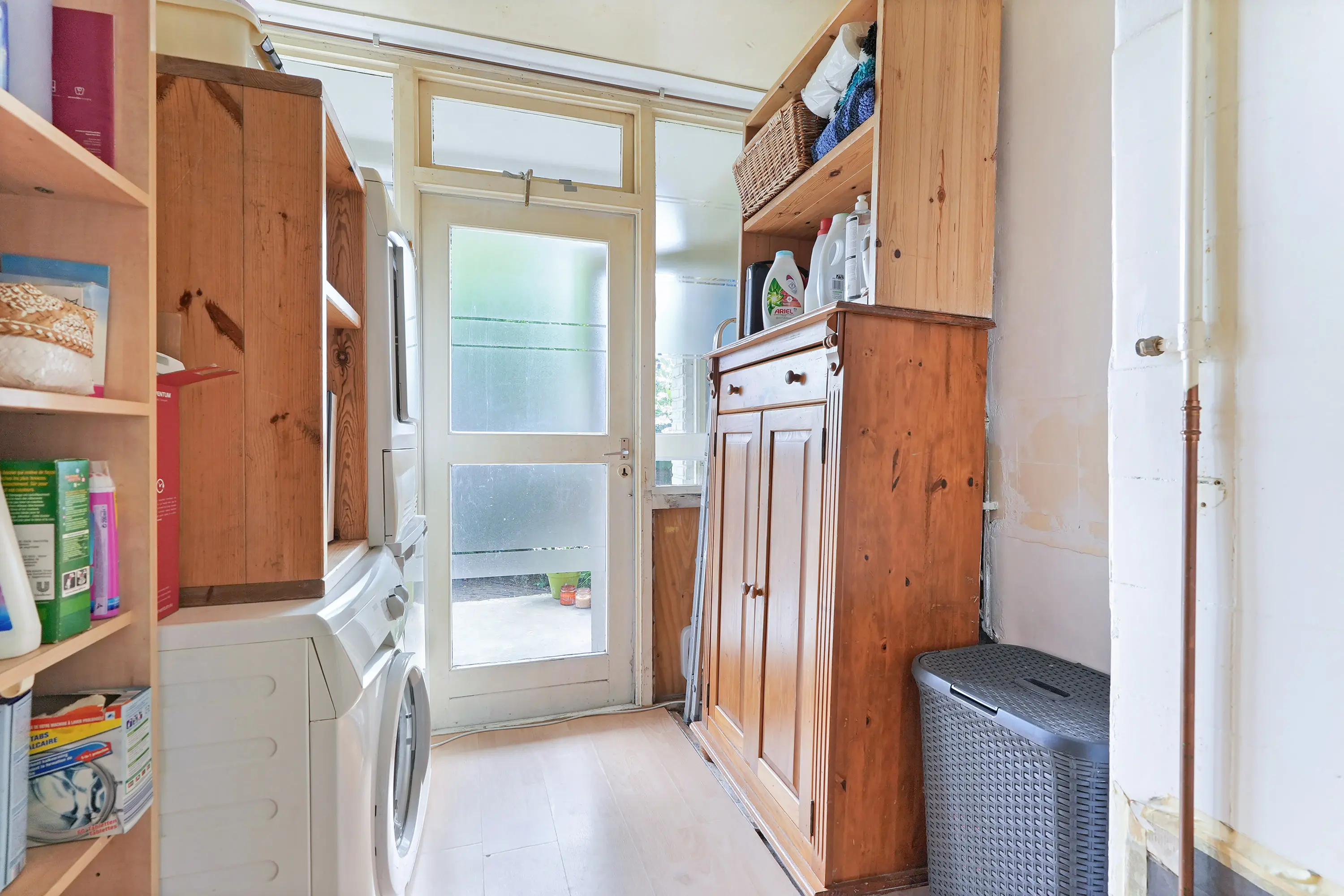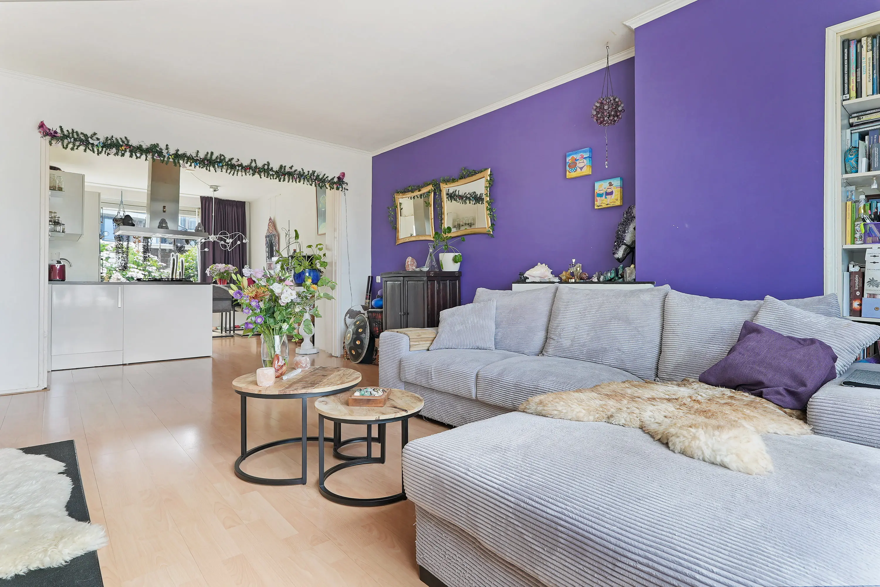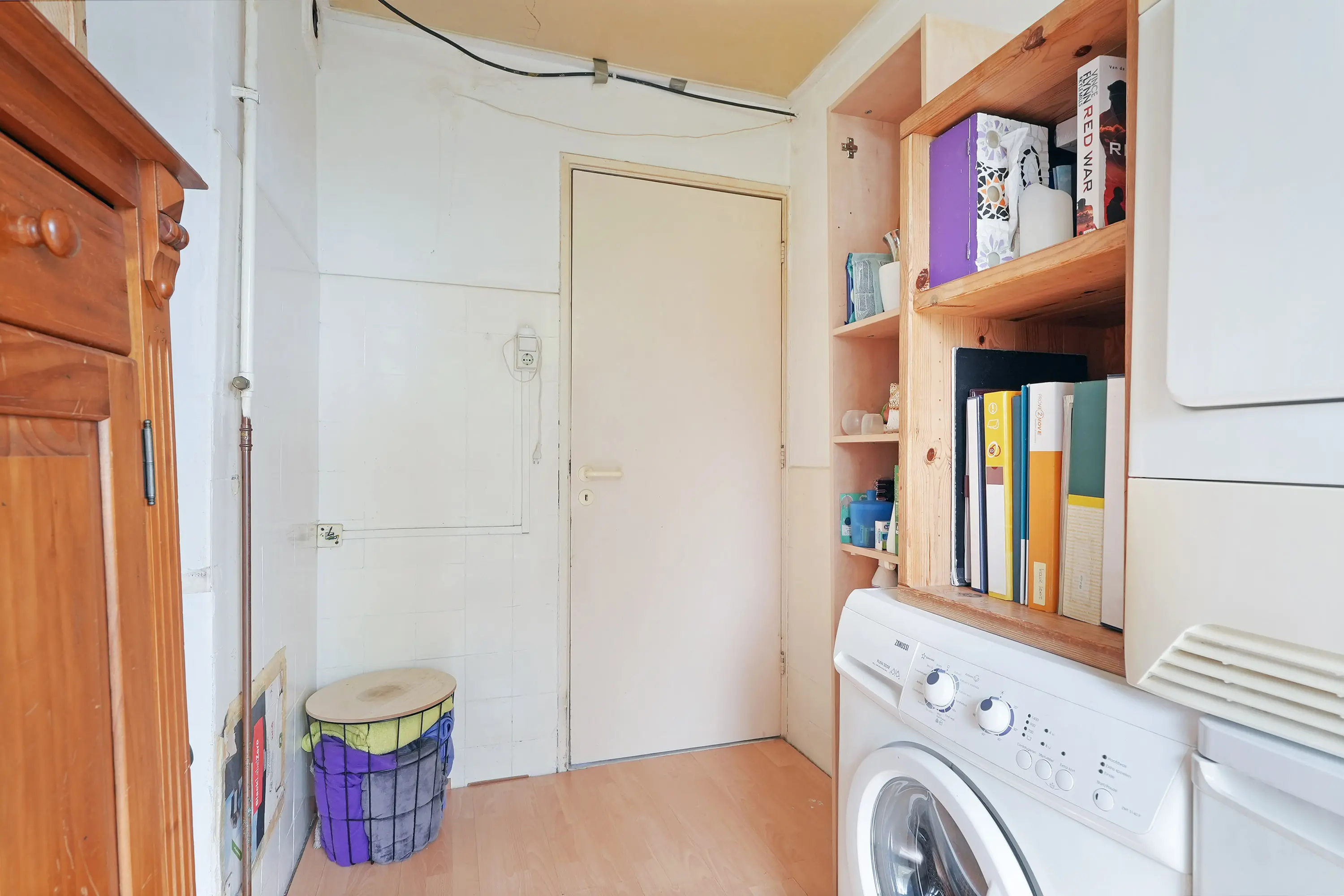 Ruime hal met intercom, toilet en vanuit hier toegang tot alle vertrekken in het appartement. Bij binnenkomst in de woonkamer treft u de zithoek aan de voorzijde en de eethoek met de open keuken aan de tuinzijde. Doordat de keuken verhuisd is naar de woonkamer ervaart u hier een fijne woonkeuken. De keuken is ruim van opzet in een uitvoering met een schiereiland waarop u kunt koken. De kastfronten zijn uitgevoerd in een lichte kleurstelling en een donker werkblad. Verder is de keuken uiteraard voorzien van de gewenste inbouwapparatuur. Naast de woonkamer bevindt zich de bijkeuken, waar zich in het verleden de keuken was gesitueerd. Hier treft u de aansluitingen van witgoed en meer dan voldoende ruimte om uw spullen op te bergen.