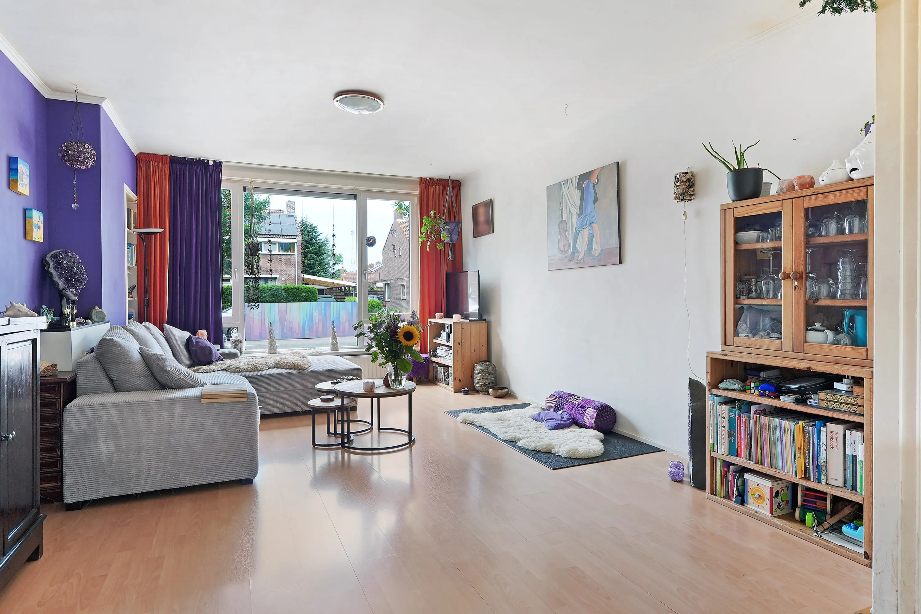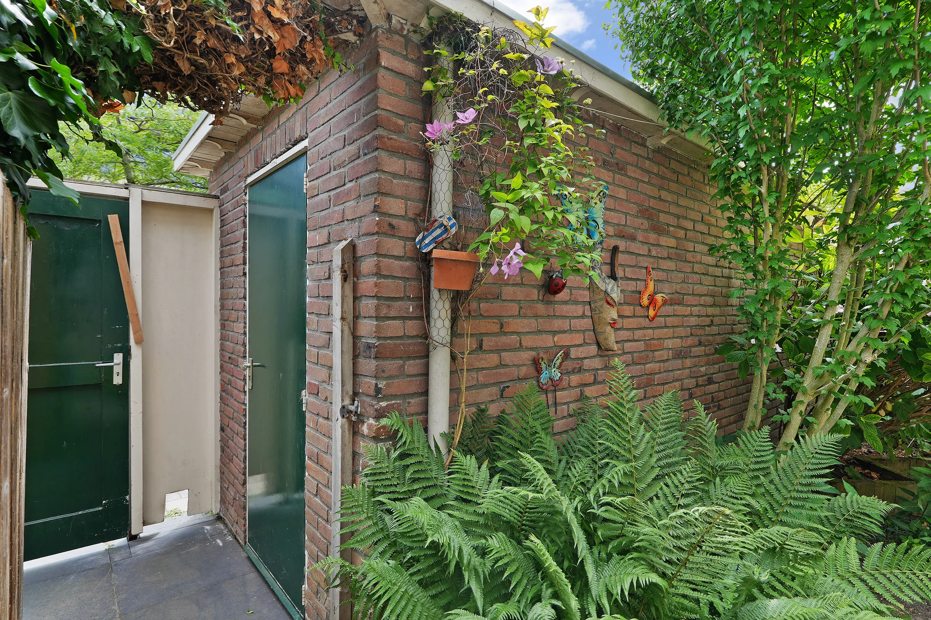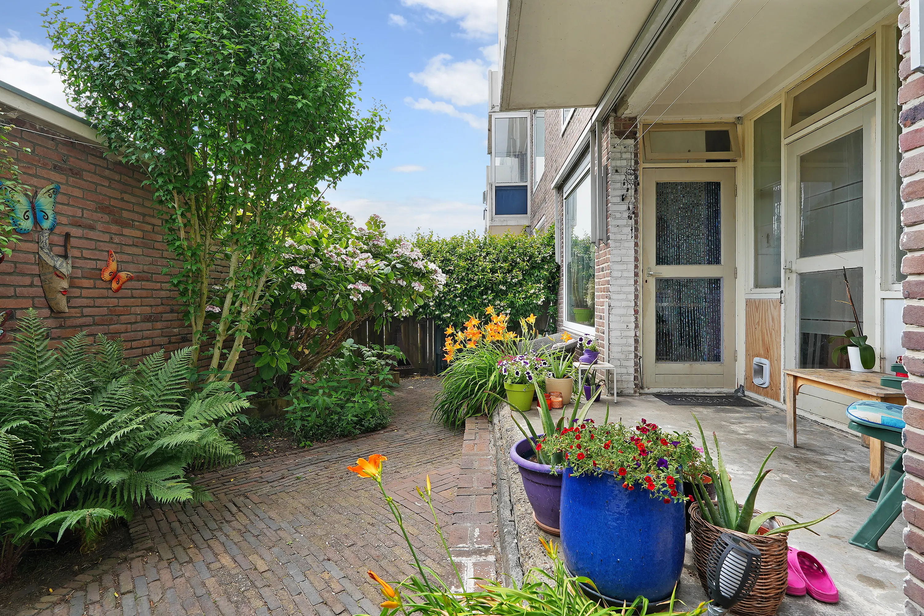 De zonnige tuin biedt door de breedte verhouding van het appartement ruimte voor een gezellig terras. Aangelegd met sierbestrating, veel groen en omsloten waardoor u van veel privacy geniet. Achter de tuin treft u de (fietsen)berging en de vrije achterom.