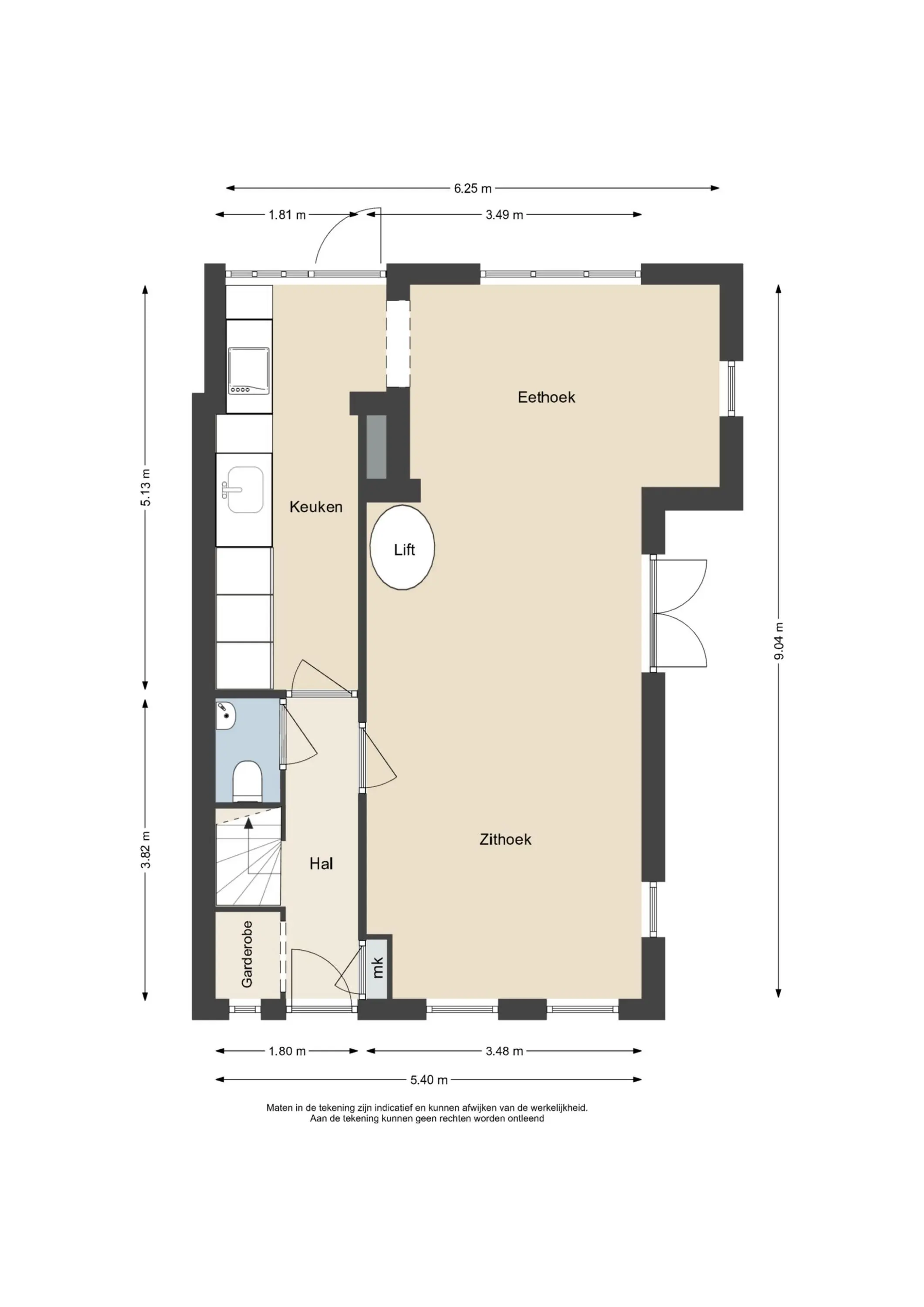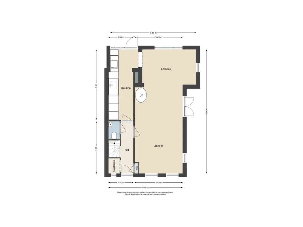 Deze informatie is door ons met de nodige zorgvuldigheid samengesteld. Onzerzijds wordt echter geen enkele aansprakelijkheid aanvaard voor enige onvolledigheid, onjuistheid of anderszins, dan wel de gevolgen daarvan. Alle opgegeven maten en oppervlakten zijn indicatief.