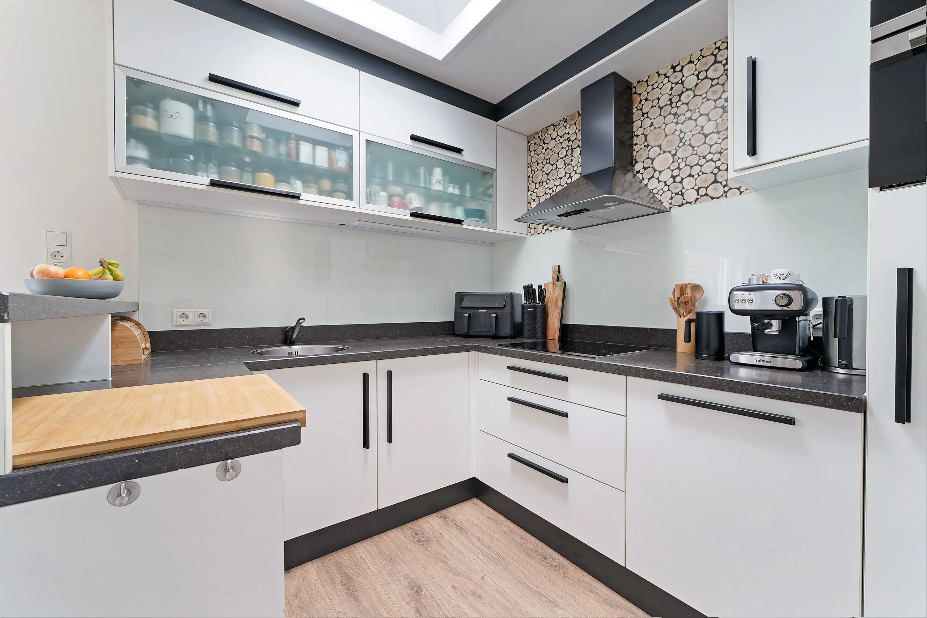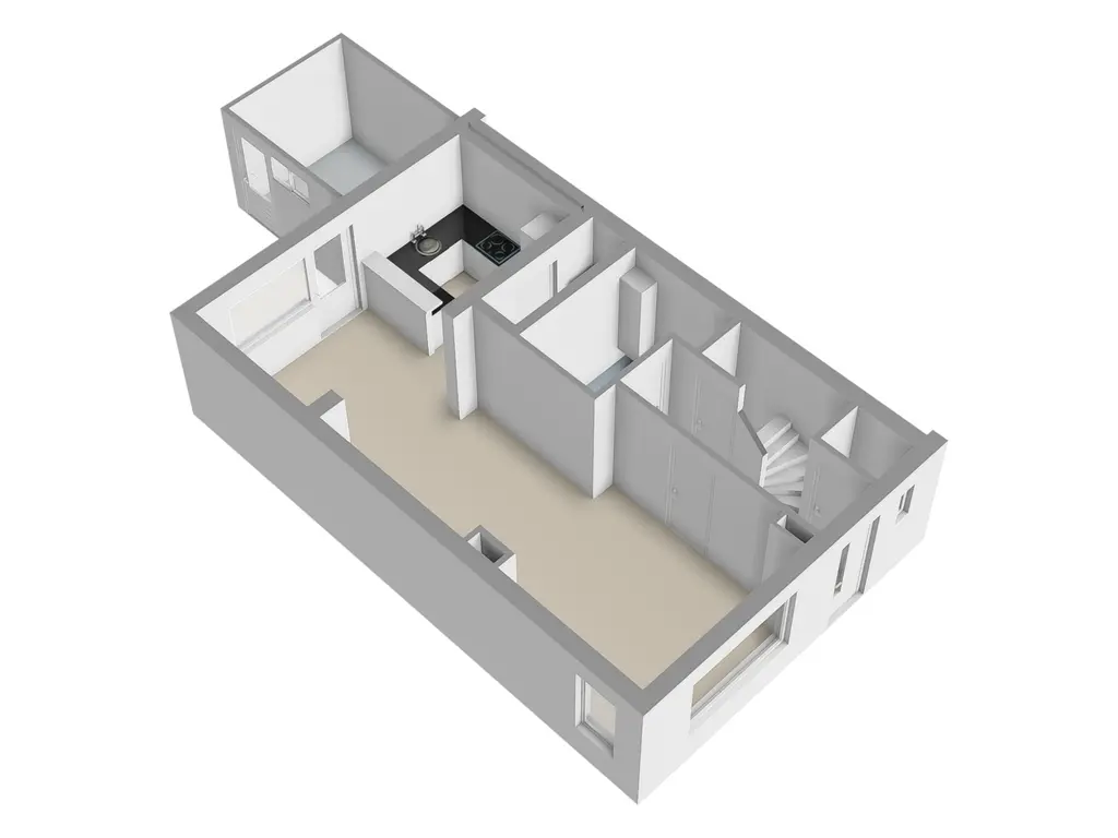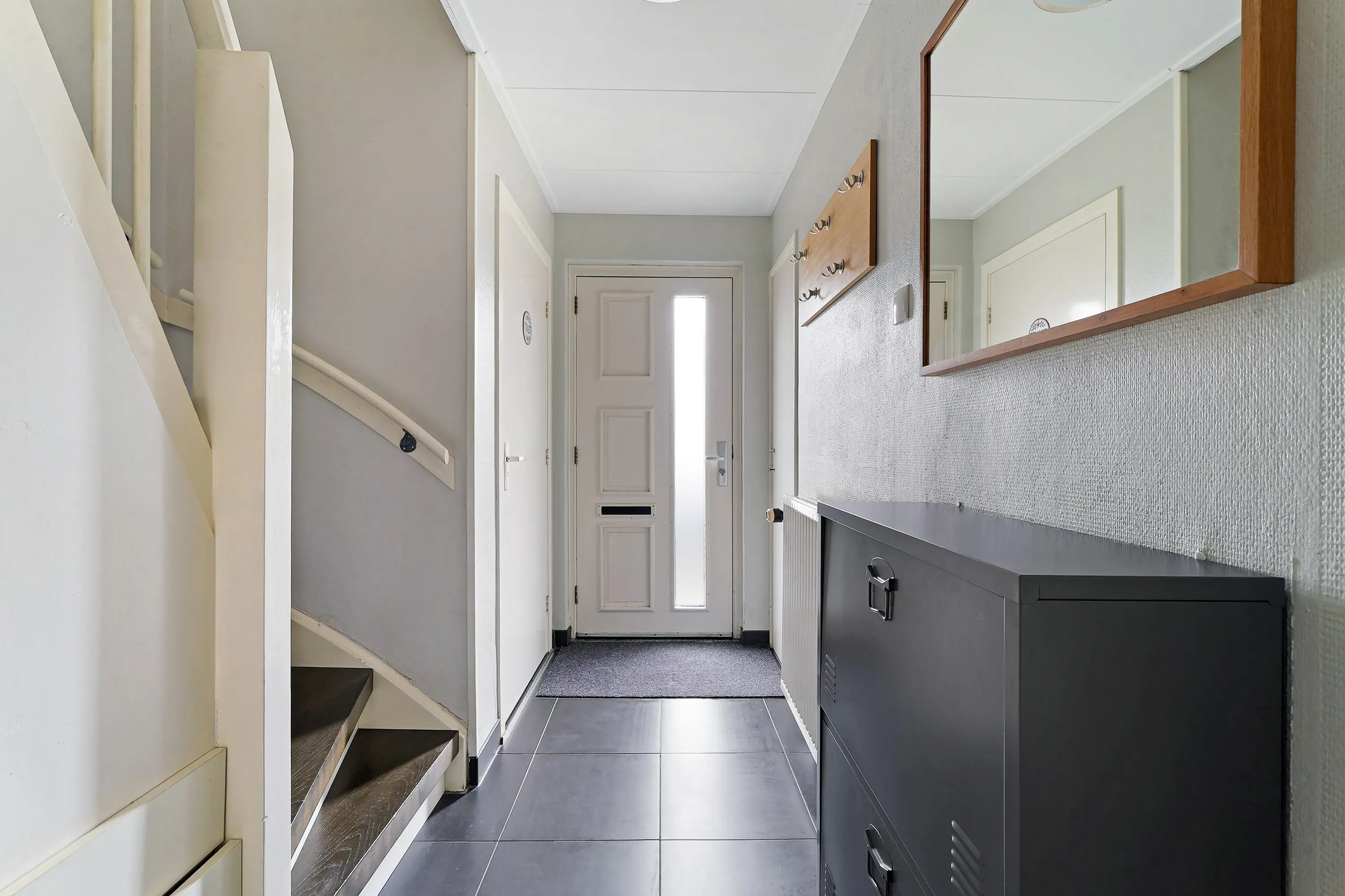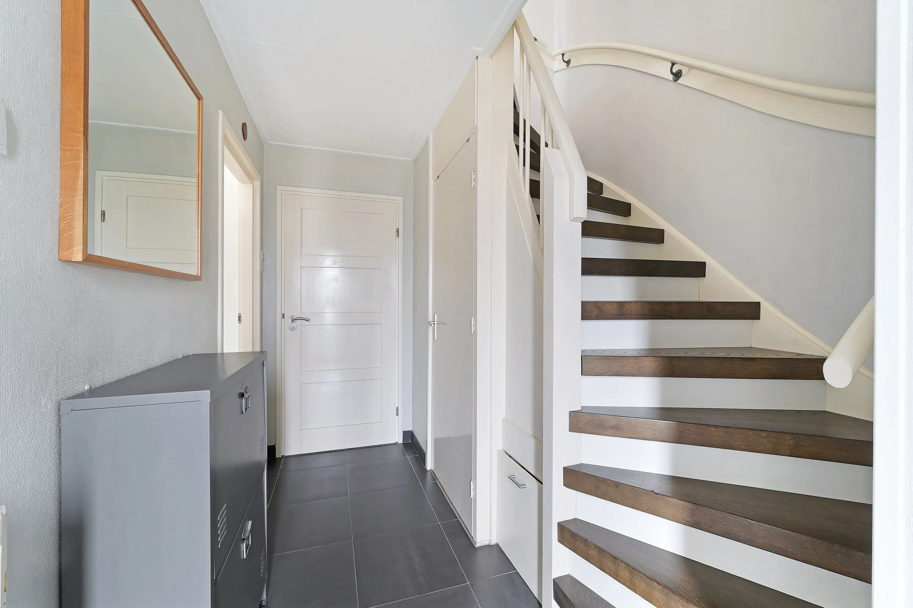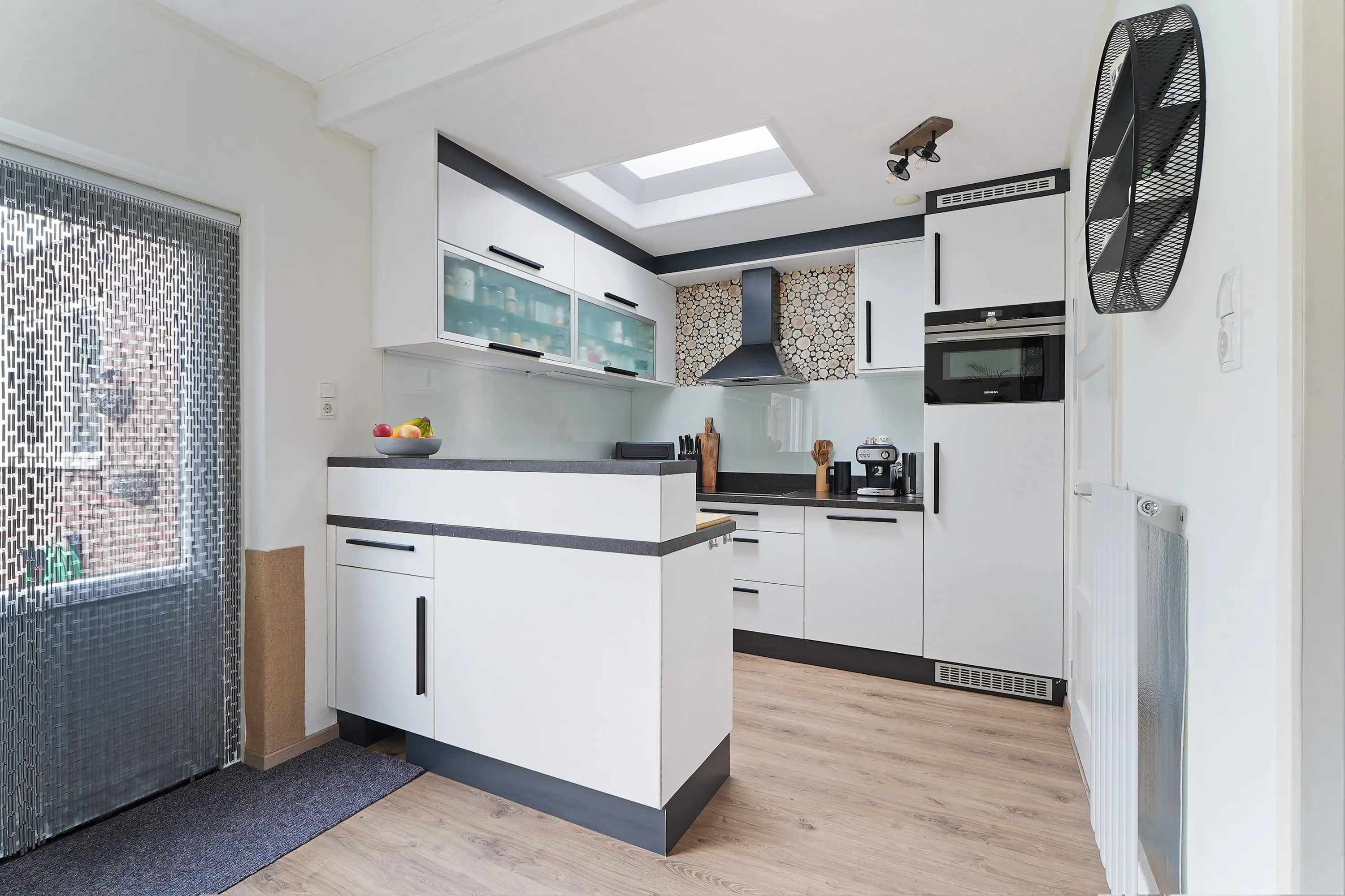Entree met hal voorzien van een plavuizenvloer, meterkast en modern toilet met wandcloset. Vanuit de hal toegang tot de trapopgang, trapkast en de moderne badkamer, uitgerust met een royale bad-/douchecombinatie, een dubbel wastafelmeubel met spiegel en verlichting en een handdoekradiator. De uitgebouwde woonkamer van circa 35 m² is licht en ruim, beschikt over een kunststof achterpui, een elektrisch knikarmscherm, een sierhaard en een eigentijdse laminaatvloer met bijpassende wandafwerking. De luxe open keuken is voorzien van diverse inbouwapparatuur, waaronder een inductiekookplaat, RVS afzuigkap, koelkast, vaatwasser, combioven, een composiet werkblad en veel bergruimte in lades en kasten. Aansluitend bevindt zich de bijkeuken met was- en stookruimte en ingebouwde verlichting.