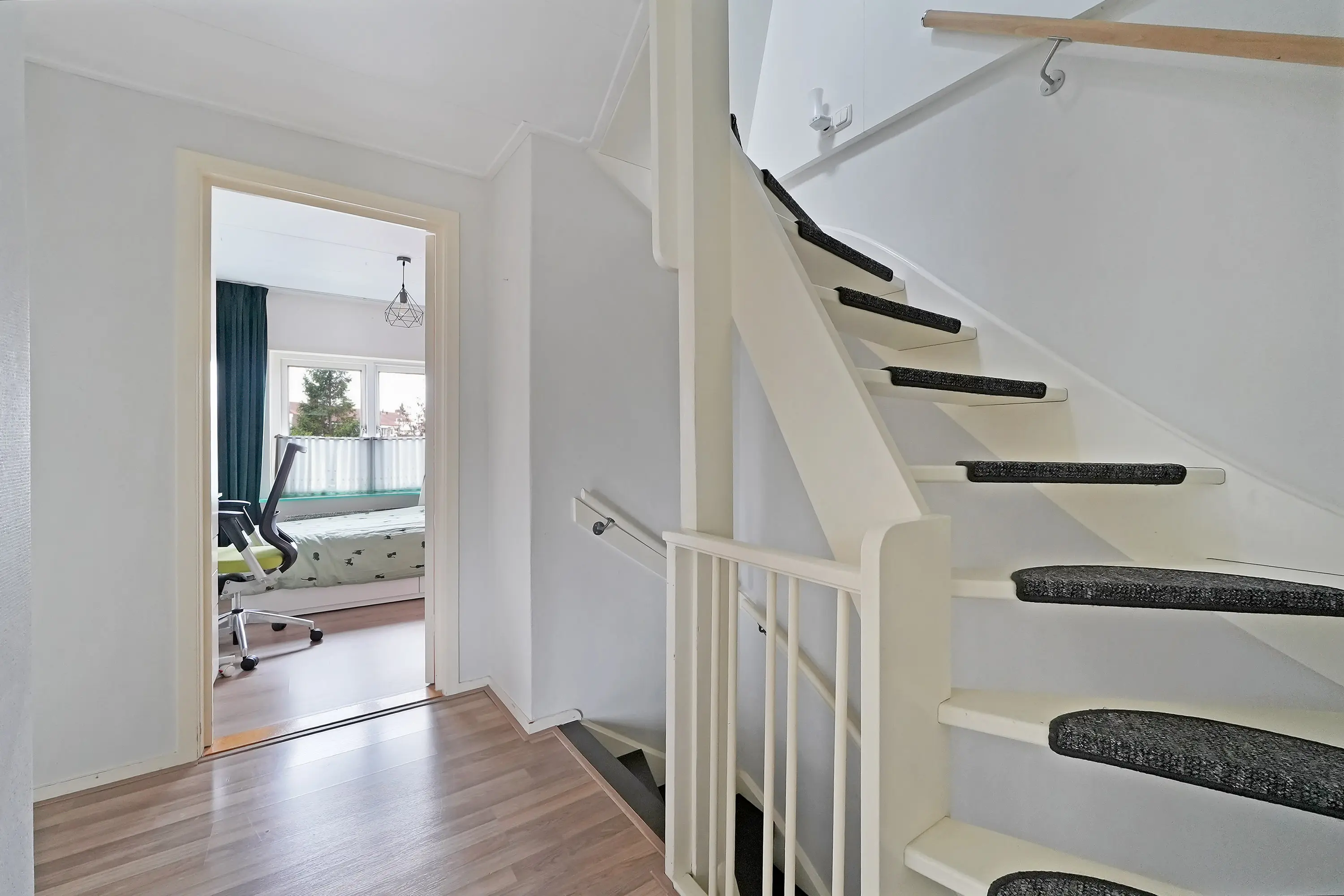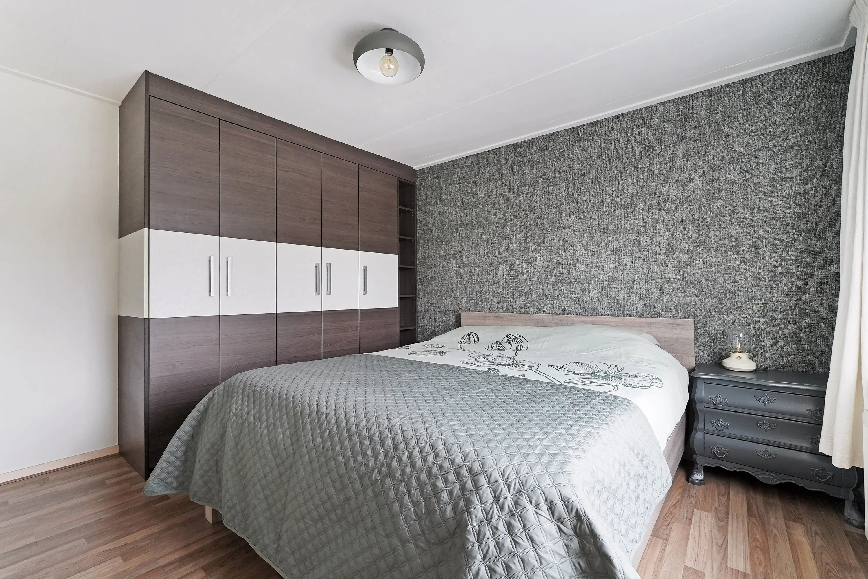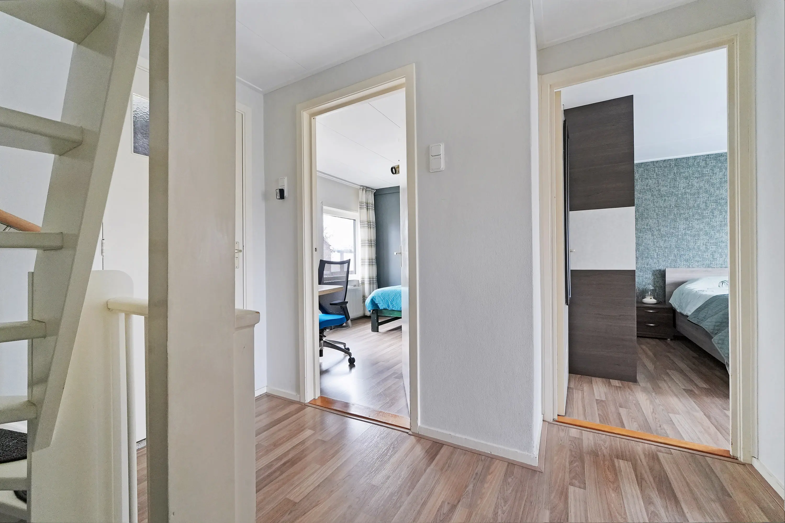 Overloop met toegang tot een bergruimte (voorheen doucheruimte) met ingebouwde kasten, waaronder een waslade. Verder zijn er drie slaapkamers, allemaal voorzien van rolluiken, vaste kasten en laminaatvloeren.