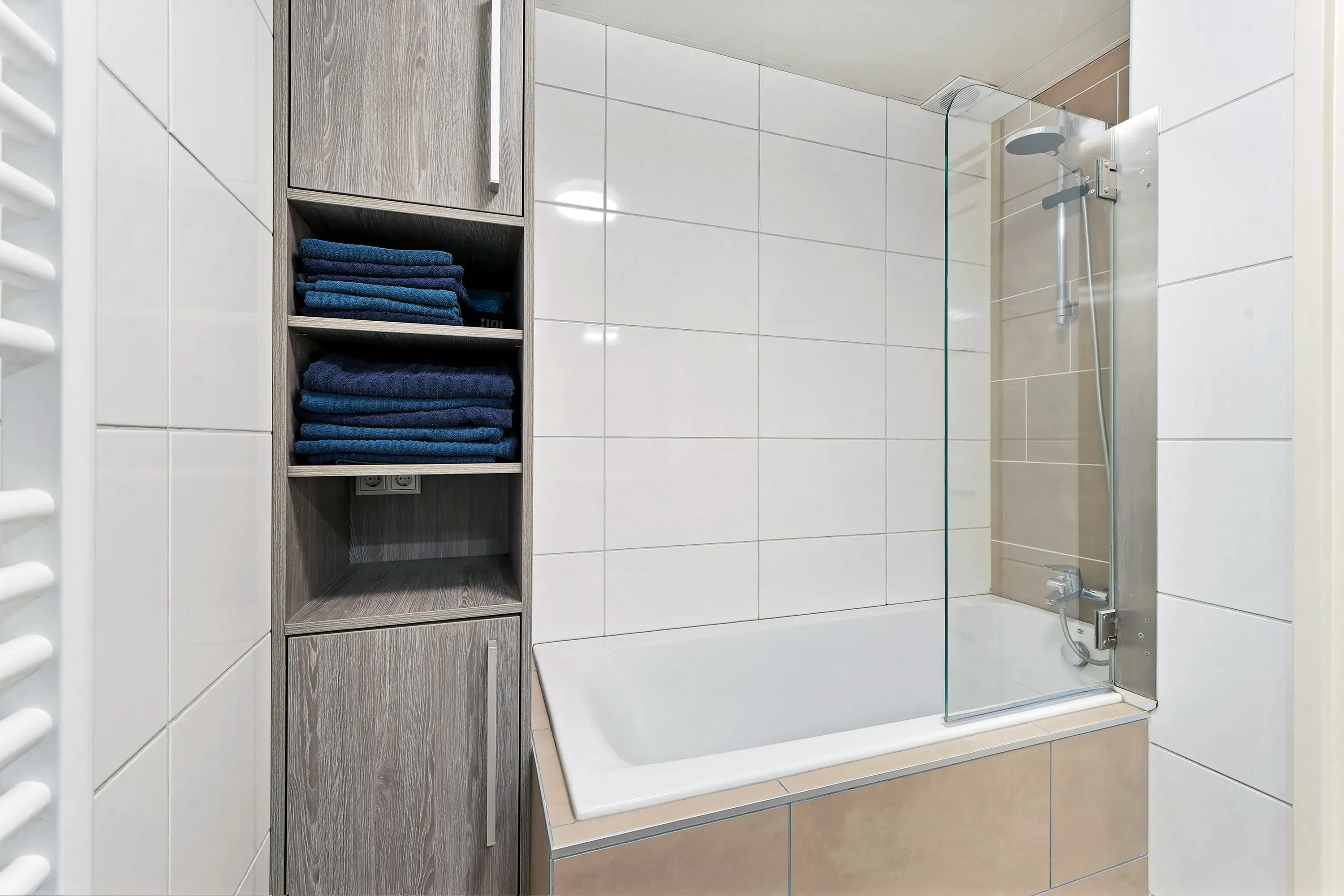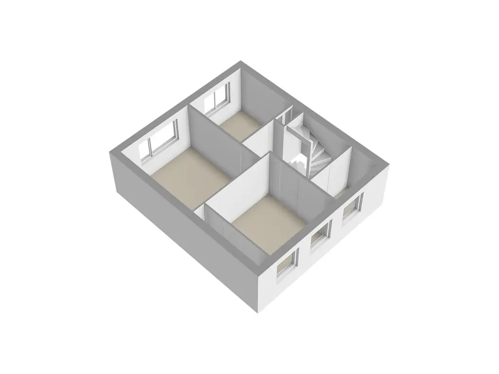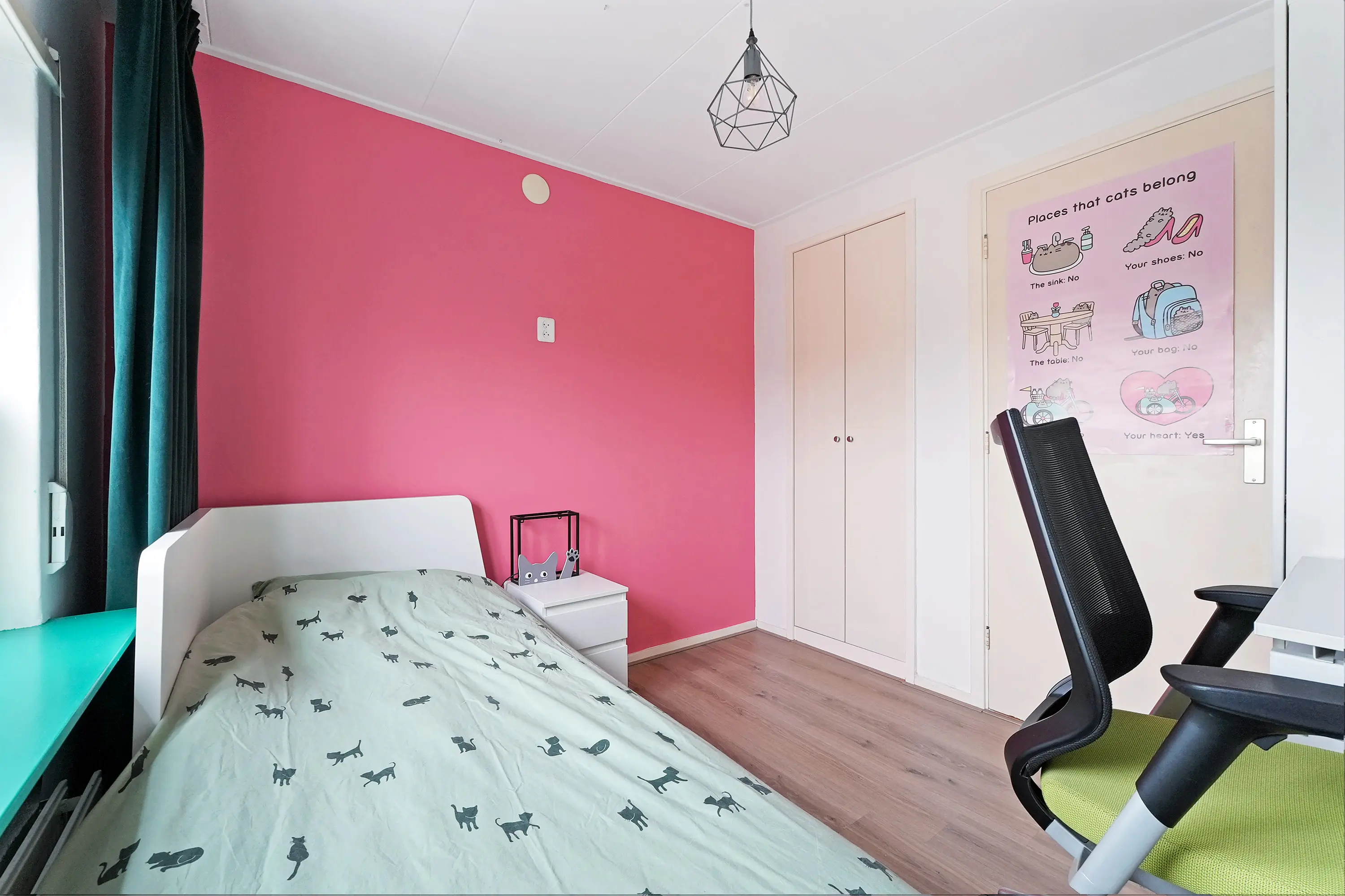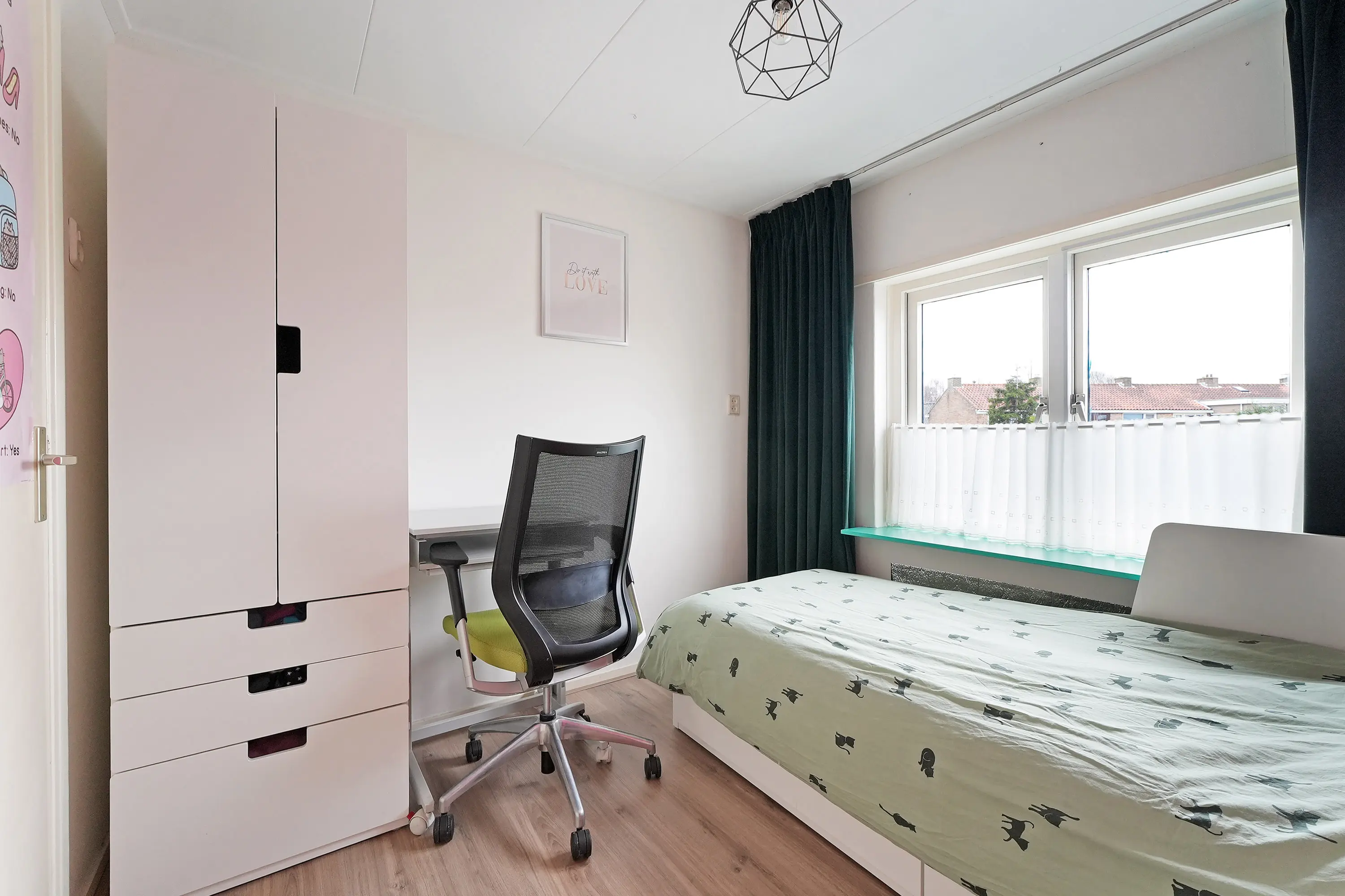 Overloop met toegang tot een bergruimte (voorheen doucheruimte) met ingebouwde kasten, waaronder een waslade. Verder zijn er drie slaapkamers, allemaal voorzien van rolluiken, vaste kasten en laminaatvloeren.