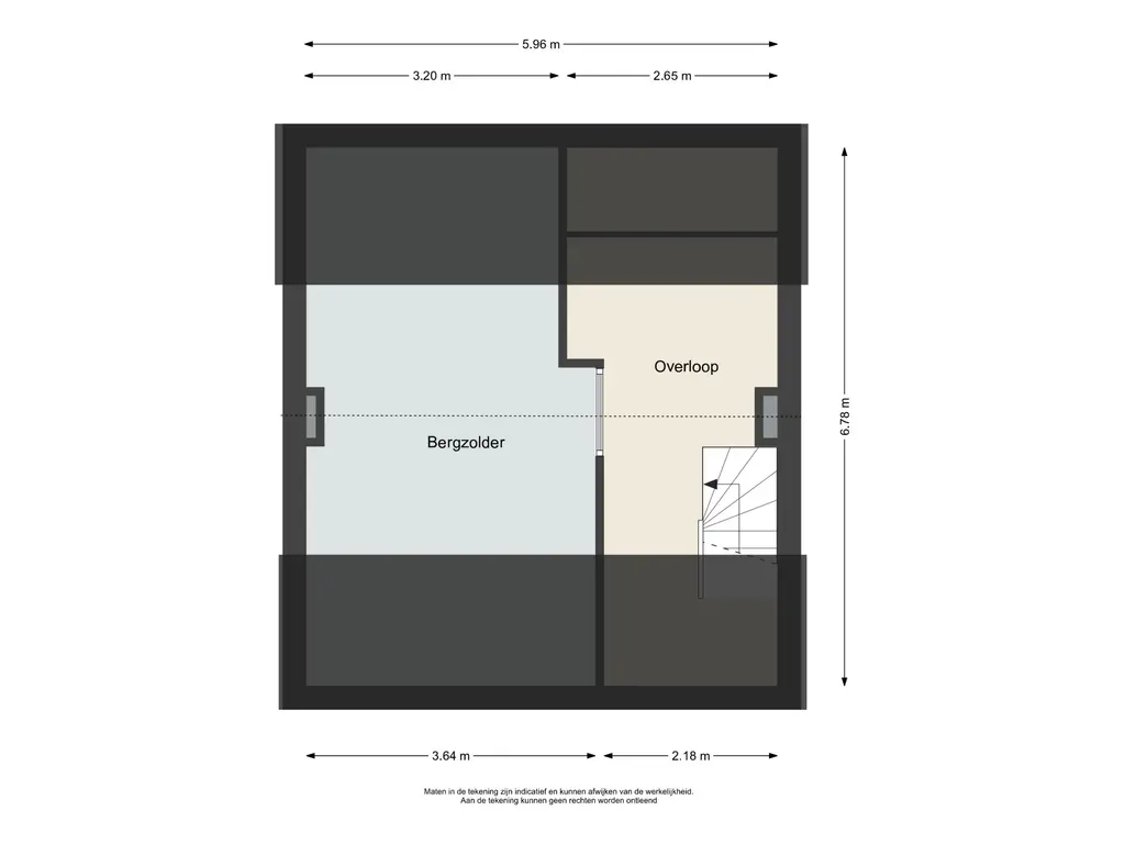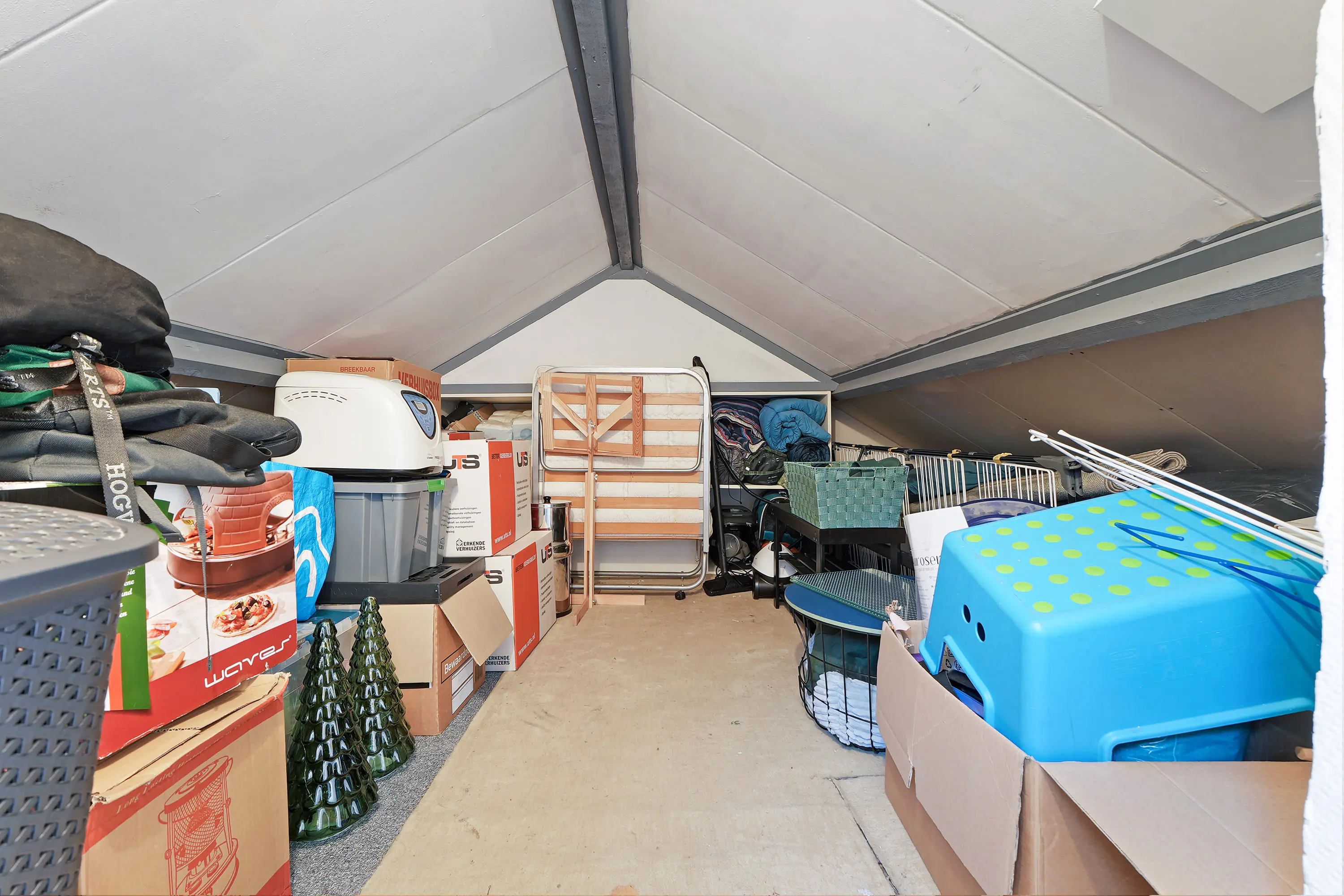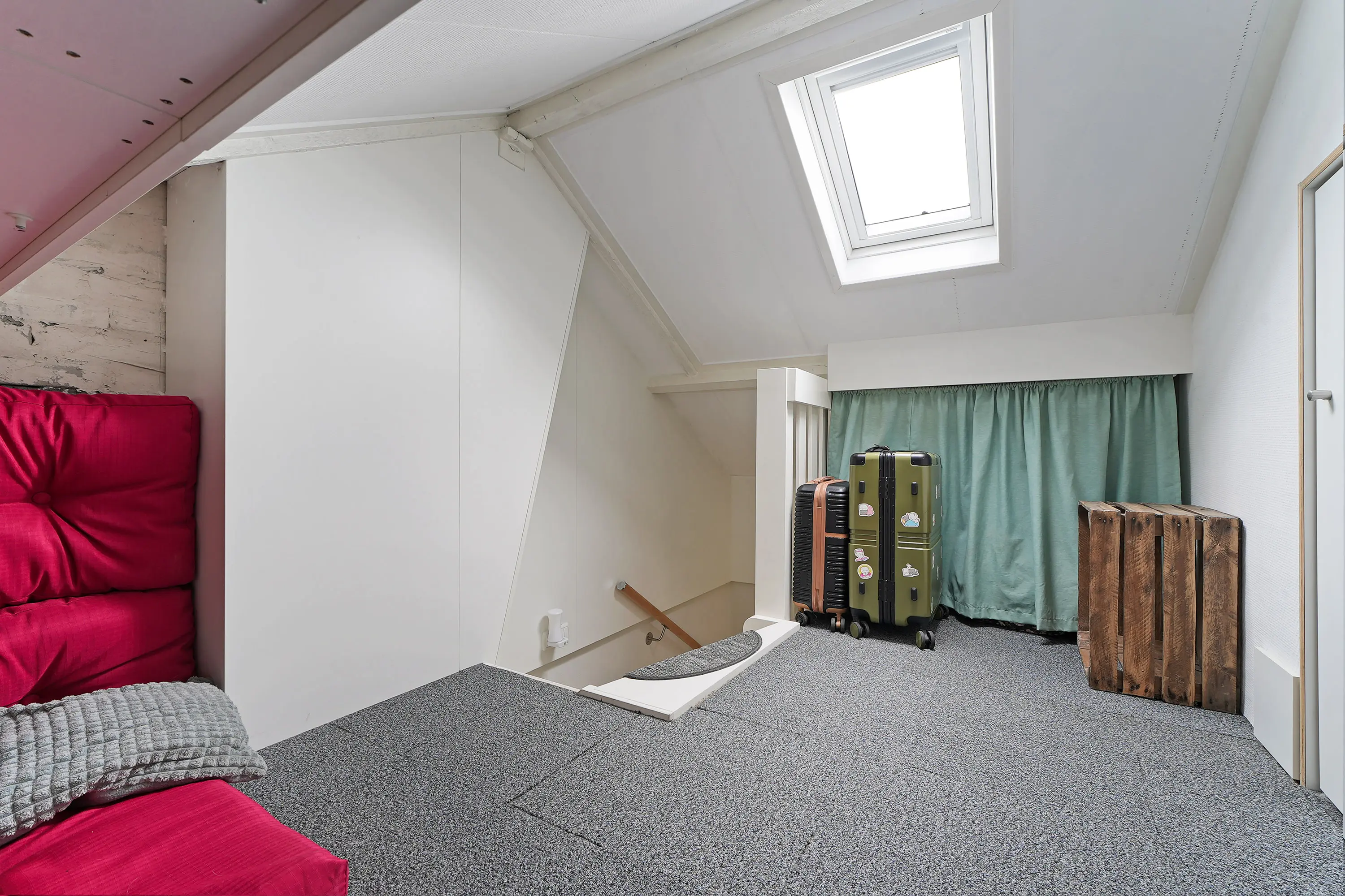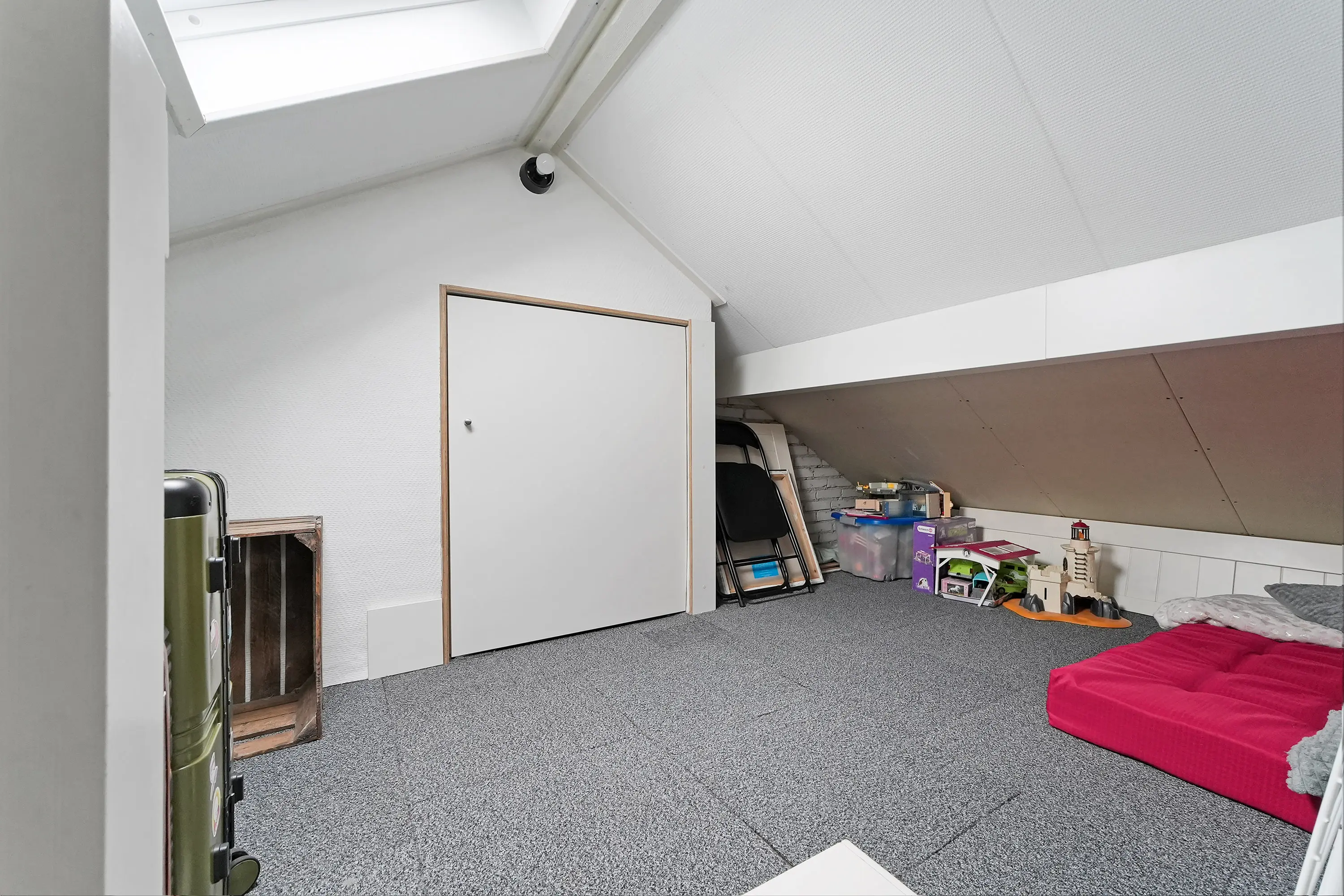 Via een vaste trap bereikbare ruime bergzolder met een kleine overloop, een Velux dakraam en een aparte afgesloten bergruimte.